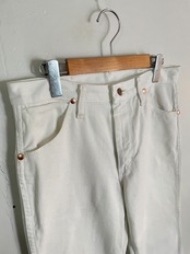 綺麗なホワイトカラーのラングラーデニムパンツ。やや細めなストレートシルエット。足のラインを綺麗に出してくれる美脚デニムです。目立った汚れやダメージも無く、状態は◎です。綺麗めなどにはもちろん、アメカジなどにも取り入れやすい一本です。