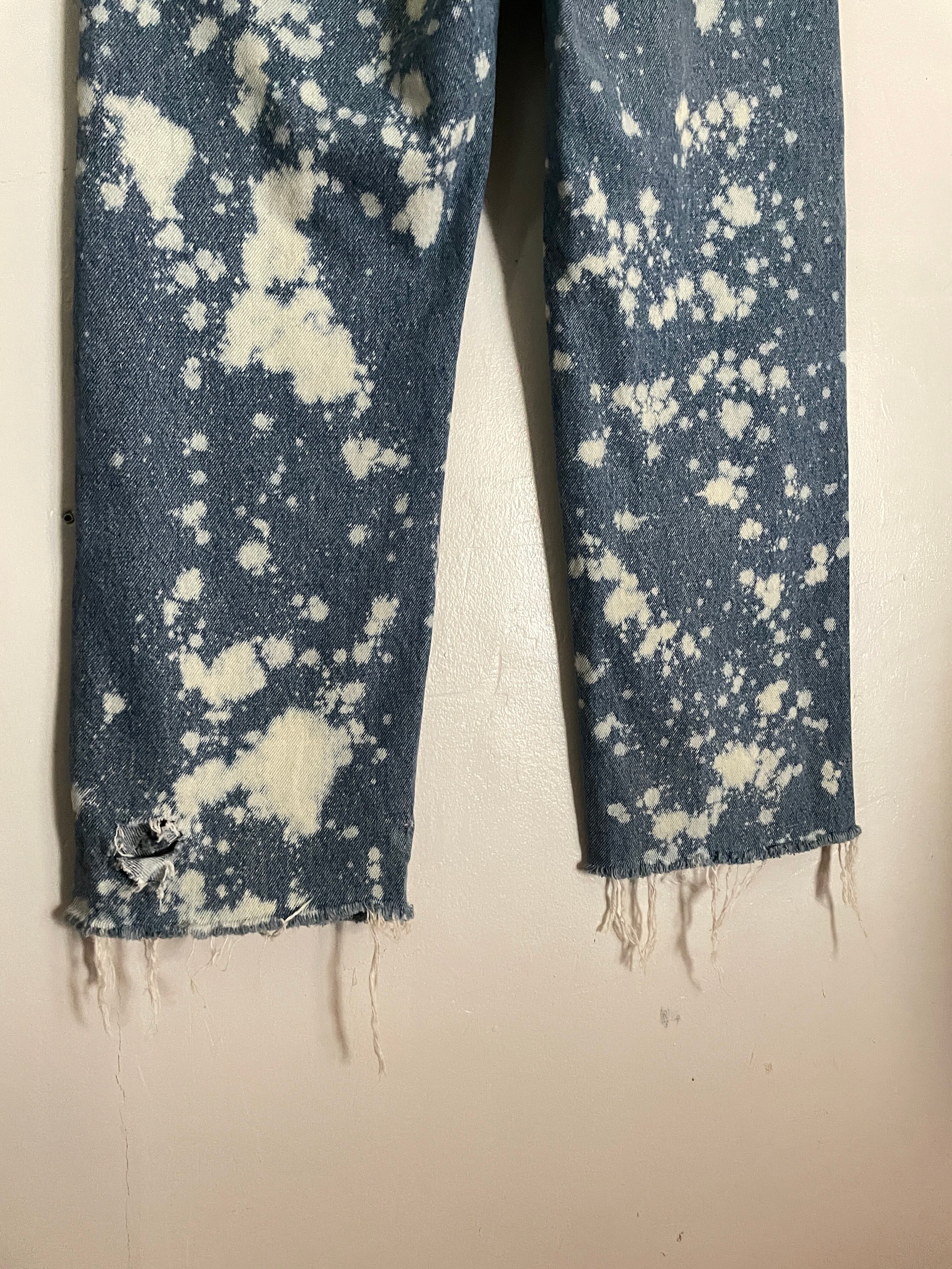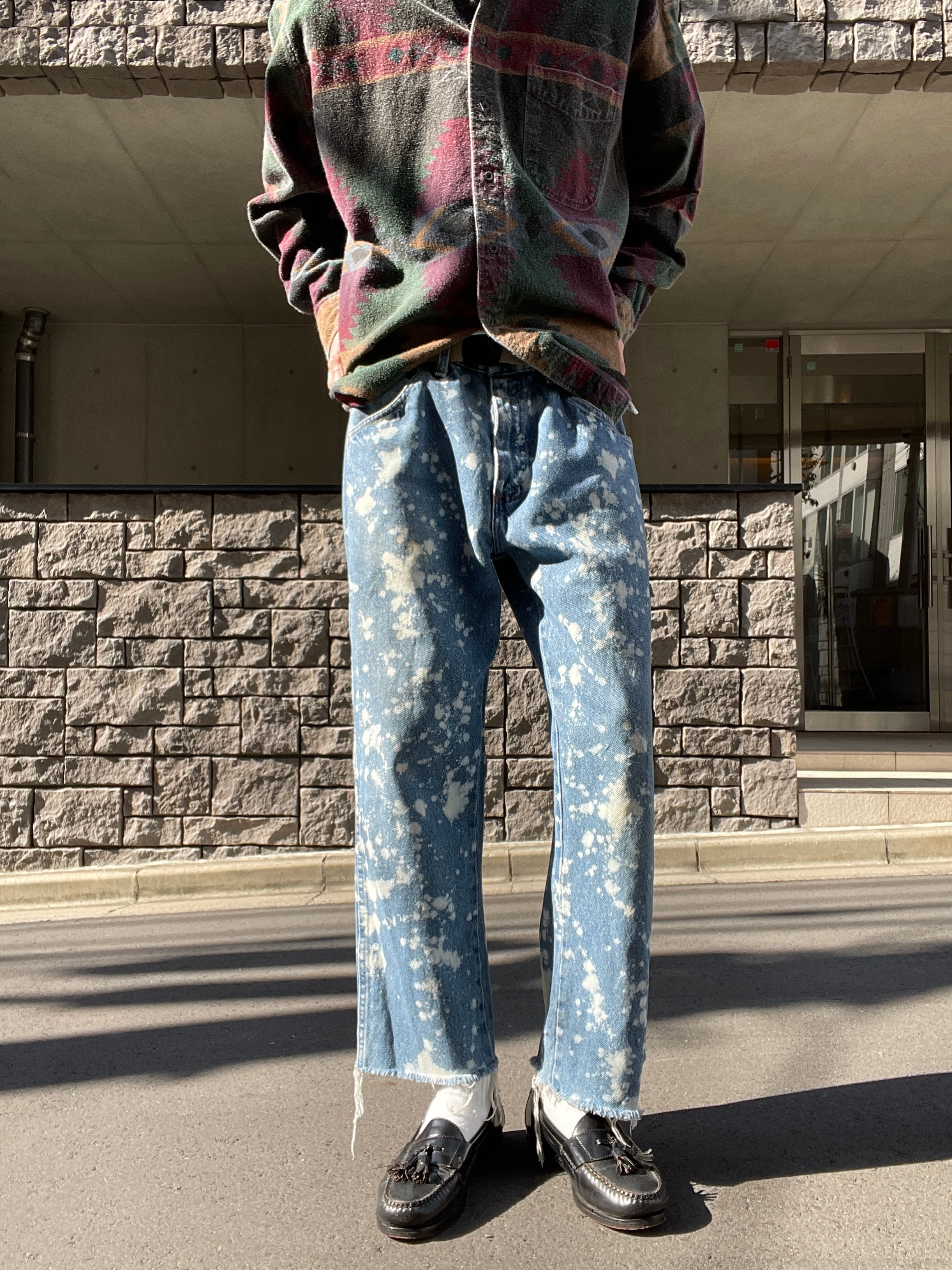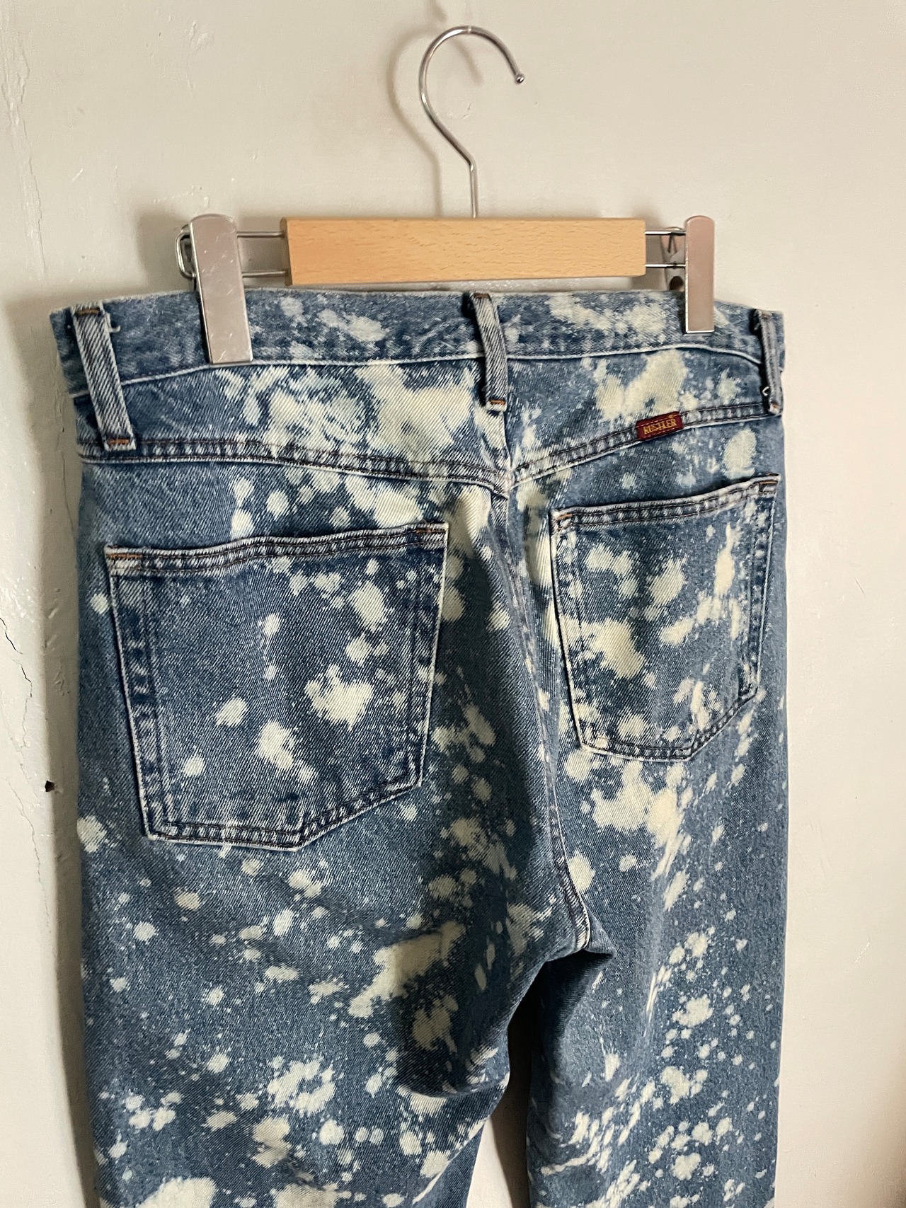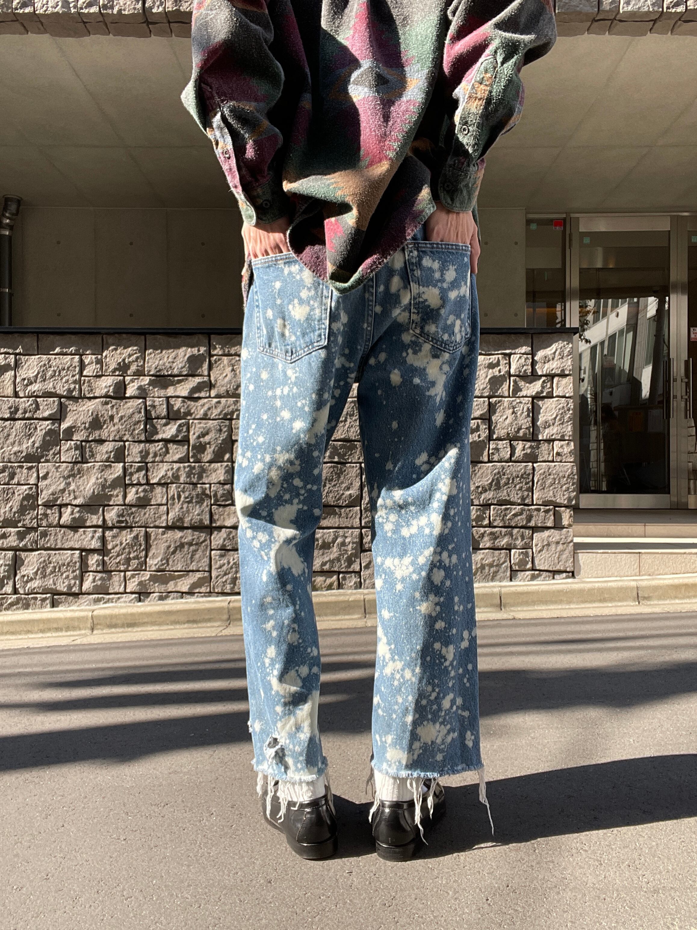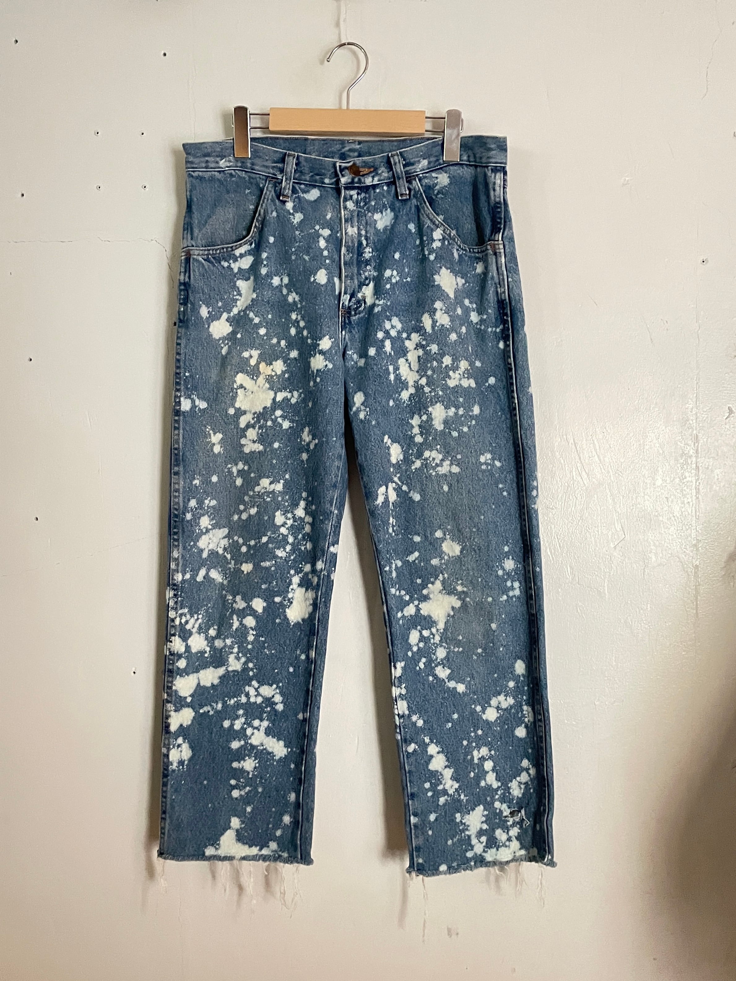 褪せたブルーカラーに、センス抜群のブリーチ加工が施された、ラスラーのデニムパンツ。全体に満遍なくブリーチが施されています。裾部分はあえてほつれを残したカットオフデザイン。ソックスなどで遊んでもかなりお洒落。太過ぎず、細過ぎないストレートシルエット。グランジやアメカジなど、様々なジャンルのファッションでメインになってくれるボトムスです。