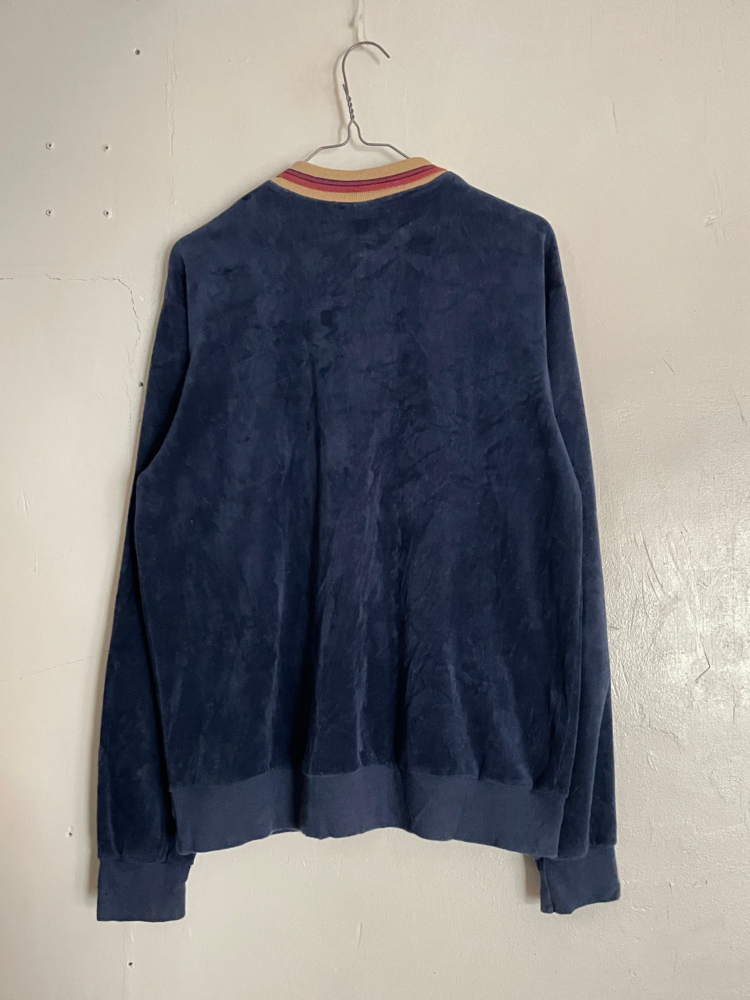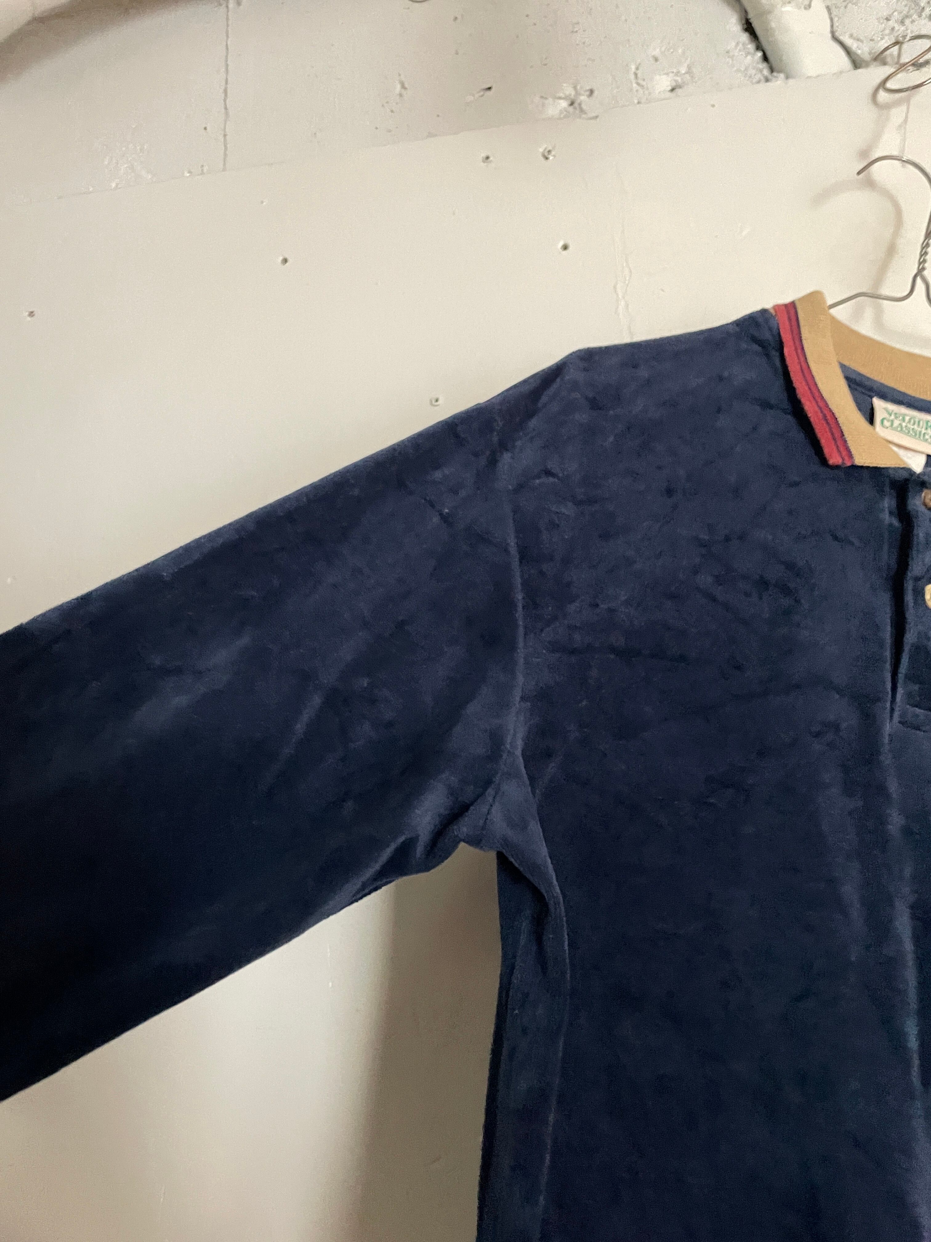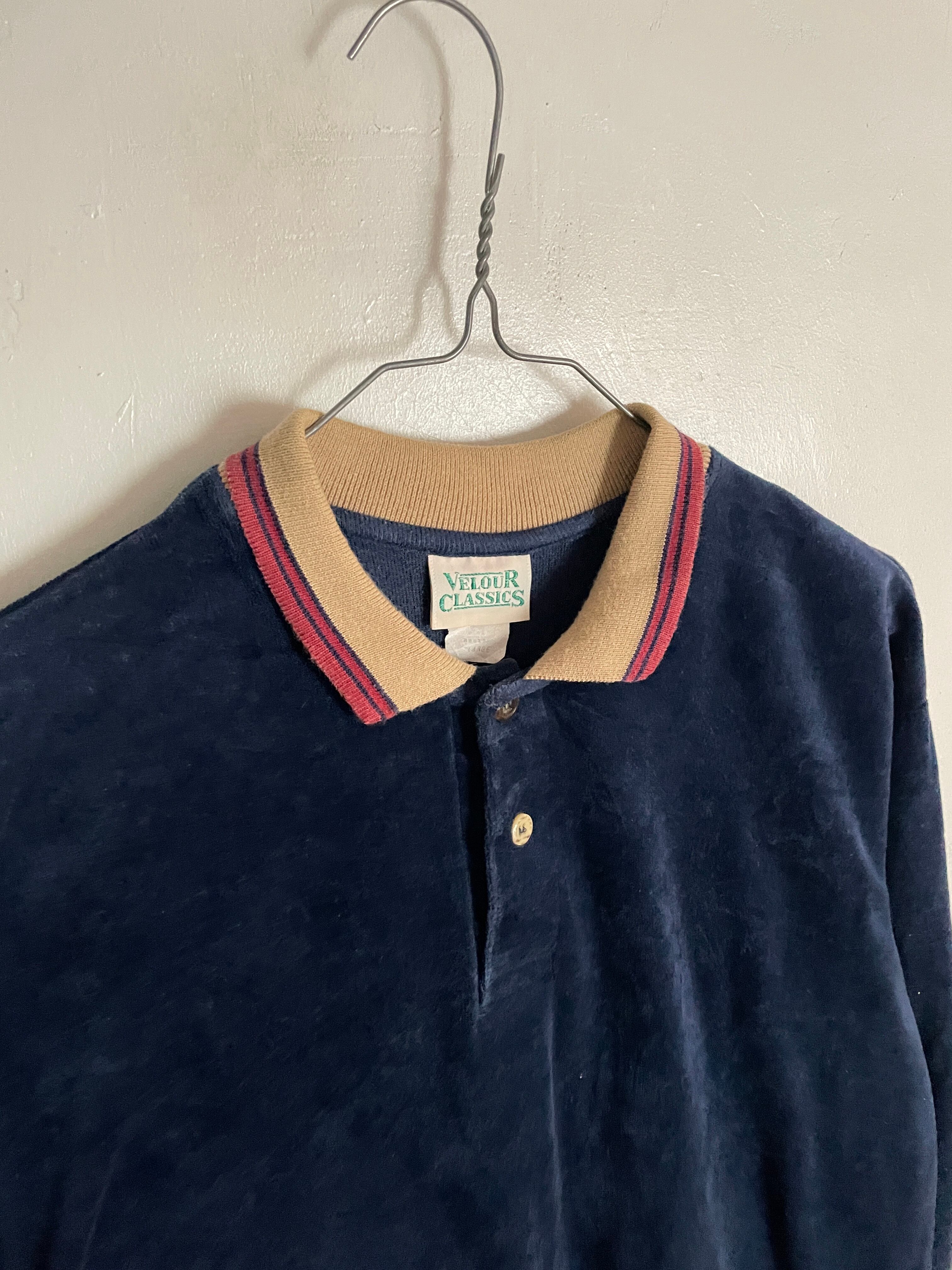 色気のあるネイビーボディのベロアポロシャツ。光沢のある上品で高級感を纏ったベロア素材。ストレッチが効いている為、着やすさ抜群です。襟部分のデザインもお洒落です。袖口、裾はリブ仕様。大き過ぎず、小さ過ぎないサイズ感なので、男女共におすすめしたいアイテムです。今の時期にはインナーとしても活躍してくれる一着です。