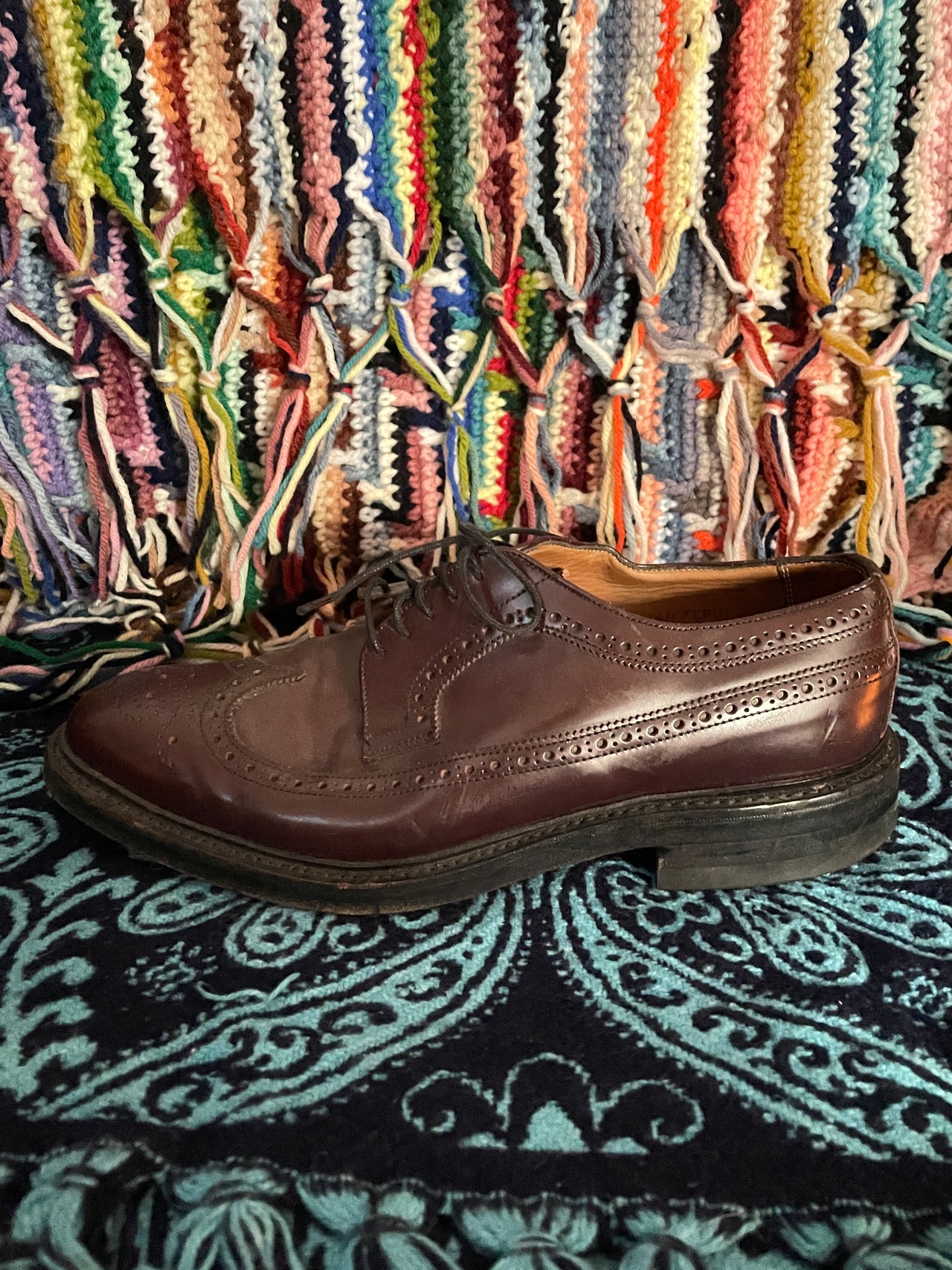 上品なブラウンカラーで、高級感のあるウイングチップデザインが施された、レザーシューズ。ブランドはカナダの高級紳士靴ブランド”Dack's"。赤みがかったブラウンが絶妙に良い色味です。ソールも高めなので、足元にボリューム感を出してくれます。多少の使用感などは見られますが、ソールの減りも少なく、コンディションは◎です。イングランド製なのもポイントが高いです。