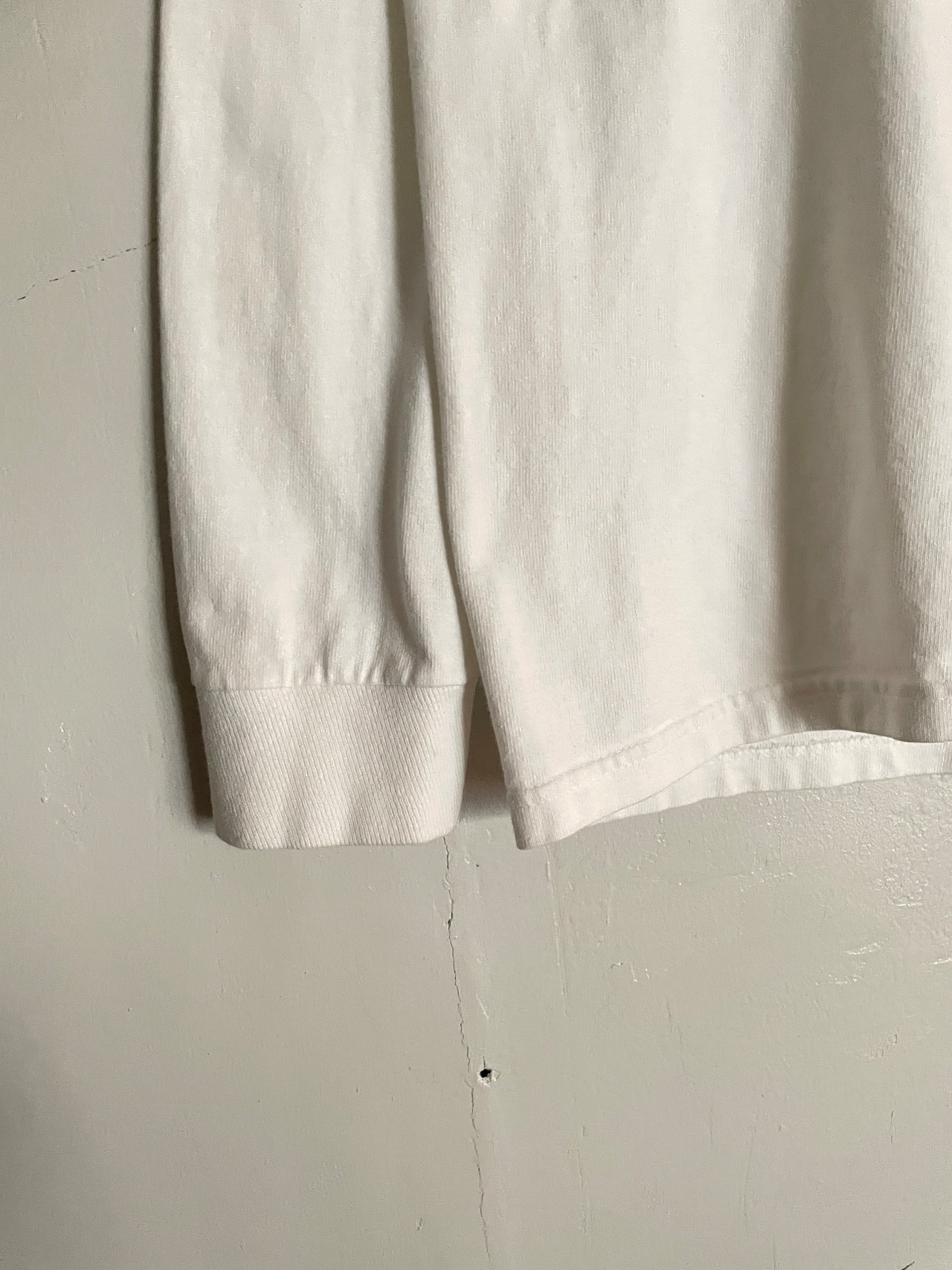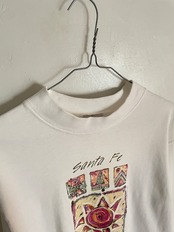 ホワイトボディに、民族調のアート感のあるプリントが施された、モックネックロンT。太陽や木や山などがお洒落にデザインされたアートグラフィックプリント。プリント上には”サンタフェ”のネームプリント入り。このデザインのアーティストであろう”Carol Hagan"のコピーライト入りです。モックネックなのも嬉しいポイント。大き過ぎず、小さ過ぎないサイズ感で、今の時期にはインナーとしても活躍してくれます。オニータボディでUSA製の1着です。