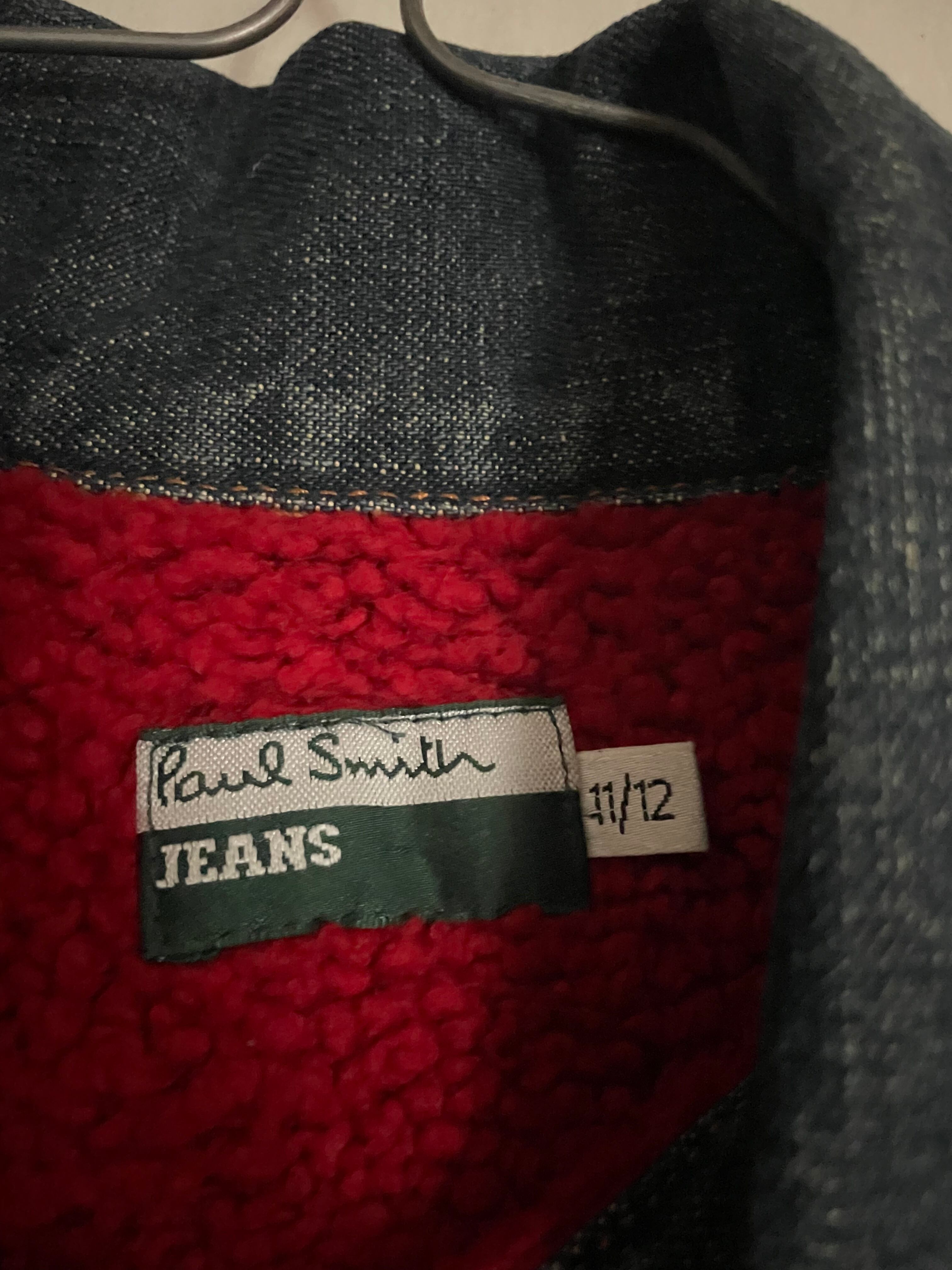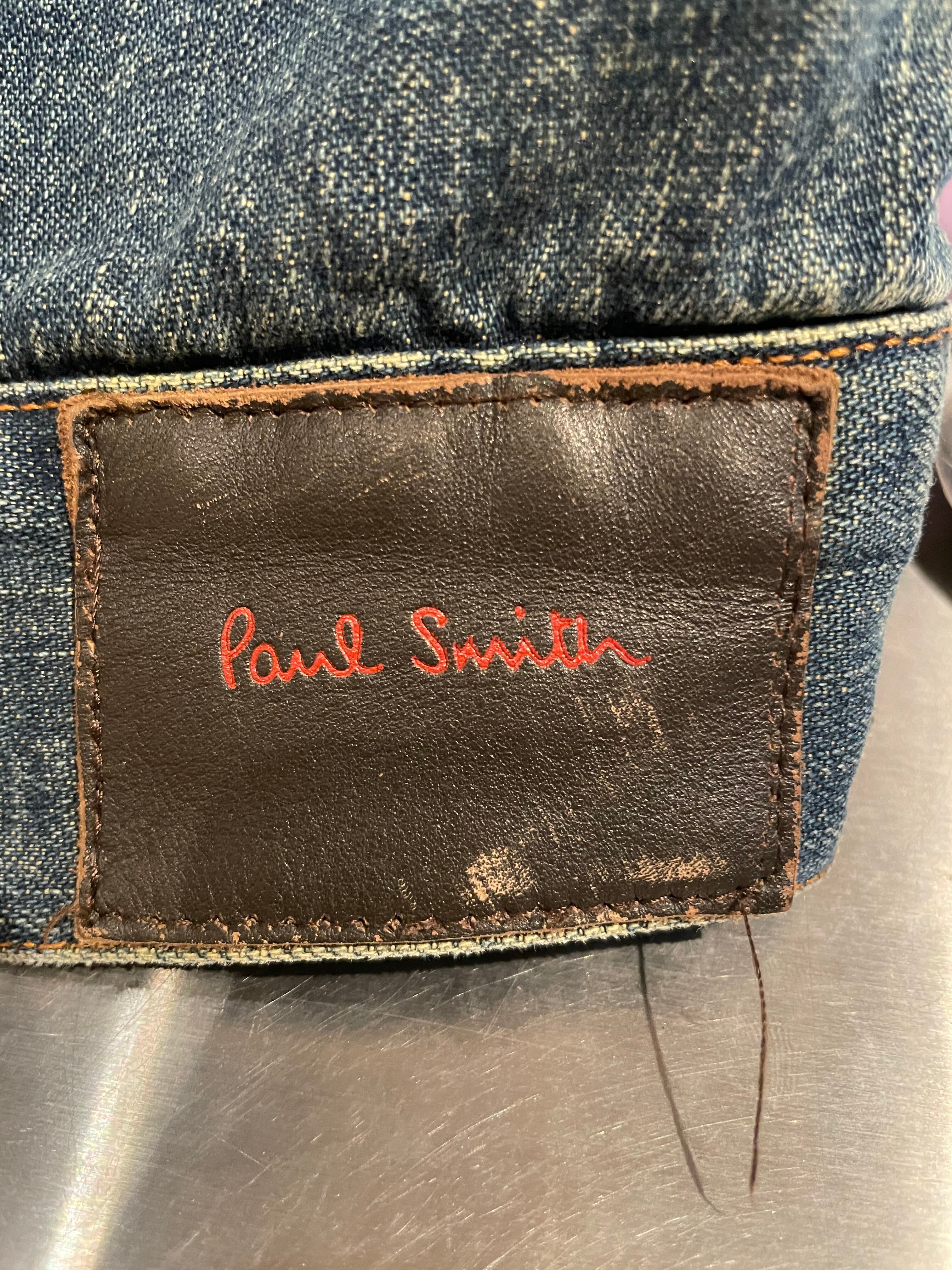 ポールスミスのデニムジャケット。カジュアルさと上品さを兼ね備えた一着。表地はしっかりとしたブルーデニムで、裏地はふわふわのボア仕様で、防寒性が高く、寒い季節でも快適に着られます。シルエットはすっきりめで大人っぽく着こなせるデザインです。