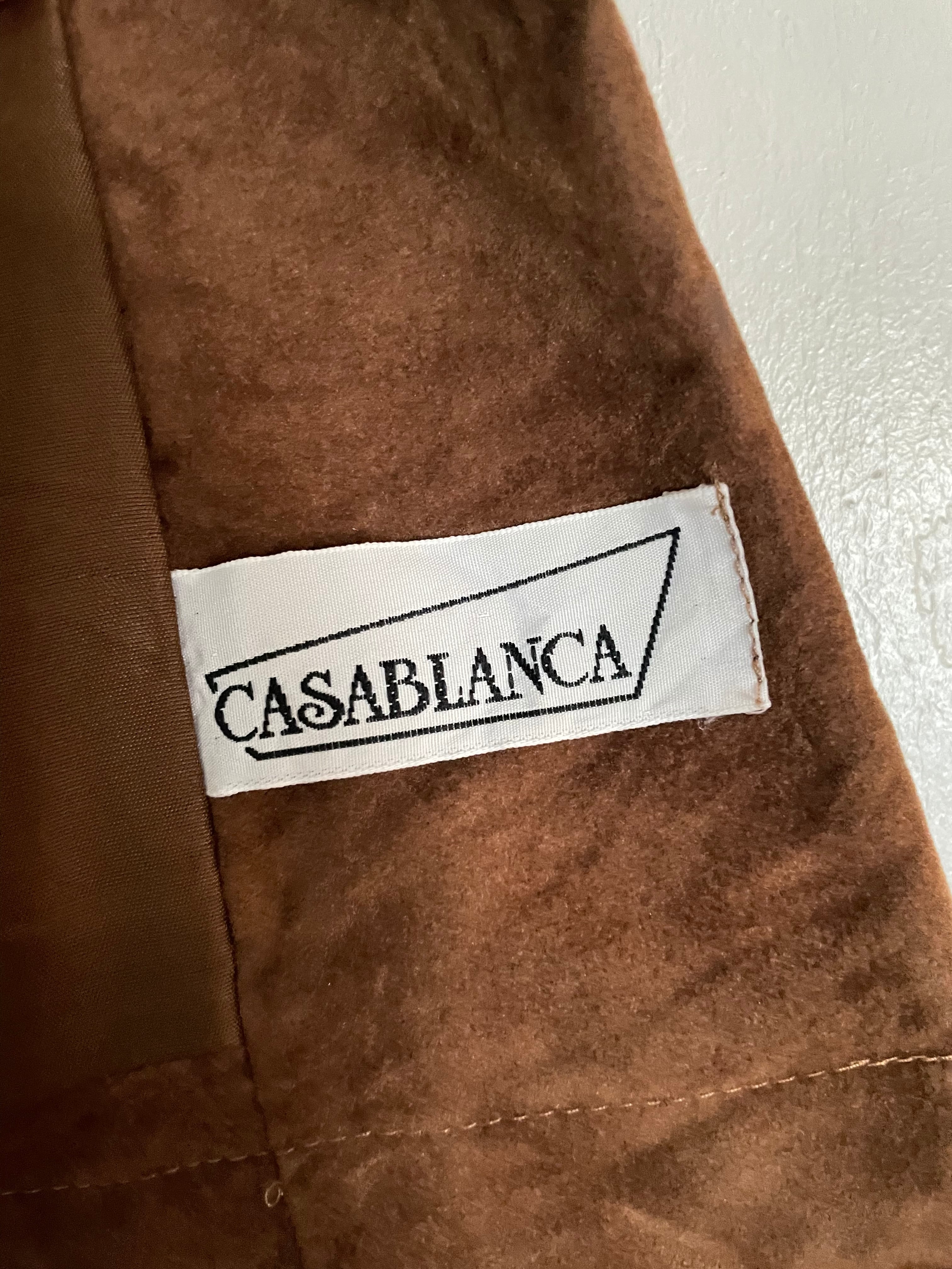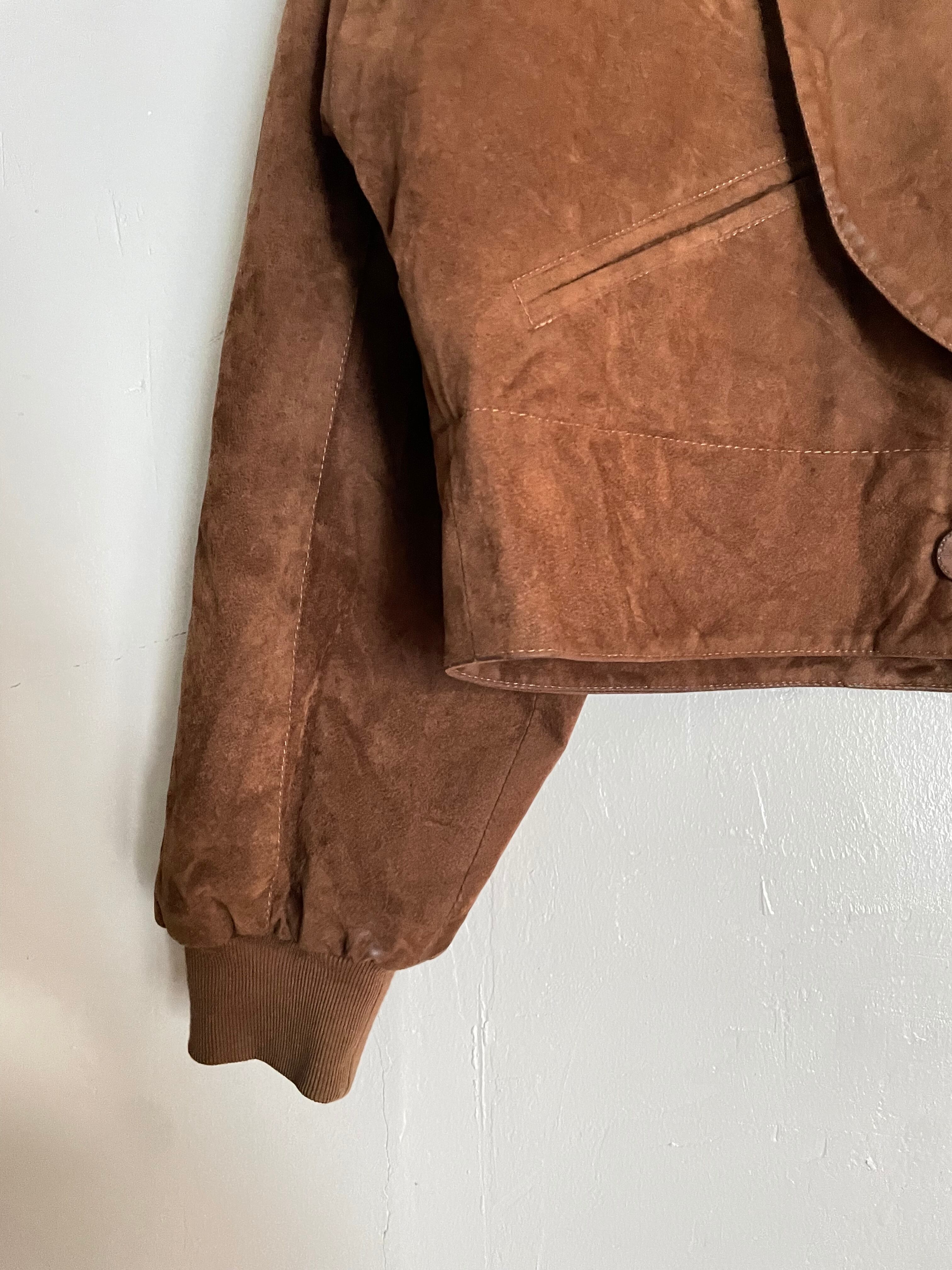 柔らかなブラウンカラーが落ち着いた印象を与える、ショート丈のジャケット。大きくカーブしたショールカラーが特徴で、クラシックな雰囲気と独特の抜け感を両立しています。ショート丈のすっきりとしたシルエットに、ウエスト付近のダブルボタンがさりげないアクセント。袖口はリブ仕様になっており、丸みのあるスリーブとのバランスが可愛い一着です。