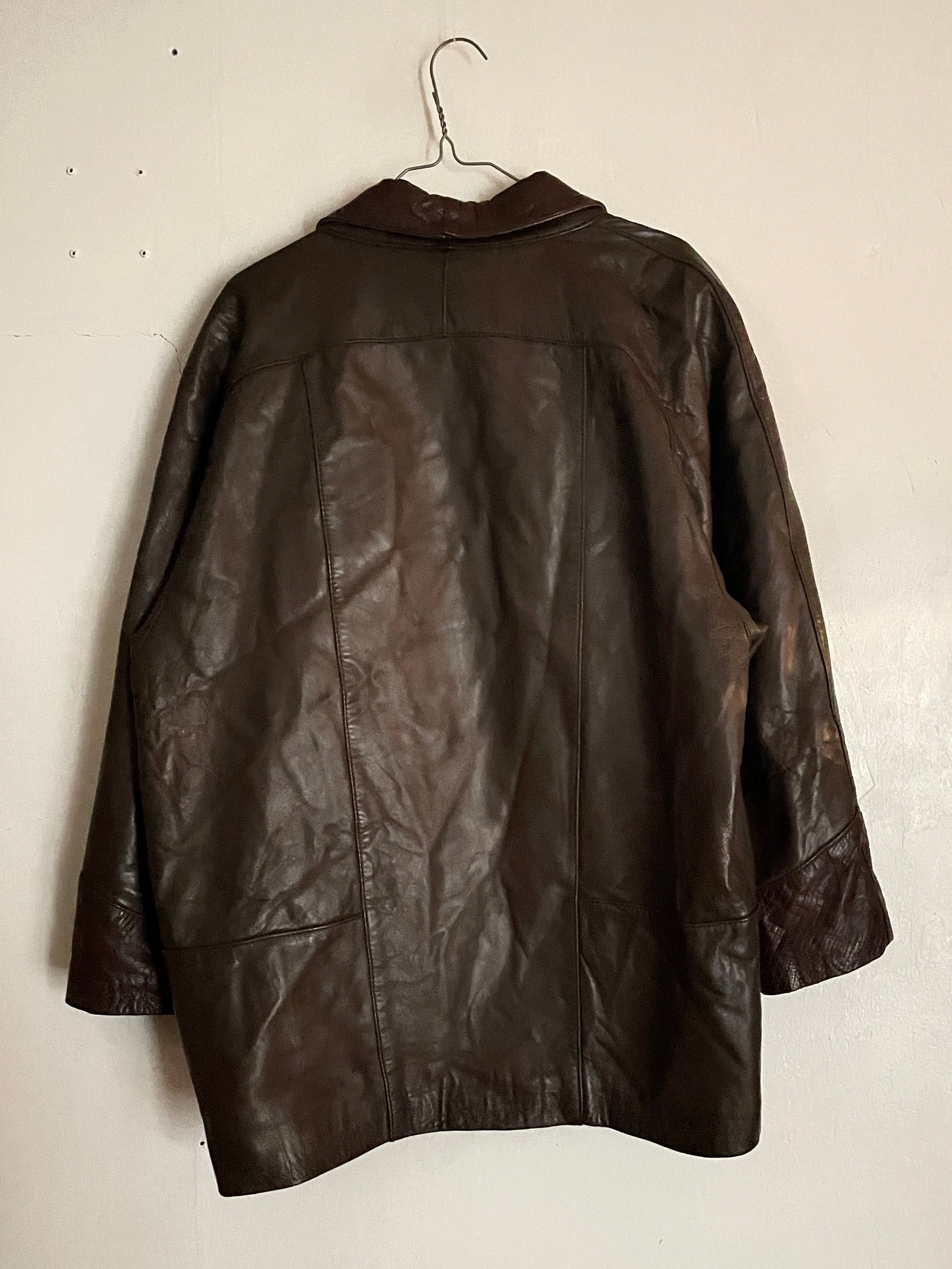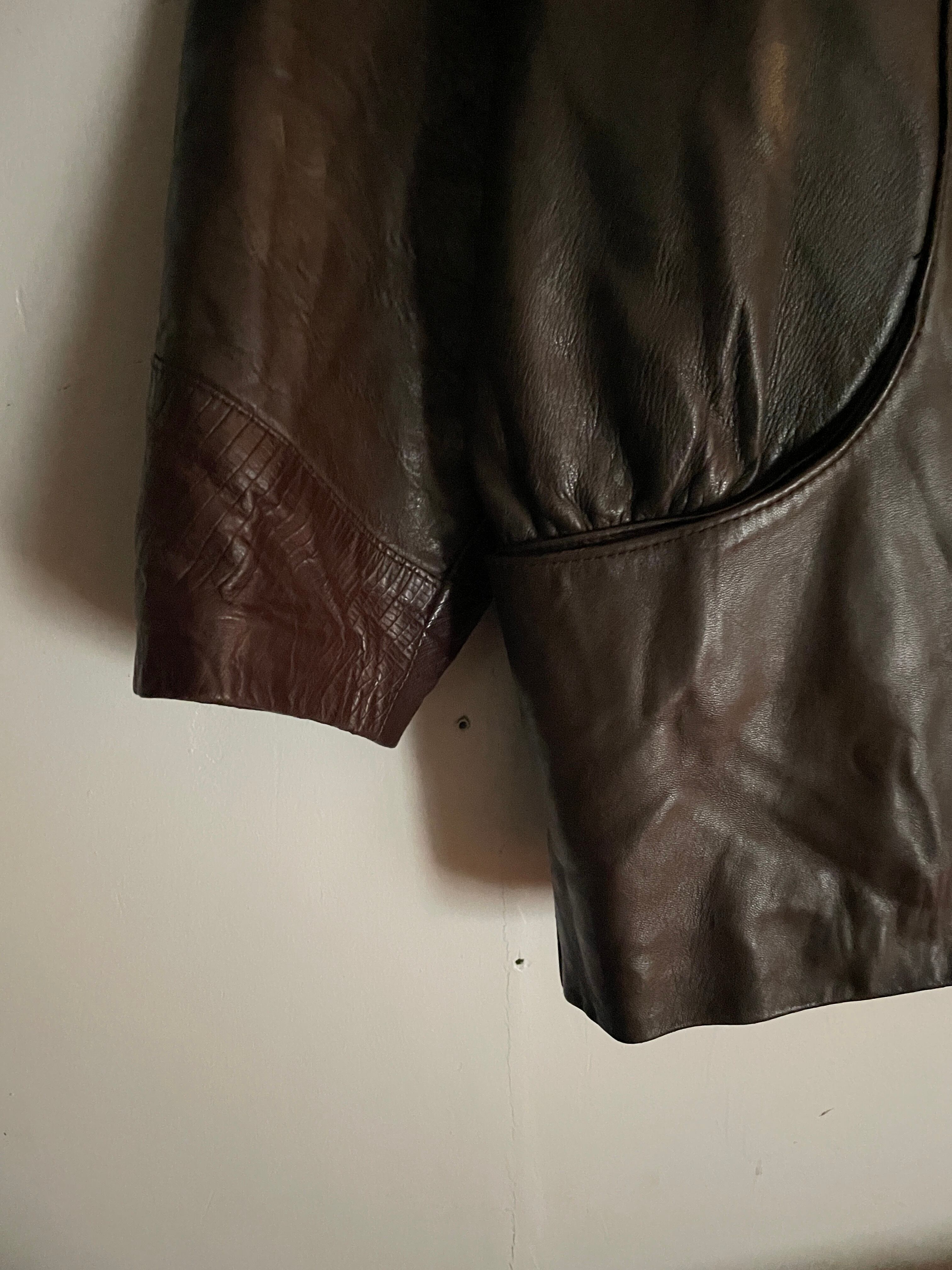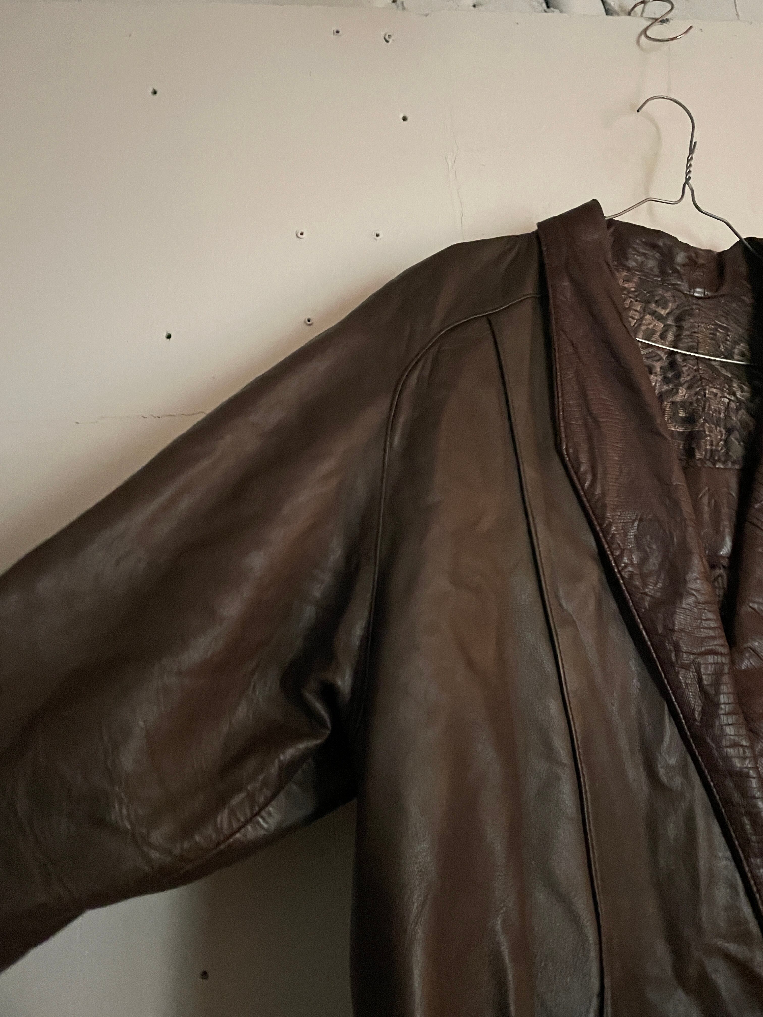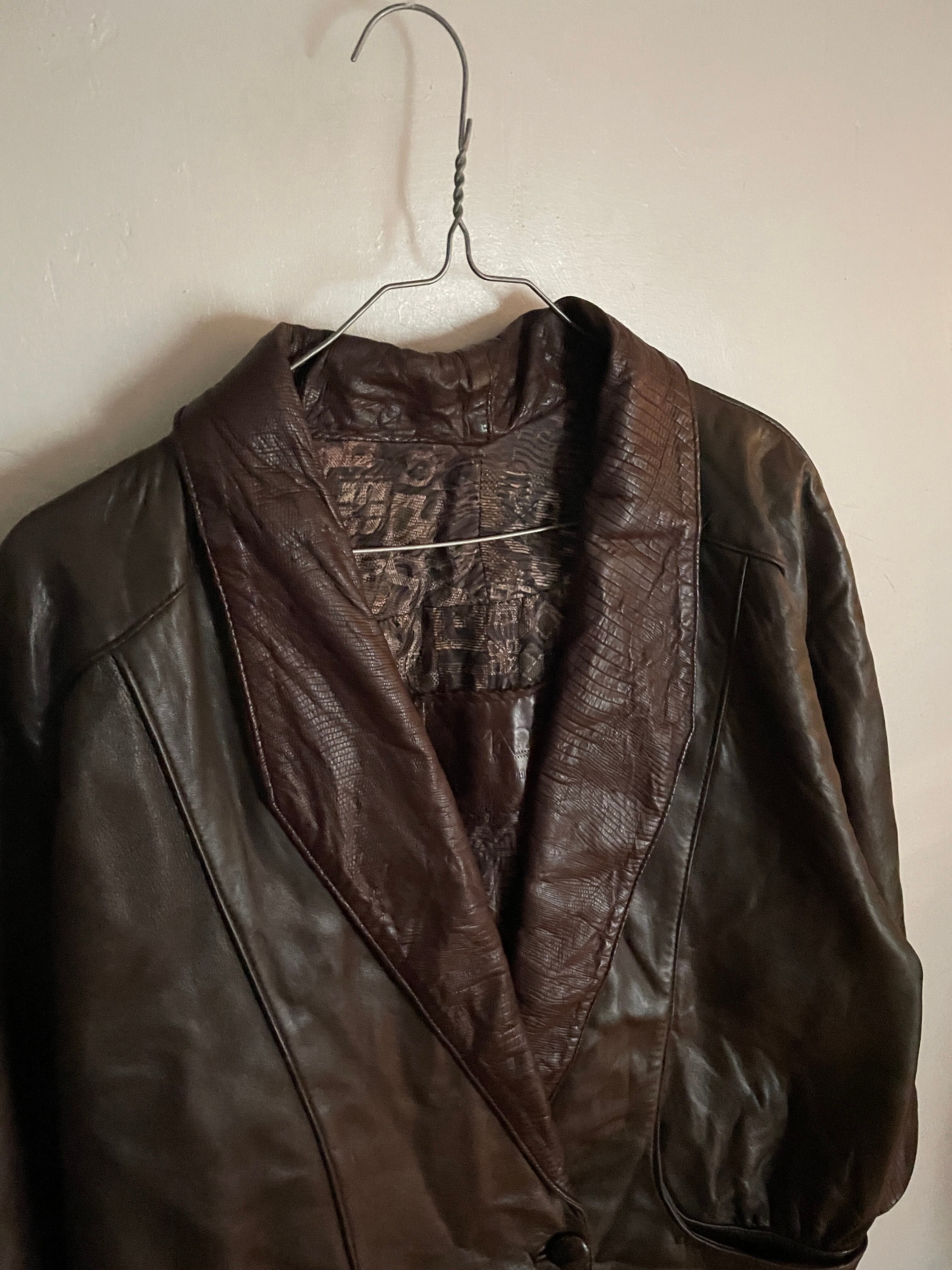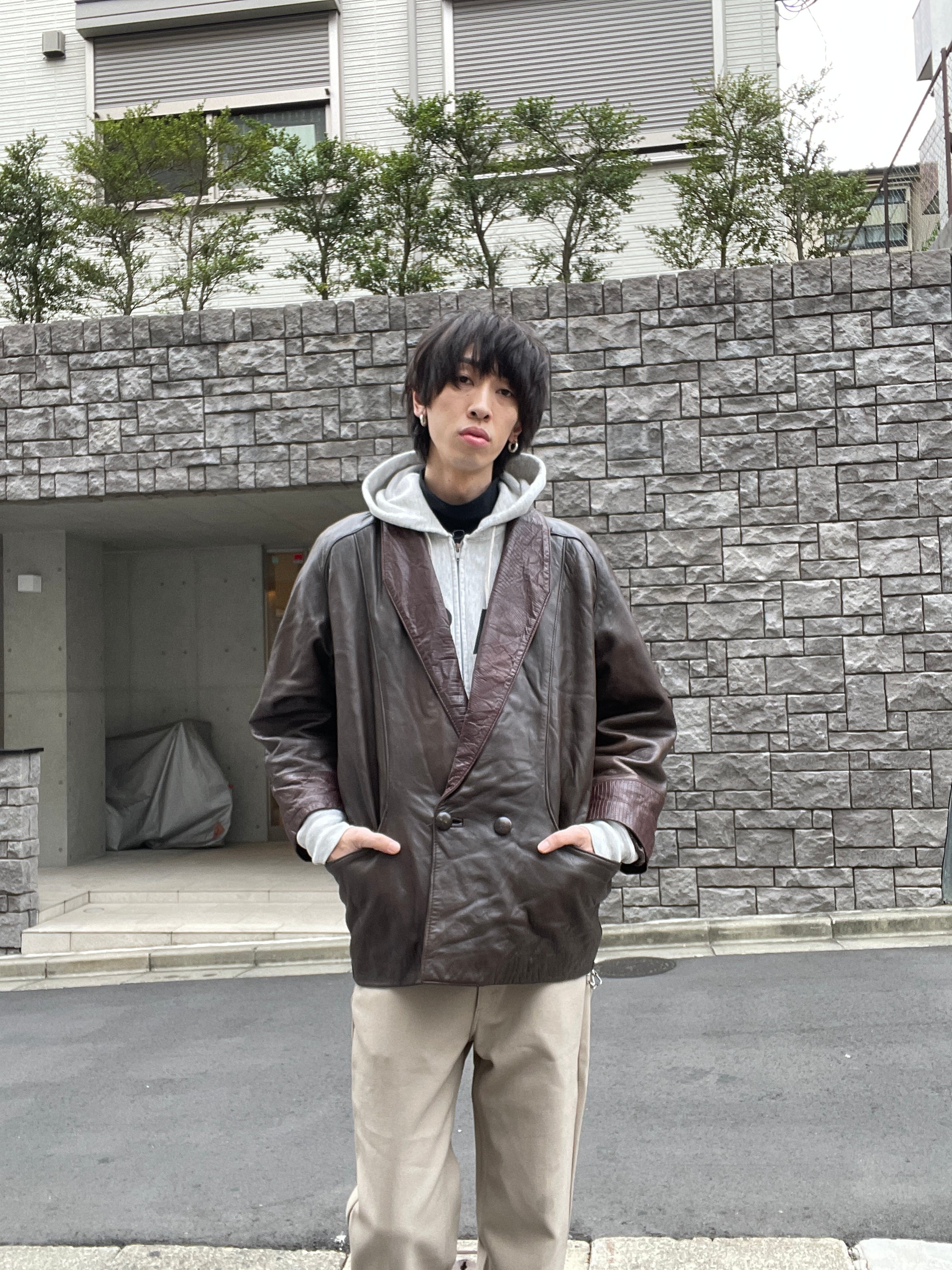 やや光沢のあるブラウンボディで、色気の感じられるダブルテーラード型のレザージャケット。もっちりとした質の良いレザー。襟、袖口部分の柄切り替えもお洒落すぎます。裏地はサラッとした質感になっていて、渋さのある総柄デザイン。チラッと見えるのがさりげなくて◎です。ゆったりとしたサイズ感なので、インナーにもしっかりと着込めそうです。今の時期には主役になること間違いなしの1着です。
