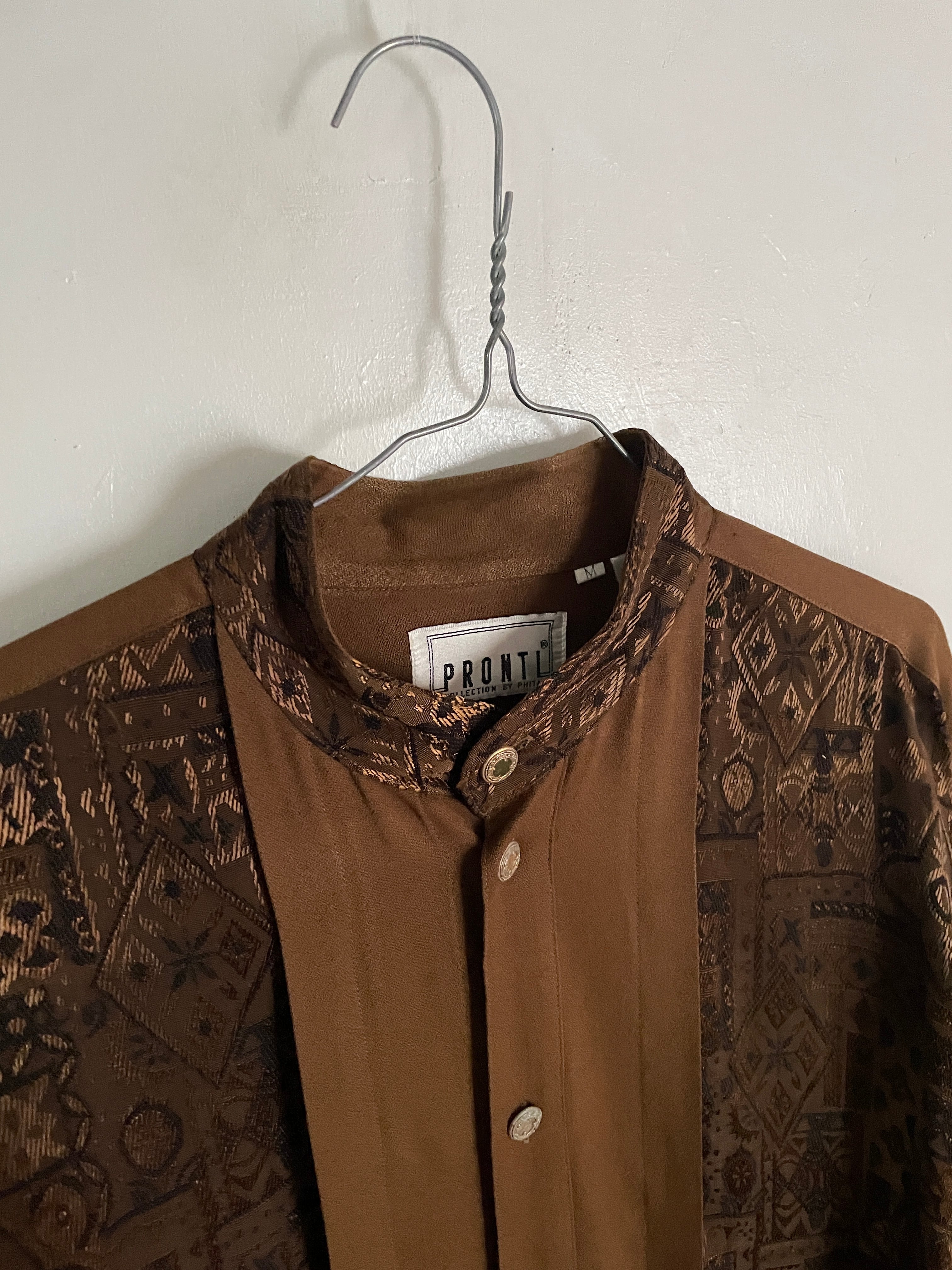 Old PRONTI Brown Pattern Swiching Design No Collar L/S Shirt