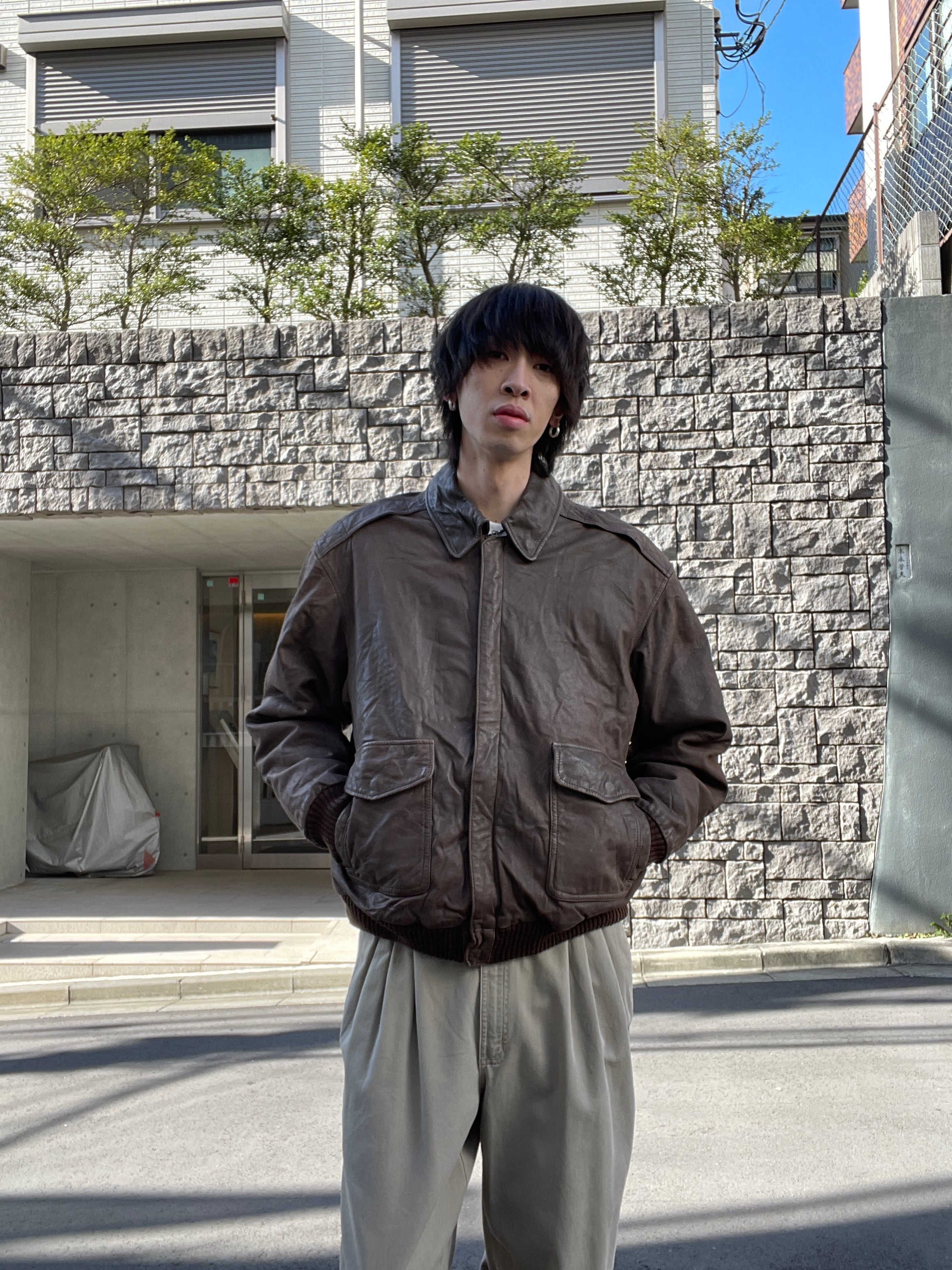 ブラウンボディで、A-2タイプのクラシックなデザインが魅力的なレザージャケット。一番使いやすいタイプのレザージャケットかと思います。袖口、裾はニットのリブ仕様。程良い丈感で、身幅はたっぷりなボックス型シルエットです。様々なファッションにハマってくれる、今の時期1着は持っておきたいアイテムかと思います。