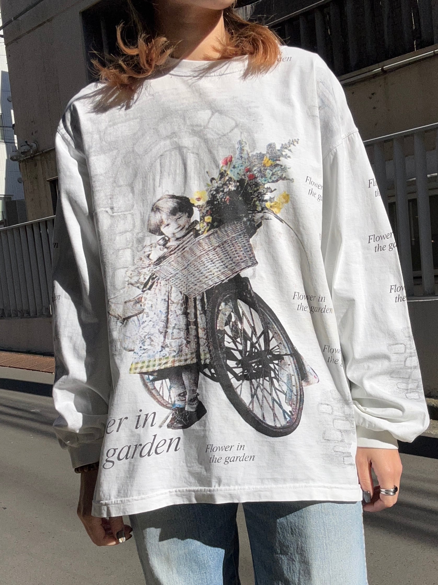 少女と自転車、花束をモチーフにしたノスタルジックなグラフィックが印象的なロンTです。「Flower in the garden」の文字が全体に散りばめられ、物語性のあるデザインに仕上がっています。アート感覚で着られる一枚で、デニムやスラックスと合わせて主役使いはもちろん、レイヤードにもおすすめです。