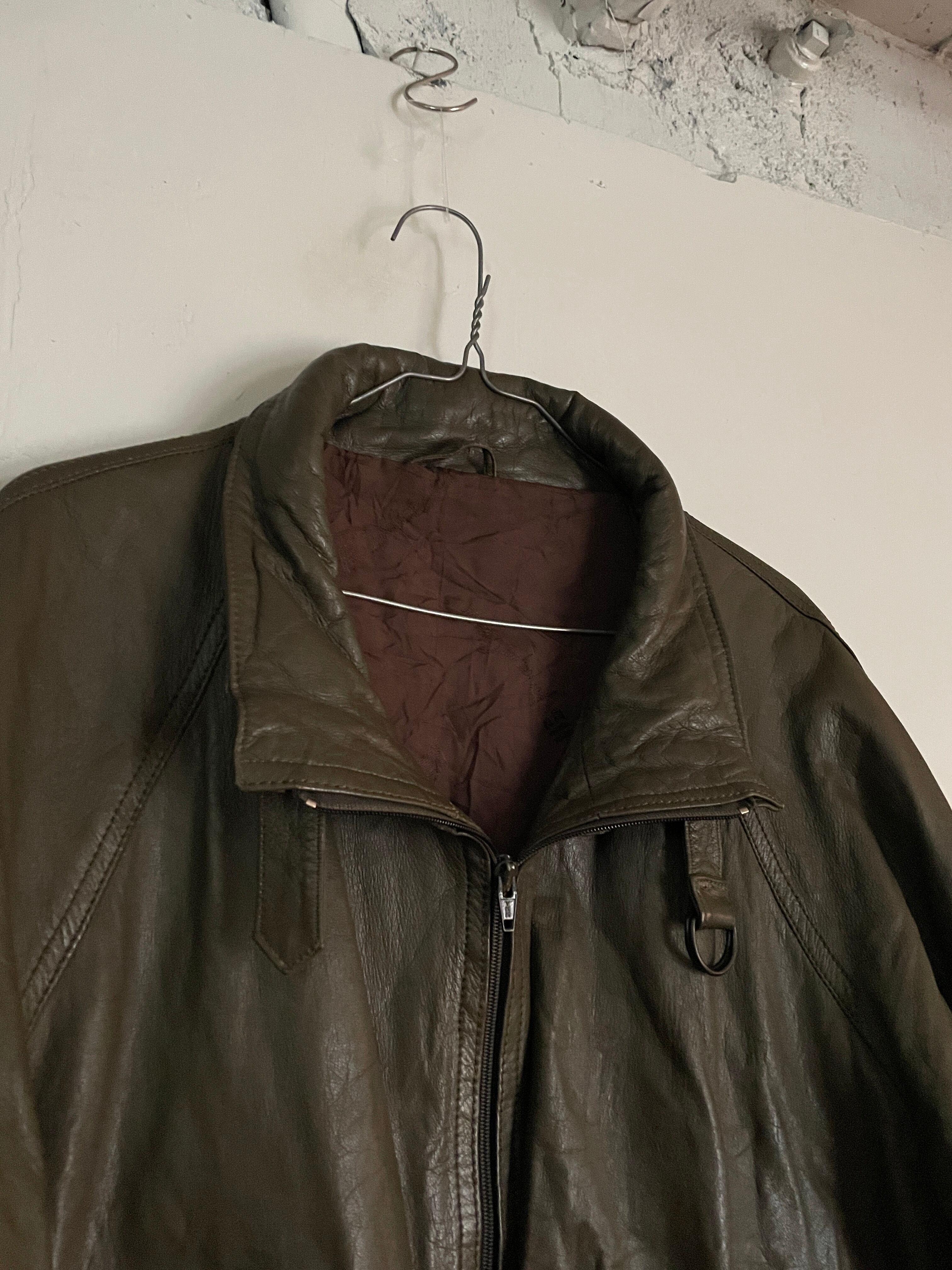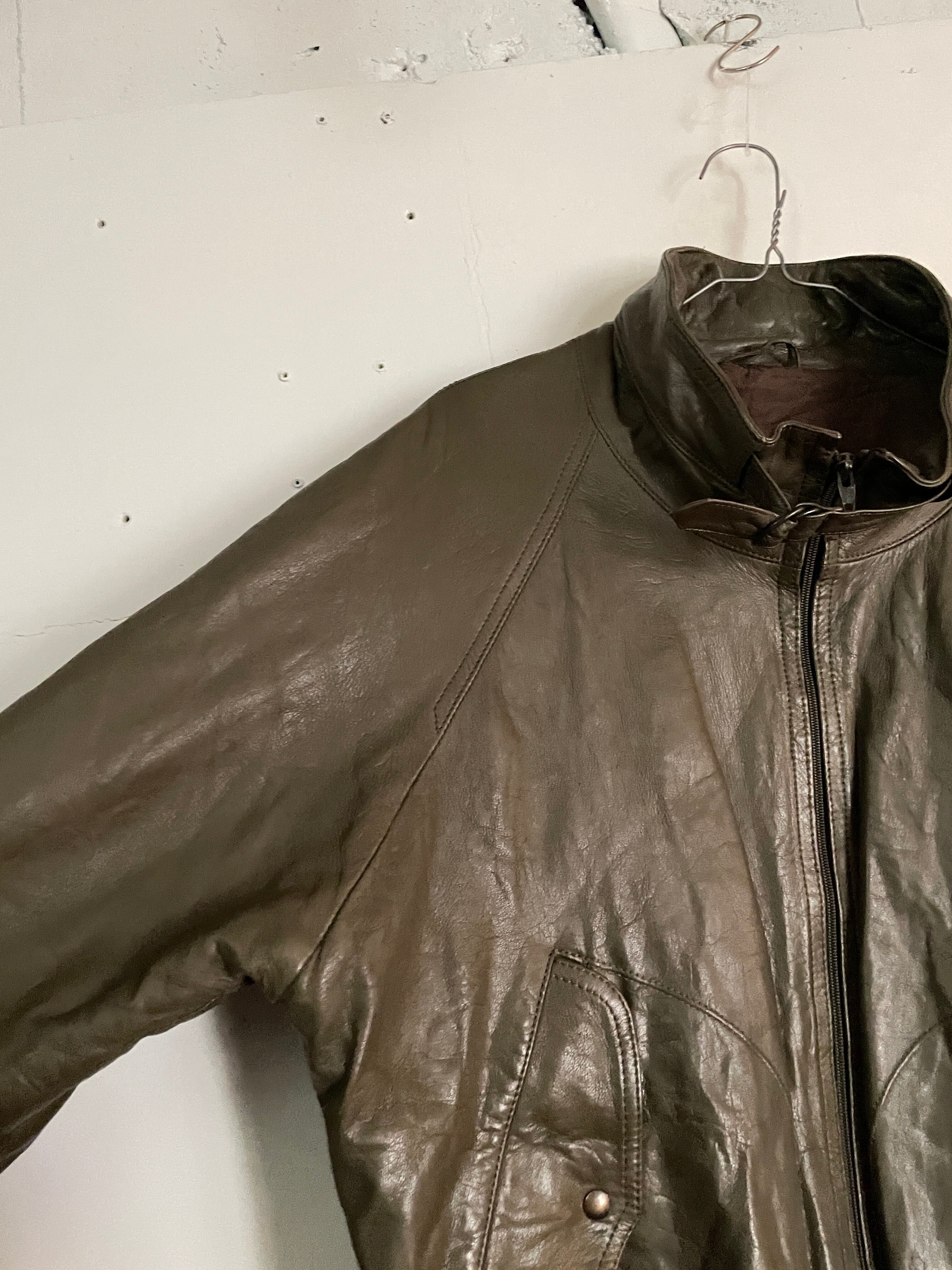 色気のあるカーキボディで、ネック部分にベルトが取り付けられた、レザージャケット。ハイネックでも、折って着てもかっこいい1着。モチっとした上品なレザー素材。短丈めで身幅たっぷりな今っぽいシルエットも魅力的です。ブラックやブラウンなども良いですが、こういった変わった色のレザージャケットも、周りと差別化をはかれて、かなりお洒落かと思います。