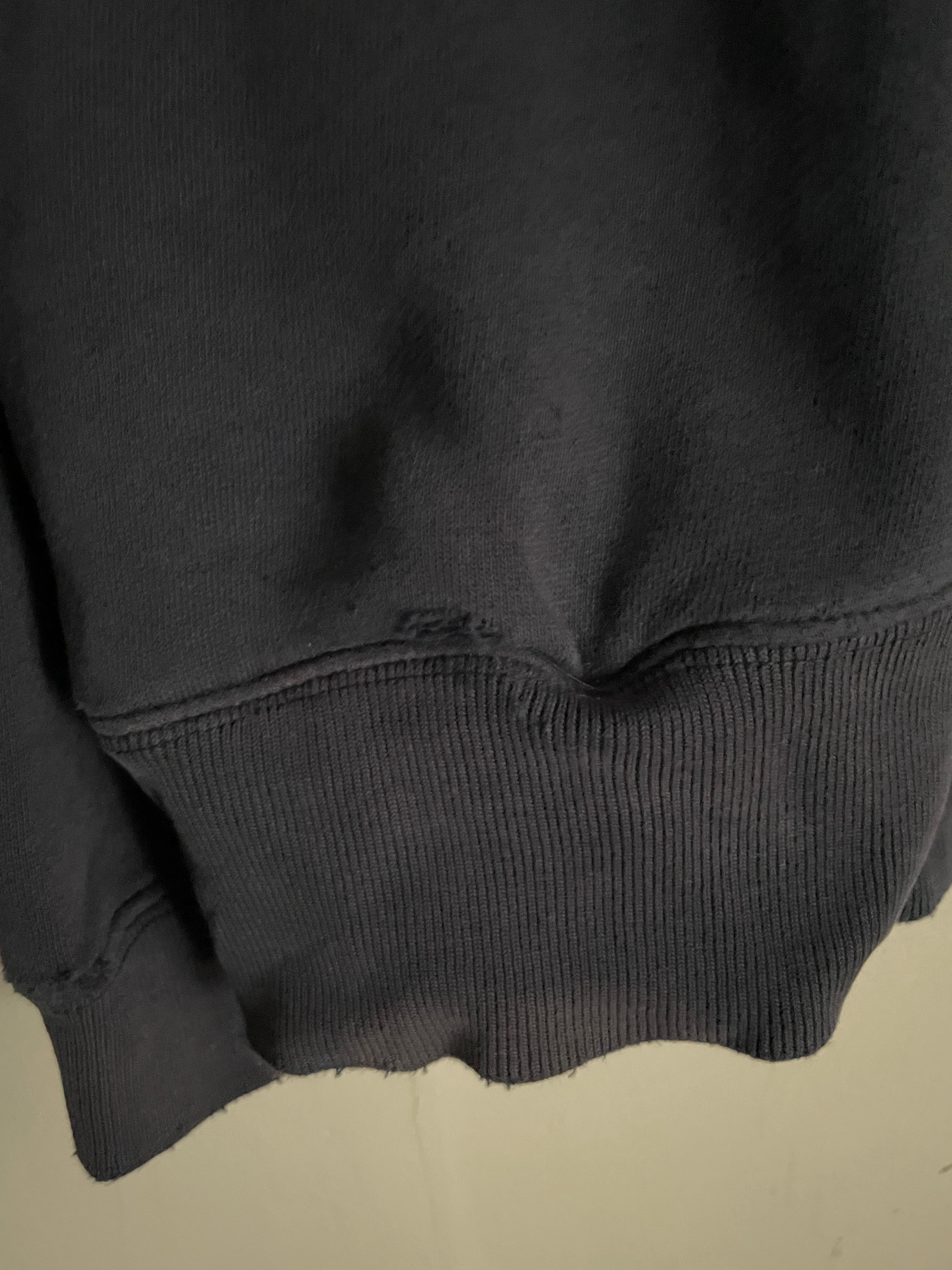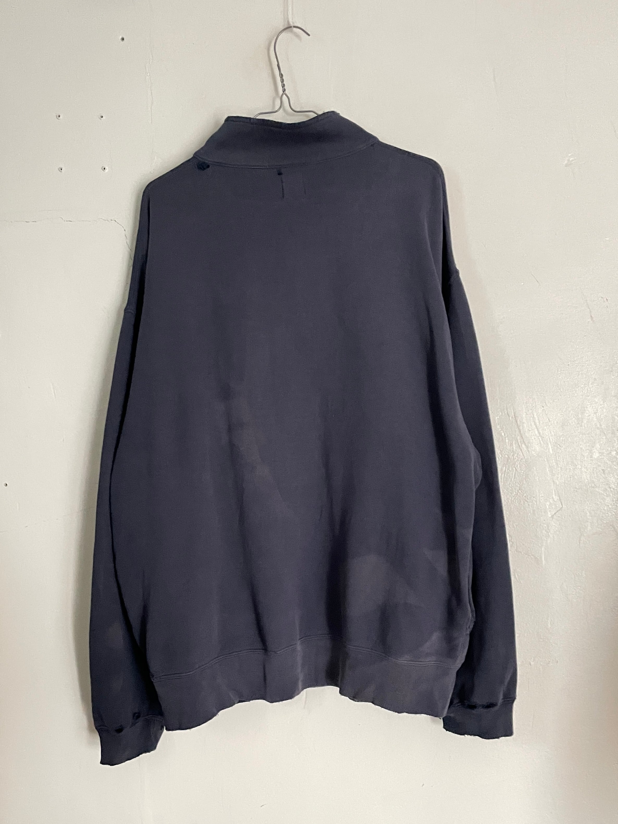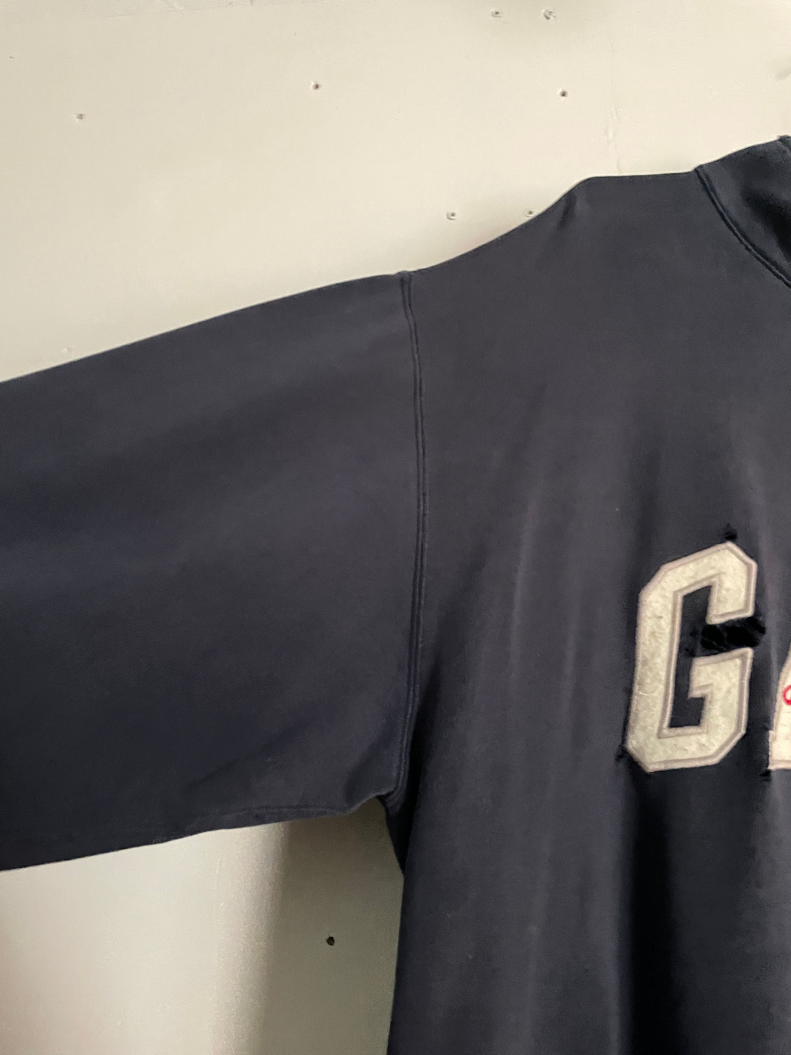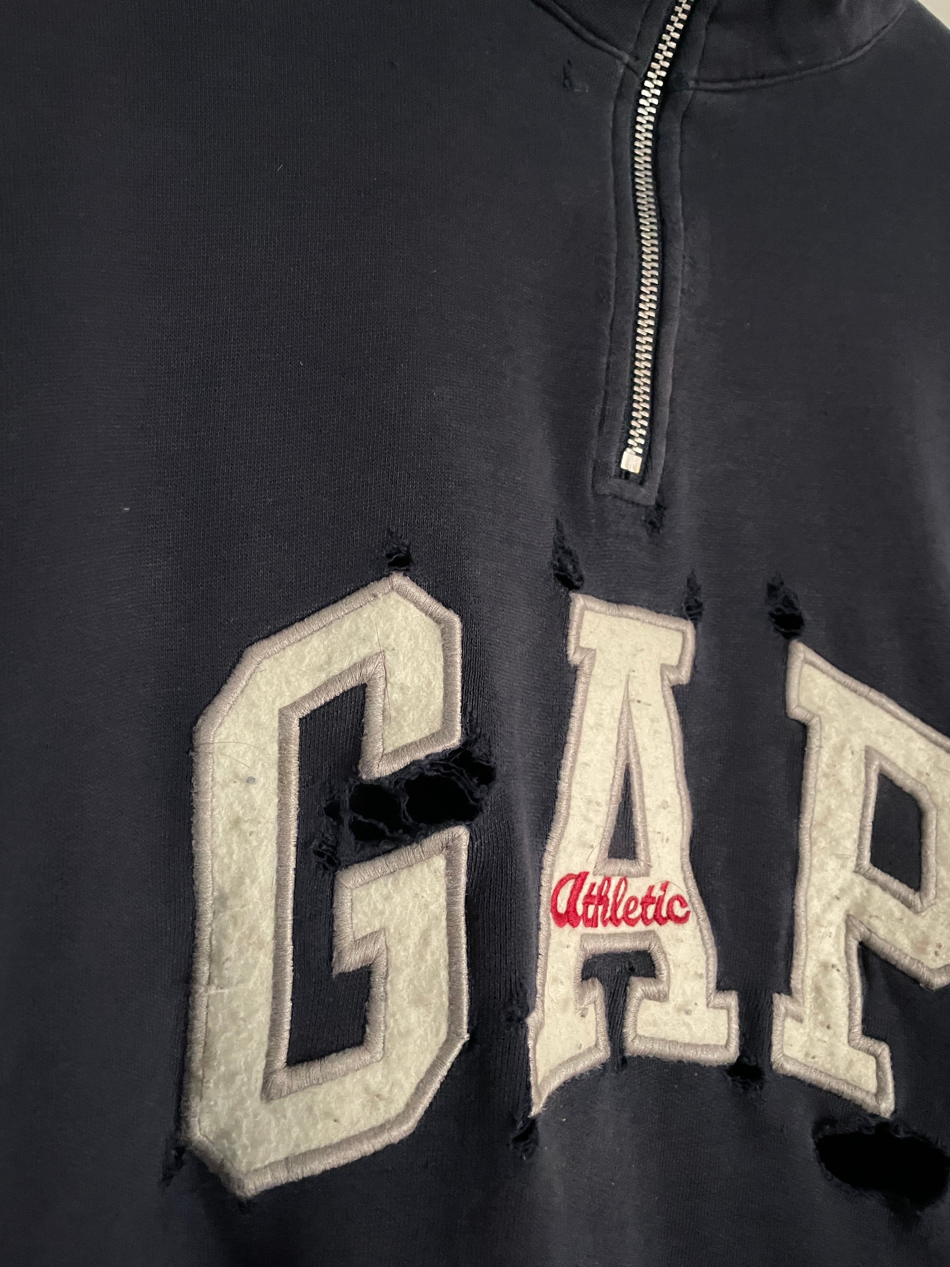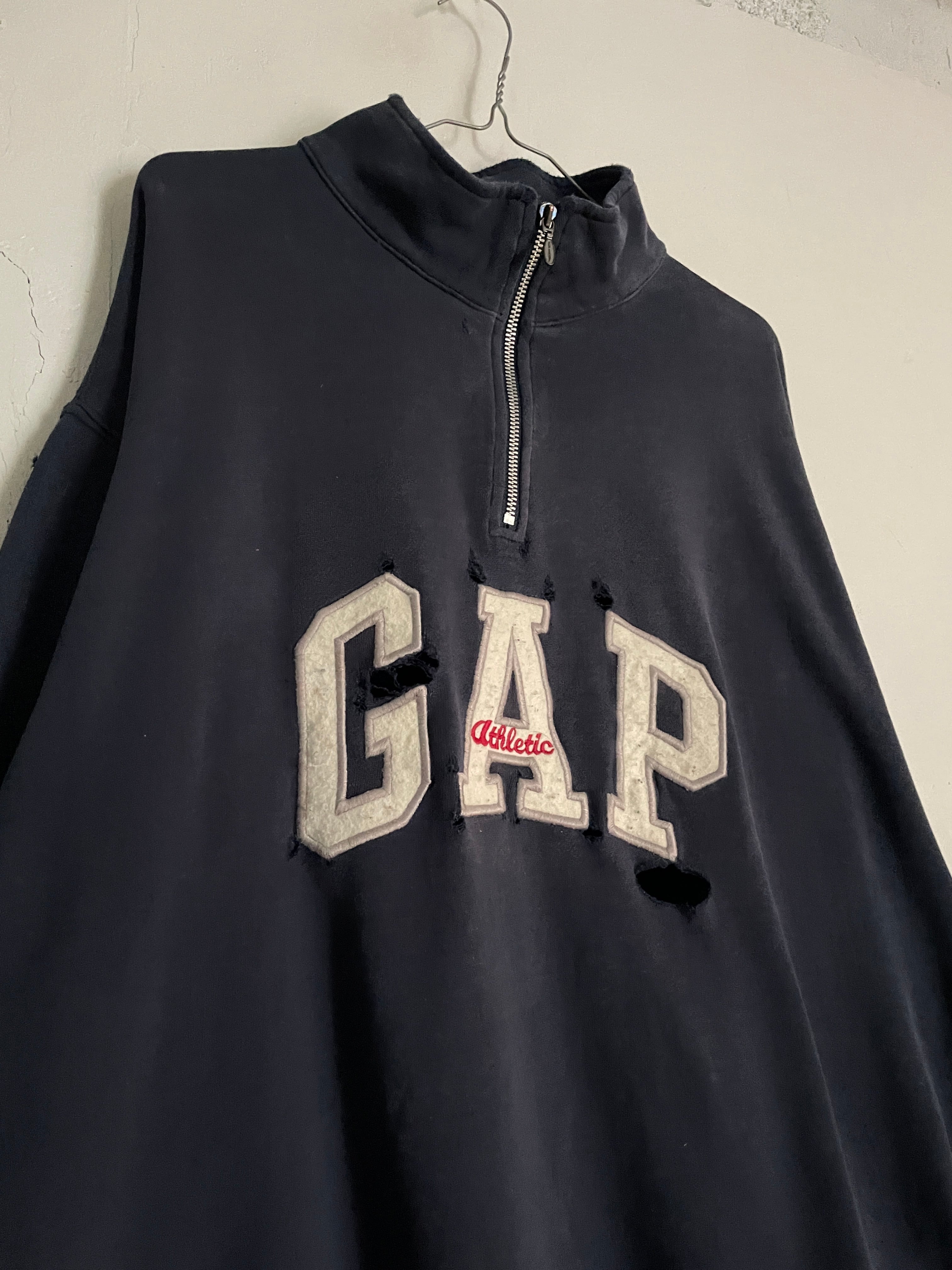 フェードしたネイビーボディで、ダメージデザインが施された、ギャップのハーフジップスウェット。真ん中にはデカめなギャップのロゴ刺繍。フロントや袖部分のボロ感が堪らなくかっこいい1着です。しっかりとポケット付きなのも嬉しいです。ゆったりとしたサイズ感で、ラフに着られるのも魅力的です。一枚ではもちろん、インナーとしても活躍してくれるアイテムです。