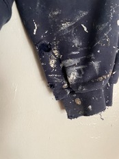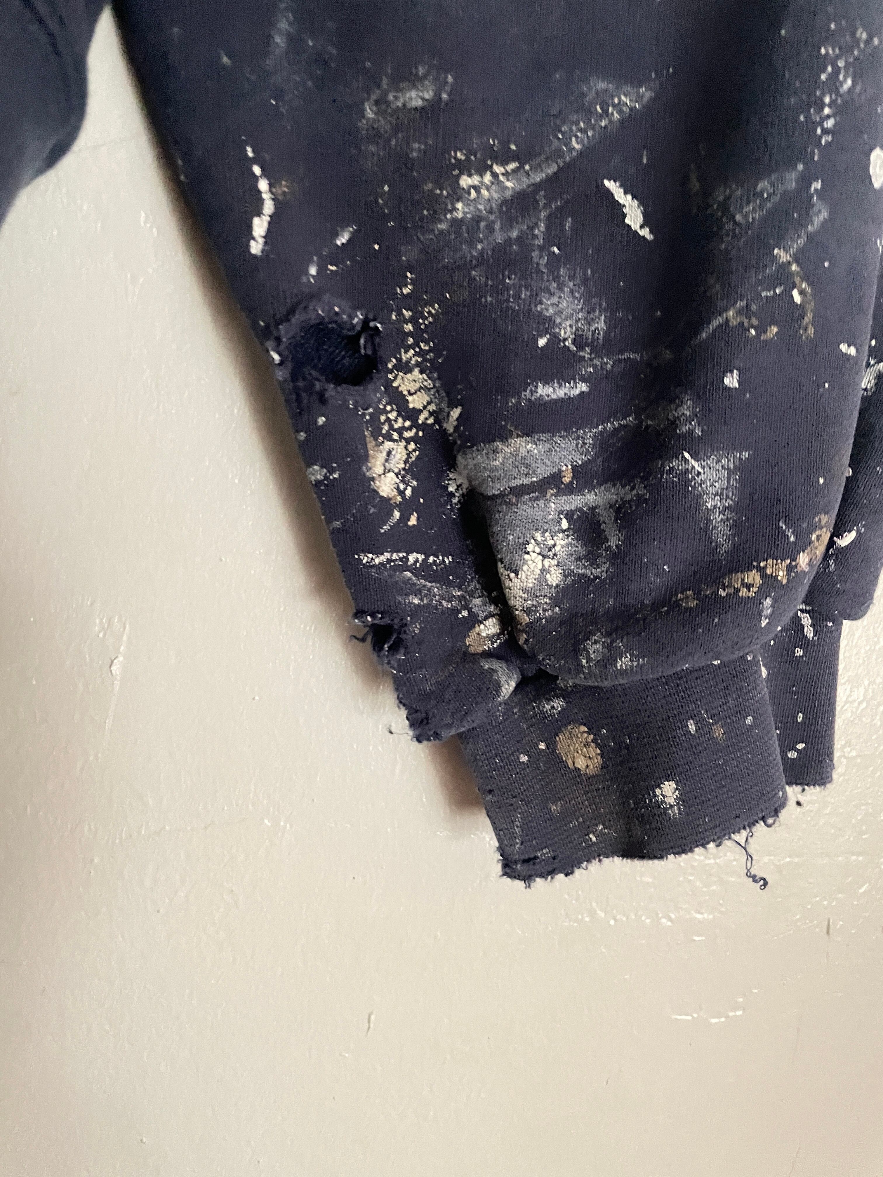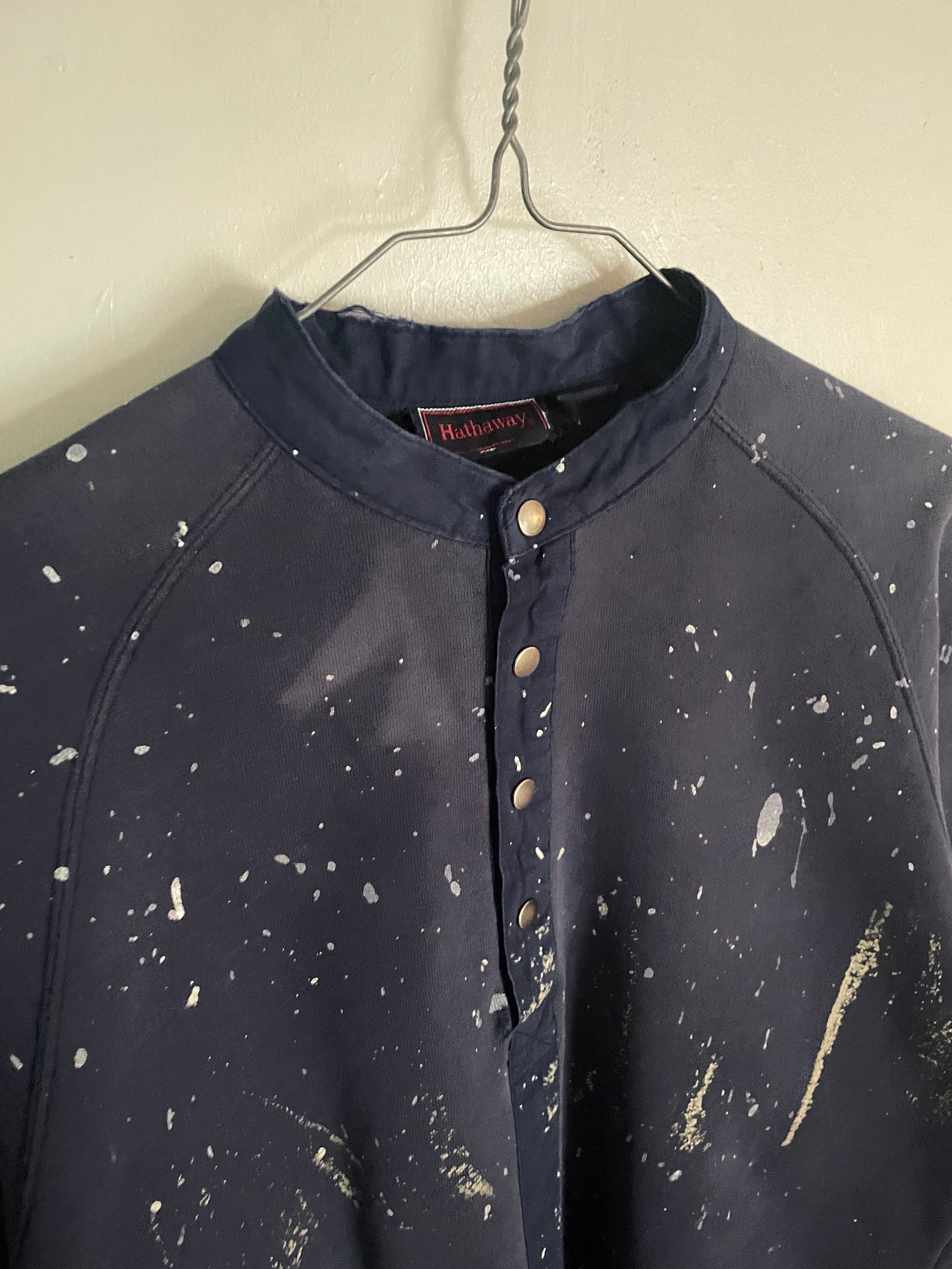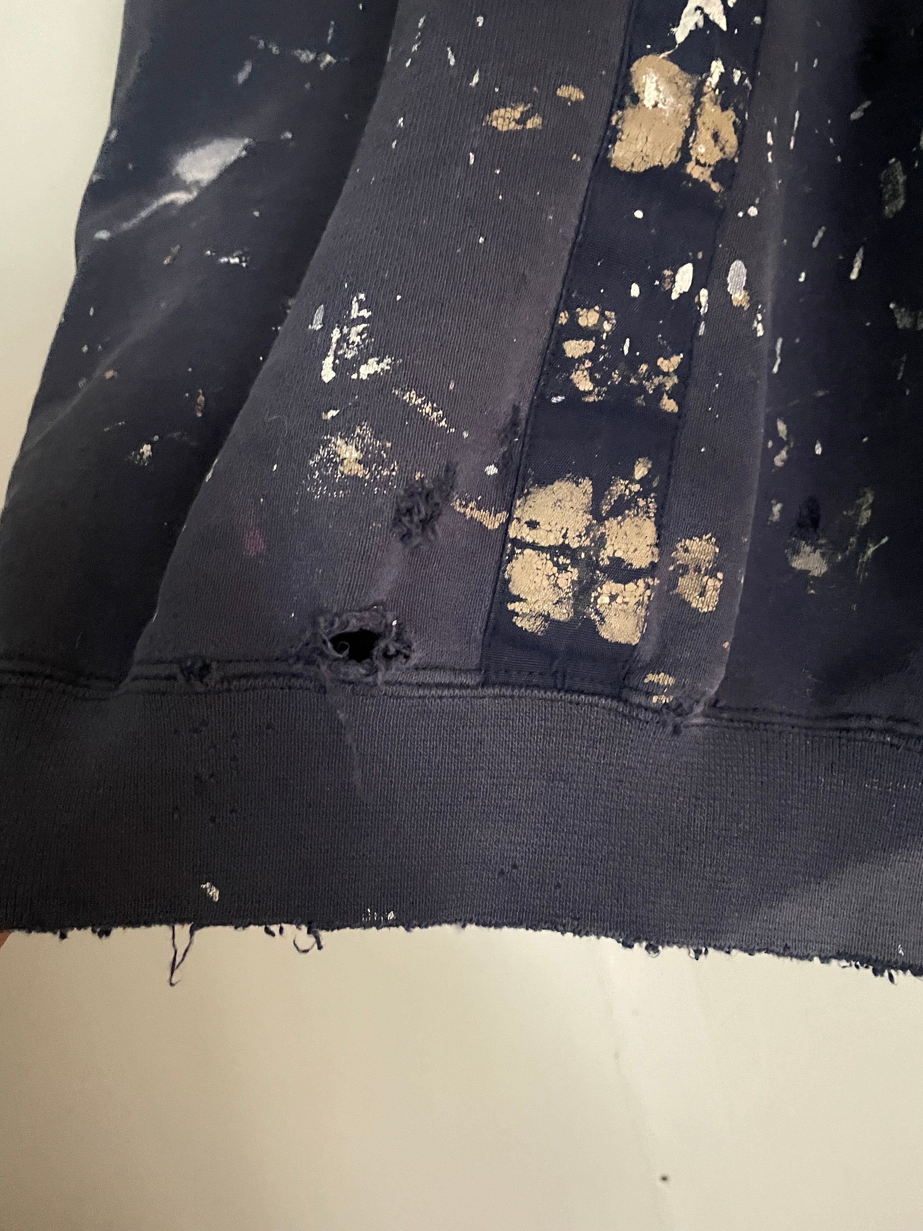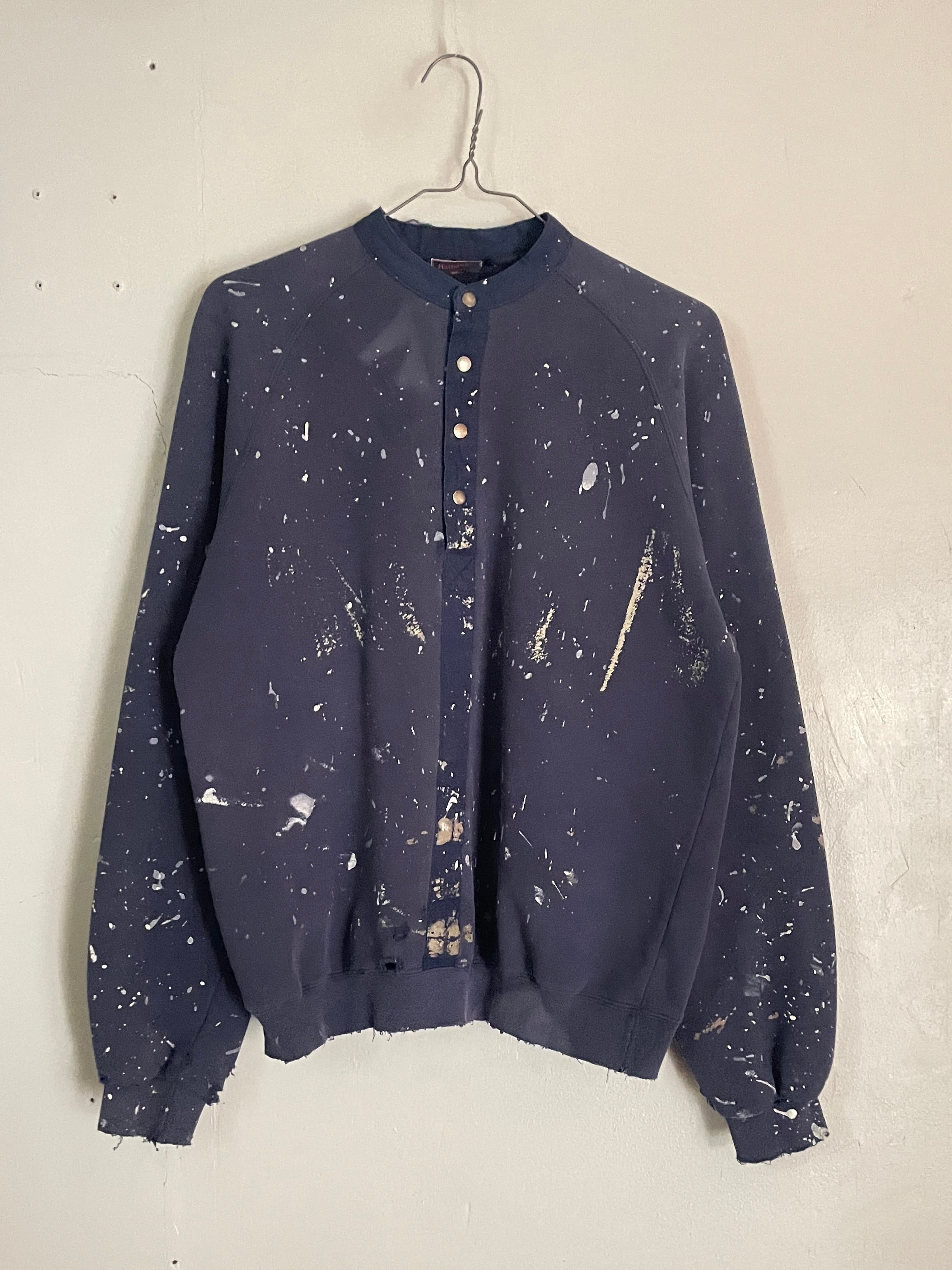 褪せたネイビーボディで、満遍なくペイントデザインが施された、スウェットプルオーバー。全体のボロ感が堪らなくかっこいい1着です。縦に切り替えが施されていて、スナップタイプなのも嬉しいポイントです。大き過ぎず、小さ過ぎないサイズ感なので、男女共におすすめしたい1着です。今の時期にはインナーとしても活躍してくれます。