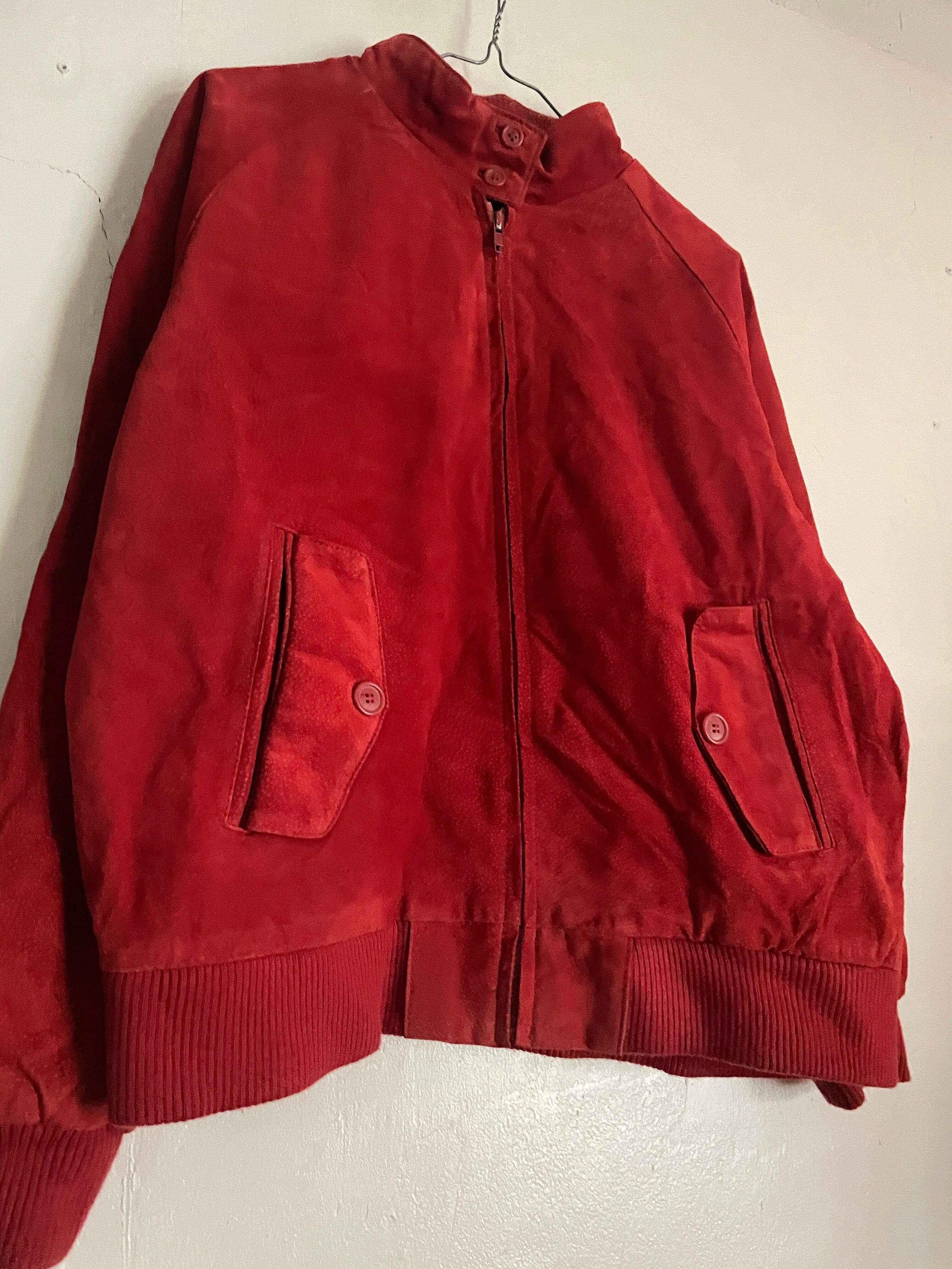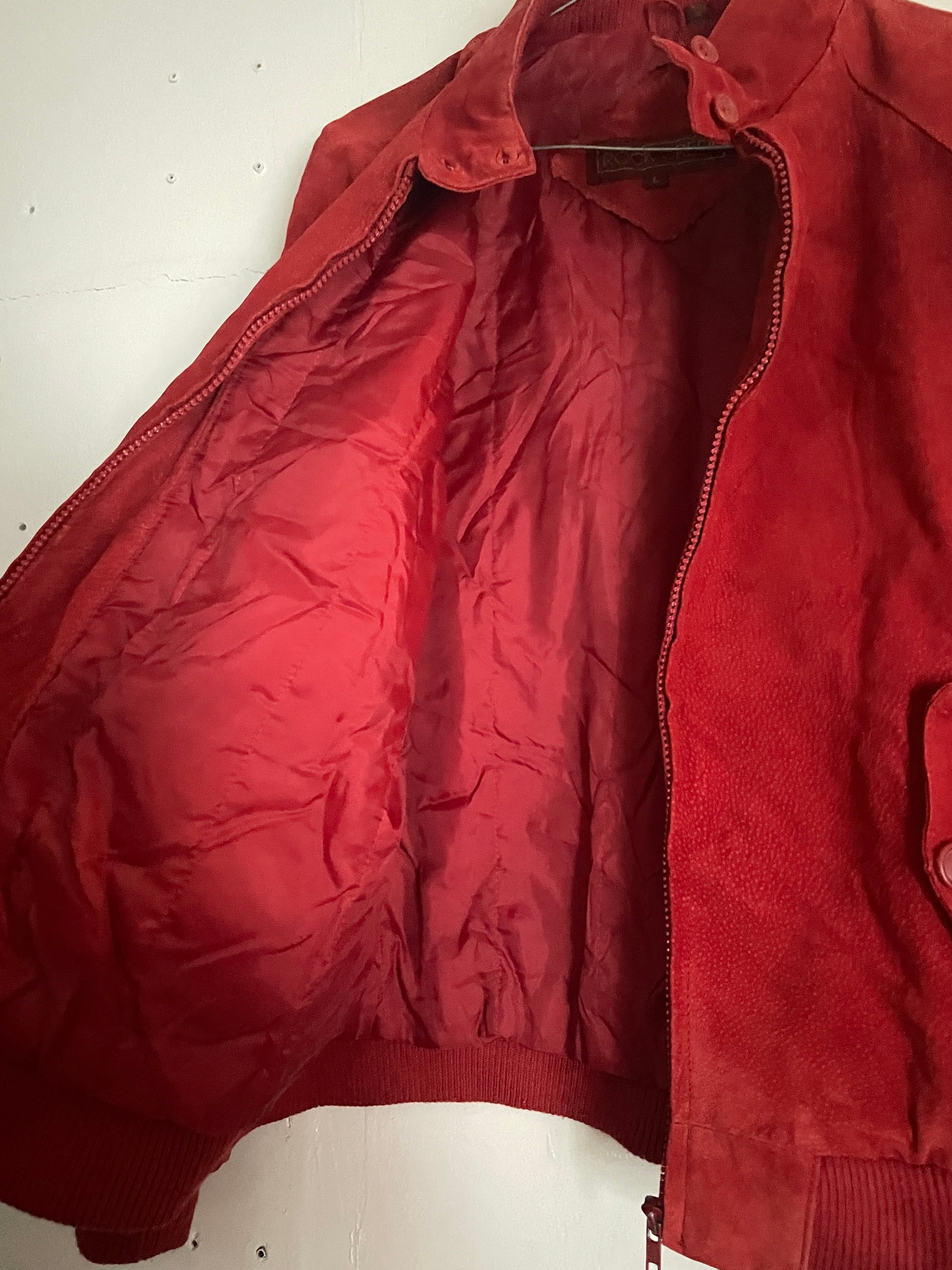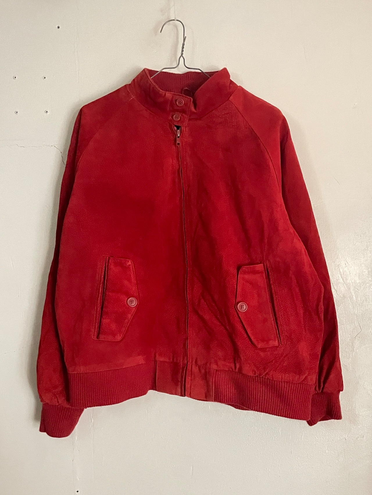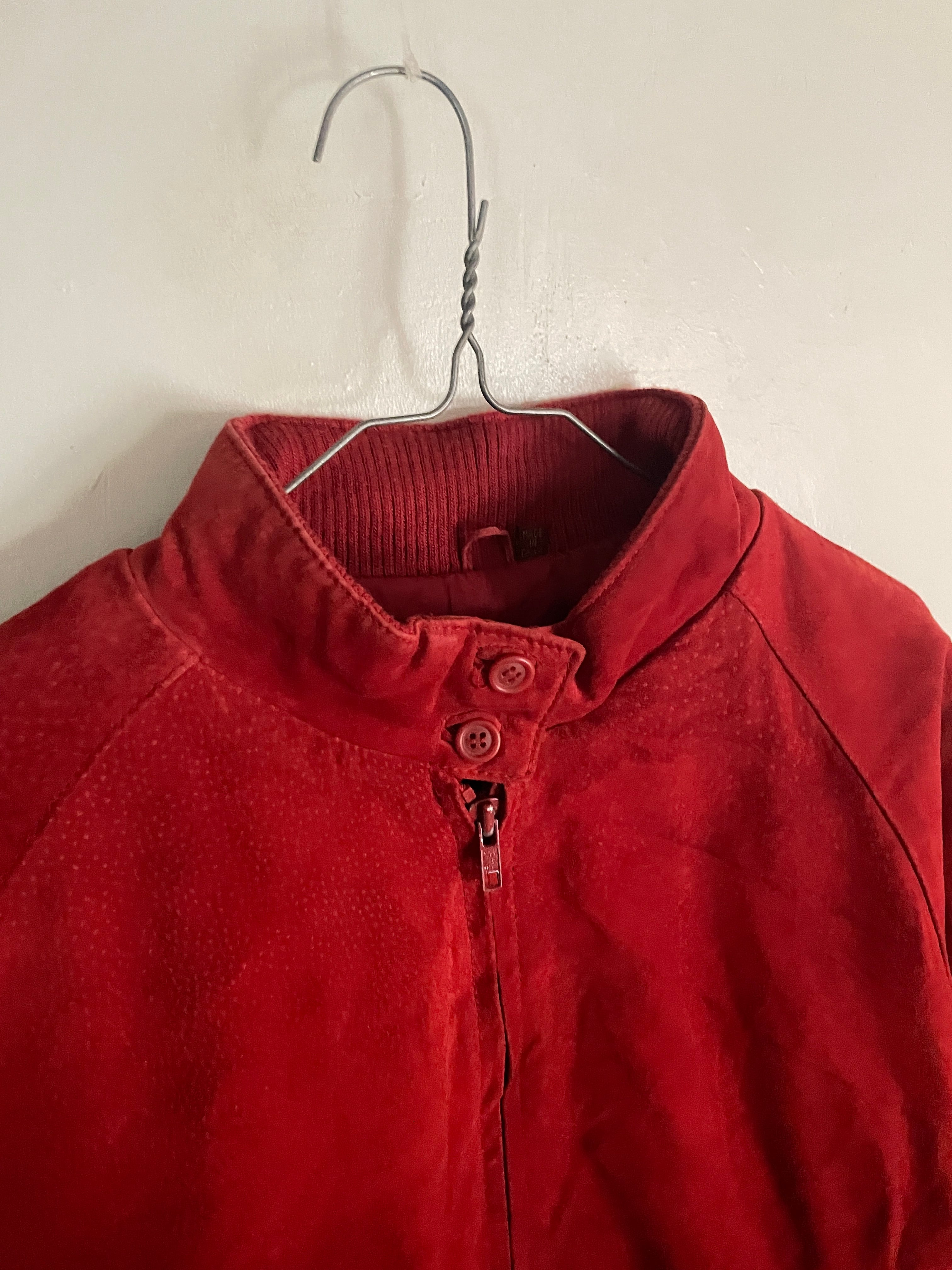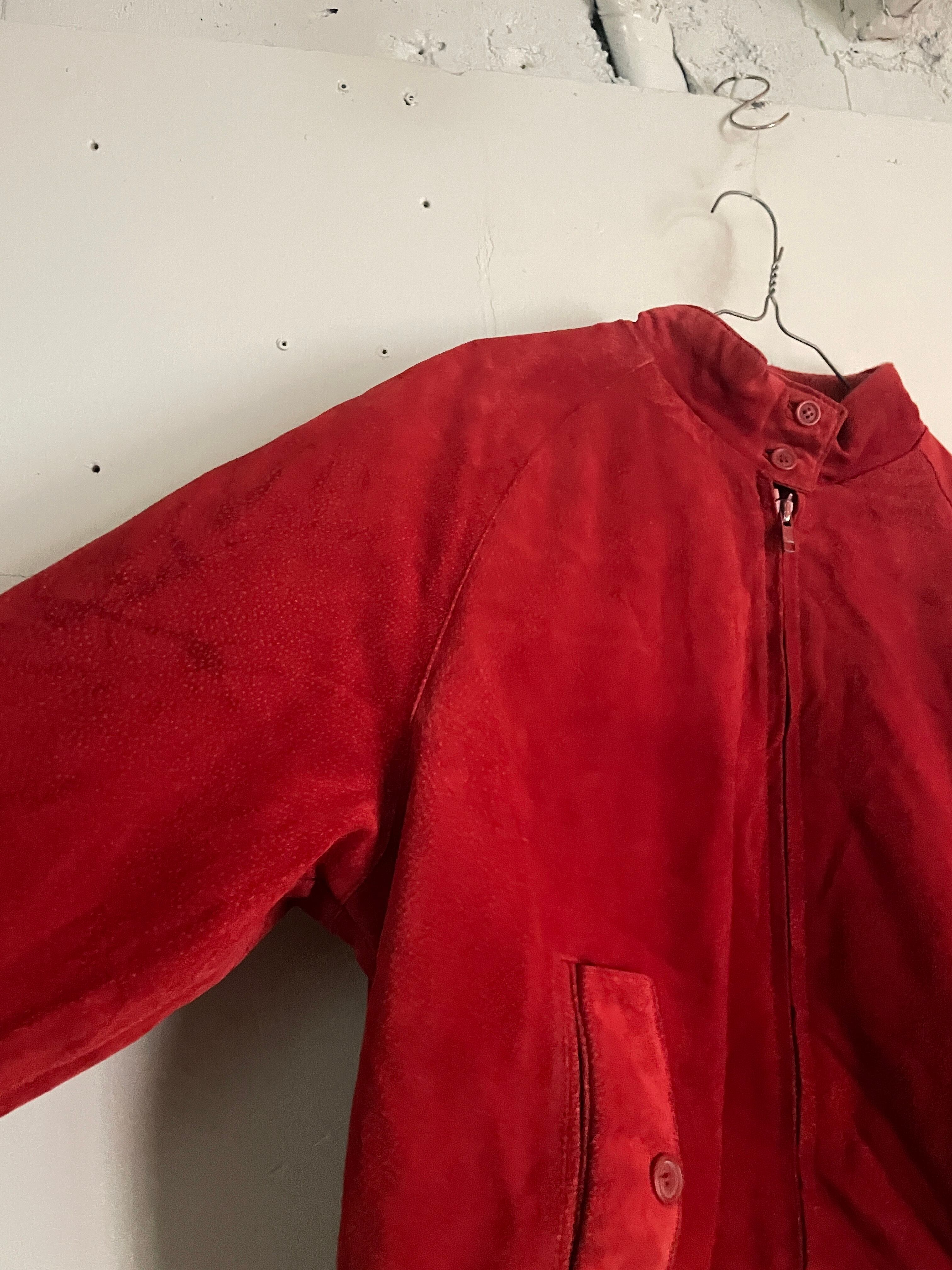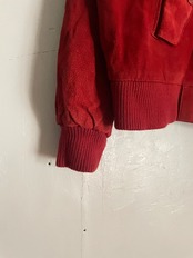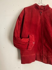 明るいレッドボディで、スウィングトップ型のスエードレザージャケット。袖口、裾はリブ仕様で、一番使いやすいシルエットです。ジップタイプなので着脱もしやすいです。ダブルポケットなのも魅力的。ブラックやブラウンなどのレザージャケットも良いですが。こういった色物のレザージャケットも差別化を図れてかっこいいかと思います。大き過ぎず小さ過ぎないサイズ感なので、男女共におすすめできるアイテムです。