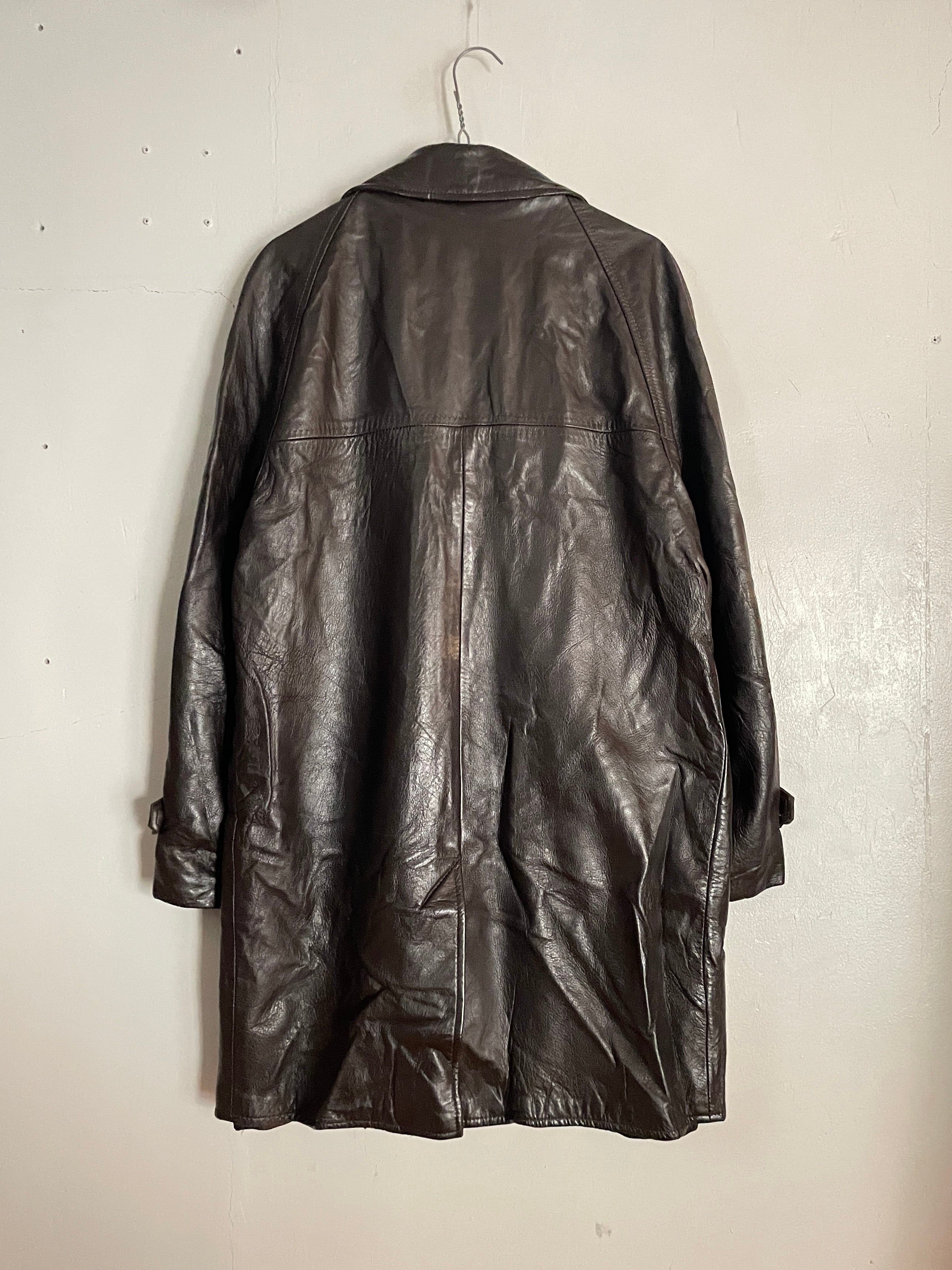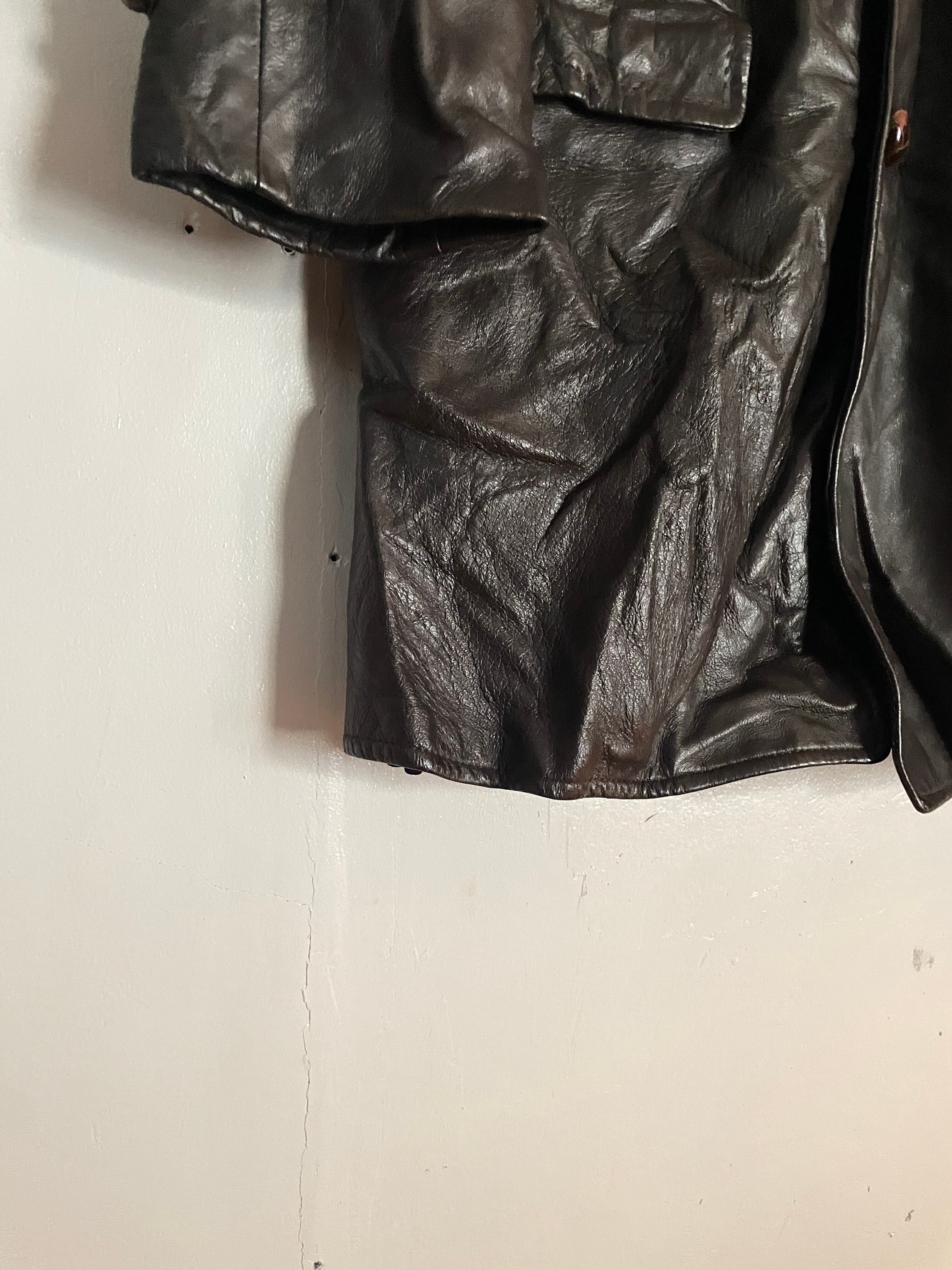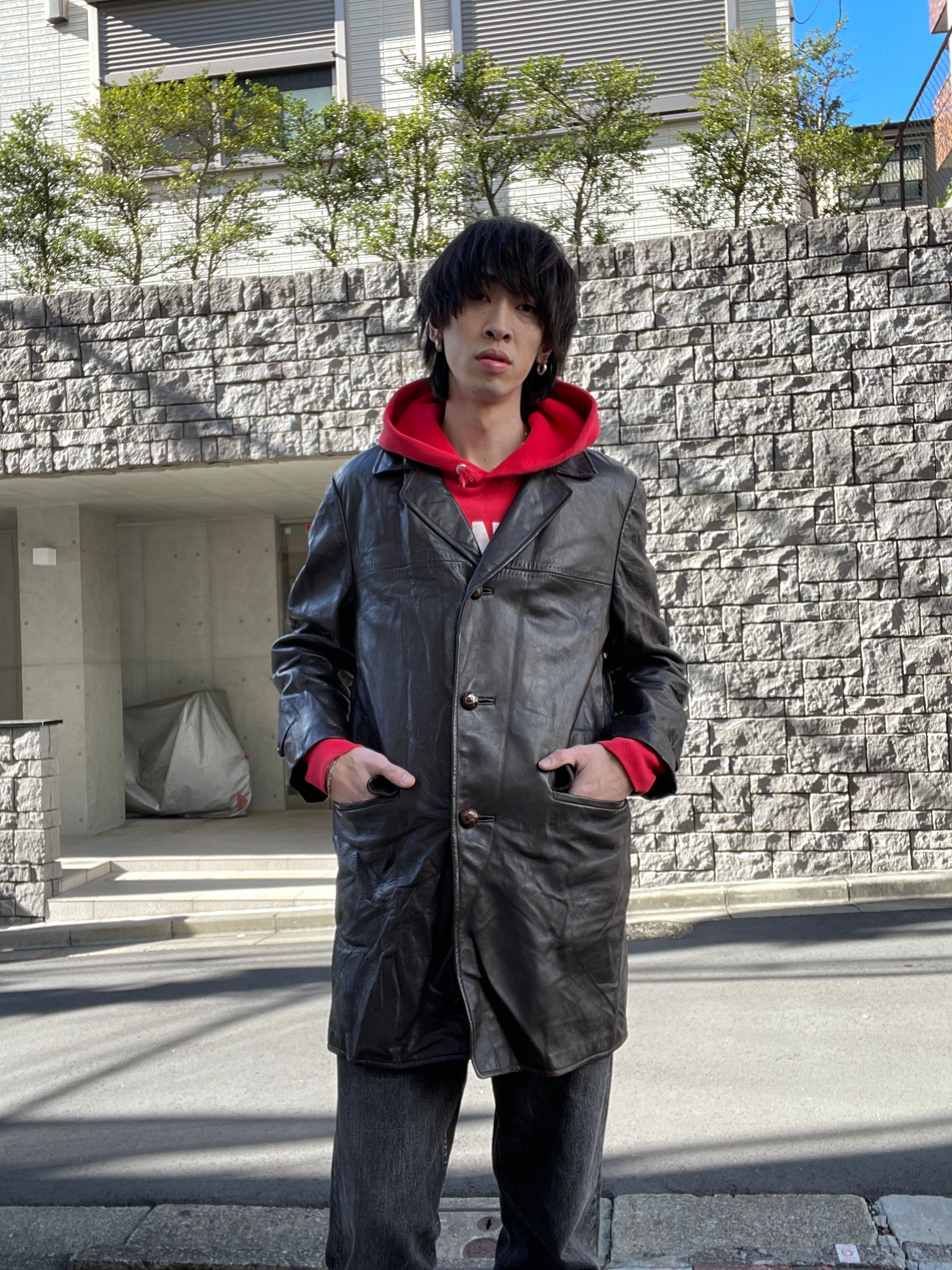 やや光沢感のあるブラウンカラーで、全体から渋さが感じられる、レザーカーコート。モチっとした上品なレザー。クルミボタンなのも魅力的です。着るだけで雰囲気が出そうな1着。ゆったりとしたサイズ感なので、インナーにもしっかり着込めそうです。間違いなく今の時期アウターとして主役になってくれるアイテムです。カナダ製なのもポイントが高いです。