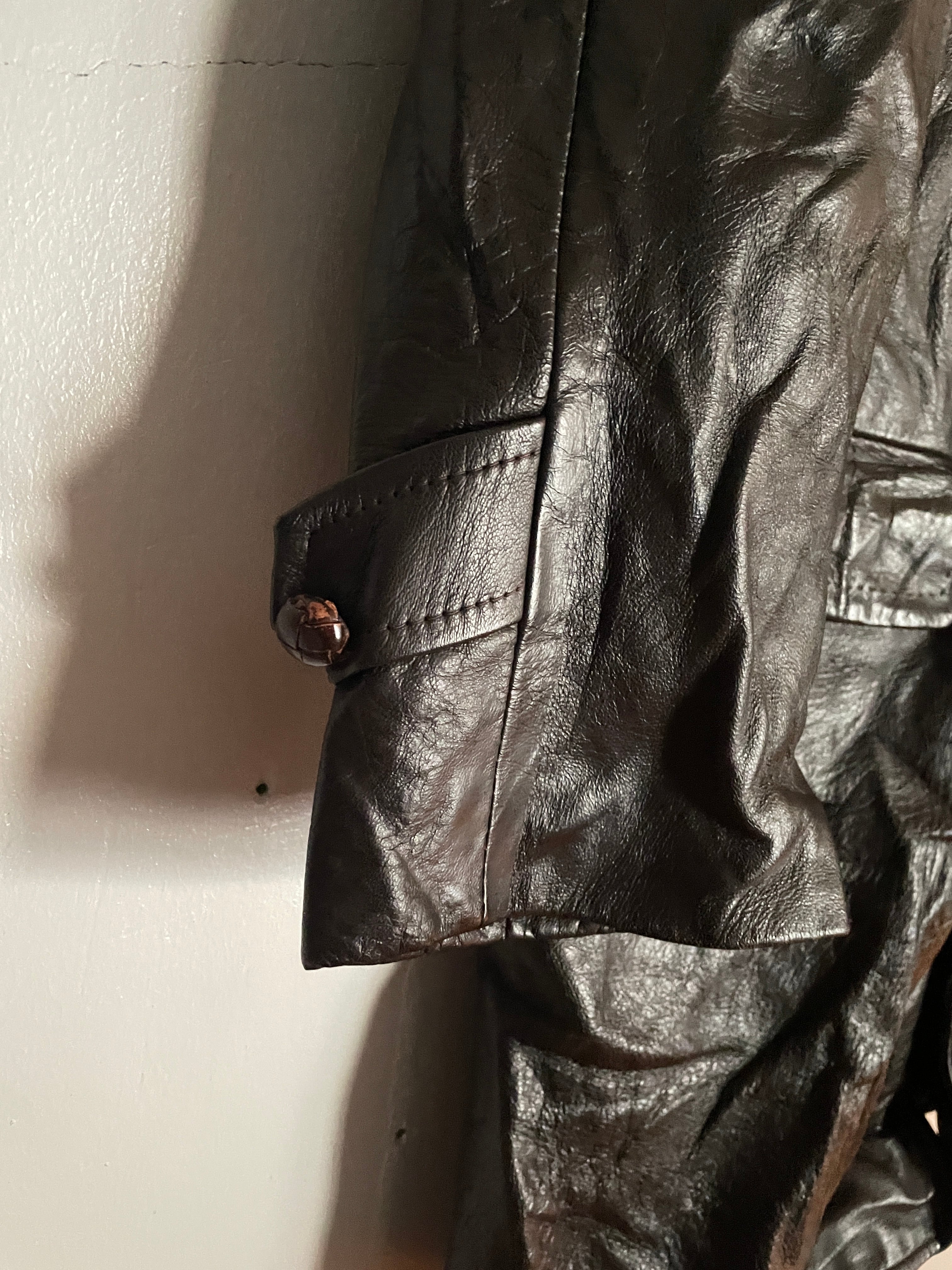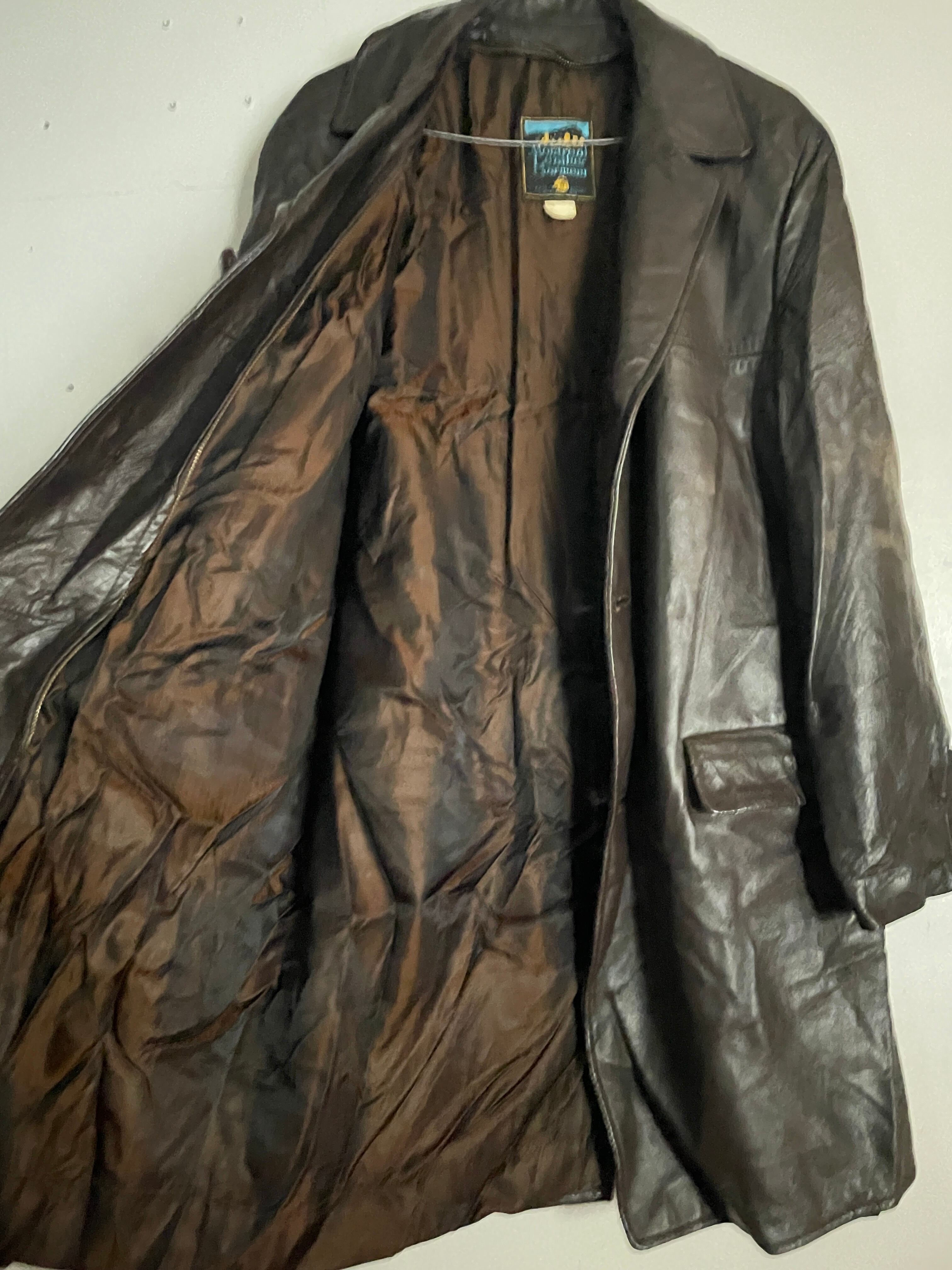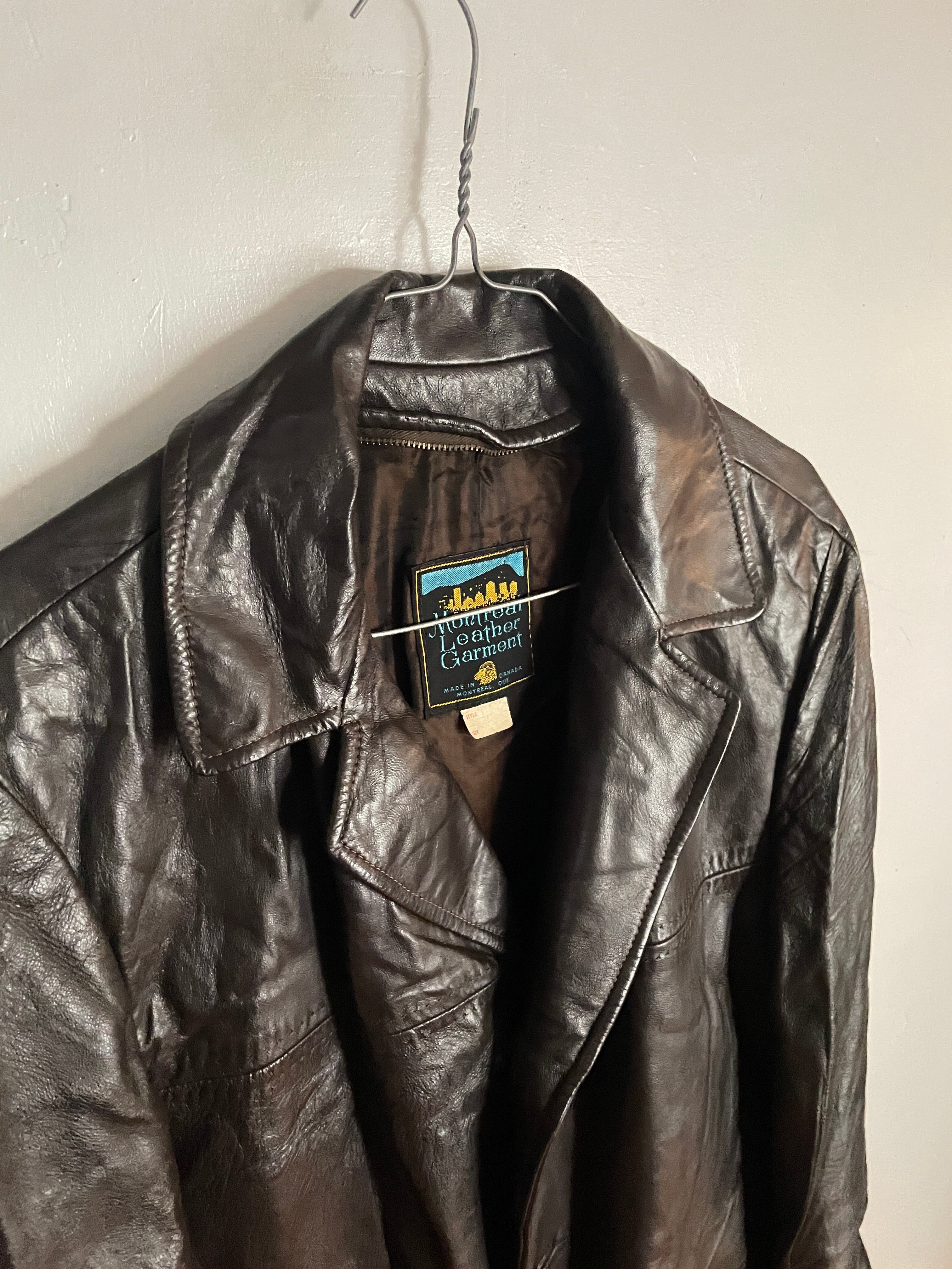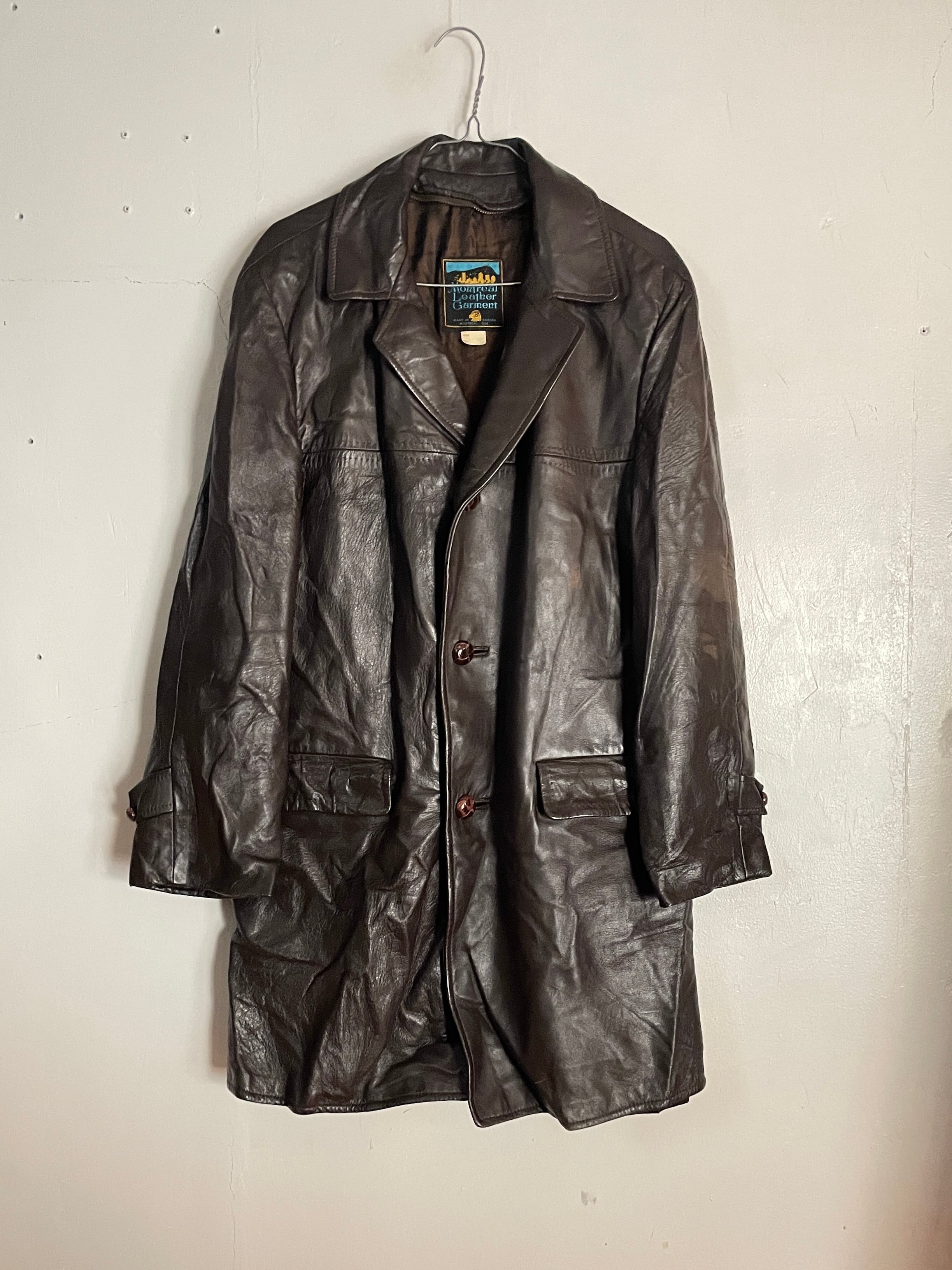 やや光沢感のあるブラウンカラーで、全体から渋さが感じられる、レザーカーコート。モチっとした上品なレザー。クルミボタンなのも魅力的です。着るだけで雰囲気が出そうな1着。ゆったりとしたサイズ感なので、インナーにもしっかり着込めそうです。間違いなく今の時期アウターとして主役になってくれるアイテムです。カナダ製なのもポイントが高いです。