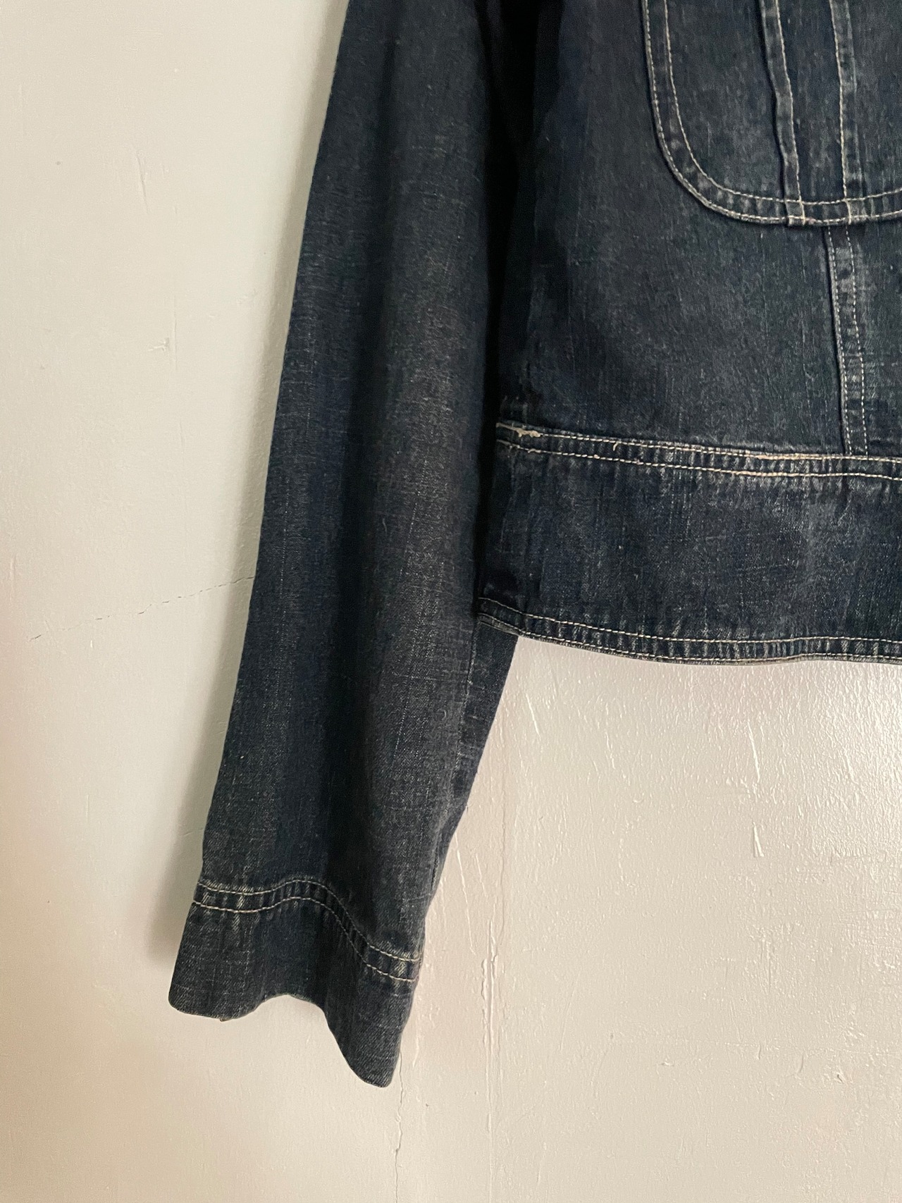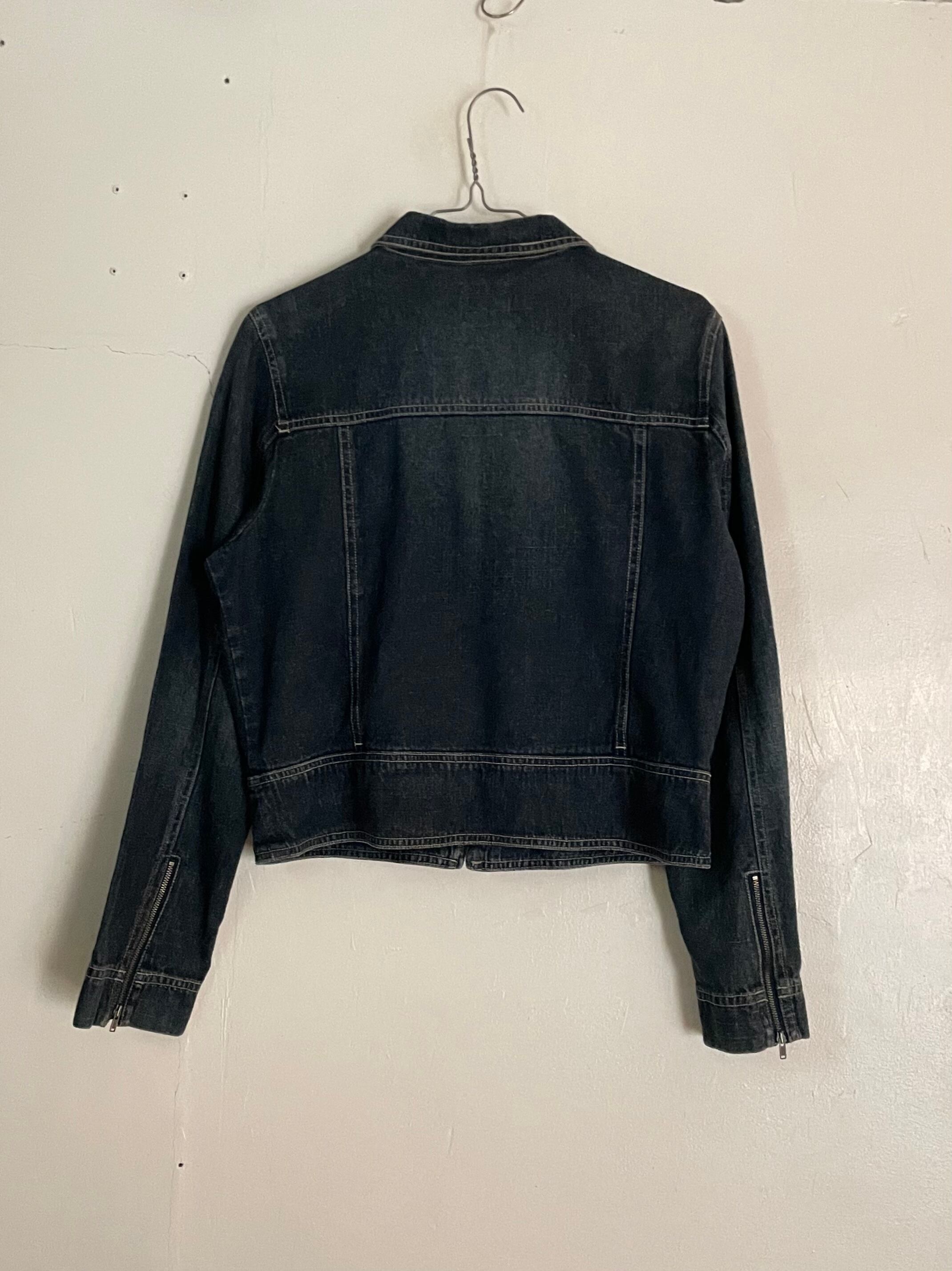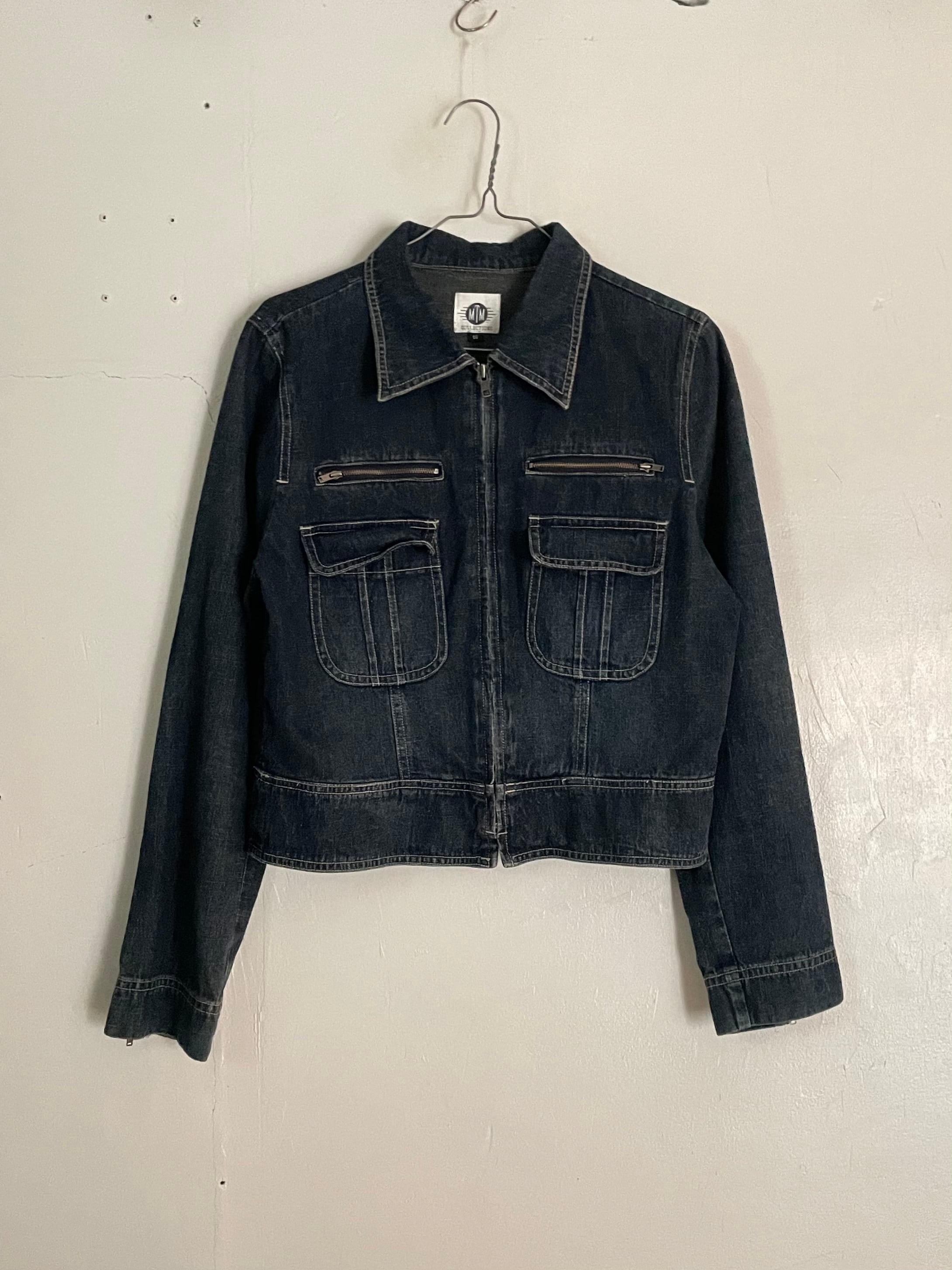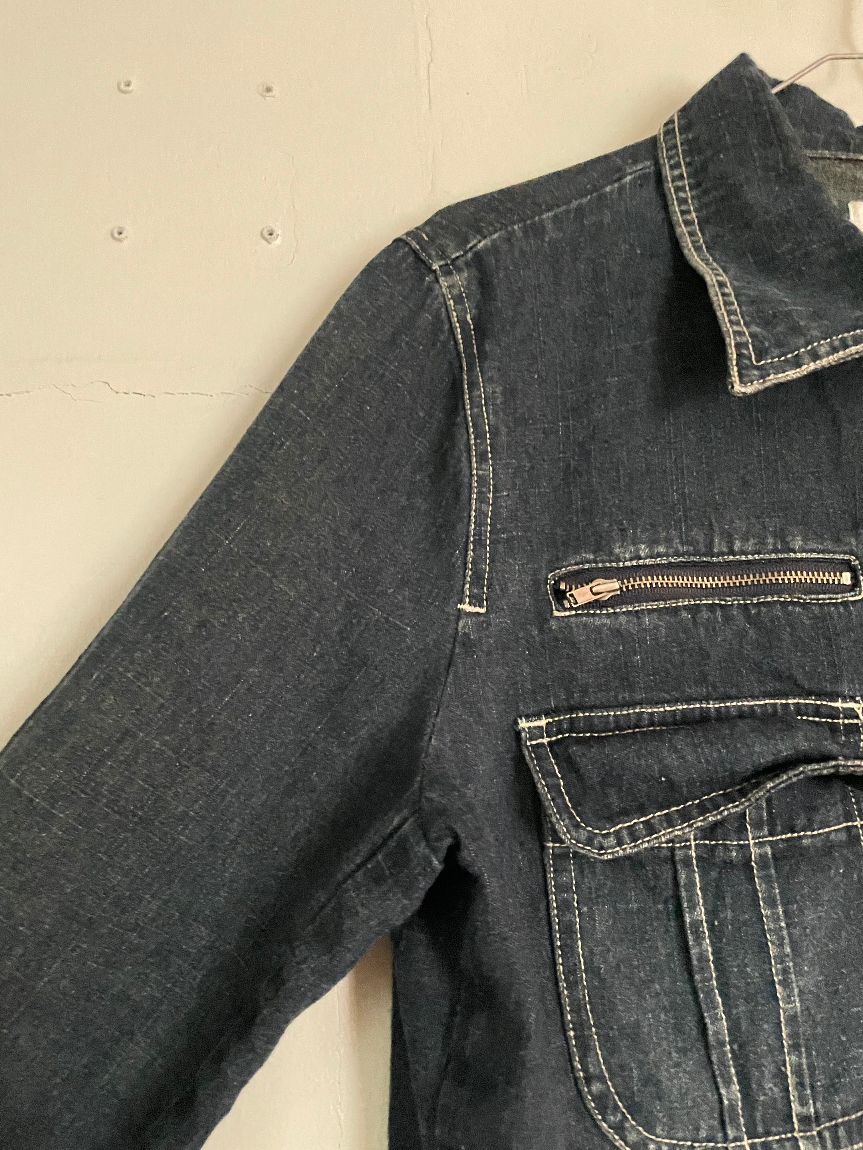 濃淡デニムを使用したショート丈のデニムジャケット。ワークテイストを感じさせる胸元のジップポケットとフラップポケットがアクセントになっています。コンパクトな丈感でスタイルアップ効果も◎。パンツにもスカートにも合わせやすく、カジュアルからモードまで幅広いコーデに活躍する一着です。