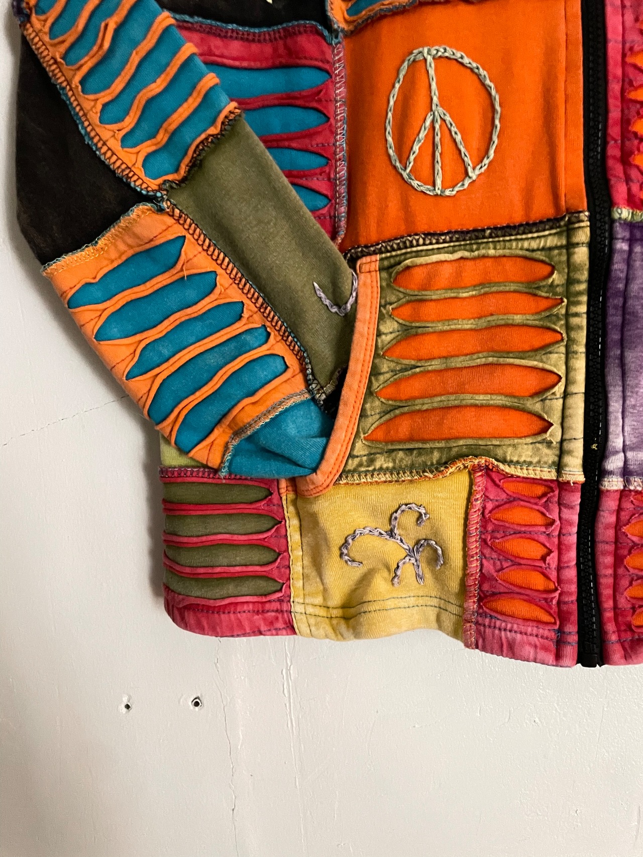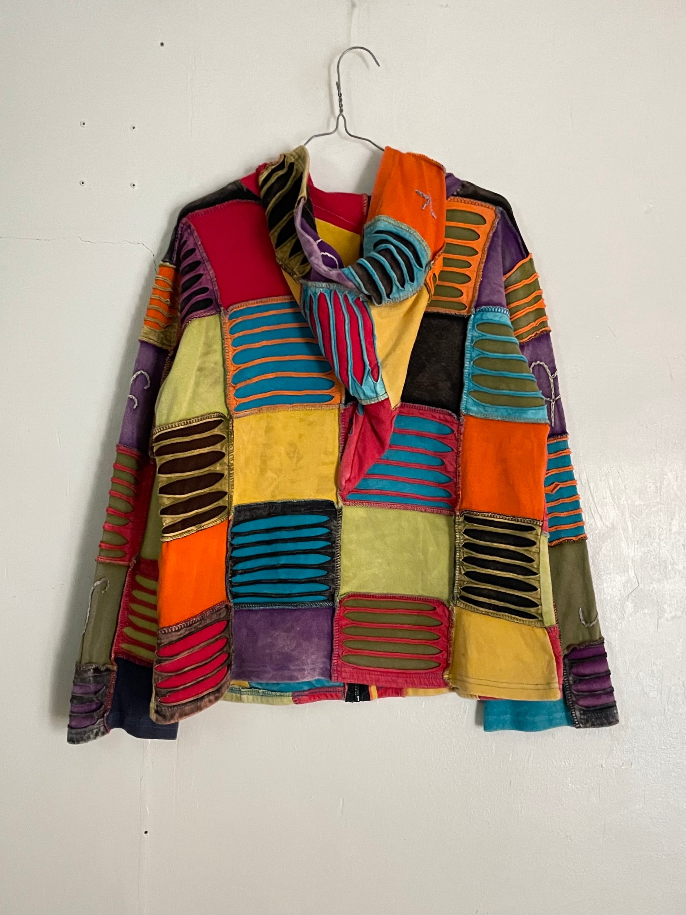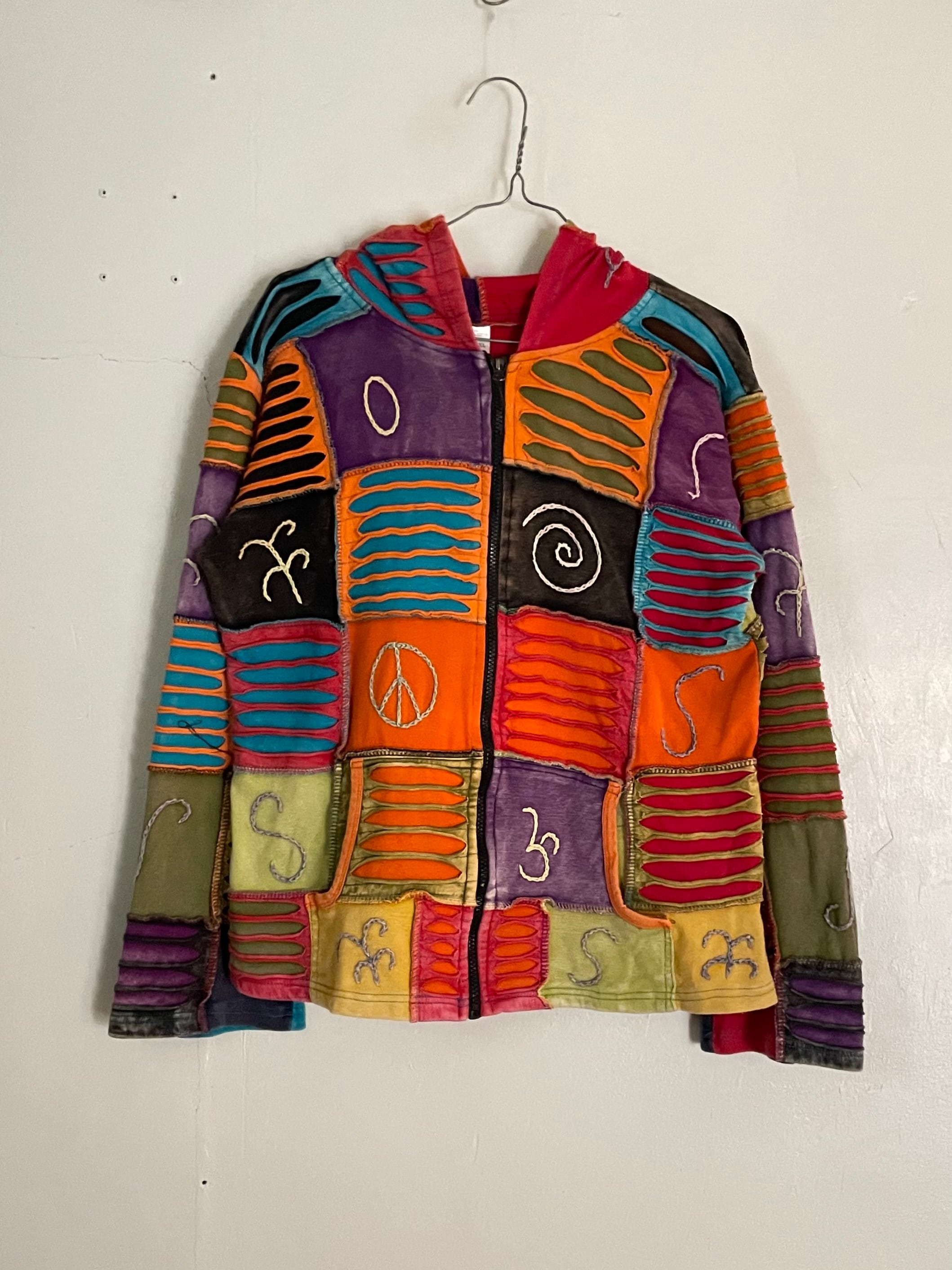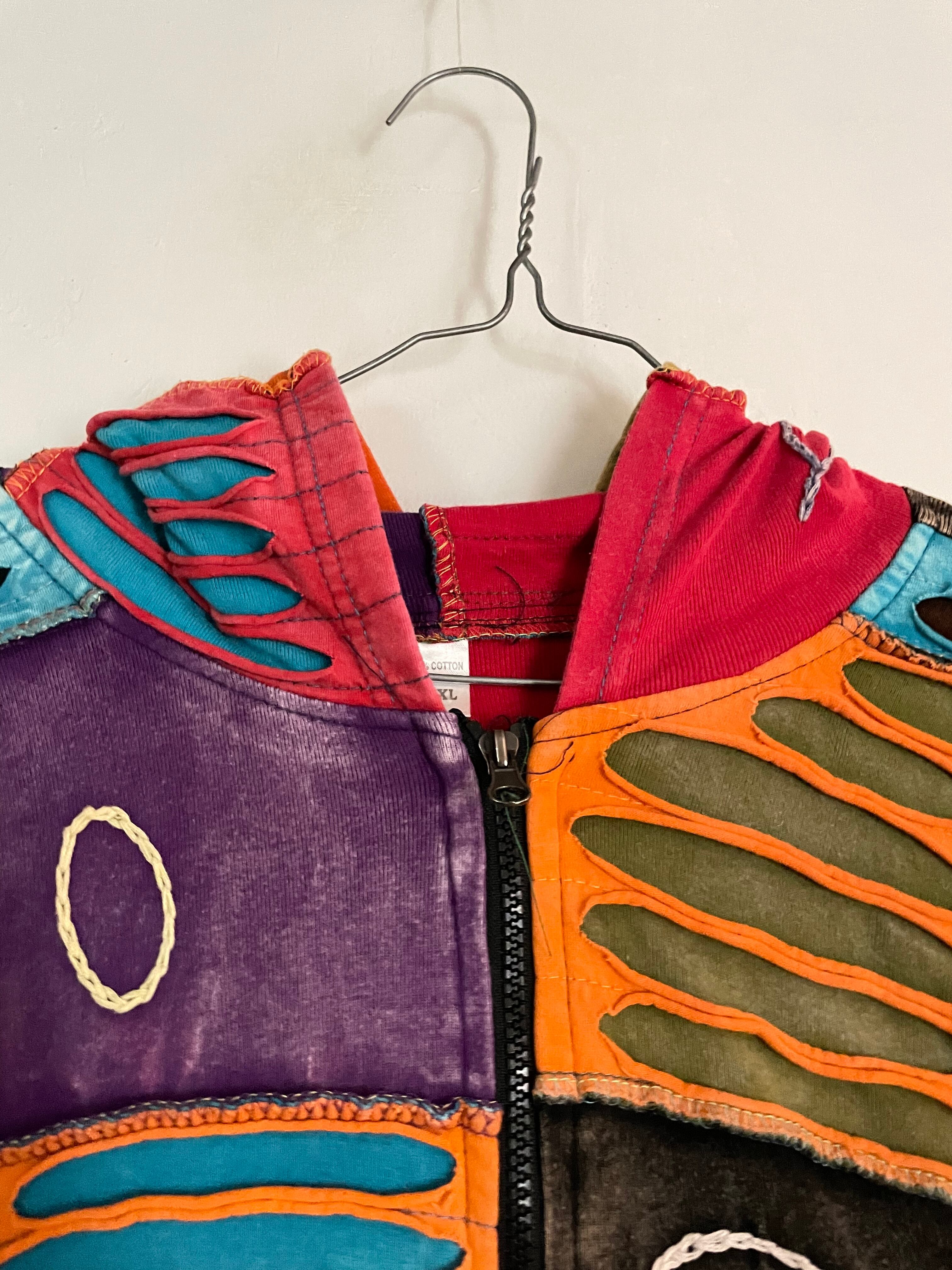 カラフルなパッチワークデザインが目を惹く、フルジップパーカー。オレンジ・パープル・グリーンなど鮮やかな配色に、カットワークや刺繍モチーフが施された存在感のある一着です。一点一点異なる表情を楽しめるエスニック・ヒッピー調のデザインで、コーデの主役に◎。個性的なスタイルがお好きな方におすすめです。