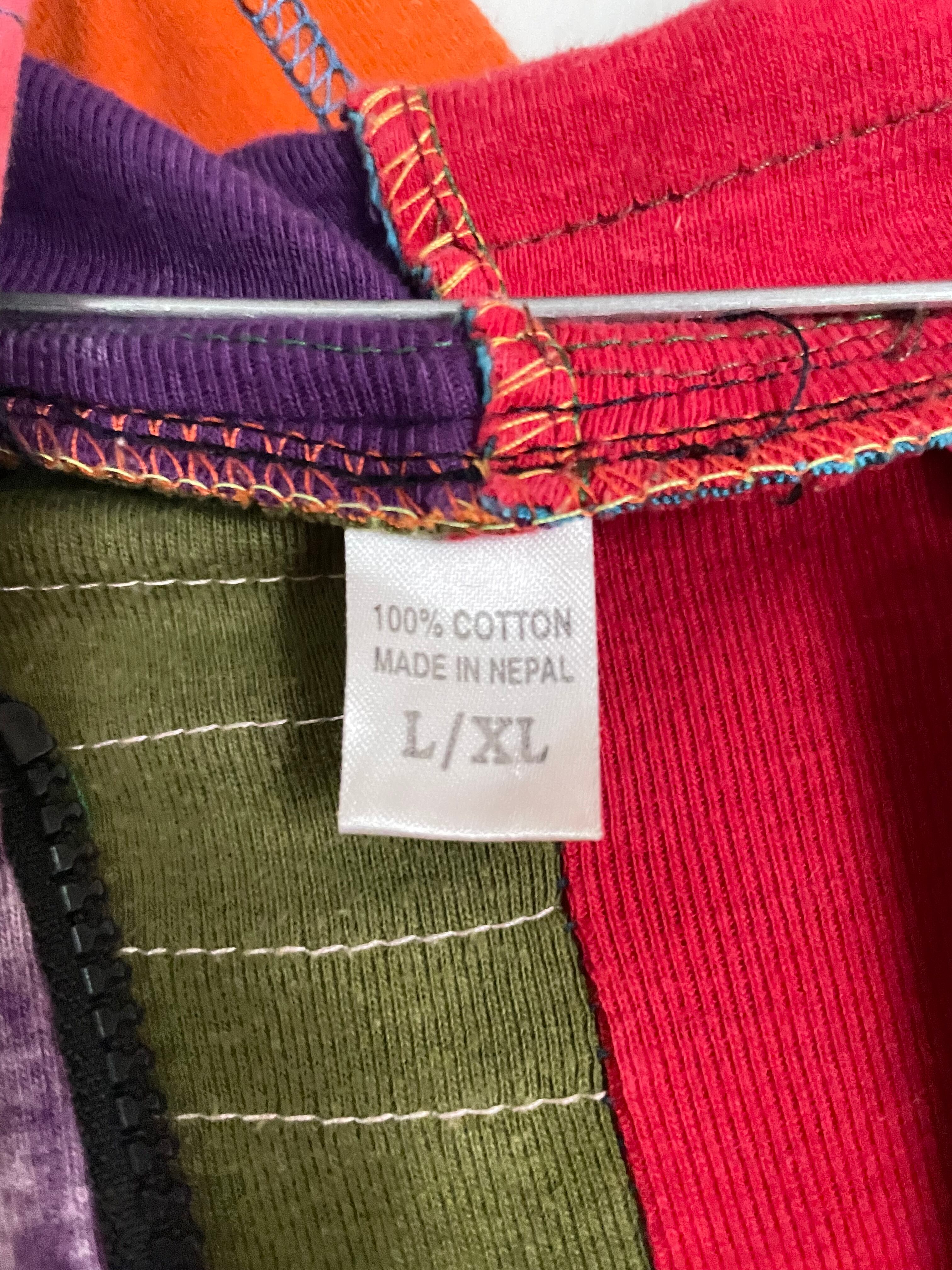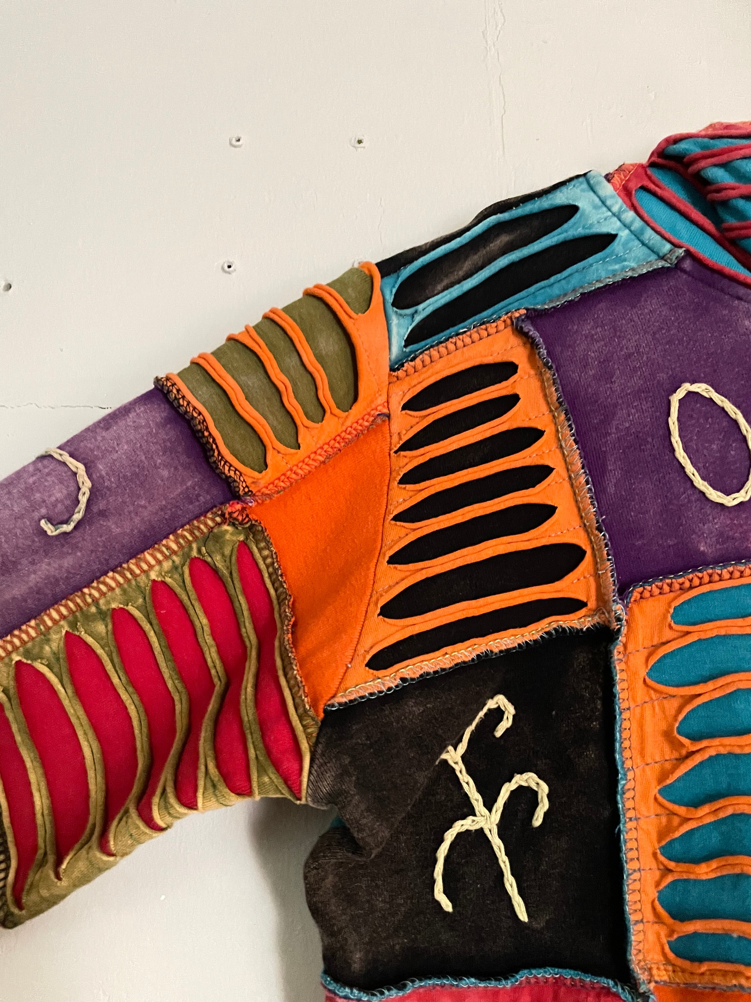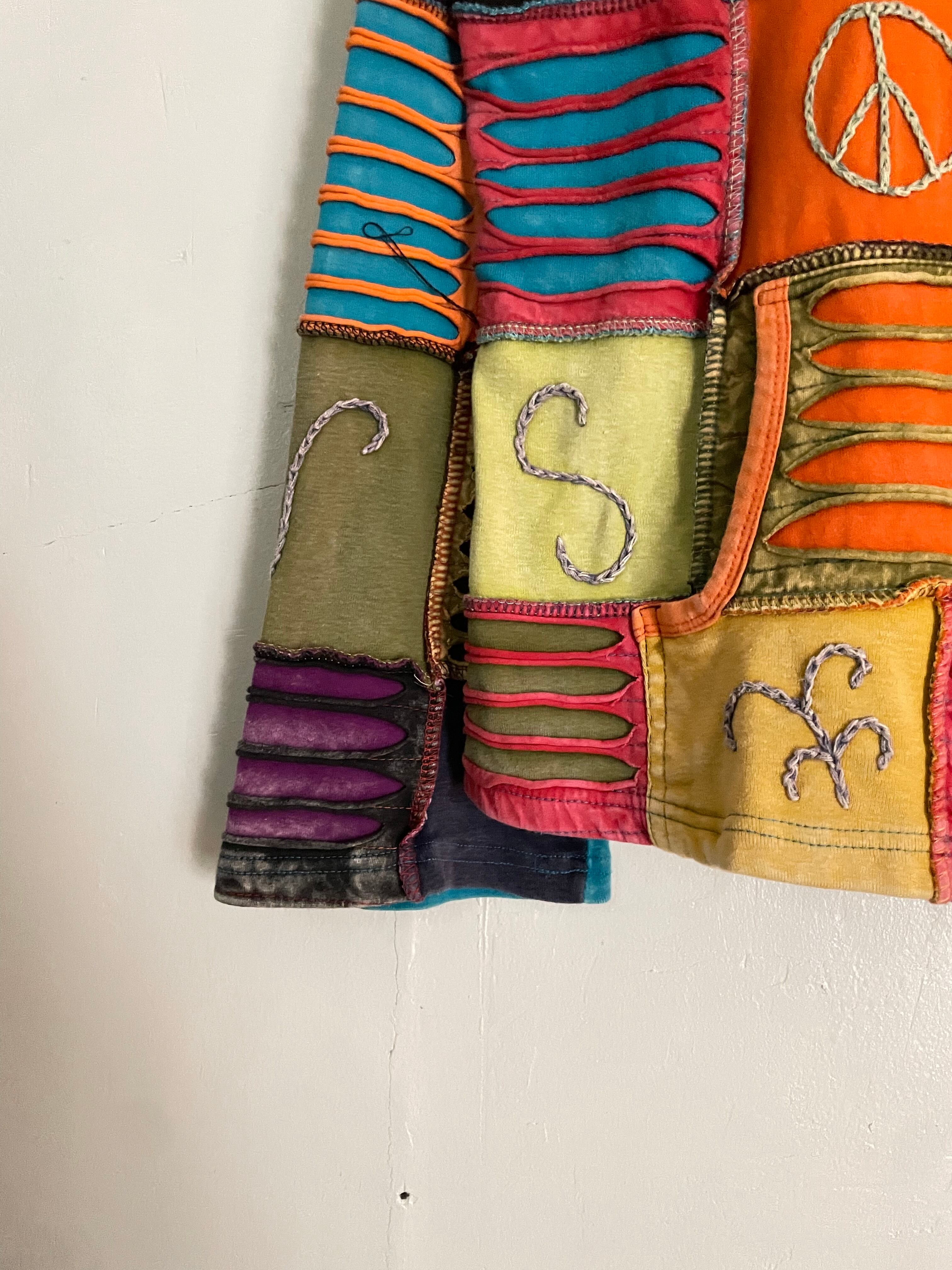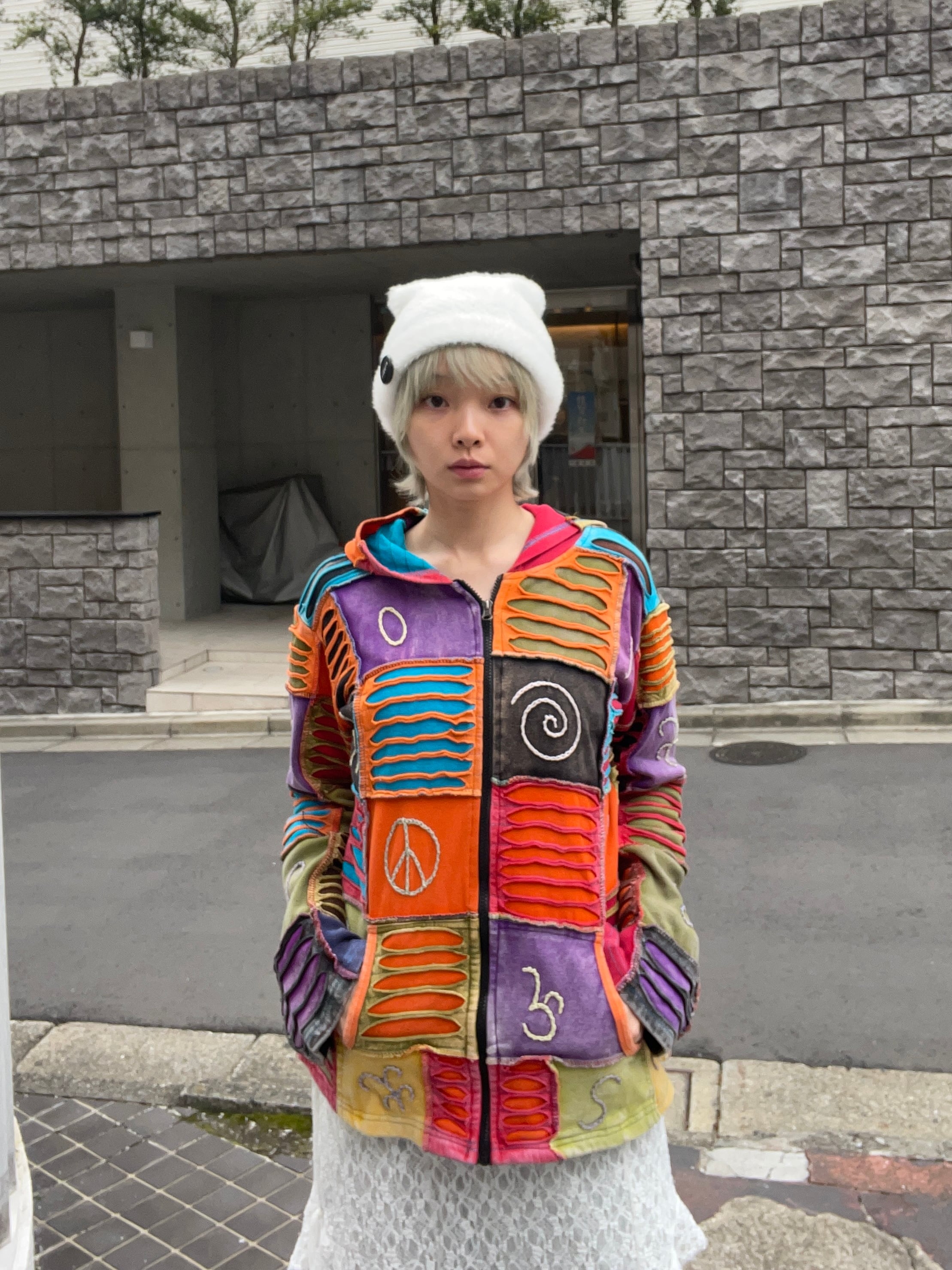 カラフルなパッチワークデザインが目を惹く、フルジップパーカー。オレンジ・パープル・グリーンなど鮮やかな配色に、カットワークや刺繍モチーフが施された存在感のある一着です。一点一点異なる表情を楽しめるエスニック・ヒッピー調のデザインで、コーデの主役に◎。個性的なスタイルがお好きな方におすすめです。