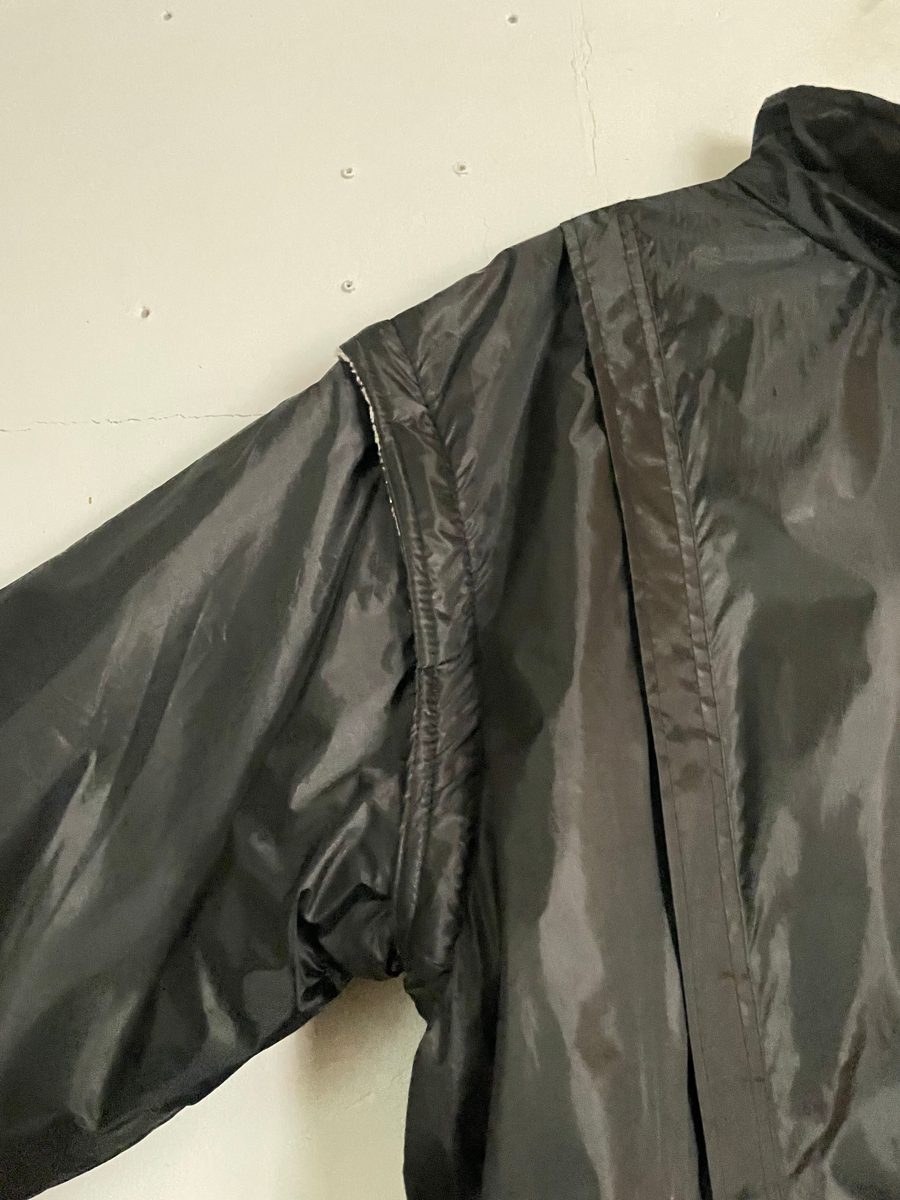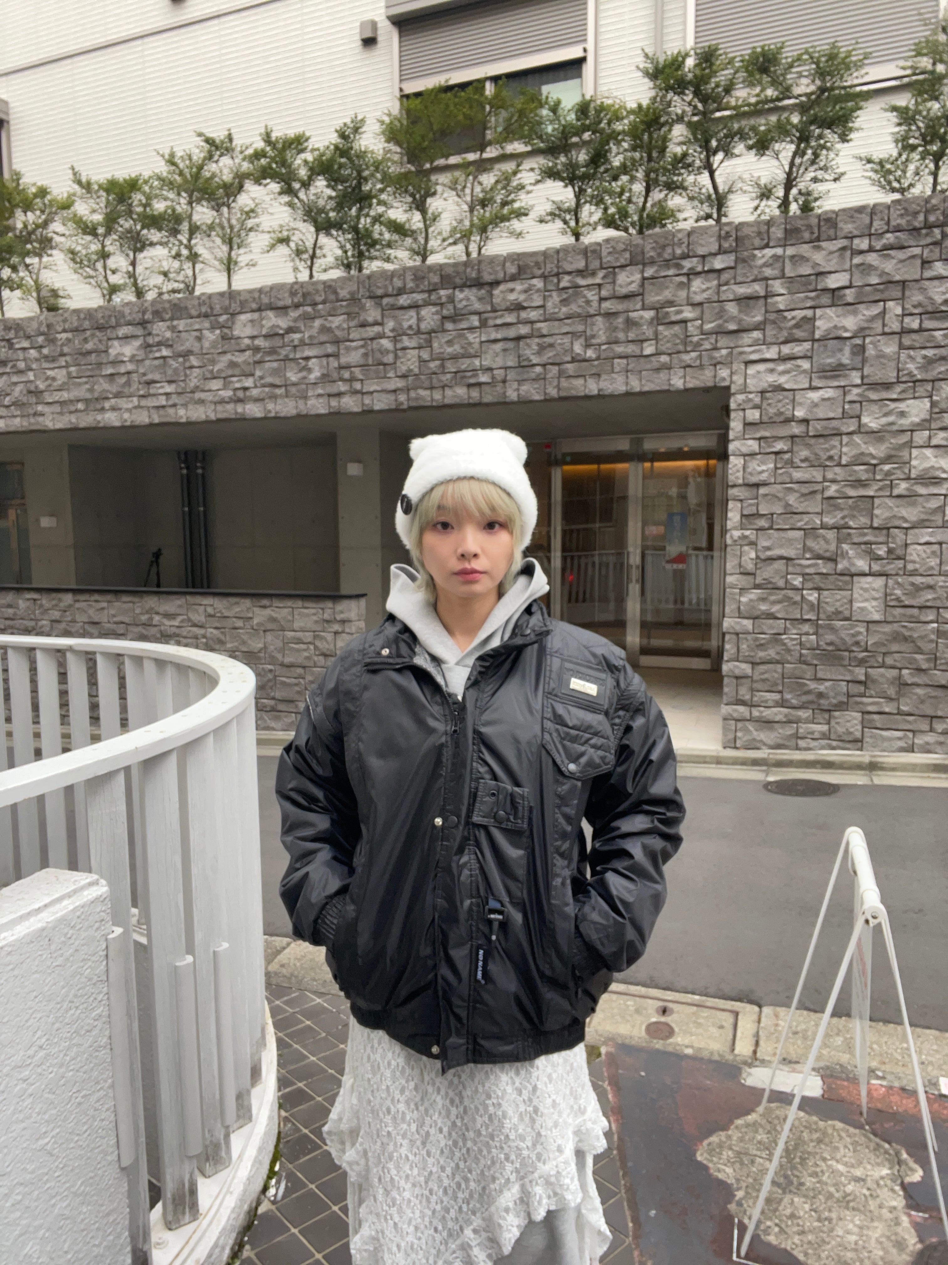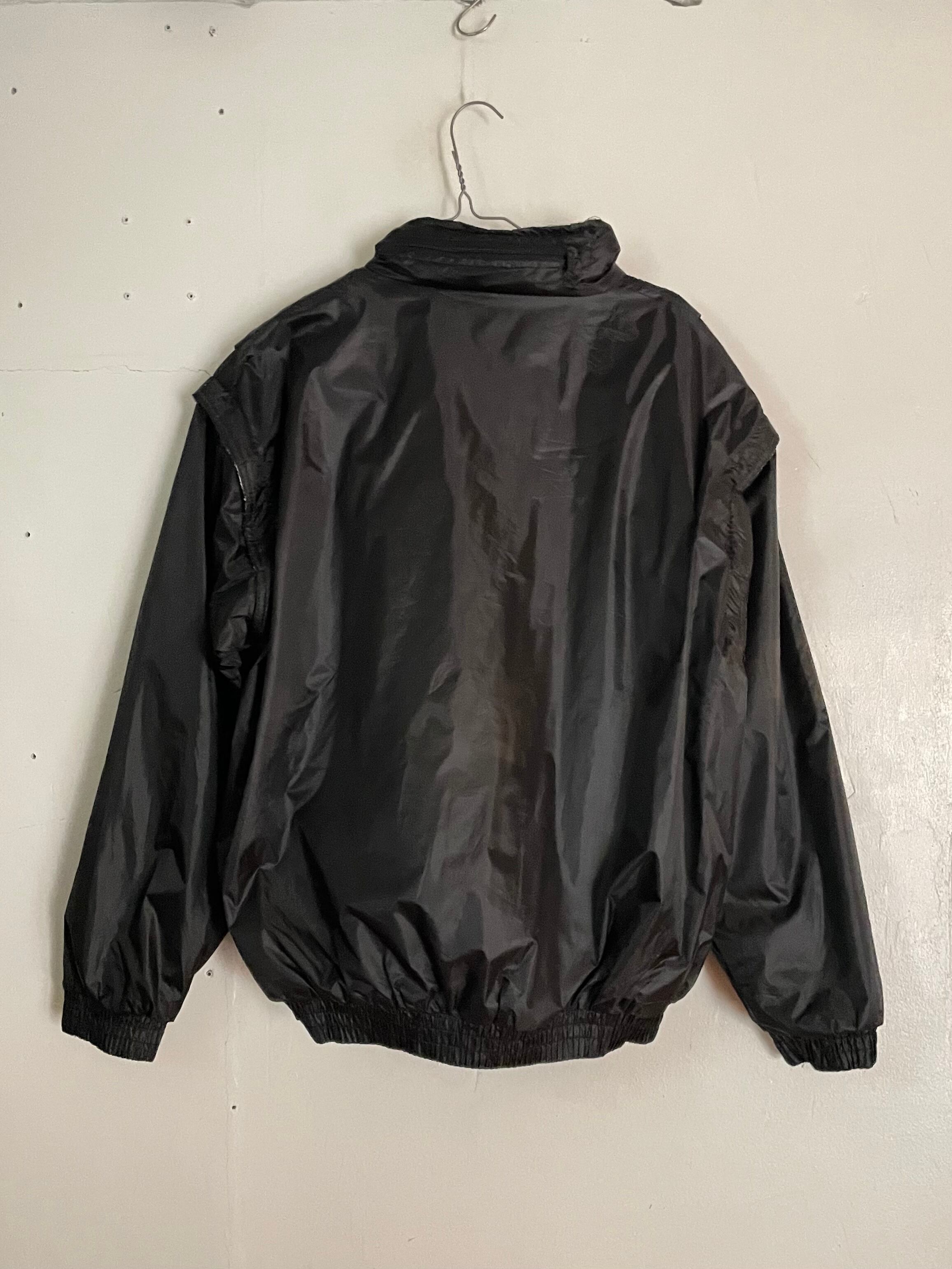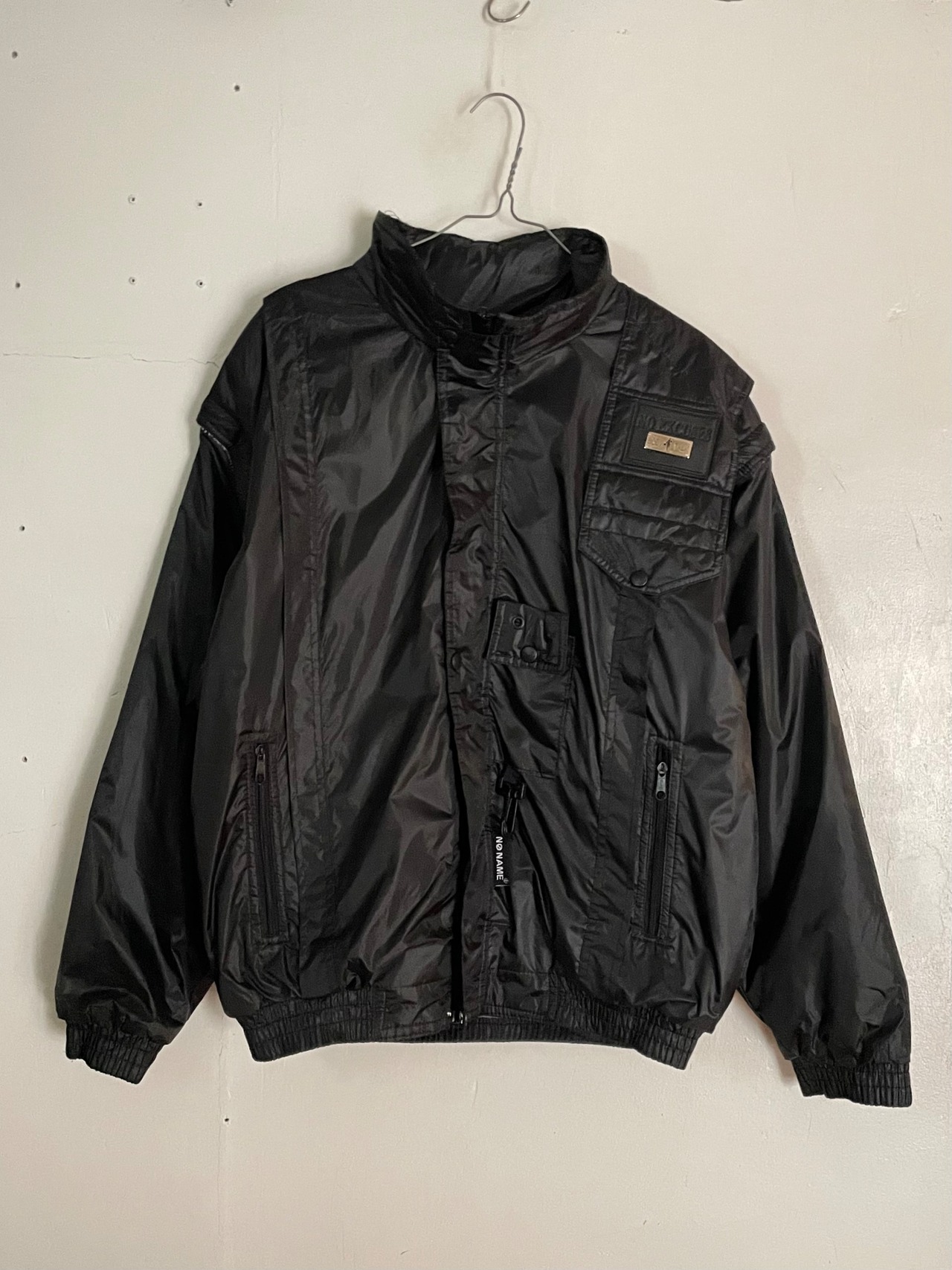 ナイロン素材を使用したブラックカラーのブルゾンジャケット。スタンドカラー仕様で首元までしっかり覆われ、防風性にも優れ優れています。フロントや胸元に複数のポケットを備えたミリタリーライクなデザインが特徴で、実用性も◎。裾と袖口はリブ仕様になっており、程よく丸みのあるシルエットです。シンプルながらも存在感があり、ストリートやカジュアルスタイルに取り入れやすい一着です。