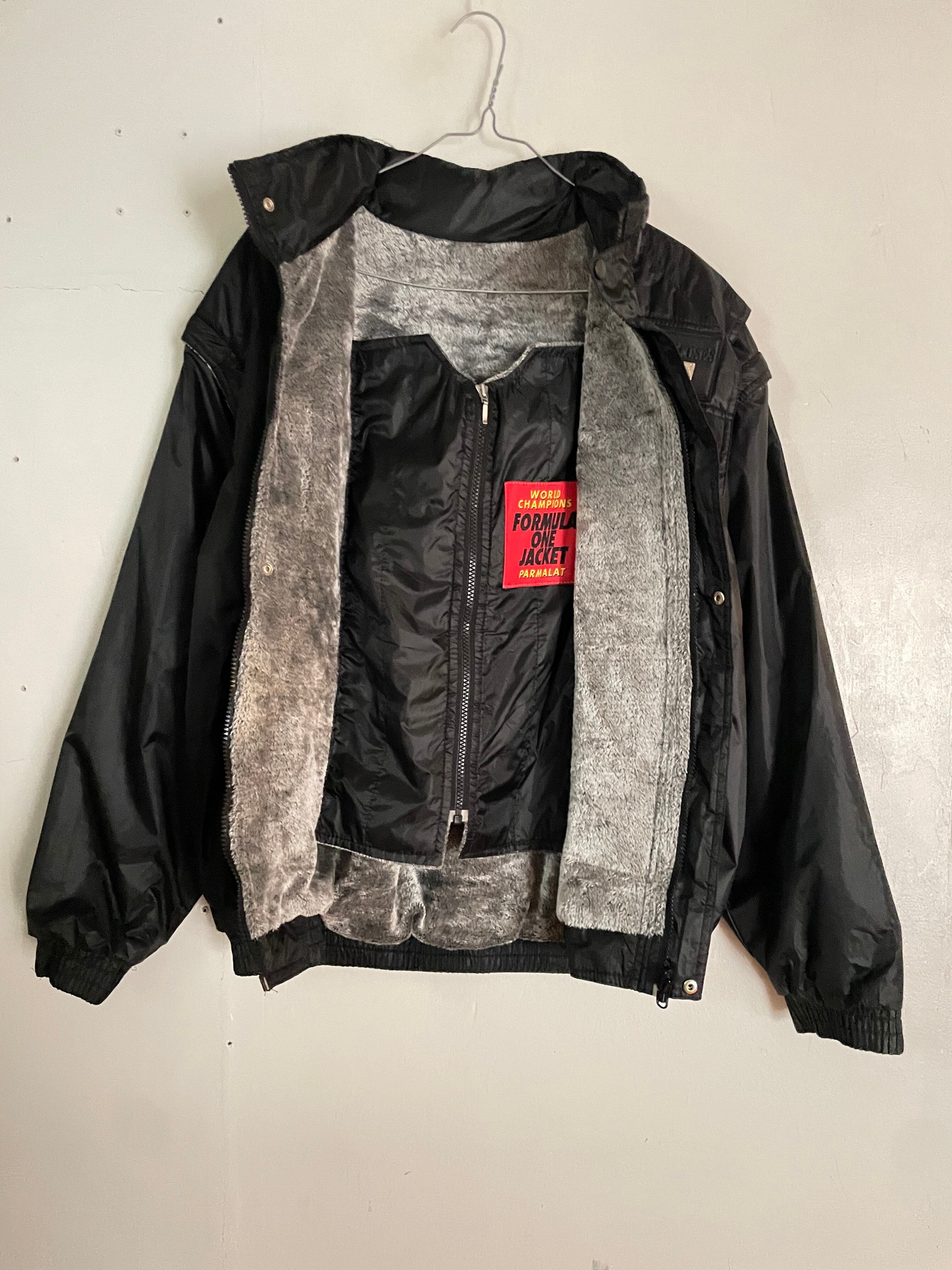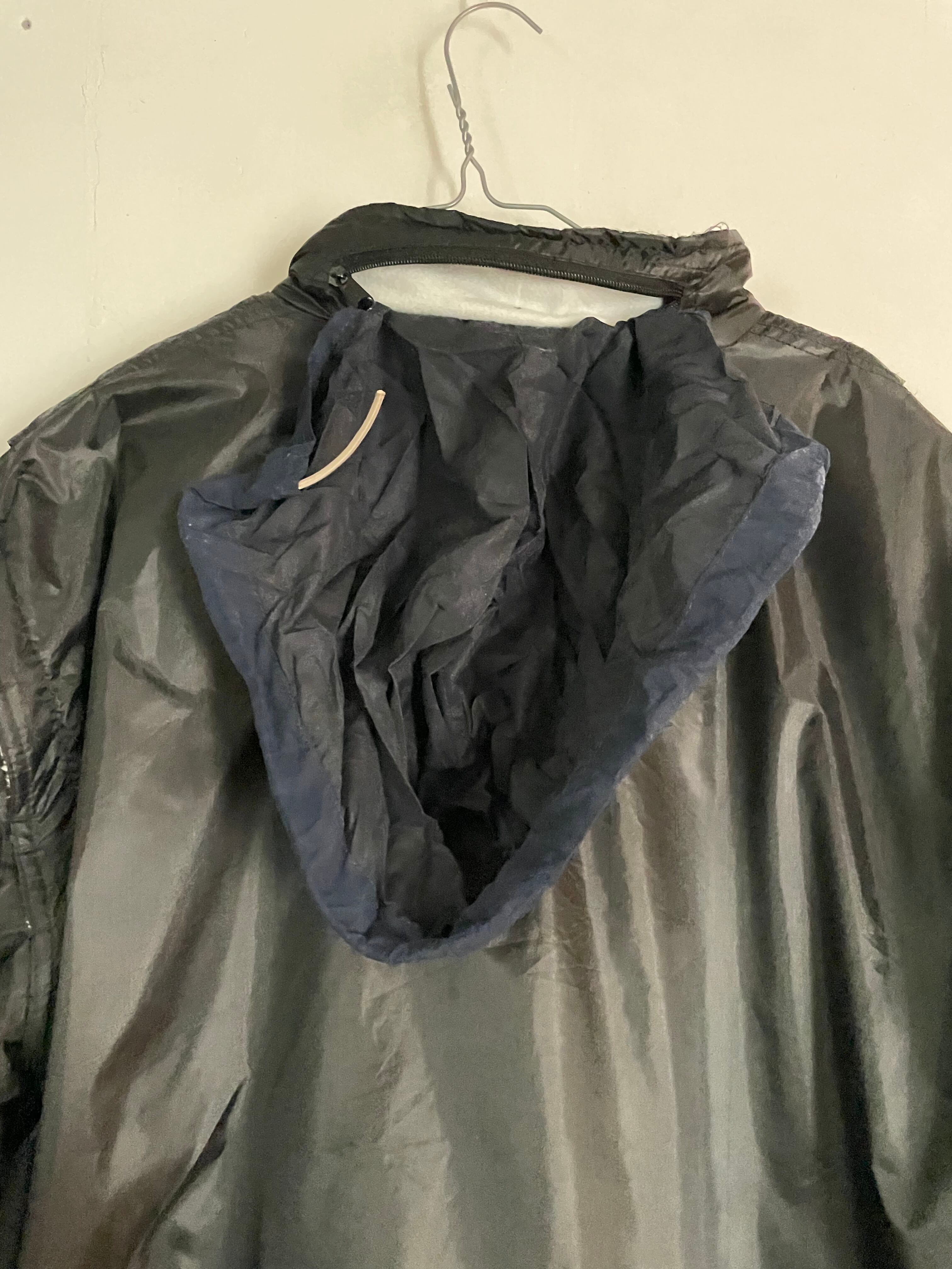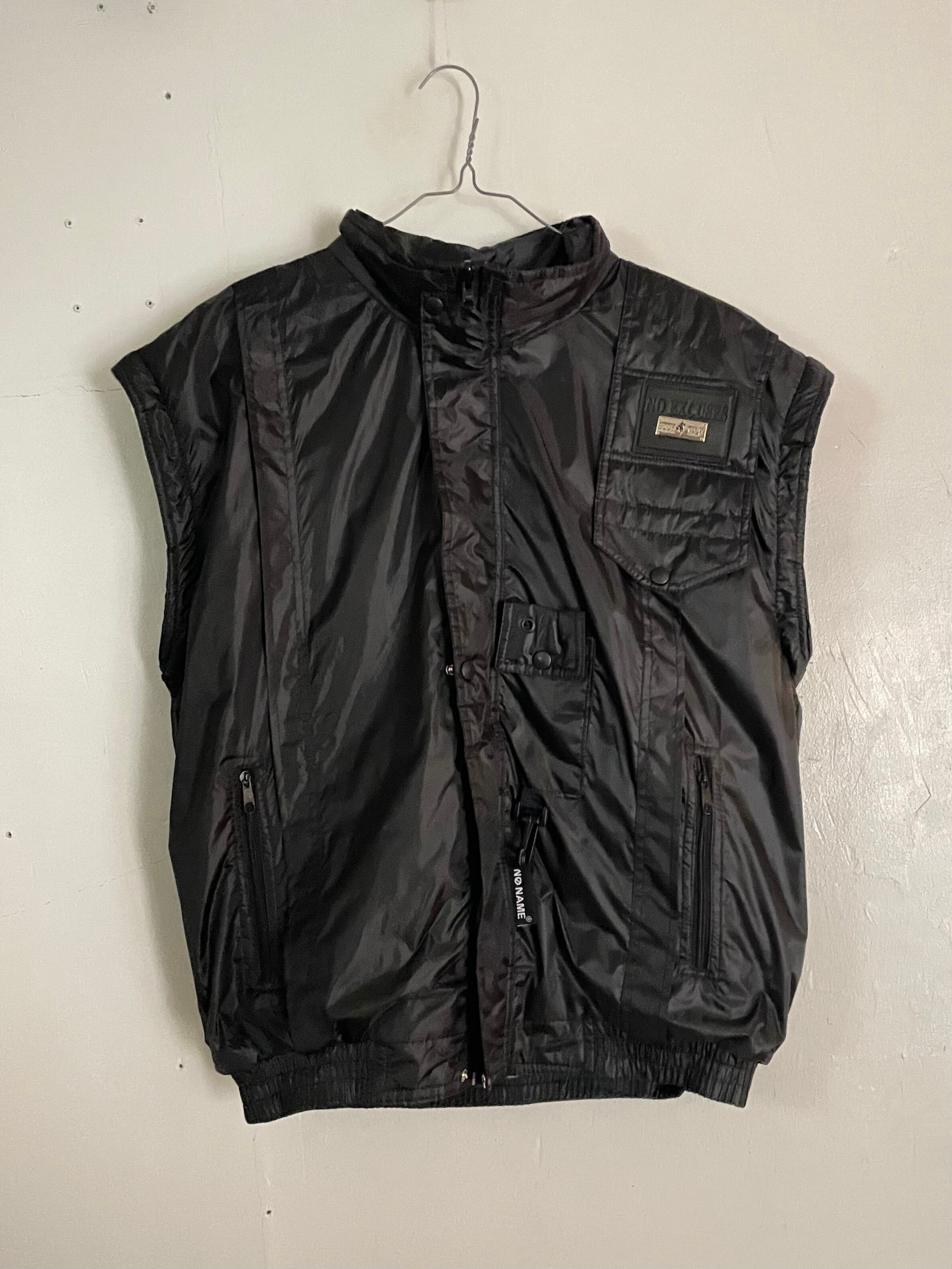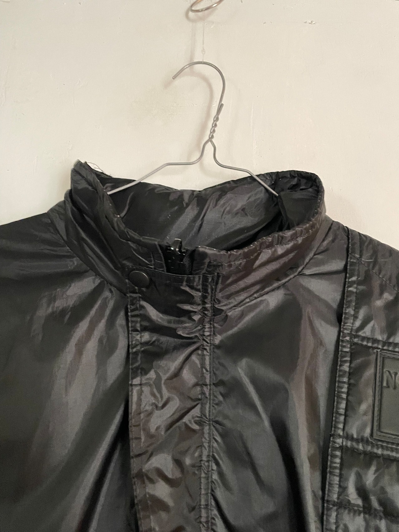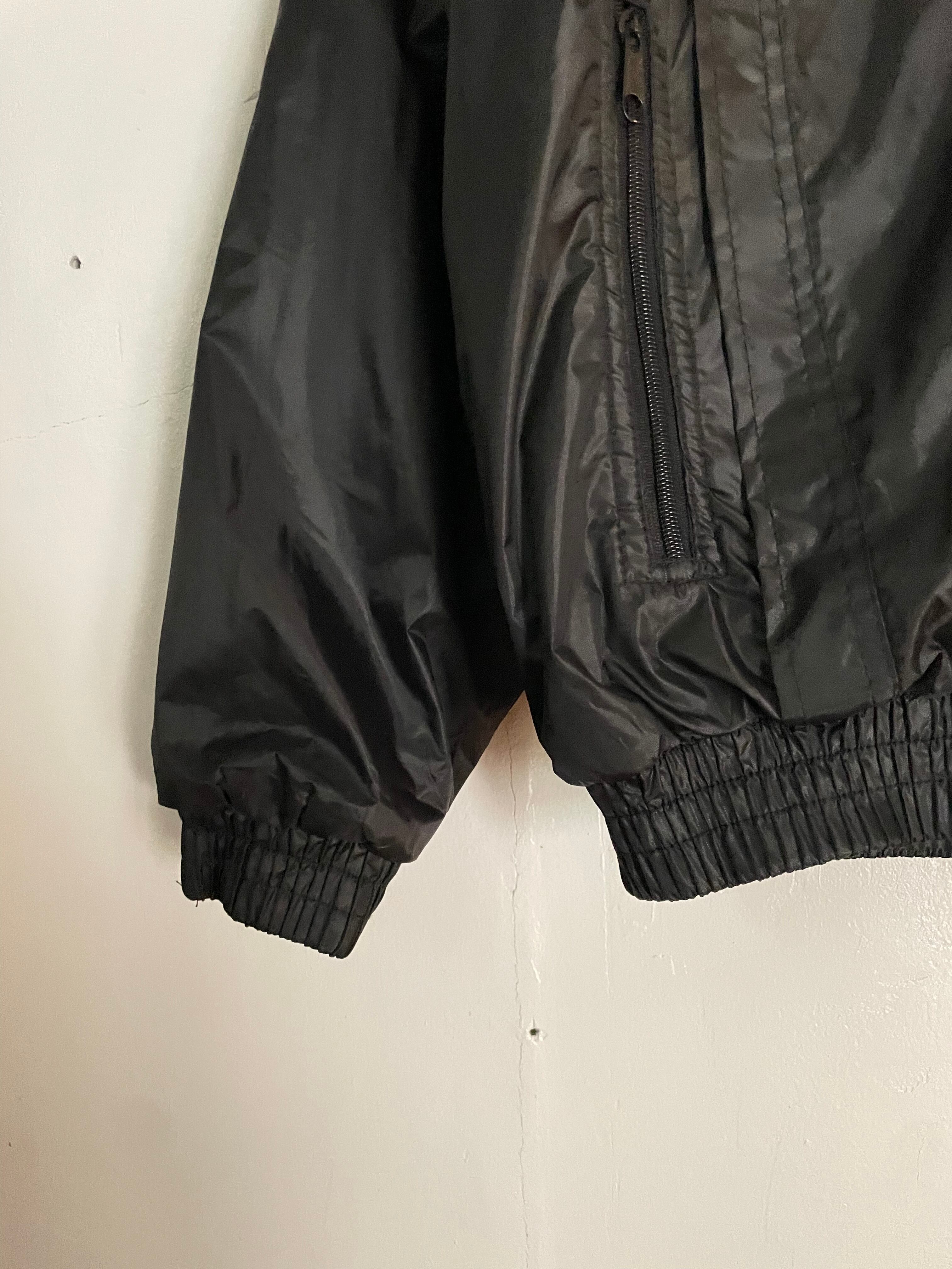 ナイロン素材を使用したブラックカラーのブルゾンジャケット。スタンドカラー仕様で首元までしっかり覆われ、防風性にも優れ優れています。フロントや胸元に複数のポケットを備えたミリタリーライクなデザインが特徴で、実用性も◎。裾と袖口はリブ仕様になっており、程よく丸みのあるシルエットです。シンプルながらも存在感があり、ストリートやカジュアルスタイルに取り入れやすい一着です。