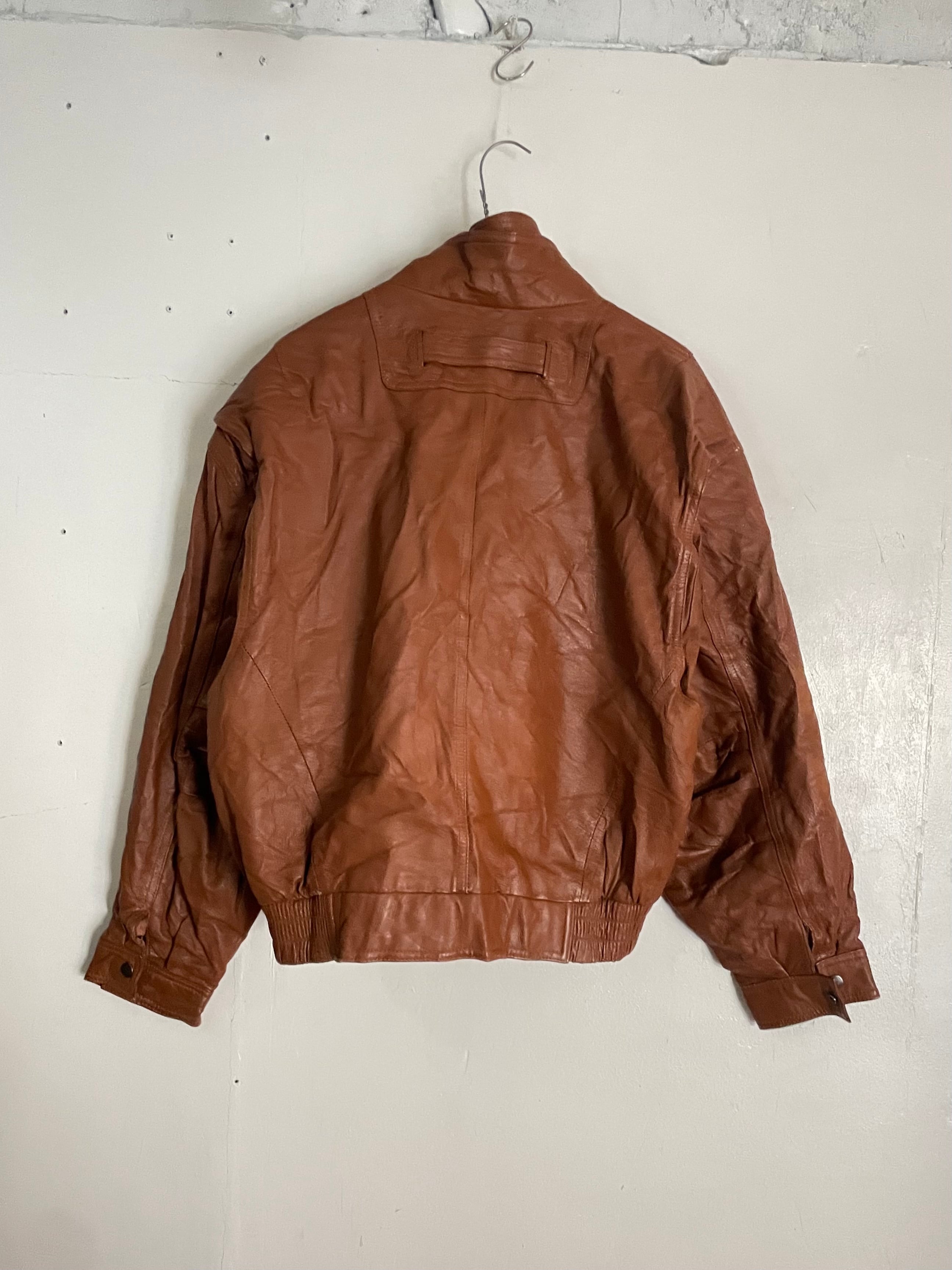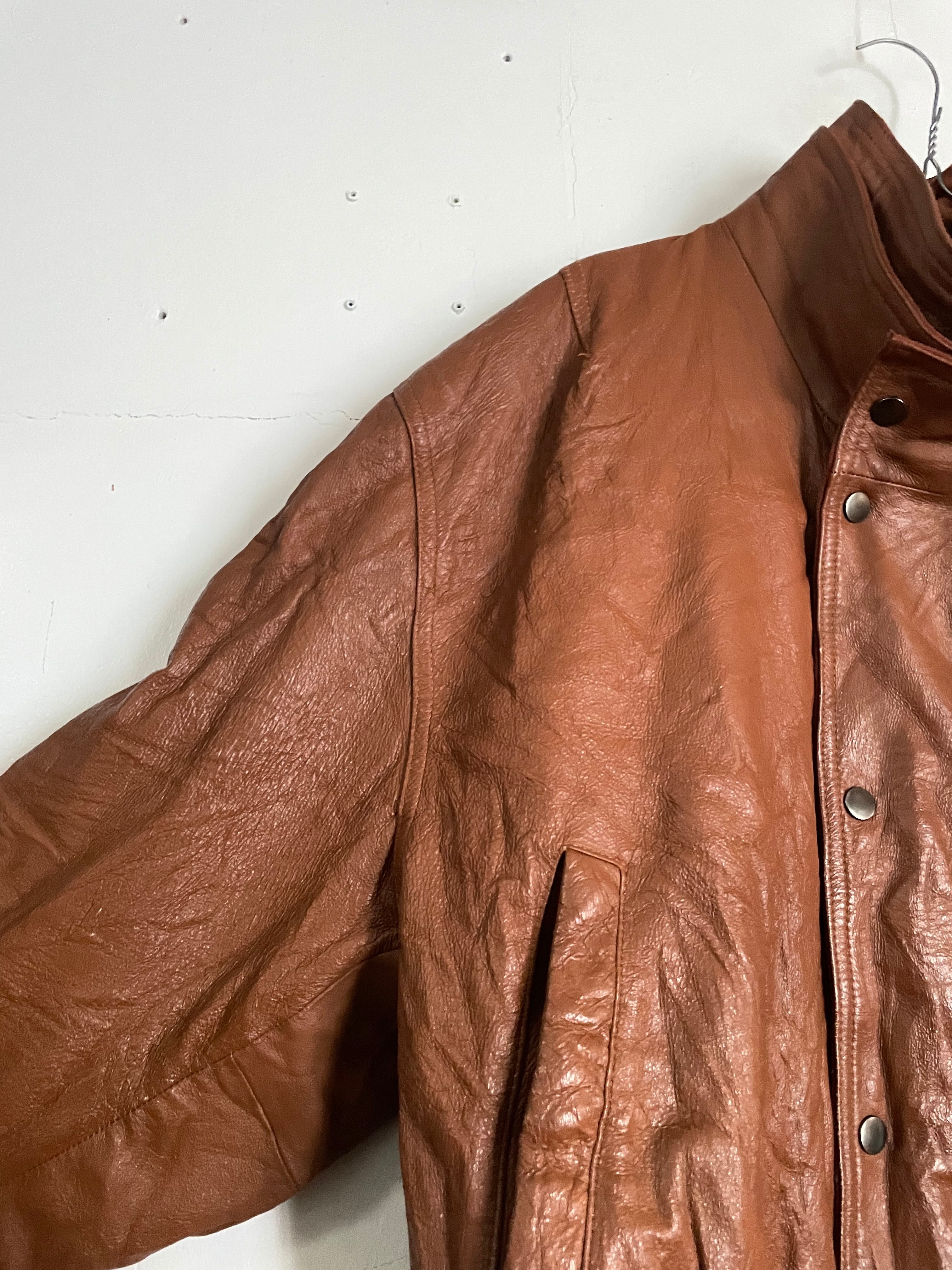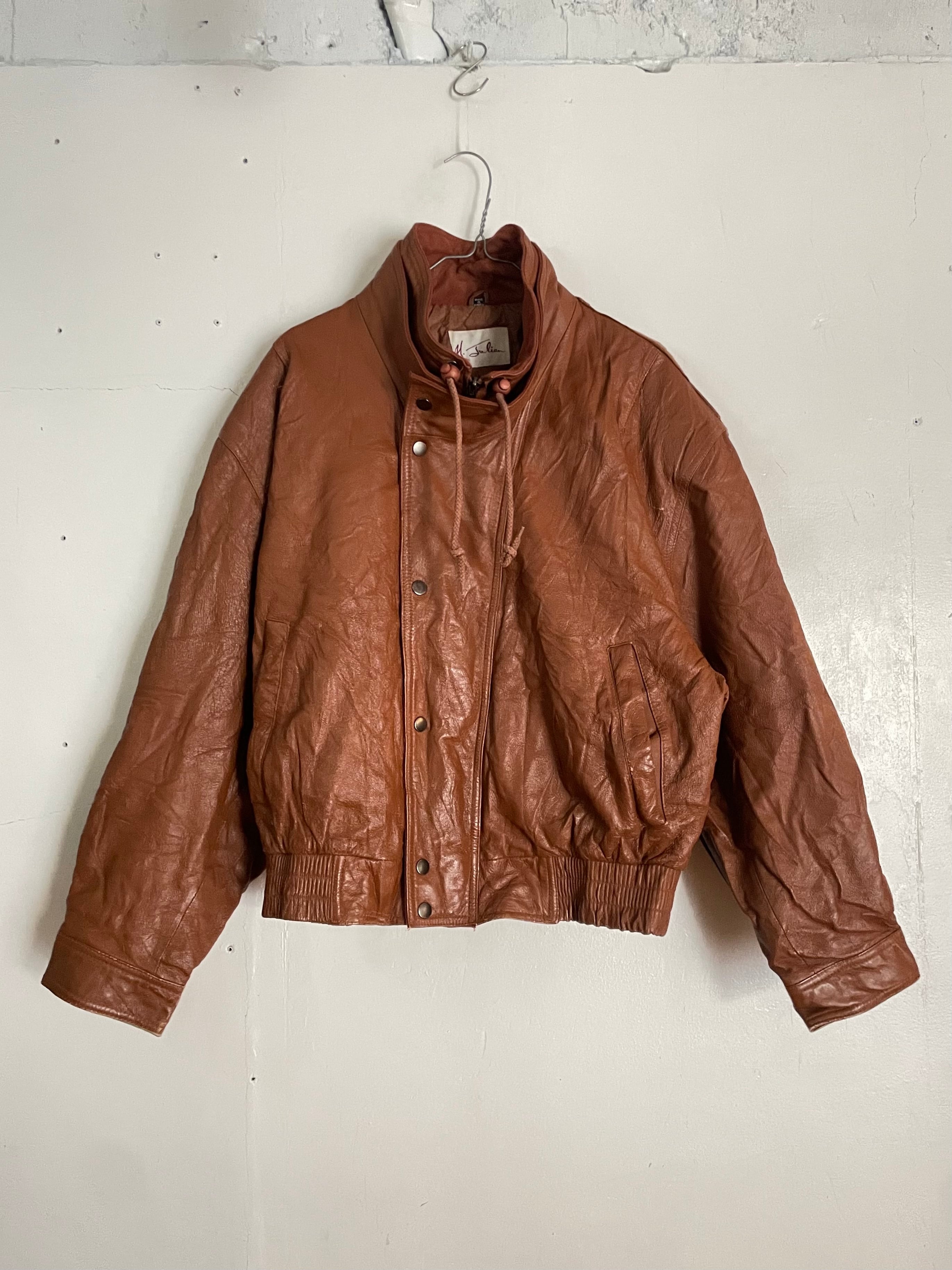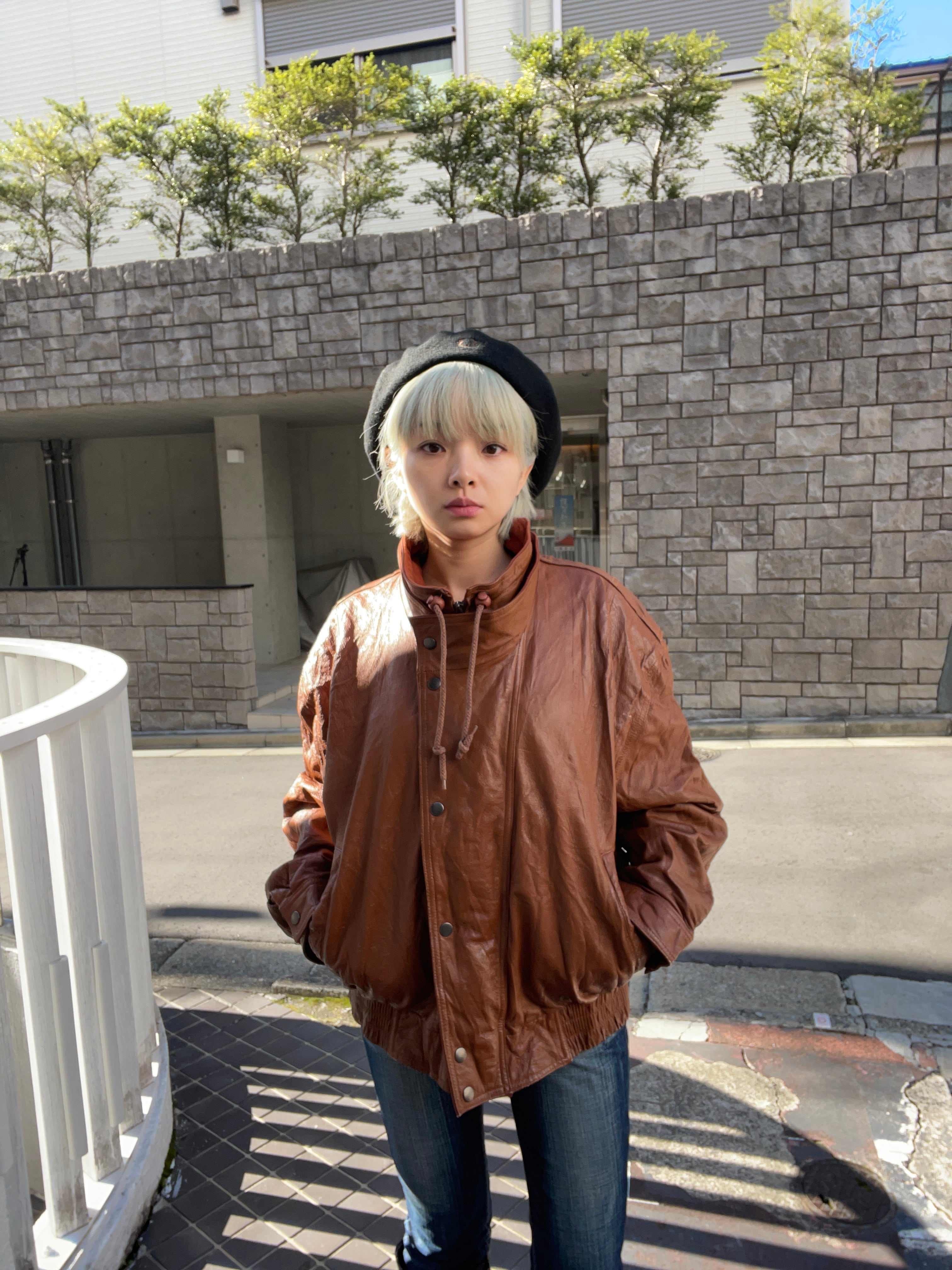 ライトなブラウンカラーが魅力のレザージャケット。しっとりとした質感の本革を使用しており重厚感がすごいです。スタンだカラー仕様で、首元にはドローコード付き。フロントはスナップボタン、裾と袖口はリブデザインになっており、丸みのあるシルエットが特徴です。