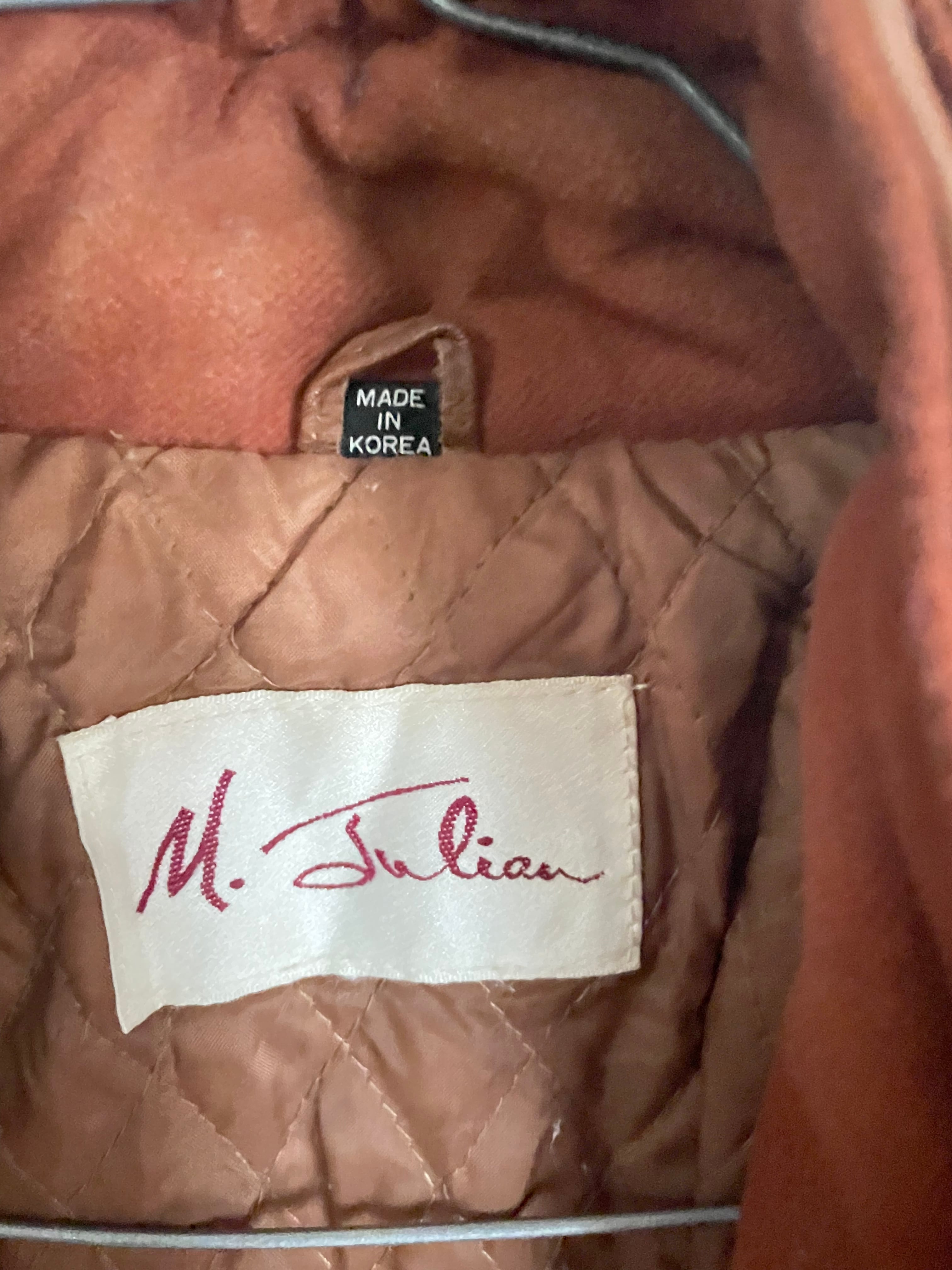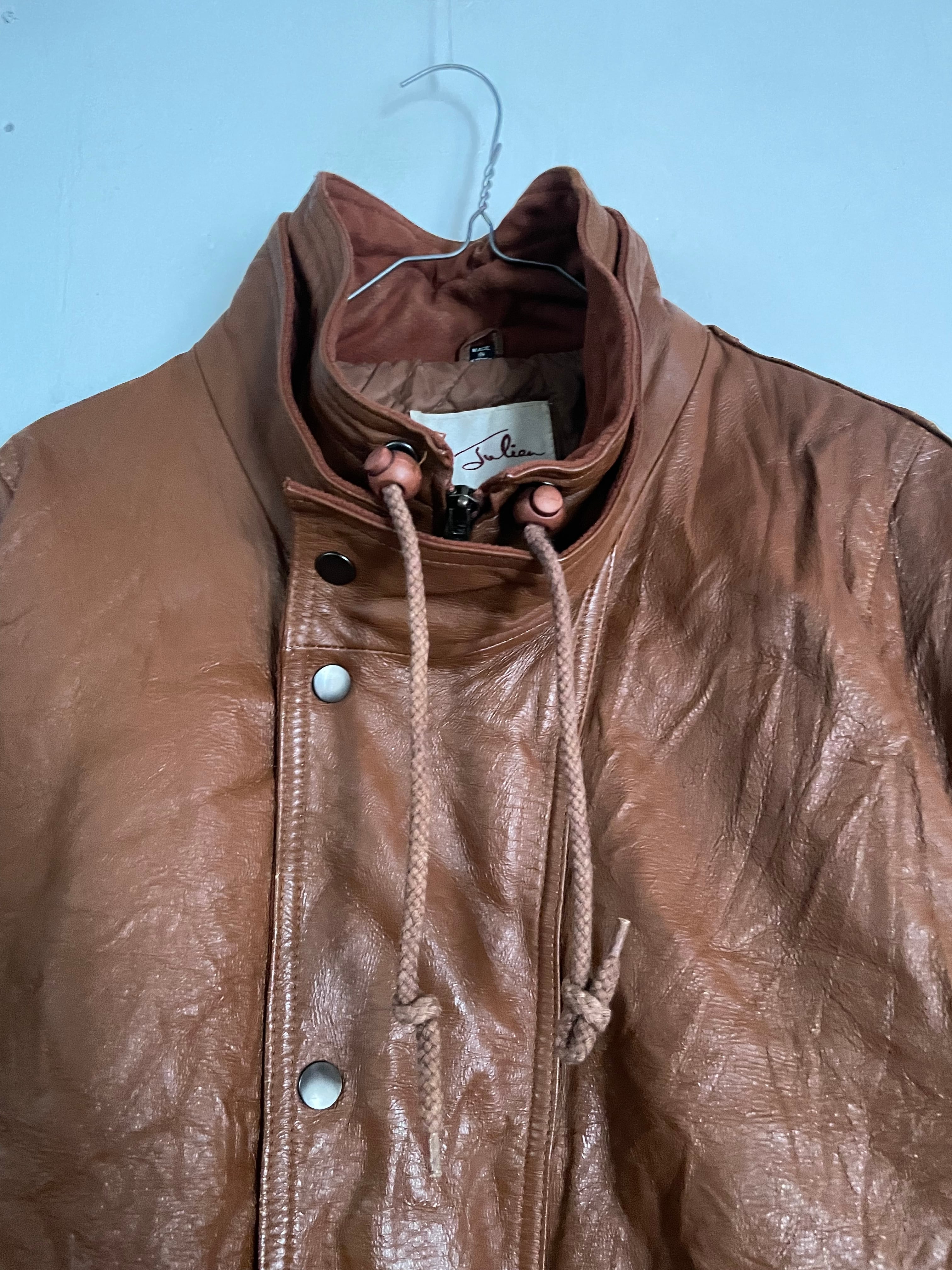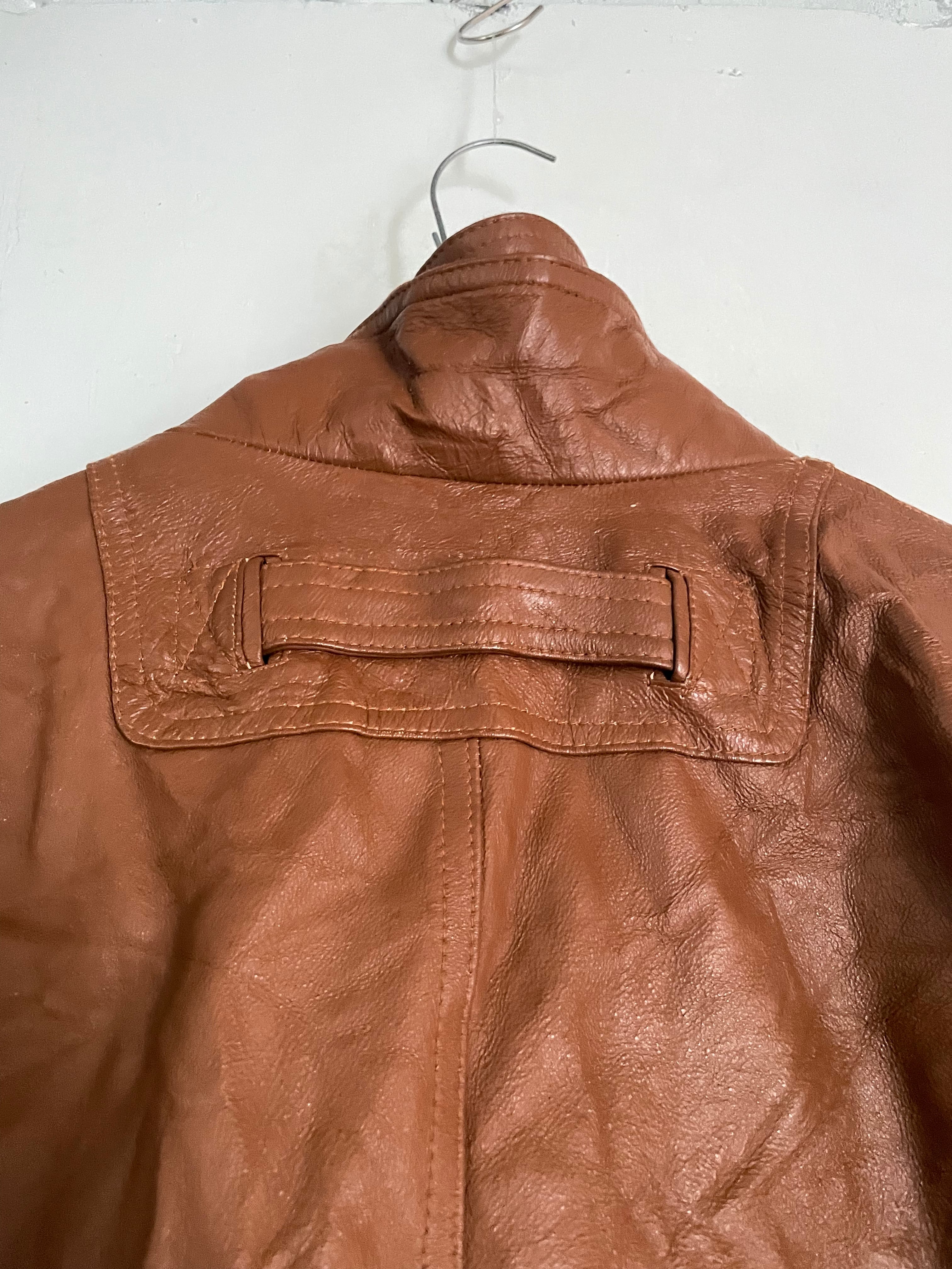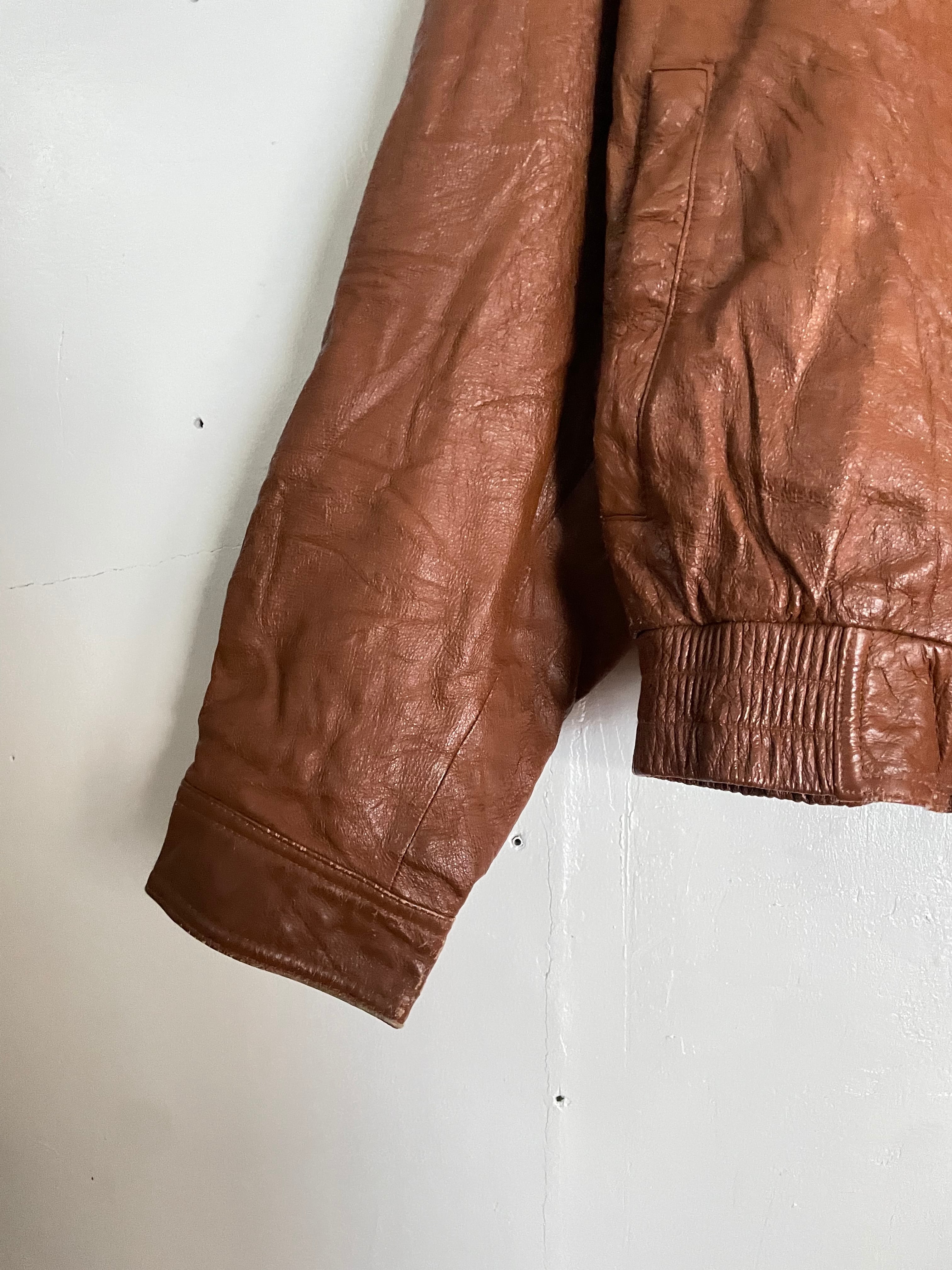 ライトなブラウンカラーが魅力のレザージャケット。しっとりとした質感の本革を使用しており重厚感がすごいです。スタンだカラー仕様で、首元にはドローコード付き。フロントはスナップボタン、裾と袖口はリブデザインになっており、丸みのあるシルエットが特徴です。