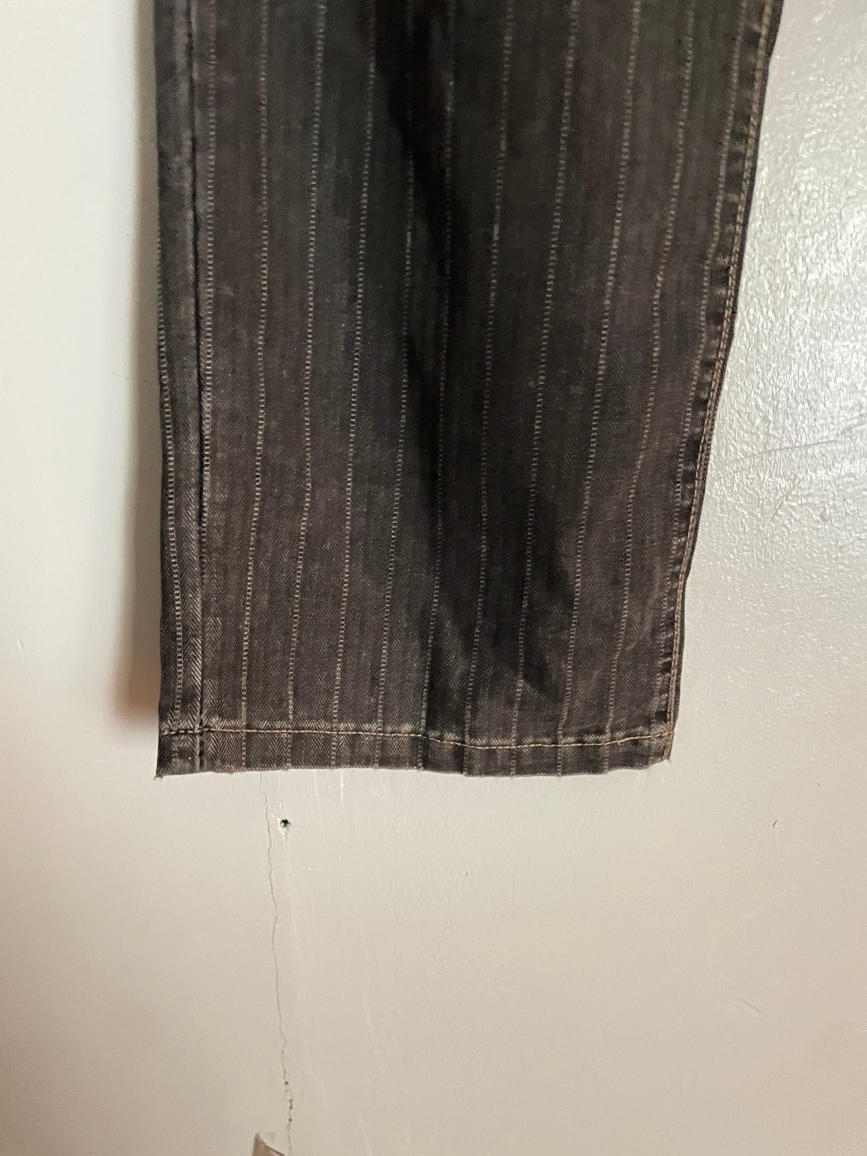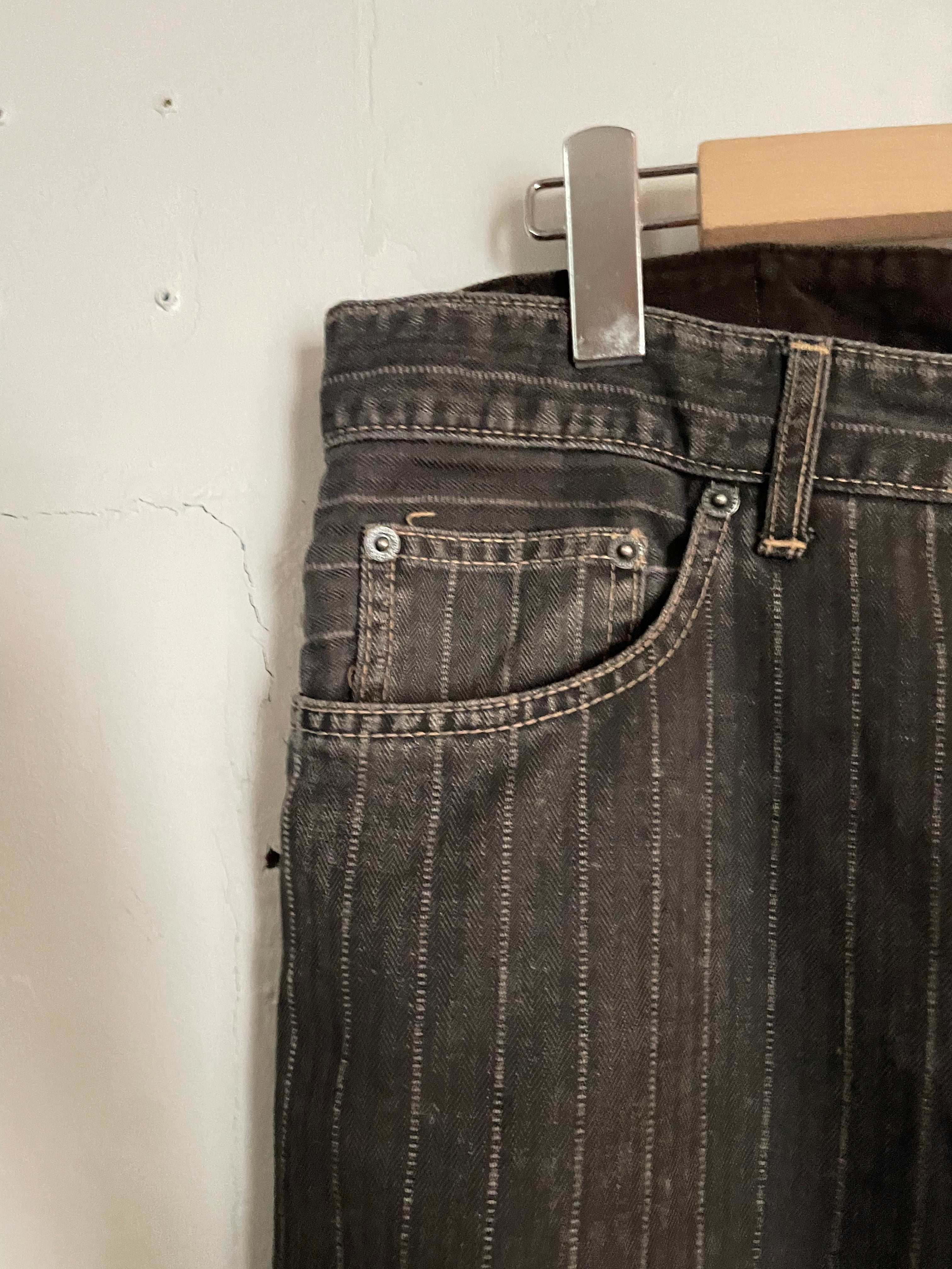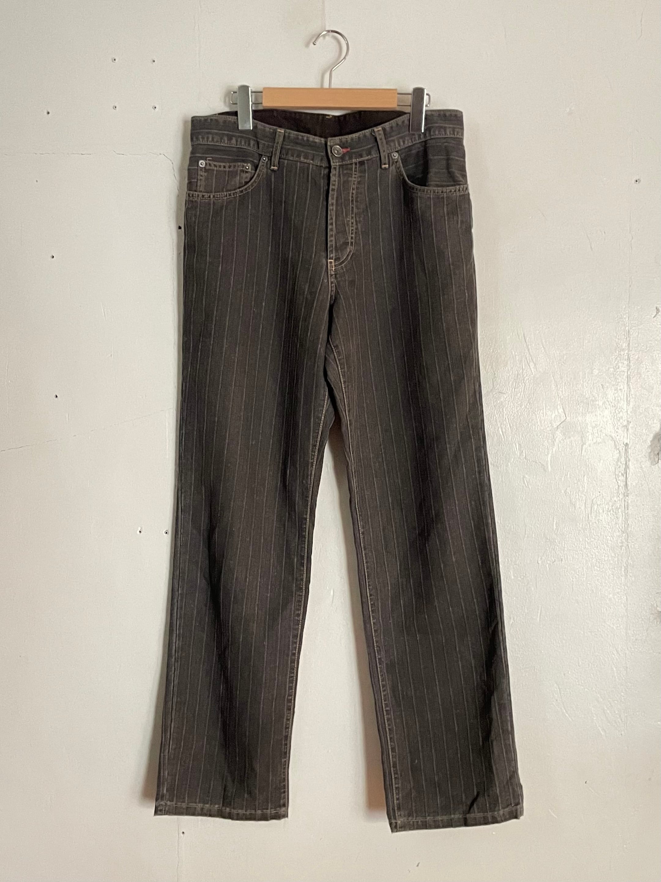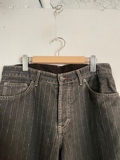 チャコール系の落ち着いた色味に、縦のストライプ柄が入ったデニムパンツです。ストライプが縦を強調し、脚をすっきり長く見せてくれるデザイン。やや細身のストレートで、カジュアルすぎず、きれいめモード寄りのスタイリングに合わせやすい一本です。デニム生地ながらストライプ入りで、他と被りにくいアイテムです。