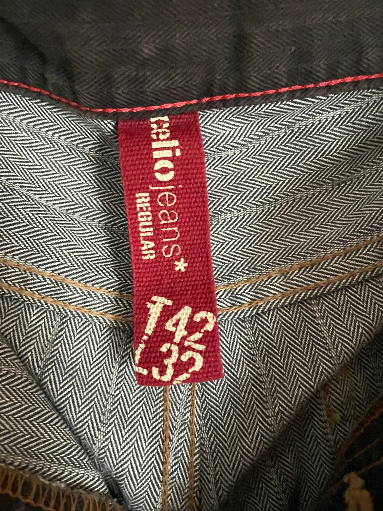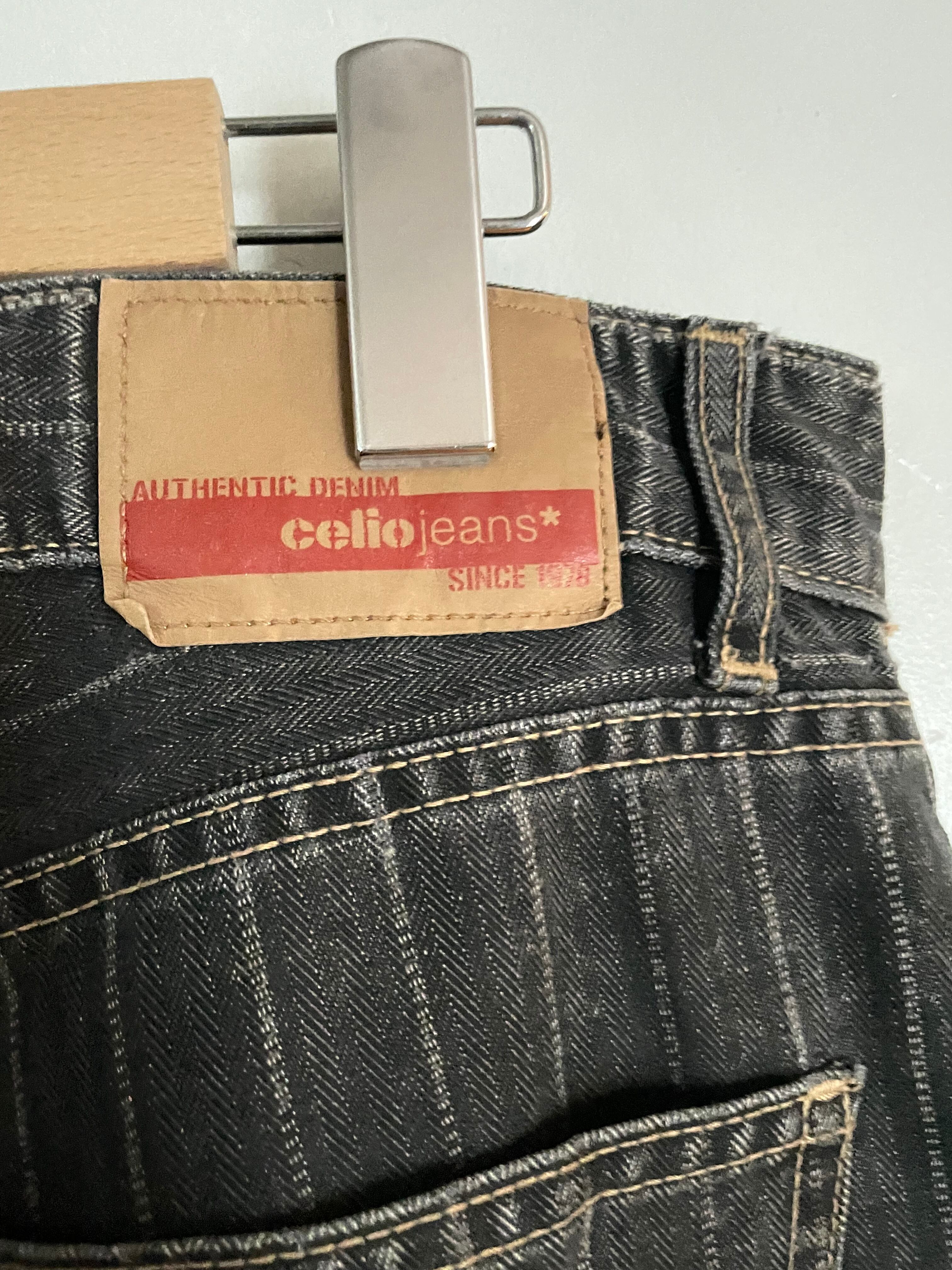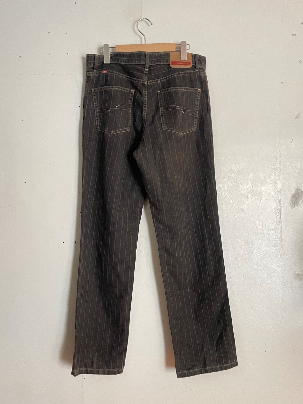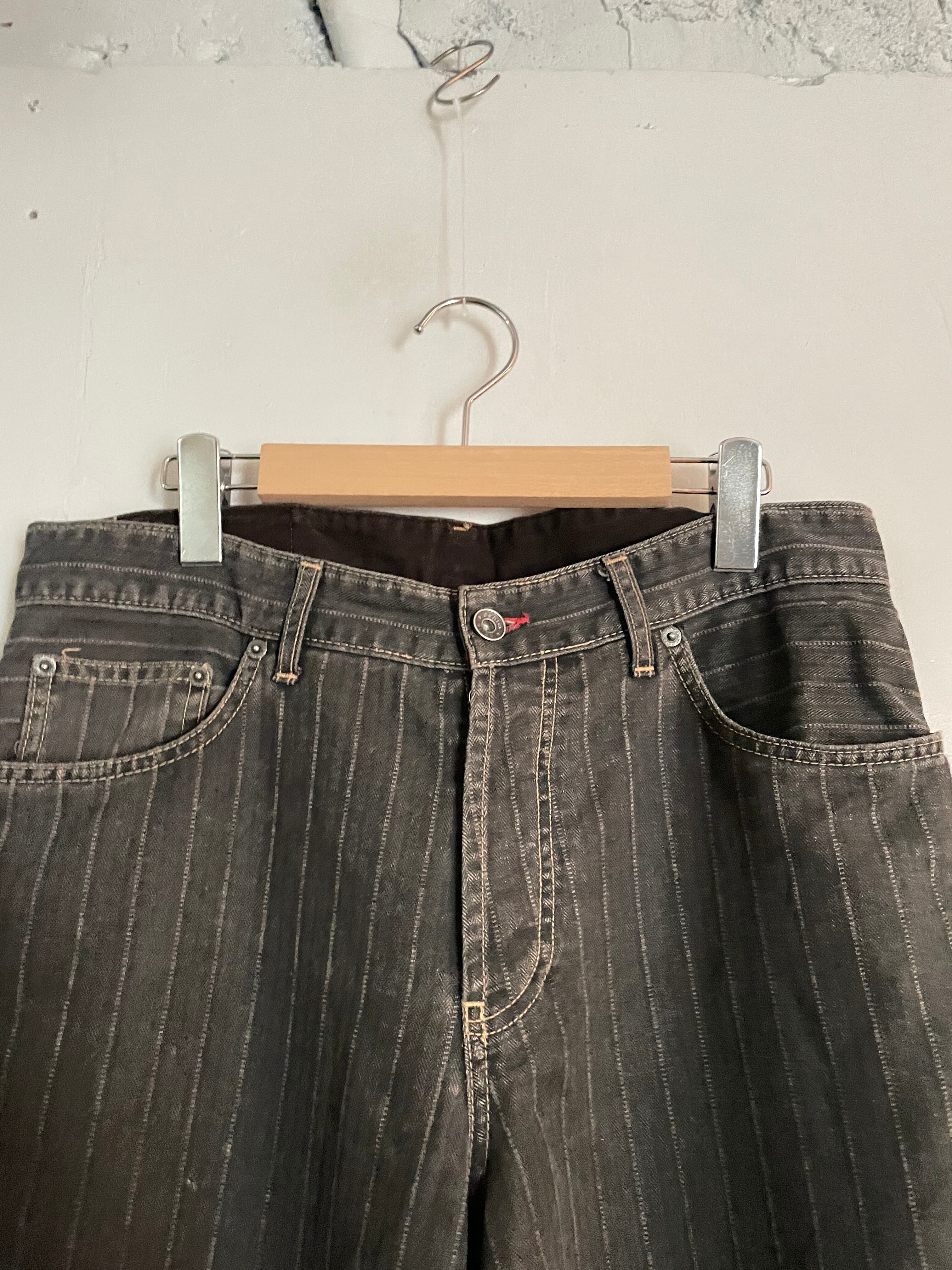 チャコール系の落ち着いた色味に、縦のストライプ柄が入ったデニムパンツです。ストライプが縦を強調し、脚をすっきり長く見せてくれるデザイン。やや細身のストレートで、カジュアルすぎず、きれいめモード寄りのスタイリングに合わせやすい一本です。デニム生地ながらストライプ入りで、他と被りにくいアイテムです。