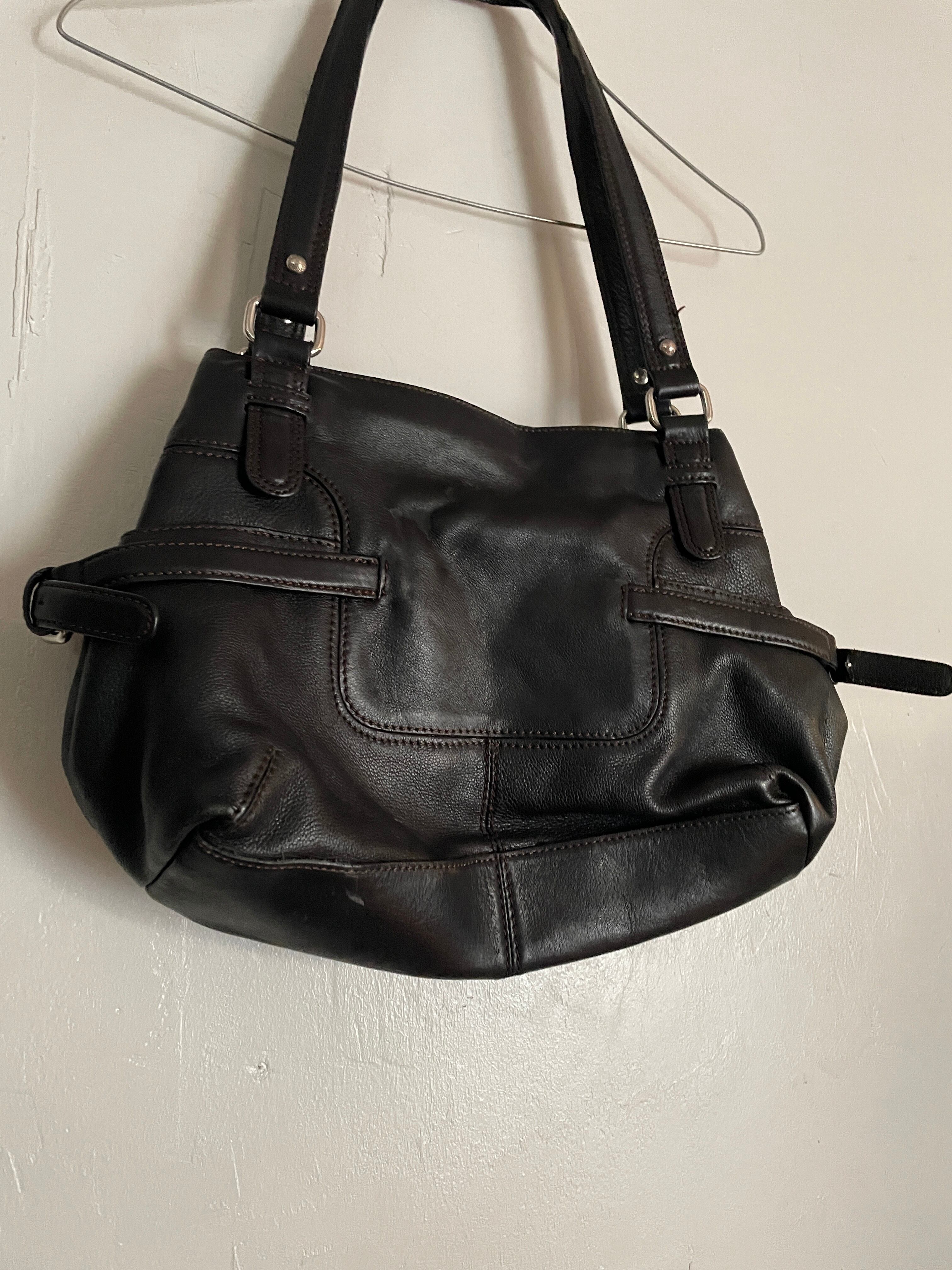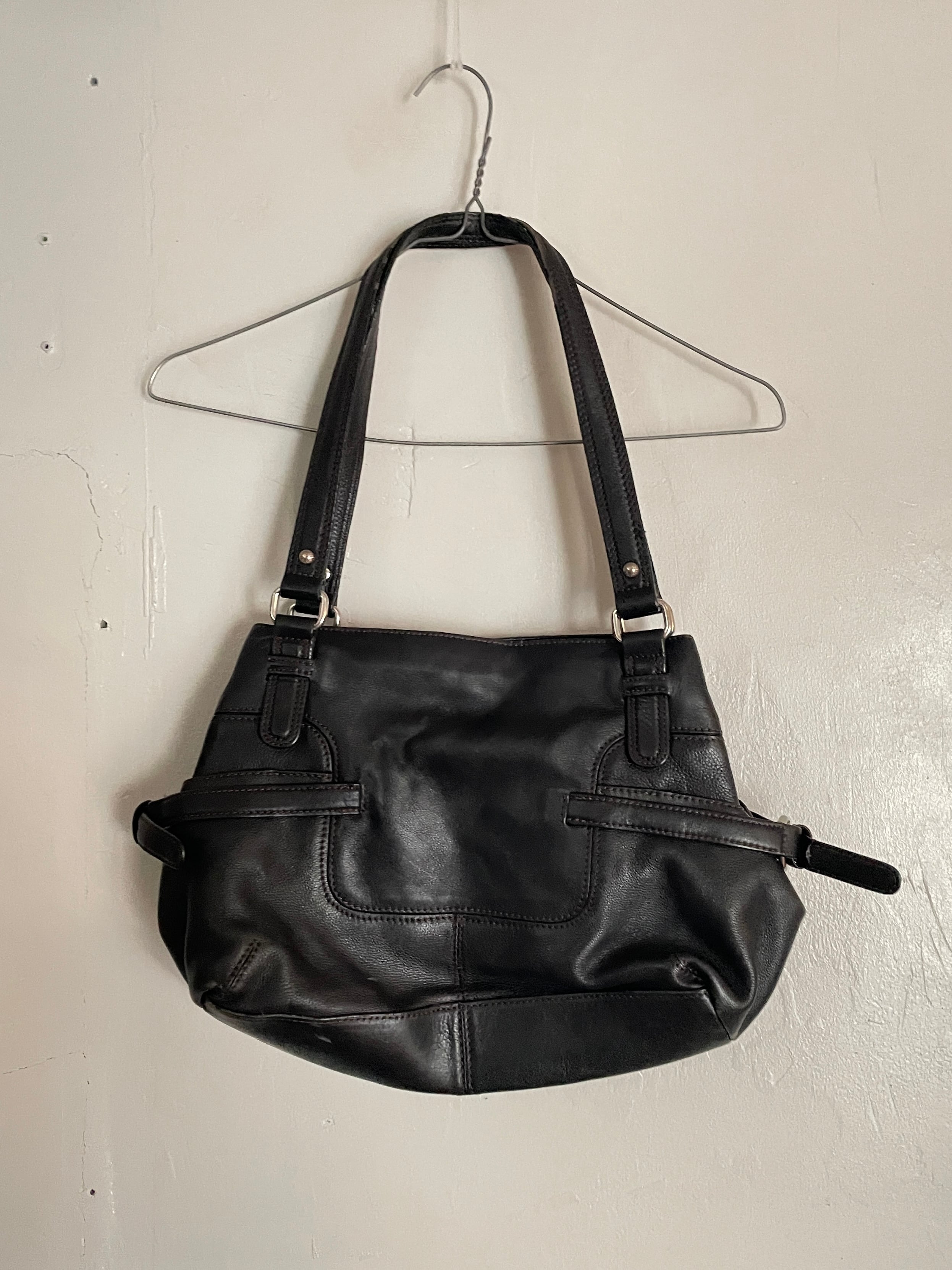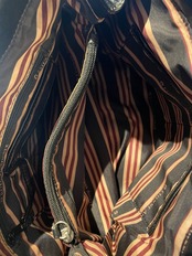 ブラックカラーで、ベルトデザインや、キーホルダーなどが取り付けられた、レザーバッグ。ブランドは”エティエンヌ・アイグナー”。ドイツのミュンヘン発祥のラグジュアリーレザーブランドです。ブランドのロゴがお洒落です。モチっとした上質なレザー素材。コンパクトめでありながら、マチは広めで、収納ポケットも豊富です。中の柄デザインもグッドです。ブラックカラーなので、様々なファッションに取り入れやすく、良いアクセントになってくれるバッグです。