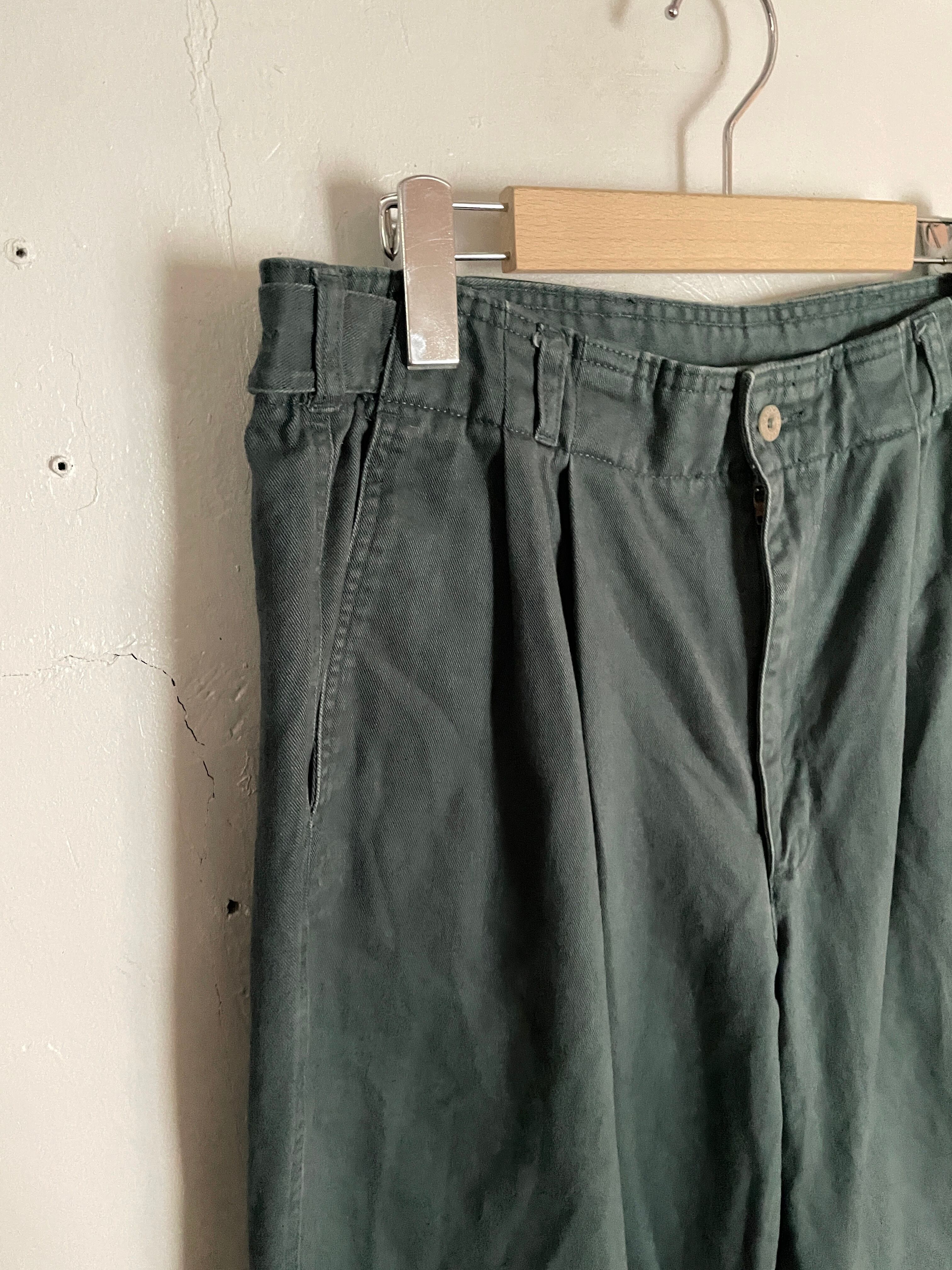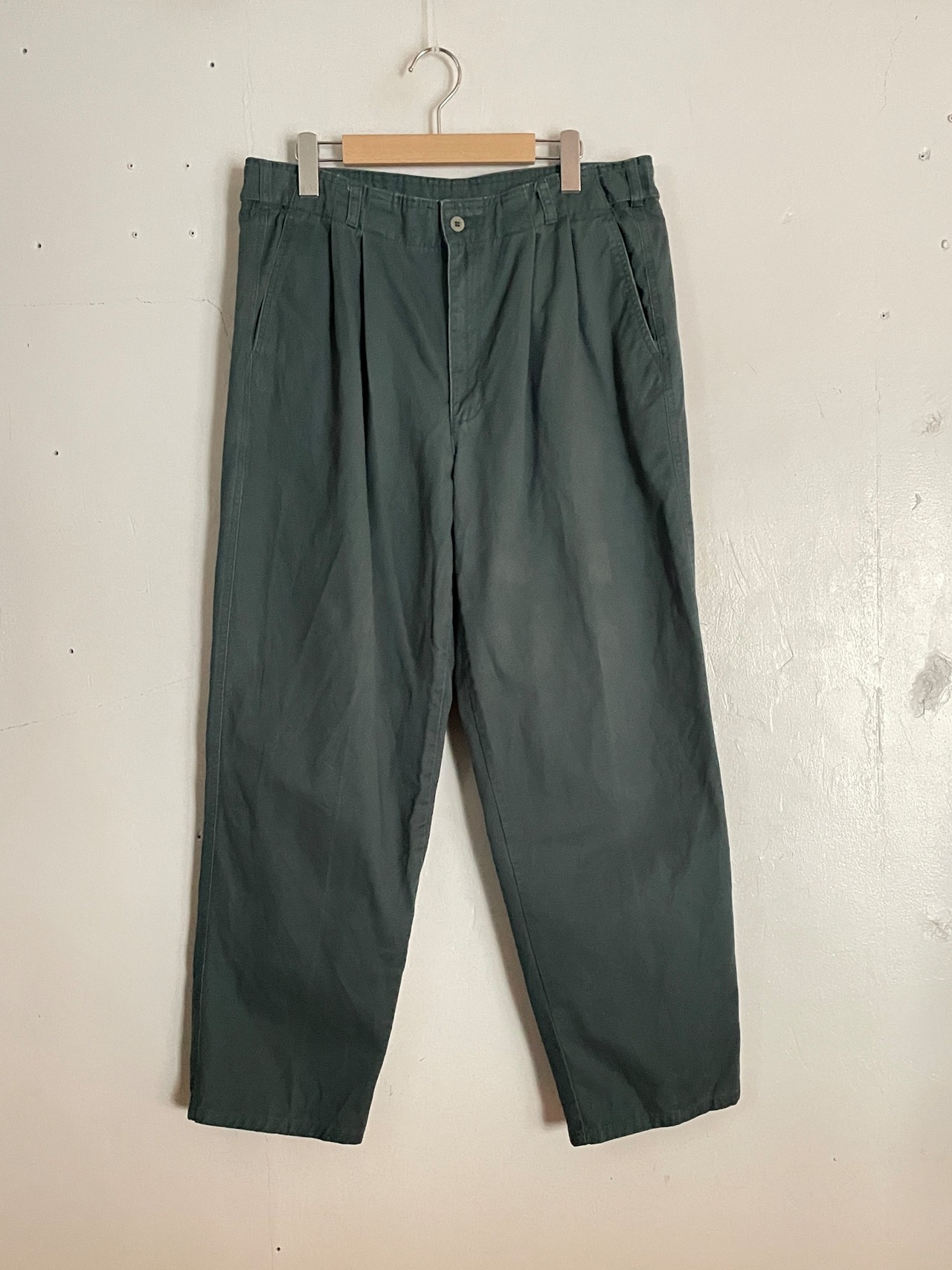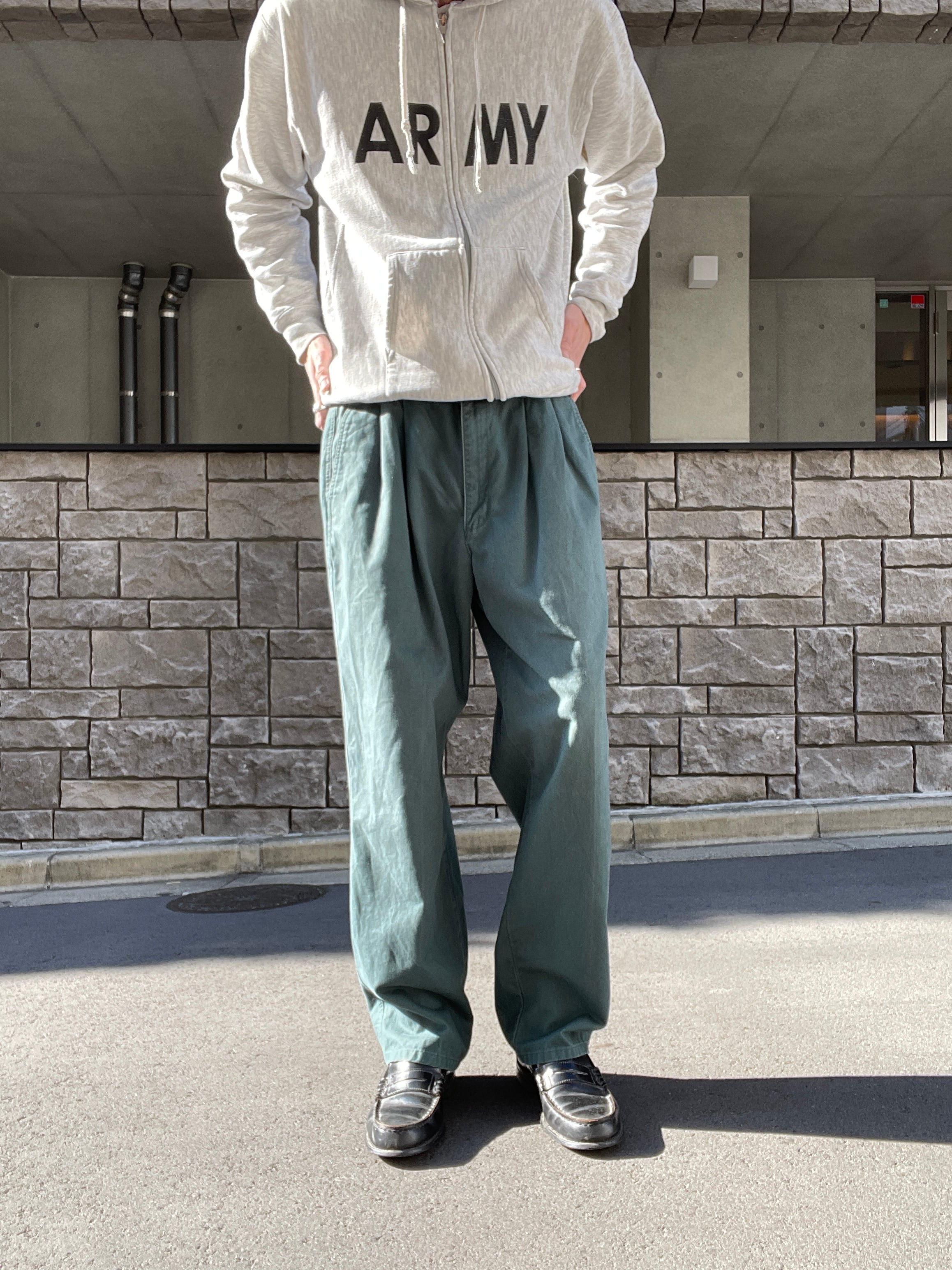 褪せたグリーンカラーで、2タック入った綺麗なワイドシルエットが魅力的な、ドッカーズのコットンパンツ。とにかく色味が絶妙にグッドです。ウエスト部分にはボタン付きアジャスター付き。厚みのあるコットン素材なので、今の時期にはもってこいのパンツかと思います。