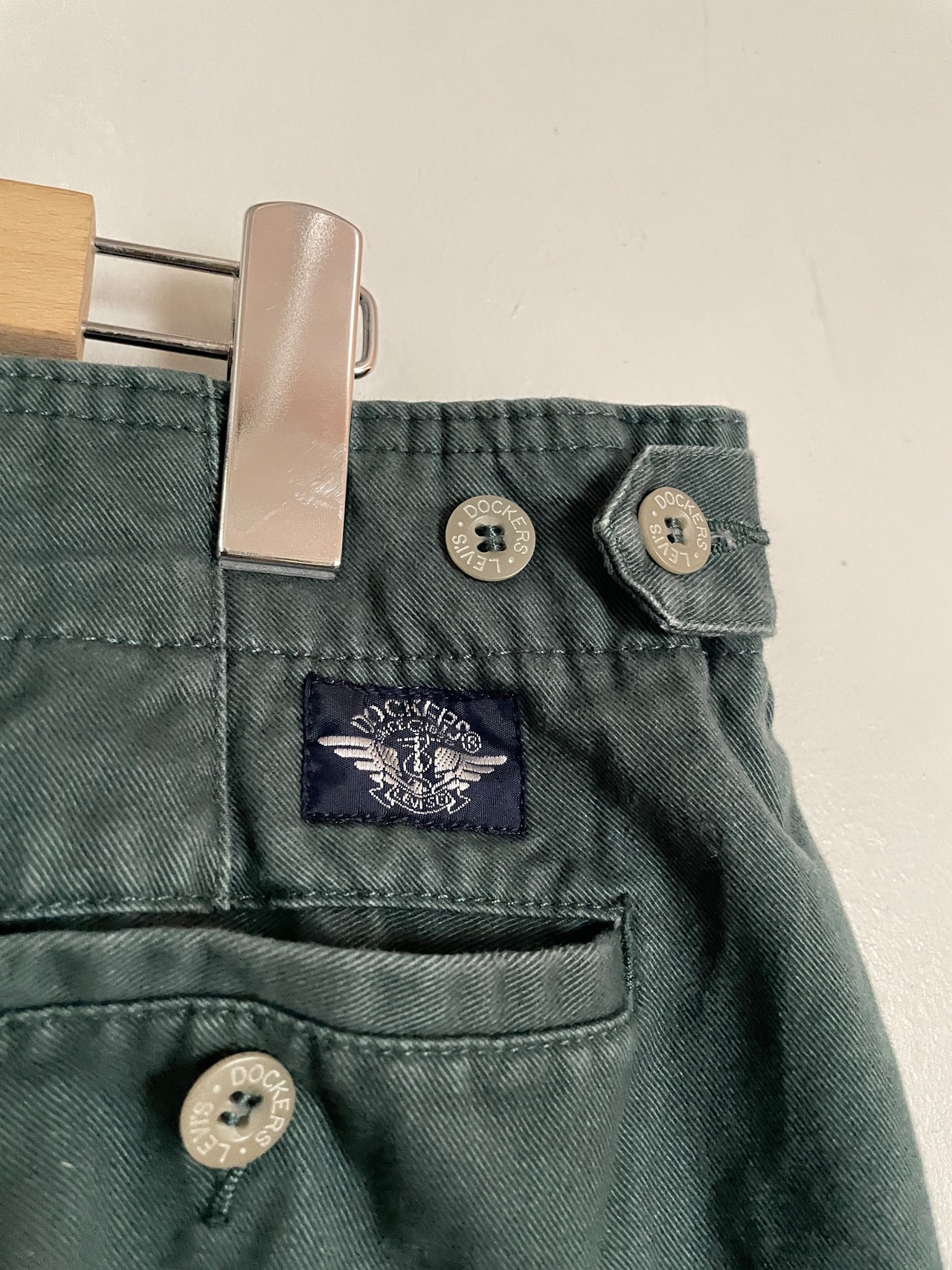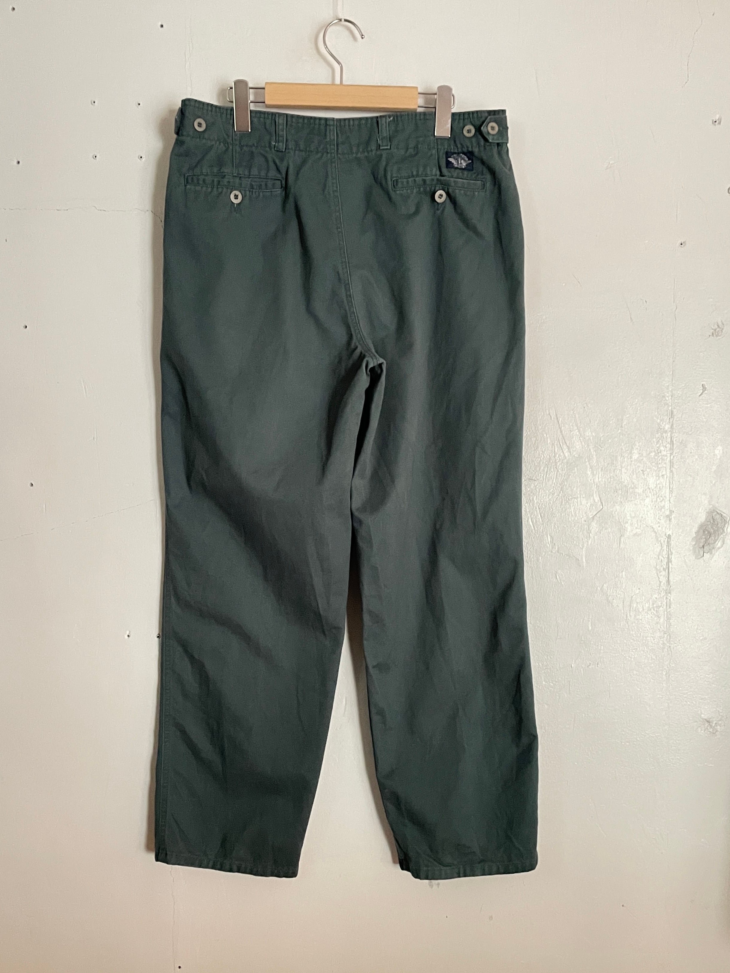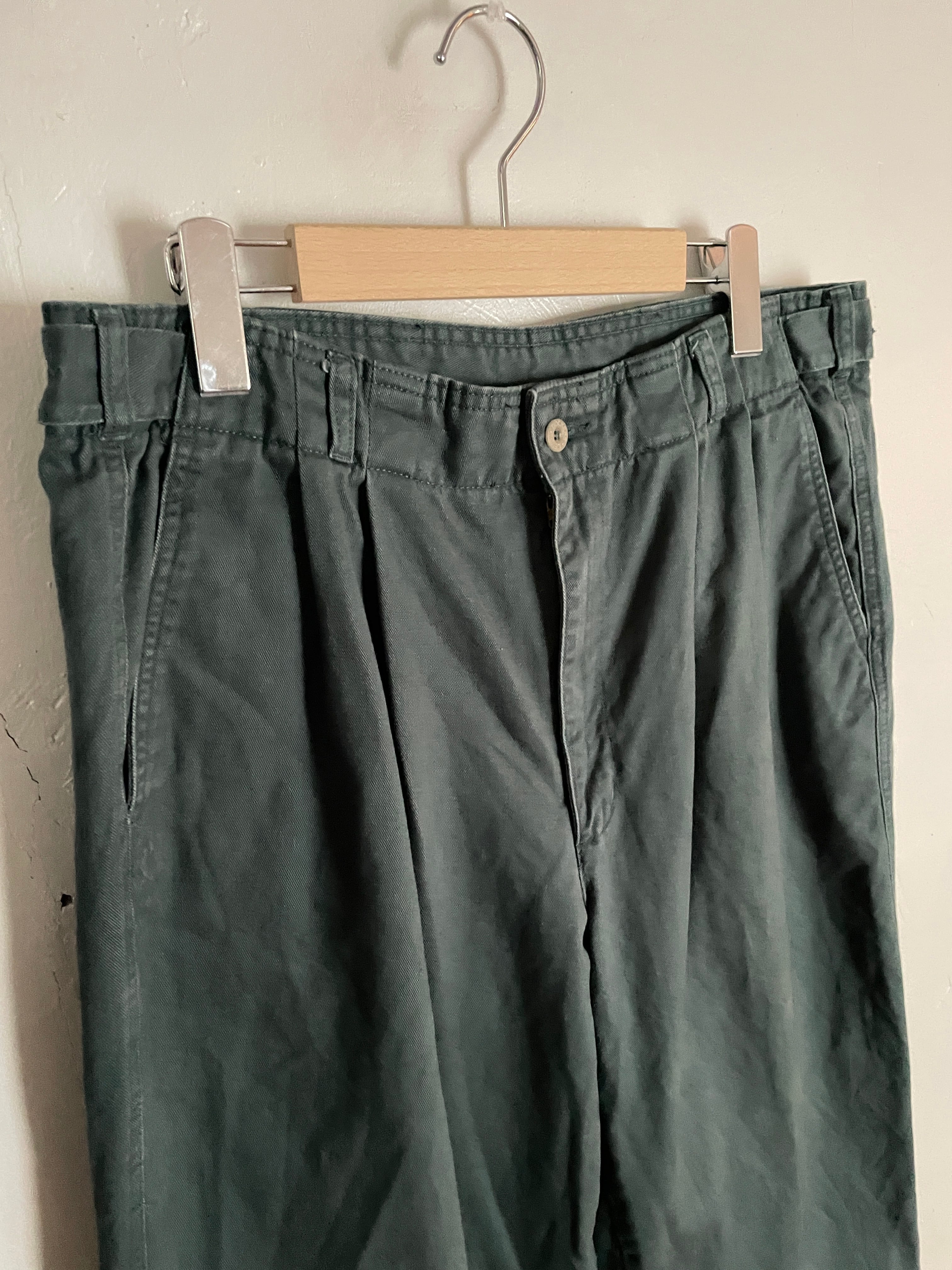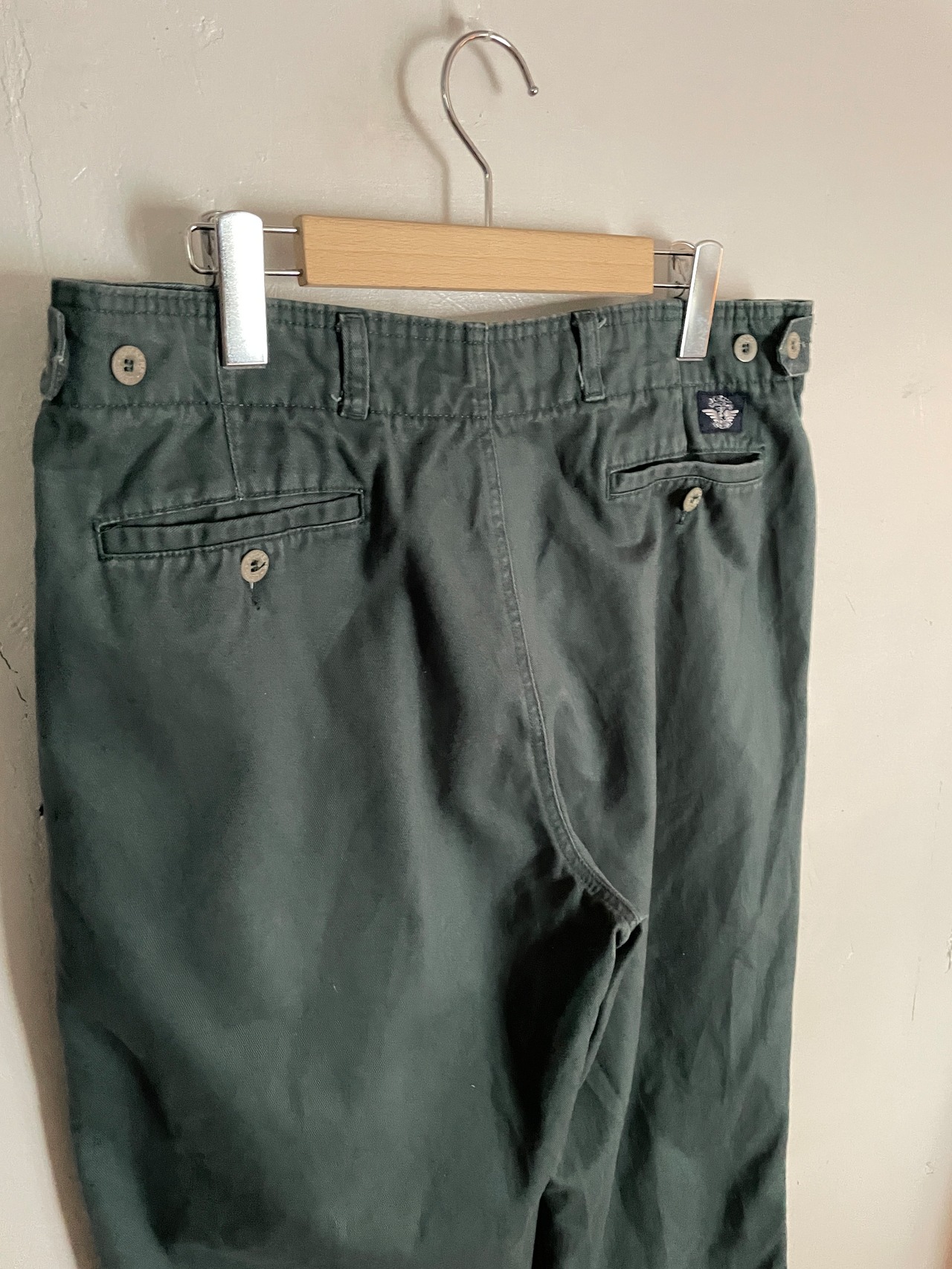 褪せたグリーンカラーで、2タック入った綺麗なワイドシルエットが魅力的な、ドッカーズのコットンパンツ。とにかく色味が絶妙にグッドです。ウエスト部分にはボタン付きアジャスター付き。厚みのあるコットン素材なので、今の時期にはもってこいのパンツかと思います。