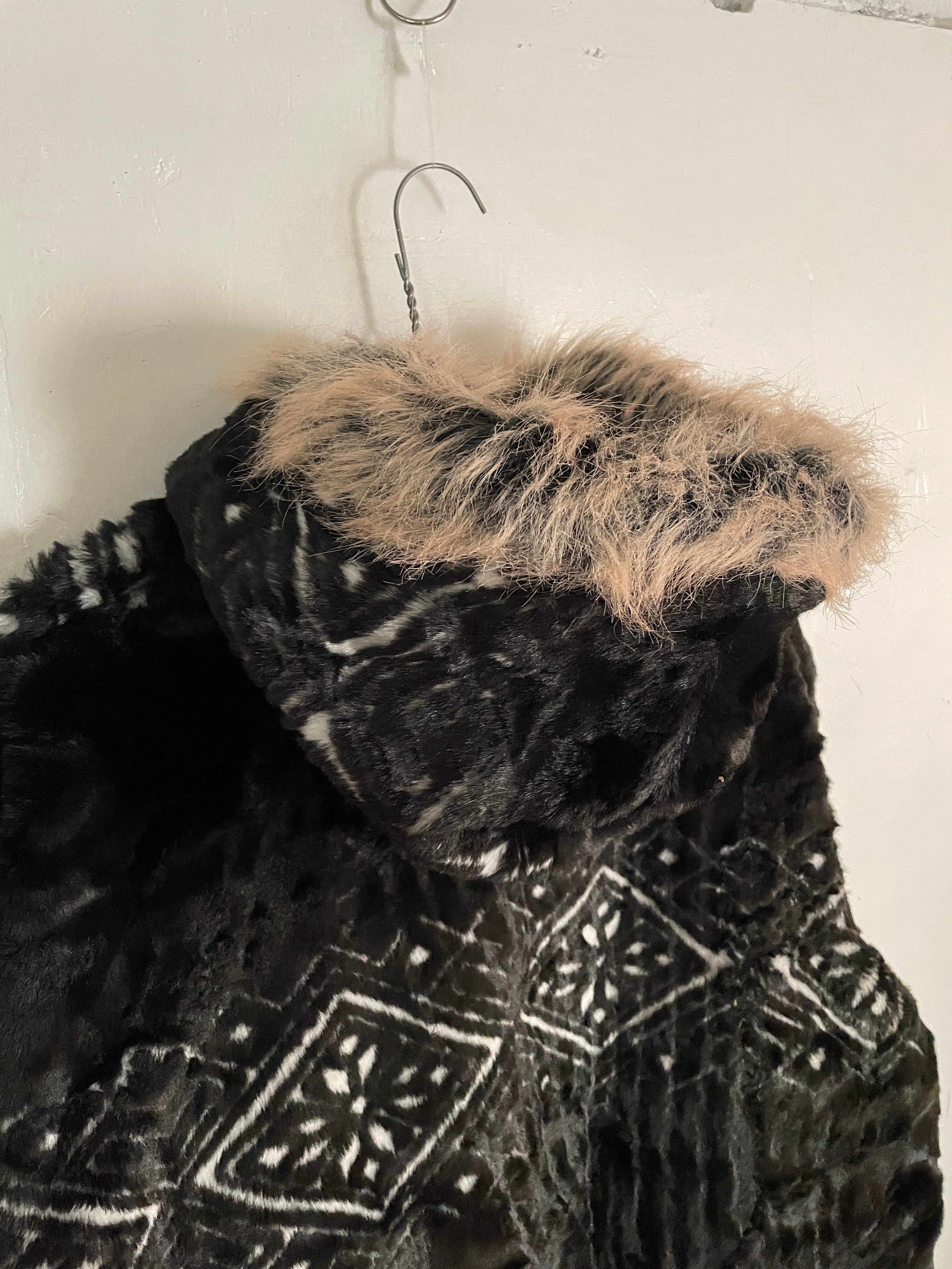 ブラックボディに、花をモチーフにした柄デザインが施された、ファージャケット。毛足の長い上質なファーで雰囲気抜群の1着。フード付きで、フードのファーだけ色が違うのもポイント。保温性に優れていて、今の時期には間違いなくファッションの主役になってくれそうです。ゆったりとしたサイズ感なので、インナーにもしっかり着込めそうです。