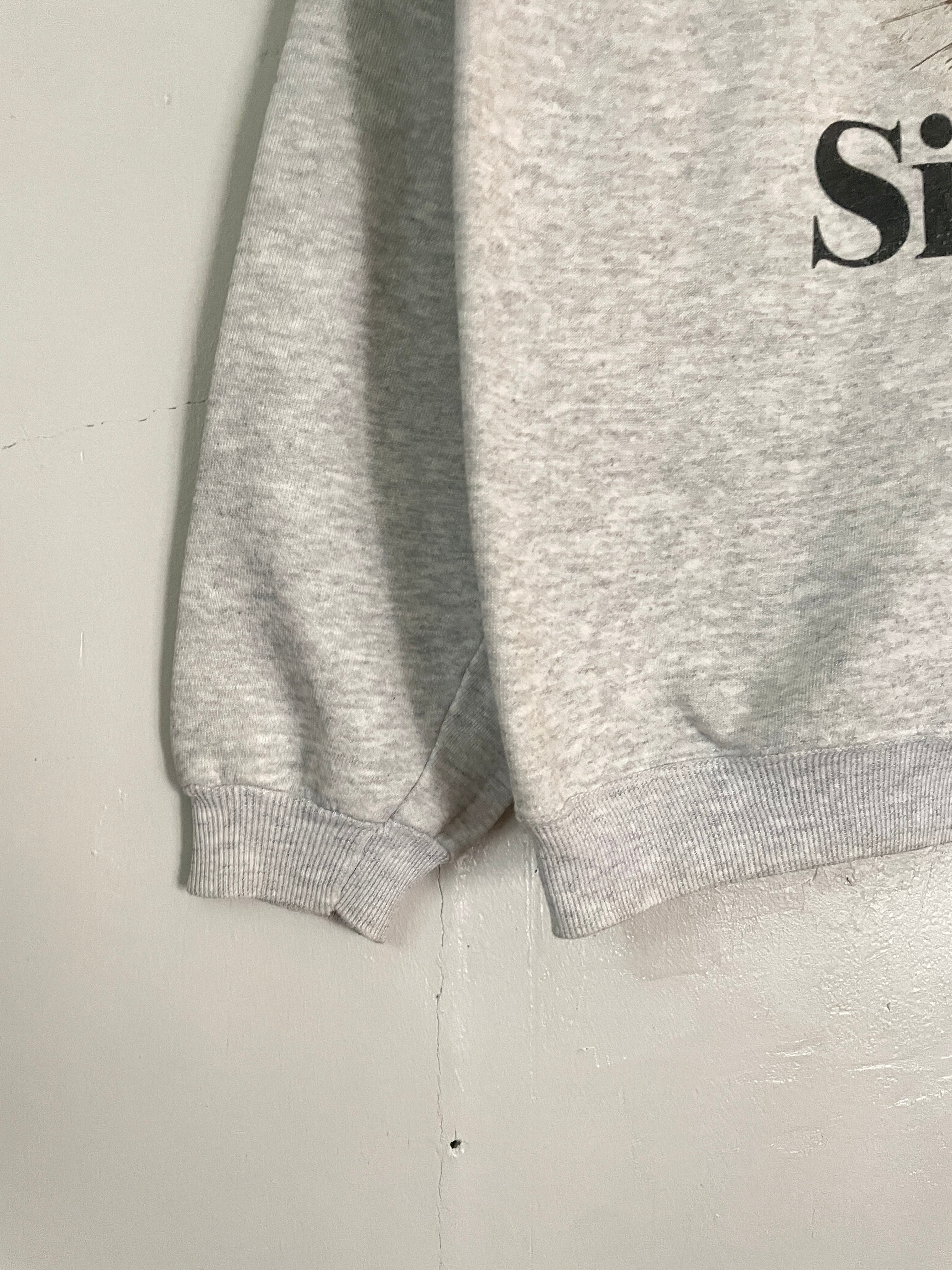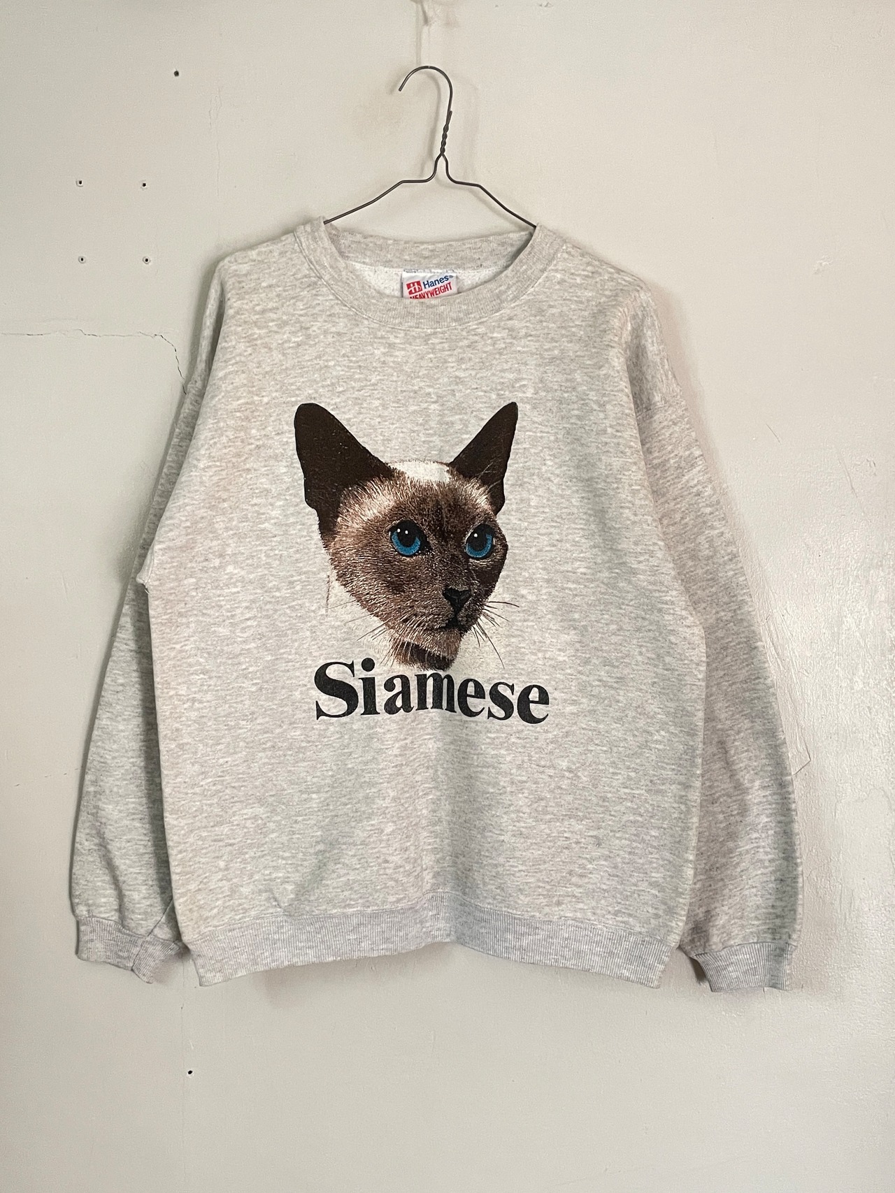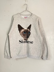 グレーボディに、可愛らしいシャム猫プリントが施されたスウェット。かなり細かなプリントでリアルなのがグッド。デカプリントなのでインパクトもしっかりとあります。コットンポリの厚手な素材感。ボディはヘインズでUSA製です。大き過ぎず、小さ過ぎないサイズ感なので、男女共におすすめしたいスウェットです。