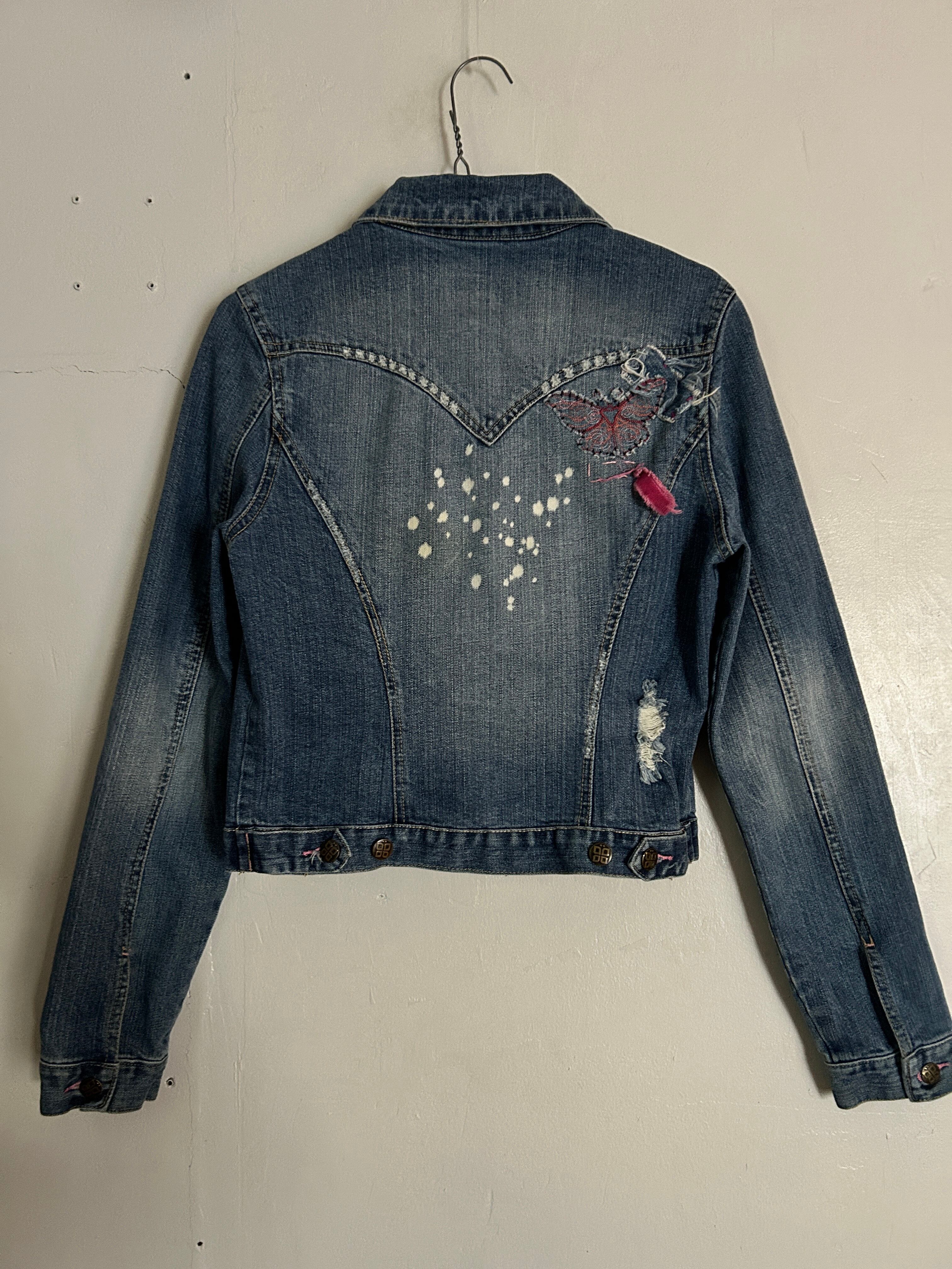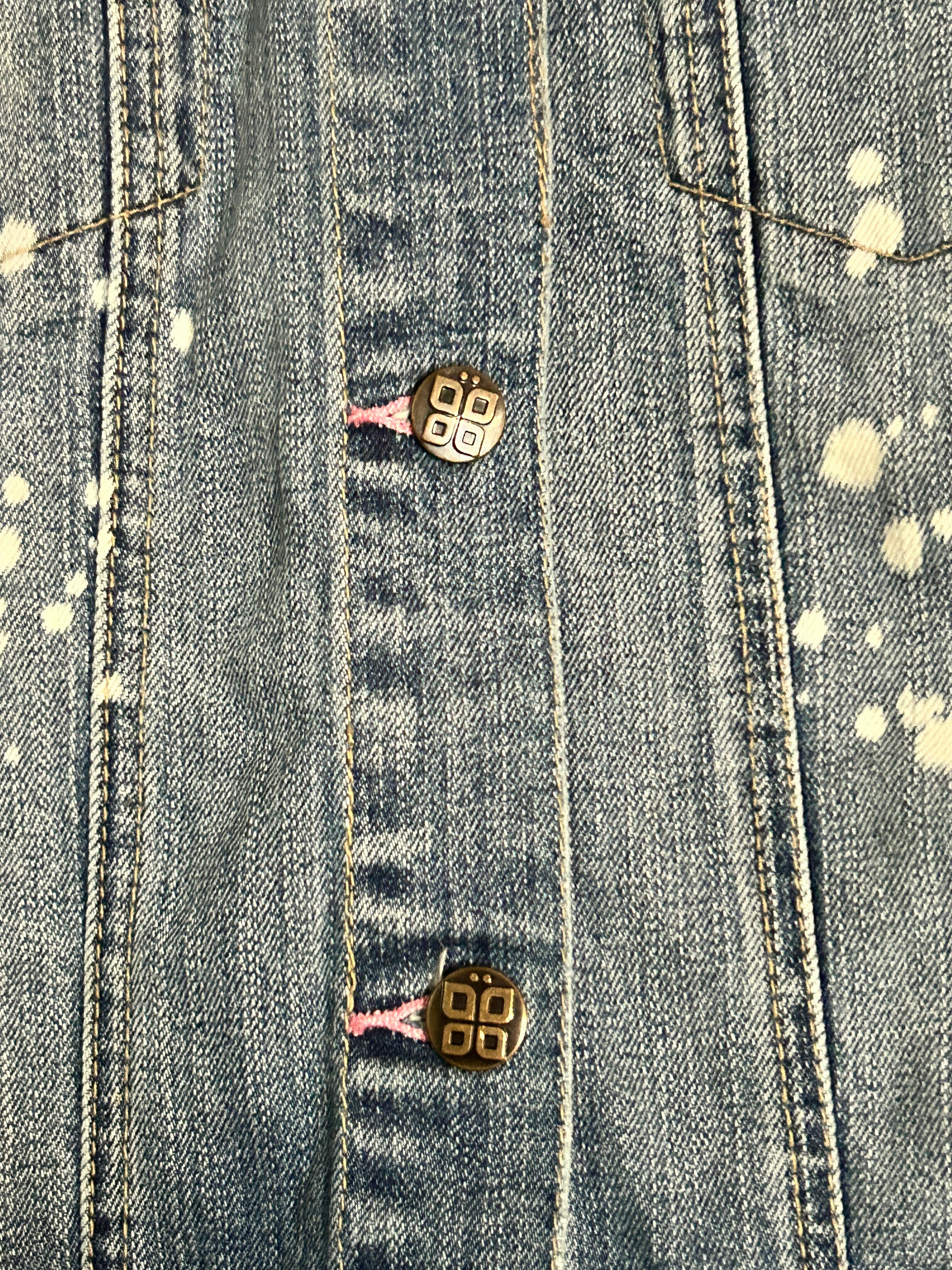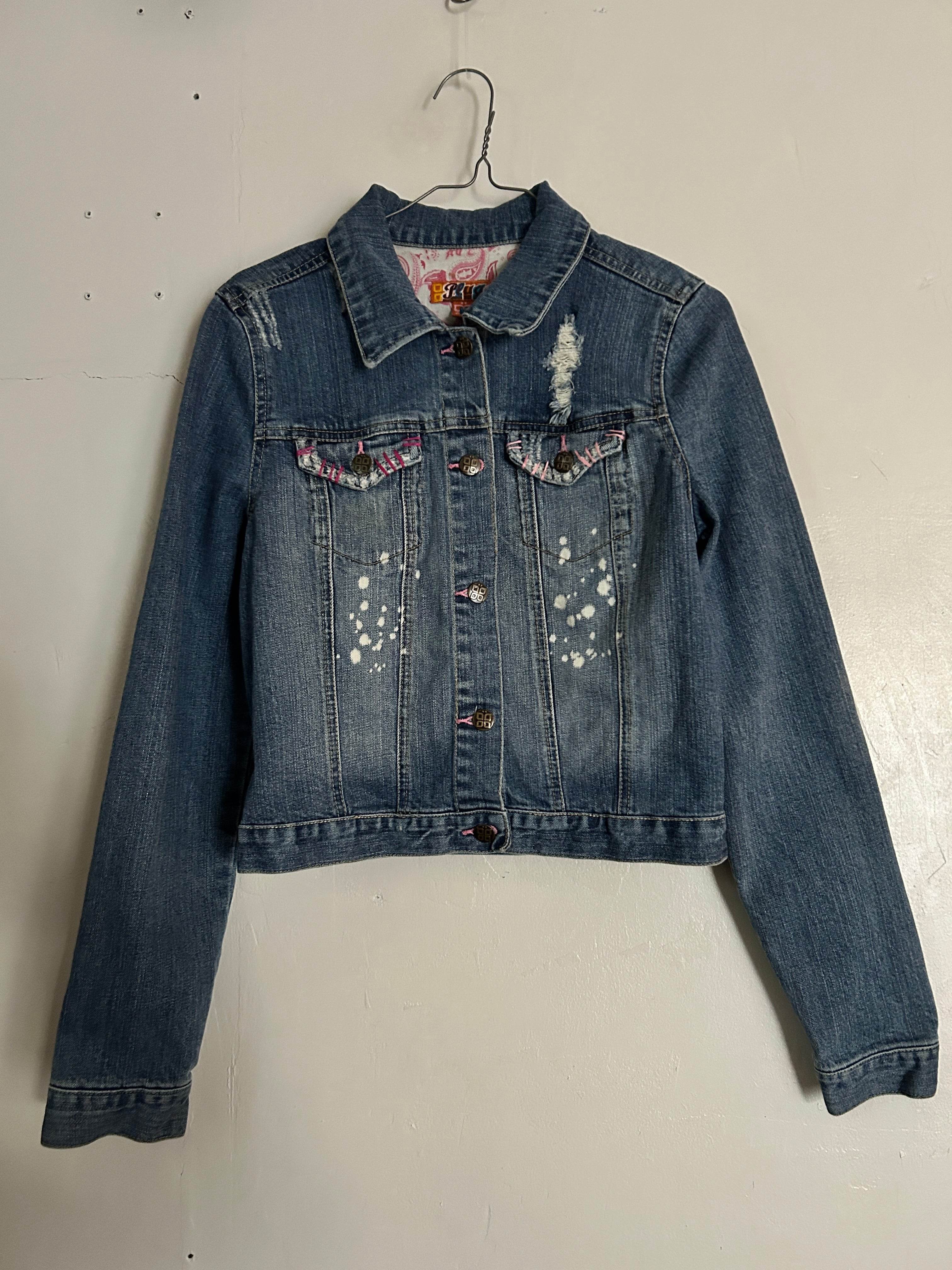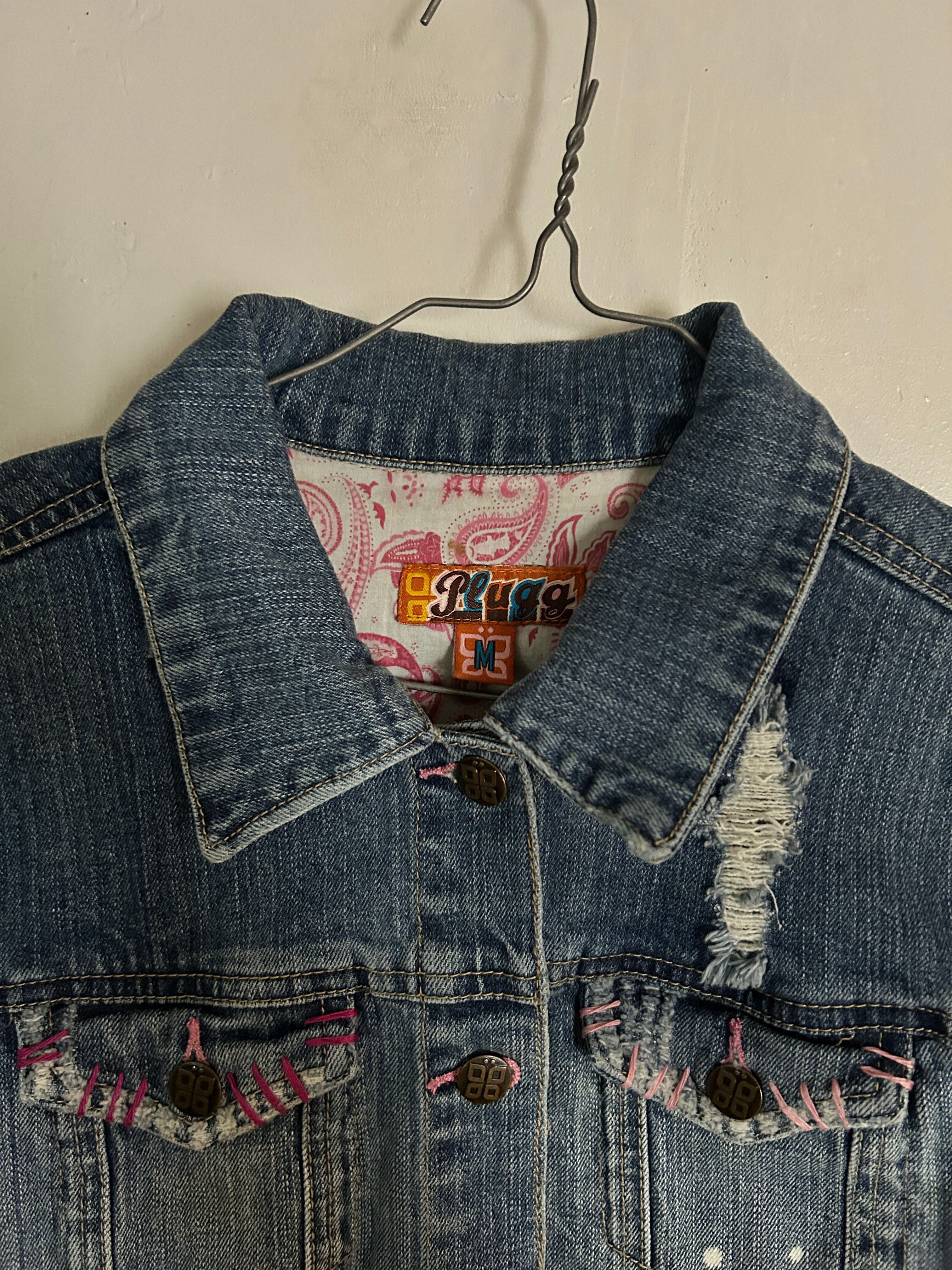 色落ちが程よく入ったデニム素材に、ペイント加工やダメージ、ピンクのステッチがアクセントになったデニムジャケット。ショート丈でレディースは使いやすいのでは!内側にはペイズリー柄のライニングが施され、見えない部分までこだわりを感じる一着。カジュアルながらも個性が光るデザインで、コーデの主役として活躍します。