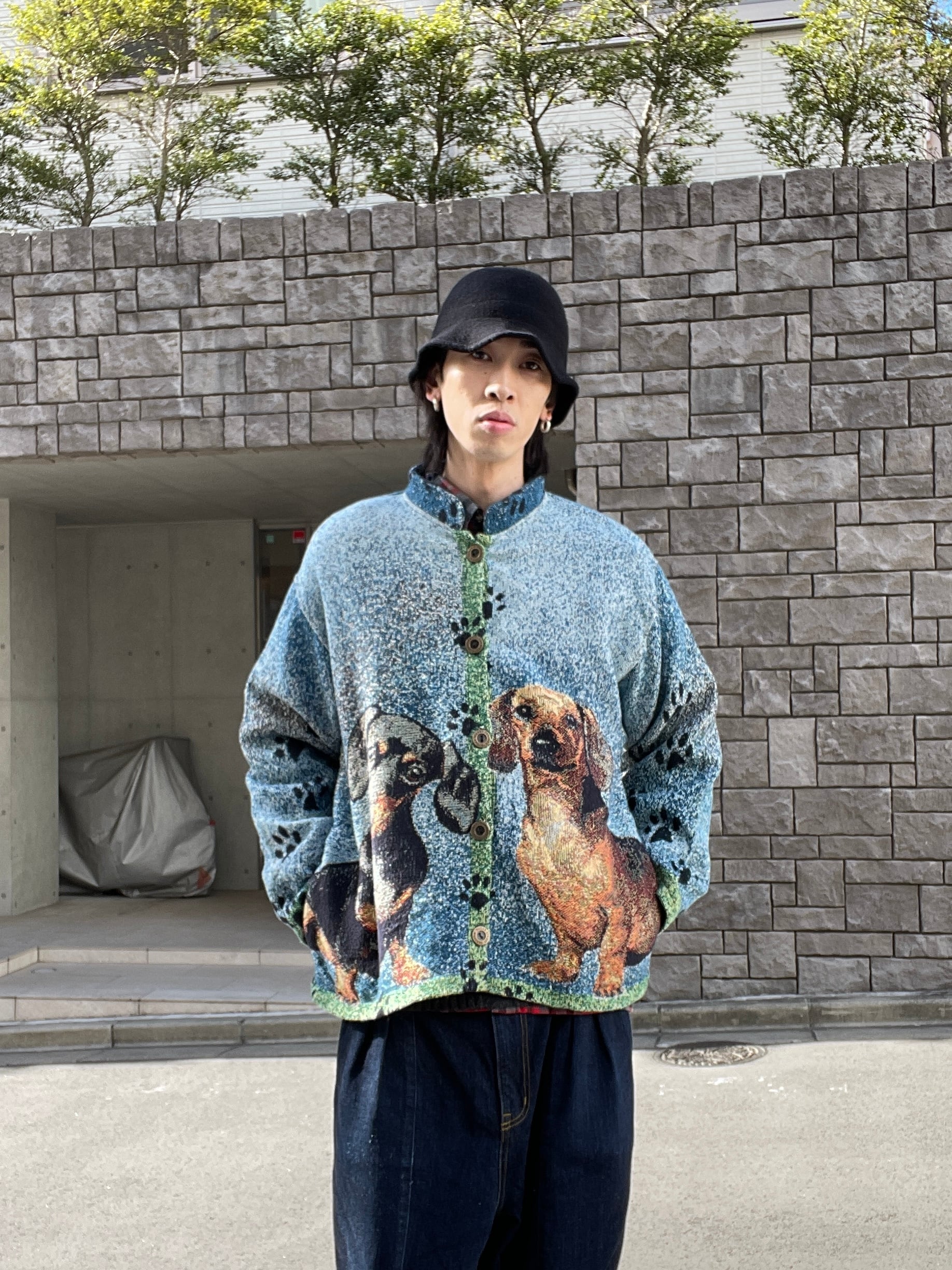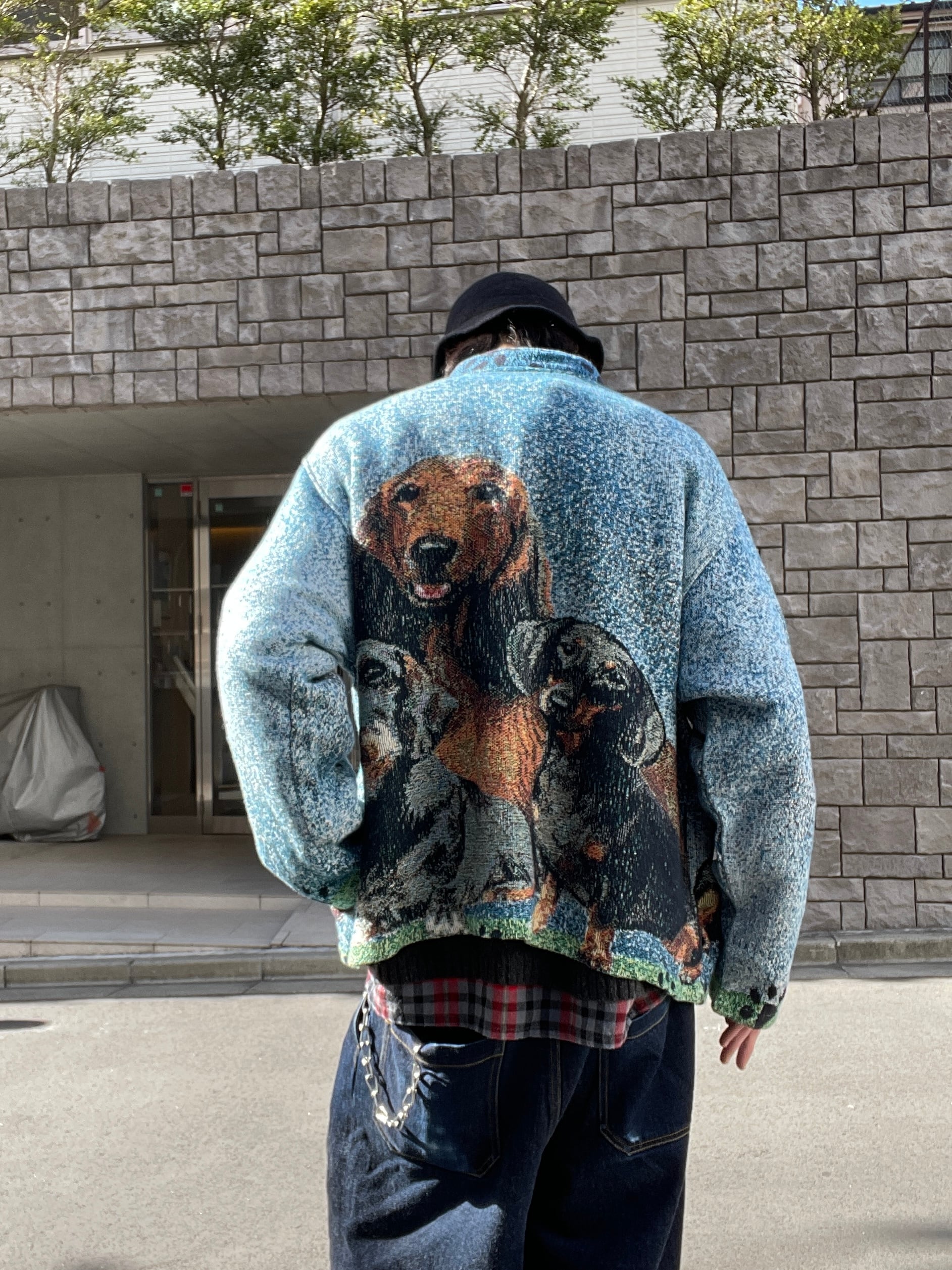 ゴブラン織りの様な織りで、可愛らしい犬の刺繍が施された、ブランケットジャケット。様々な色味の糸で、犬や背景などが上手く表現されています。ポイントで犬の足跡などのデザインもお洒落すぎます。バックはまた違った体勢の犬刺繍。こだわりがしっかりと感じられる魅力的な1着です。程良い丈感にたっぷりめな身幅が今っぽいシルエットになっています。このディテールでUSA製なのも魅力的です。