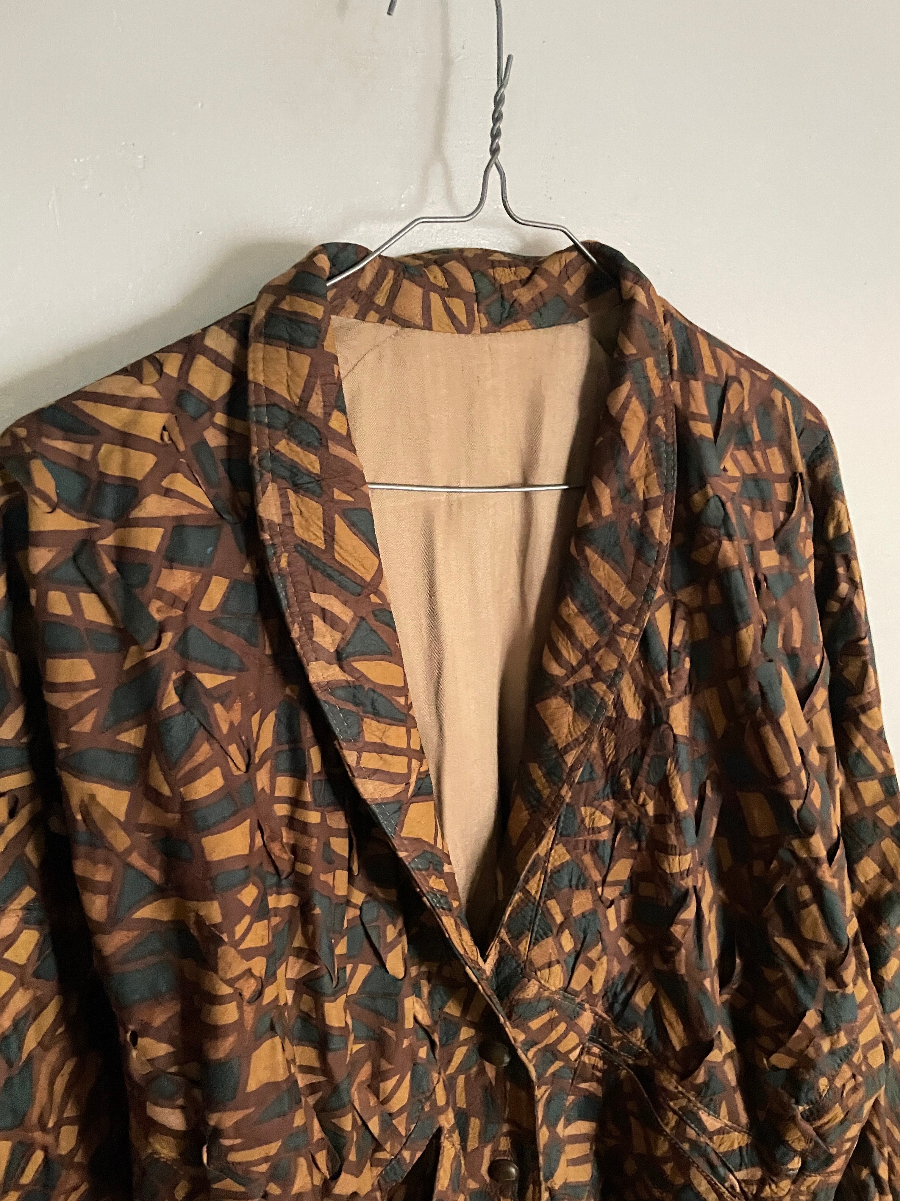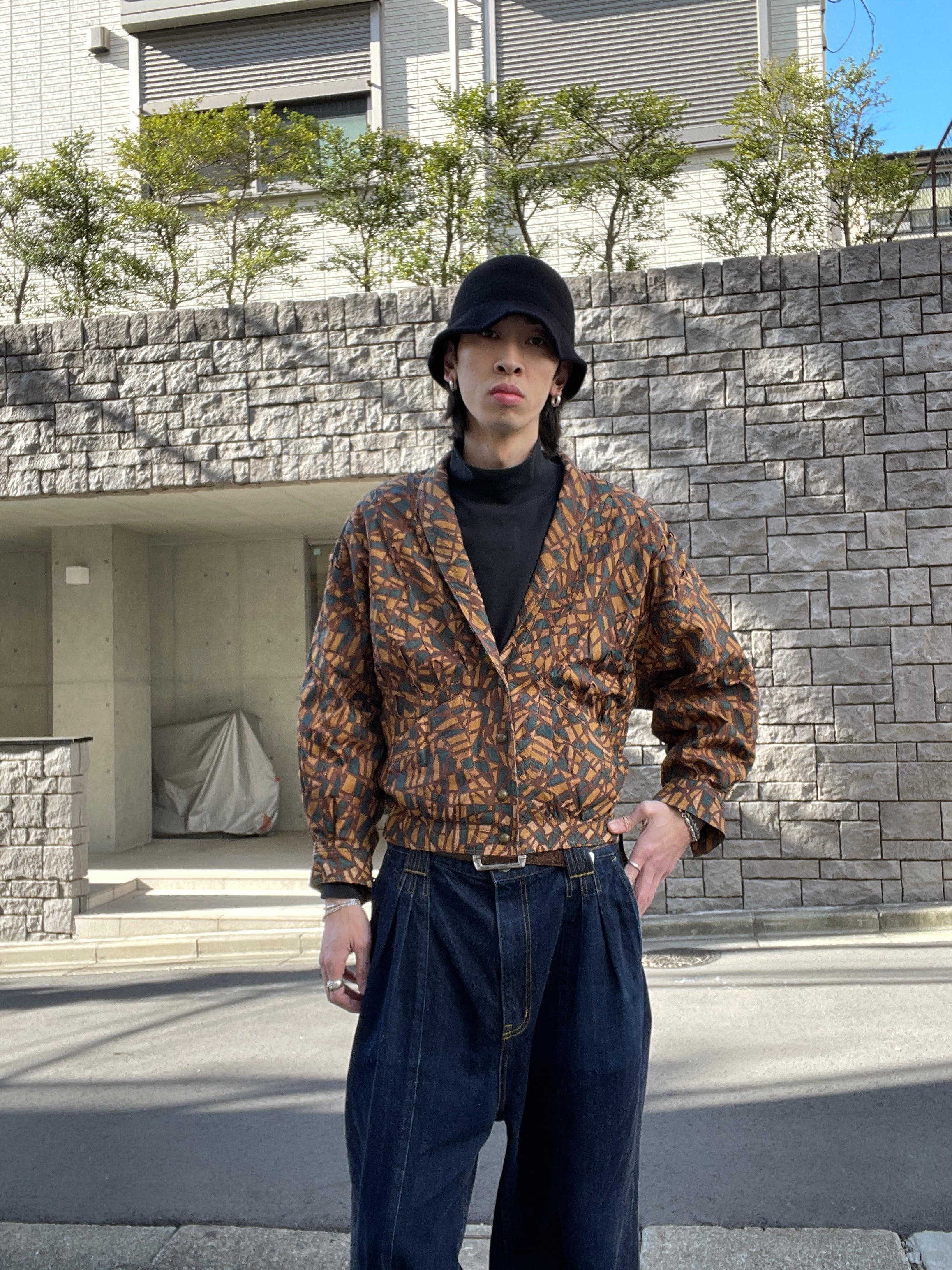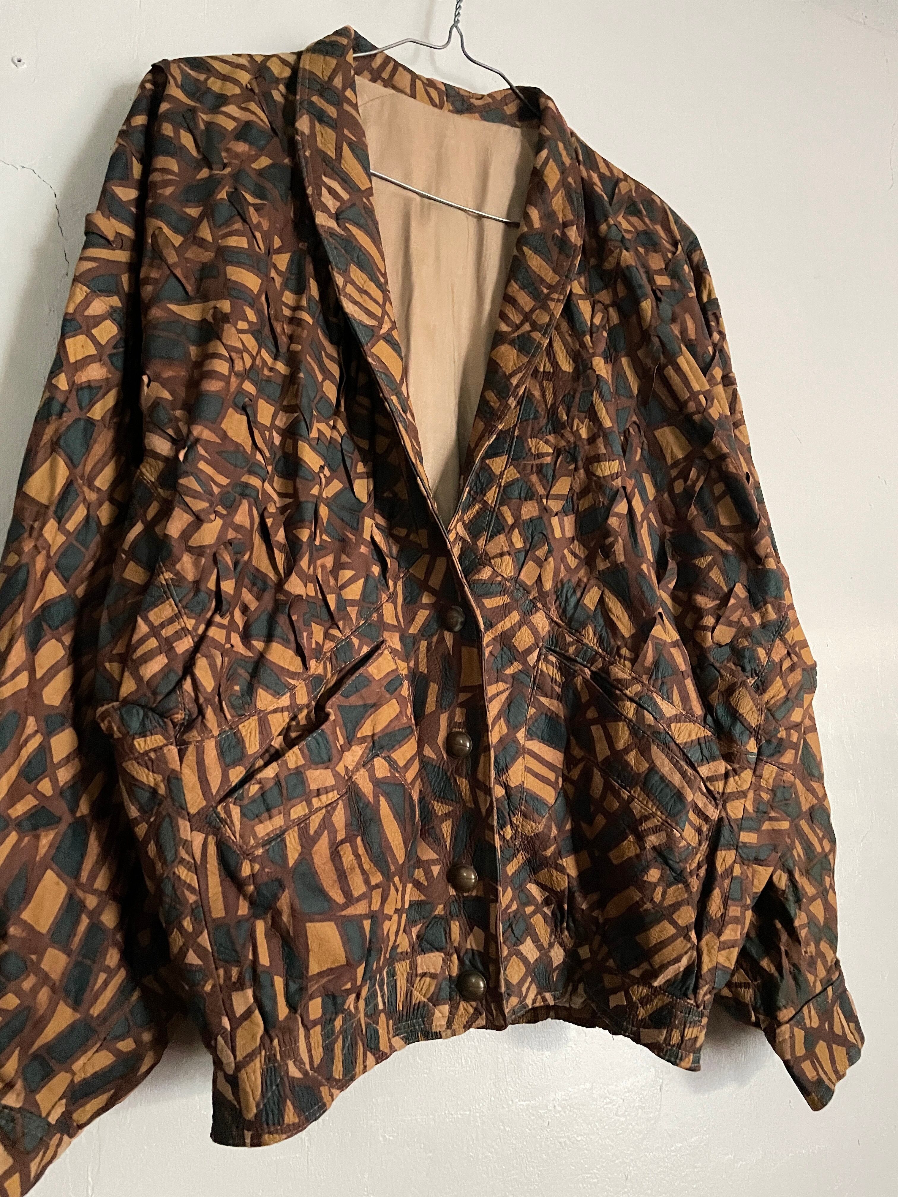 ブラウン、グリーン、イエローの独特な柄デザインから、アート感とレトロな雰囲気が感じられる、レザーショートジャケット。所々にパイピングデザインが施されています。スナップボタンなので、着脱しやすいのも魅力的です。軽めなレザー素材で、シャカシャカとした面白い生地感。間違い無くファッションの主役になってくれるアイテムかと思います。