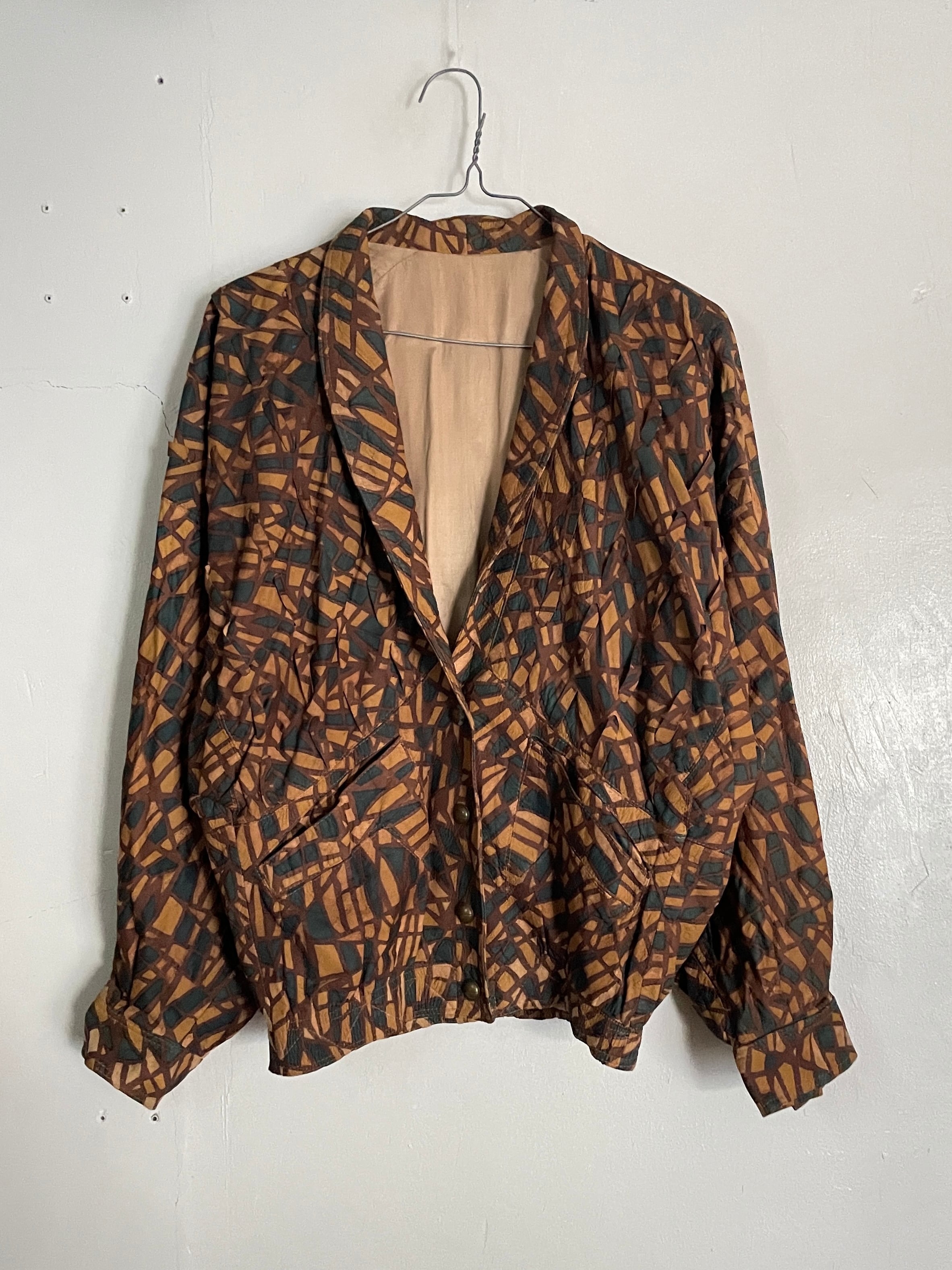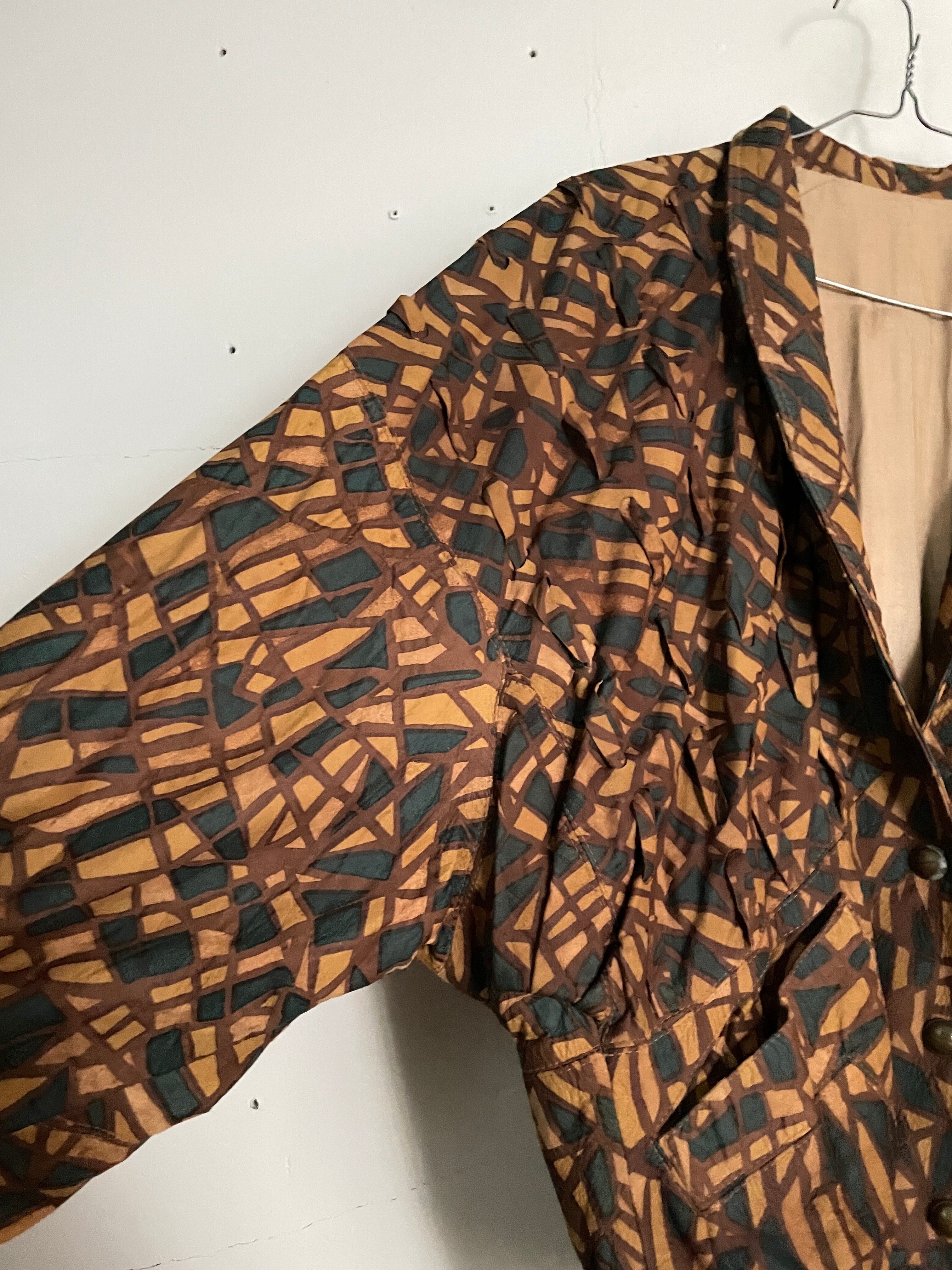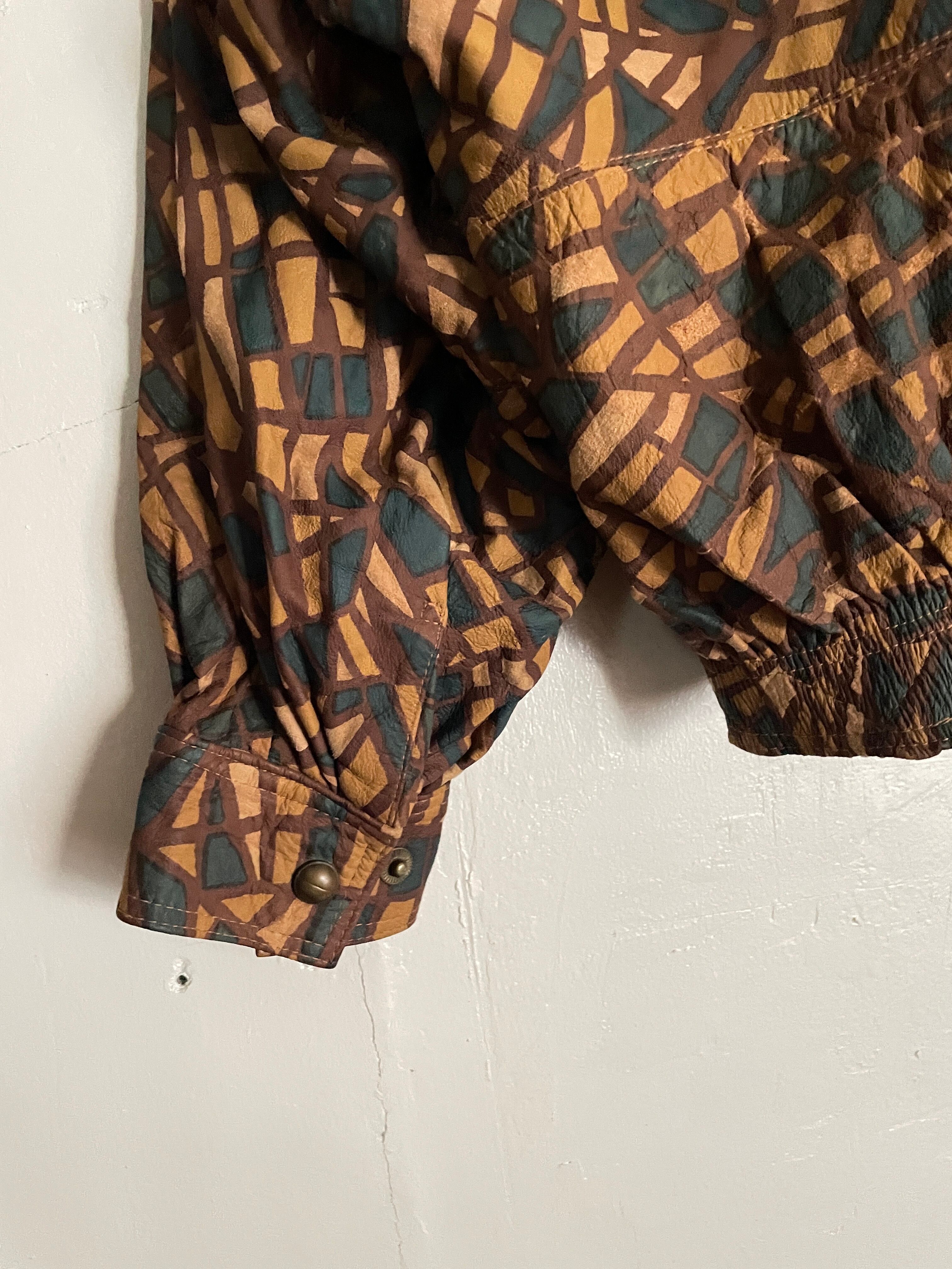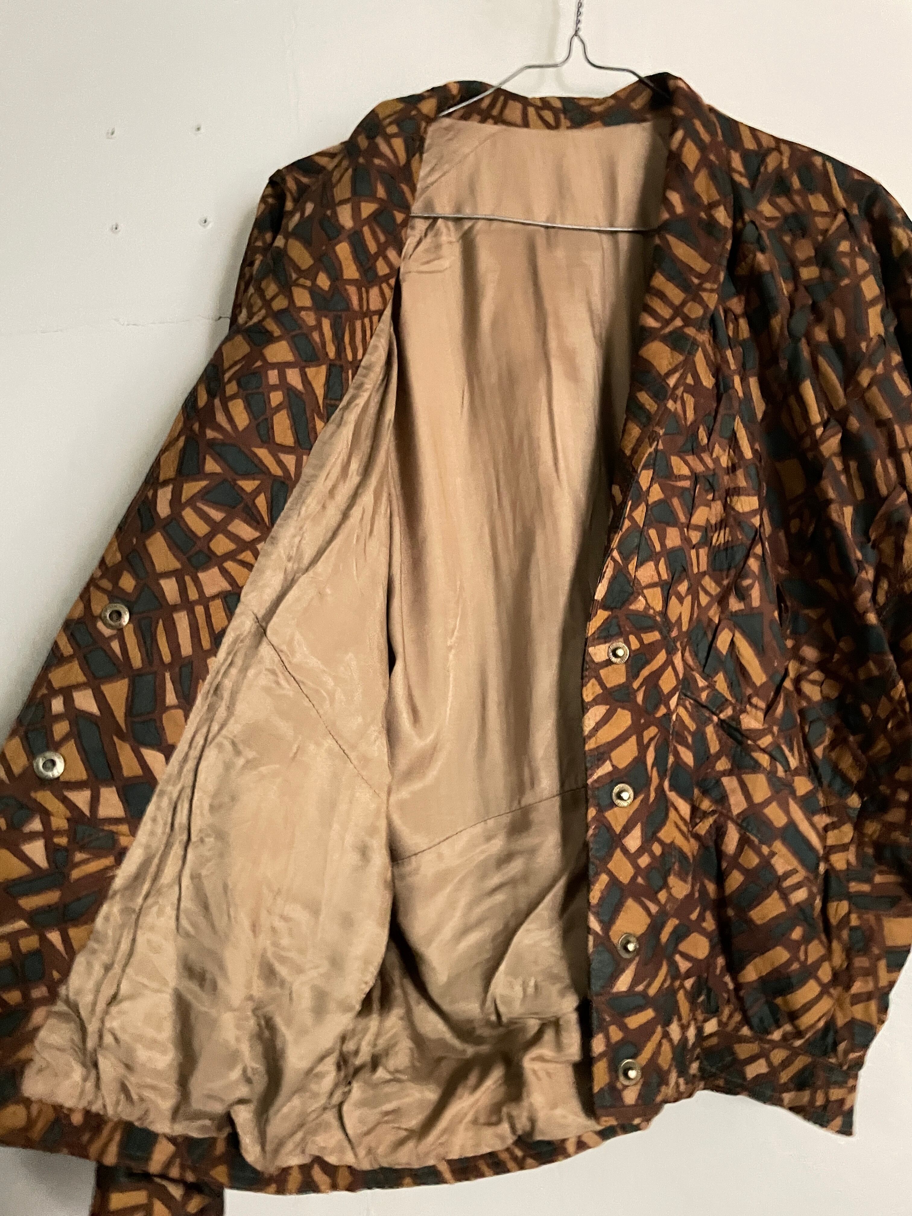 ブラウン、グリーン、イエローの独特な柄デザインから、アート感とレトロな雰囲気が感じられる、レザーショートジャケット。所々にパイピングデザインが施されています。スナップボタンなので、着脱しやすいのも魅力的です。軽めなレザー素材で、シャカシャカとした面白い生地感。間違い無くファッションの主役になってくれるアイテムかと思います。