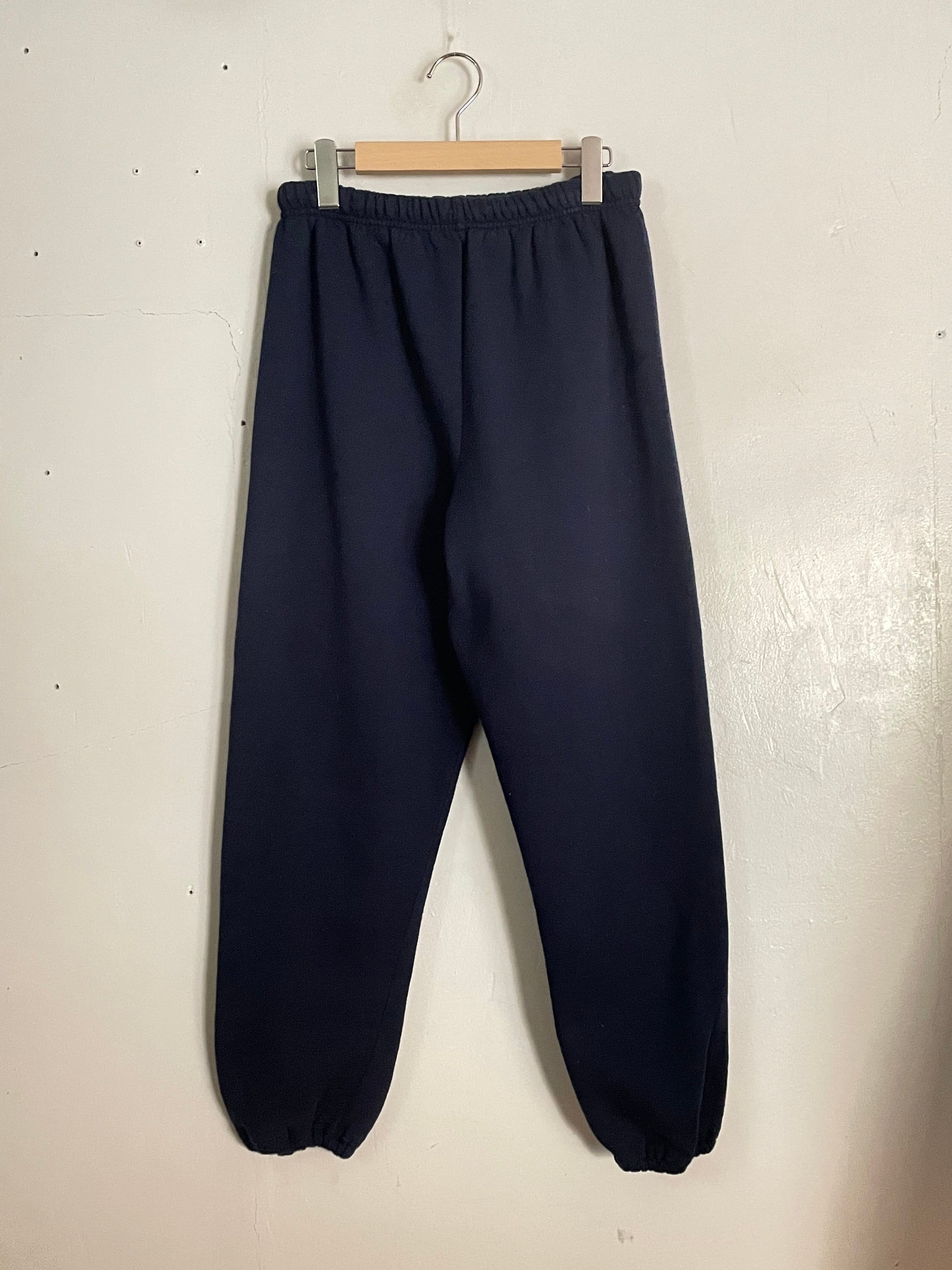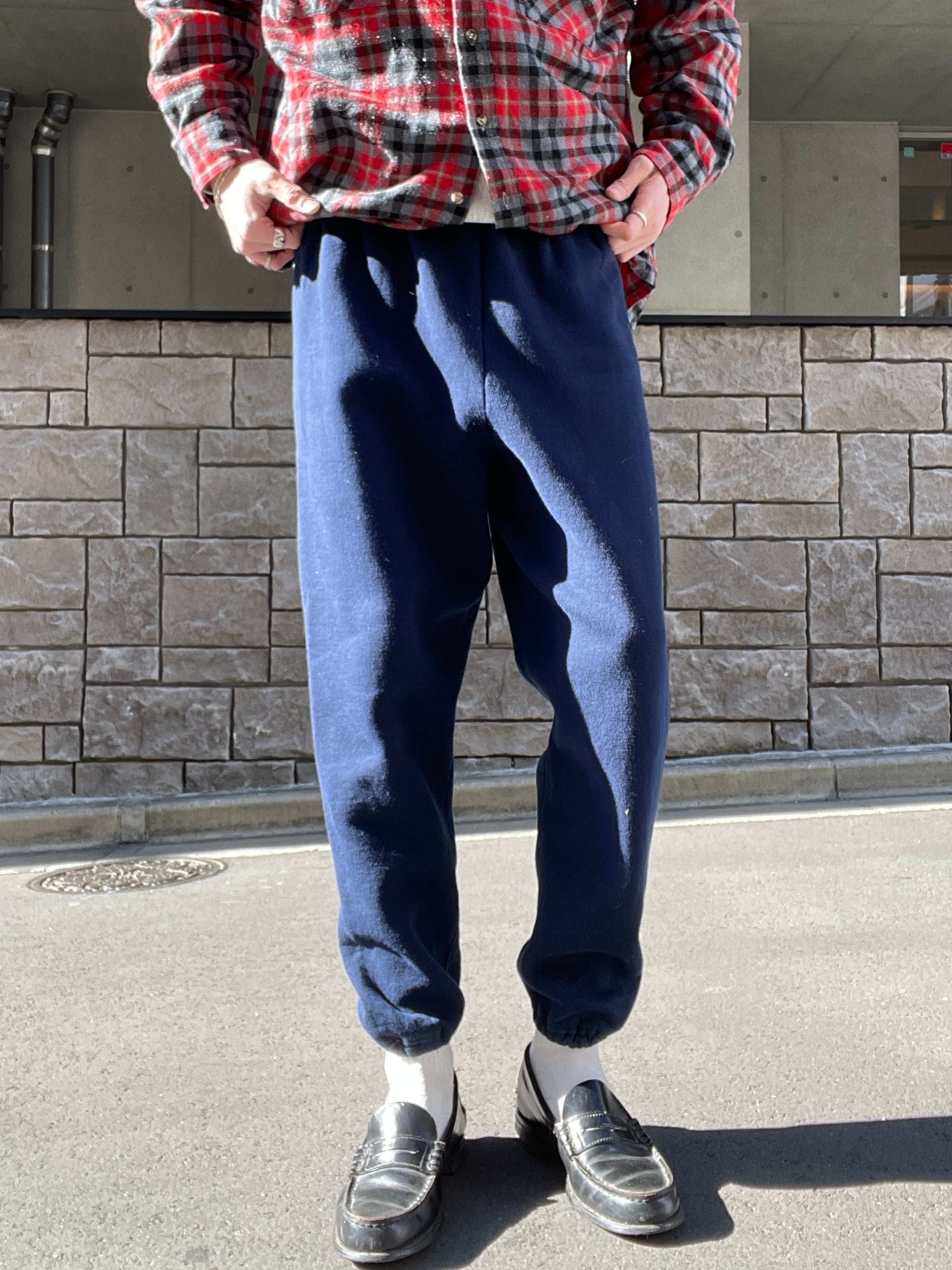 シンプルな無地ネイビーカラーで、楽に履けて、ファッションに良い抜け感を与えてくれる、ラッセルアスレティックのスウェットパンツ。股上深めで、裾には絞りがあるタイプなので、靴にしっかりと溜まってくれそうです。ウエストには紐付きで縛って履くタイプ。一本持っておいて損はしないアイテムです。しっかりとUSA製の一本。