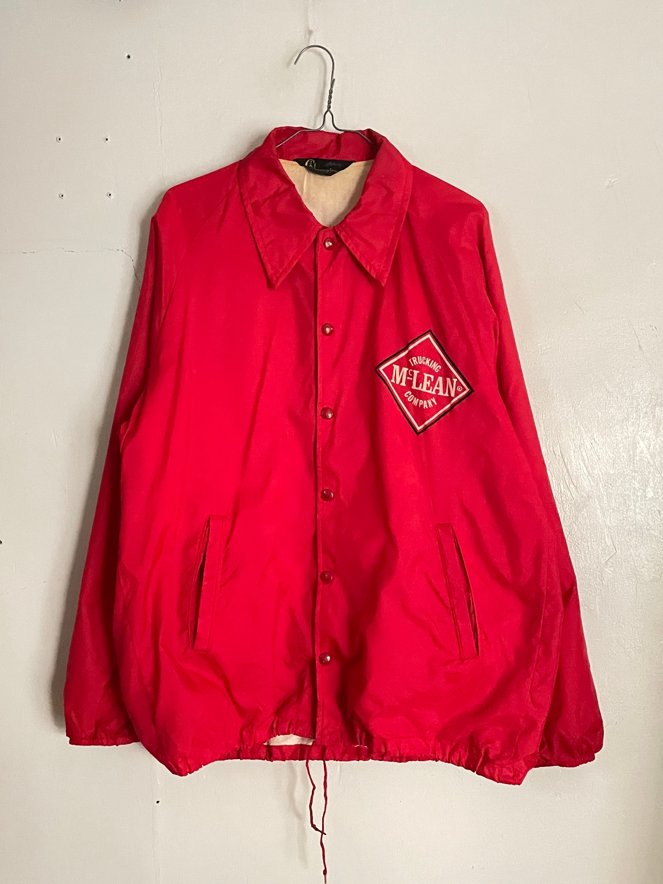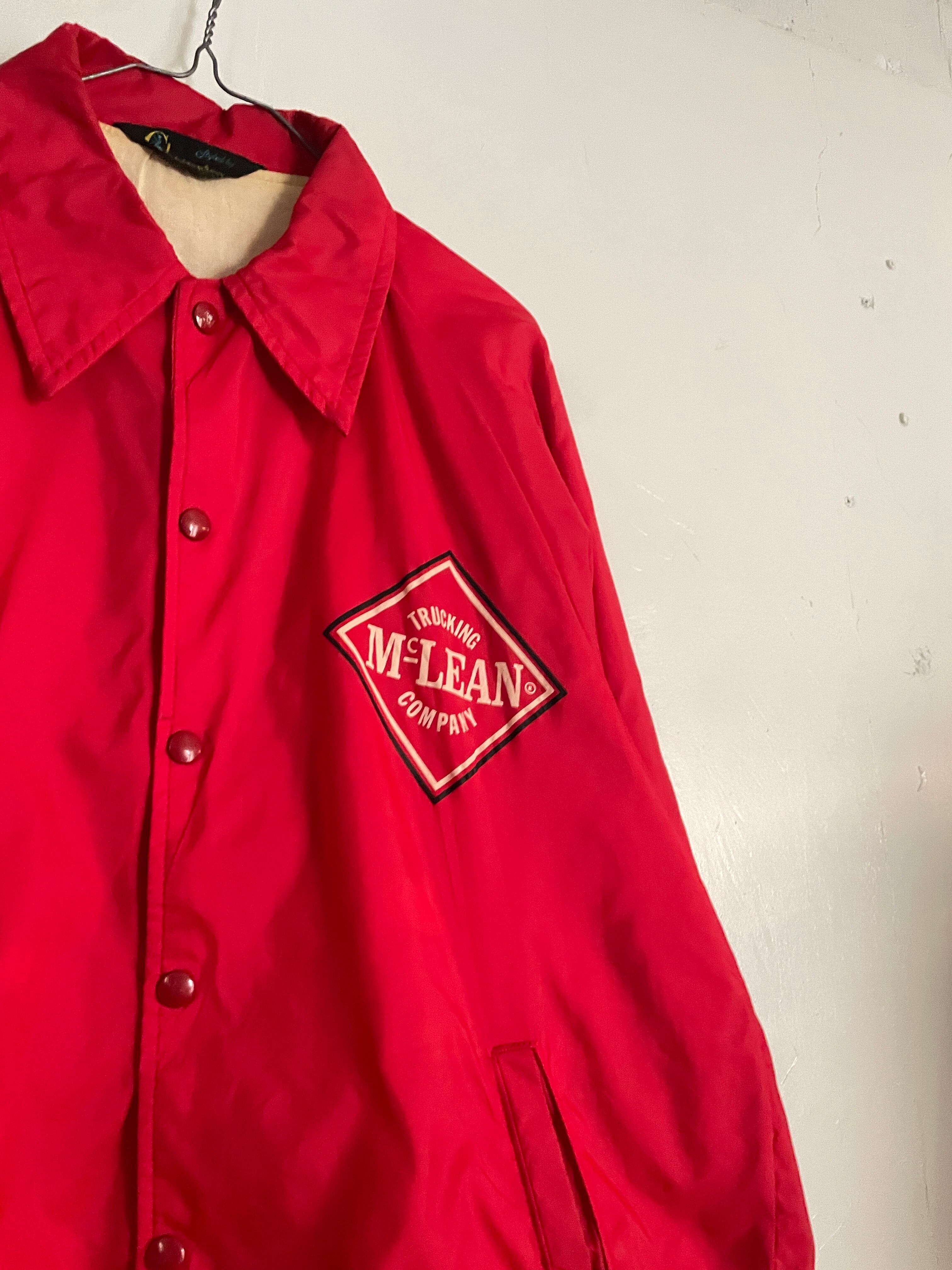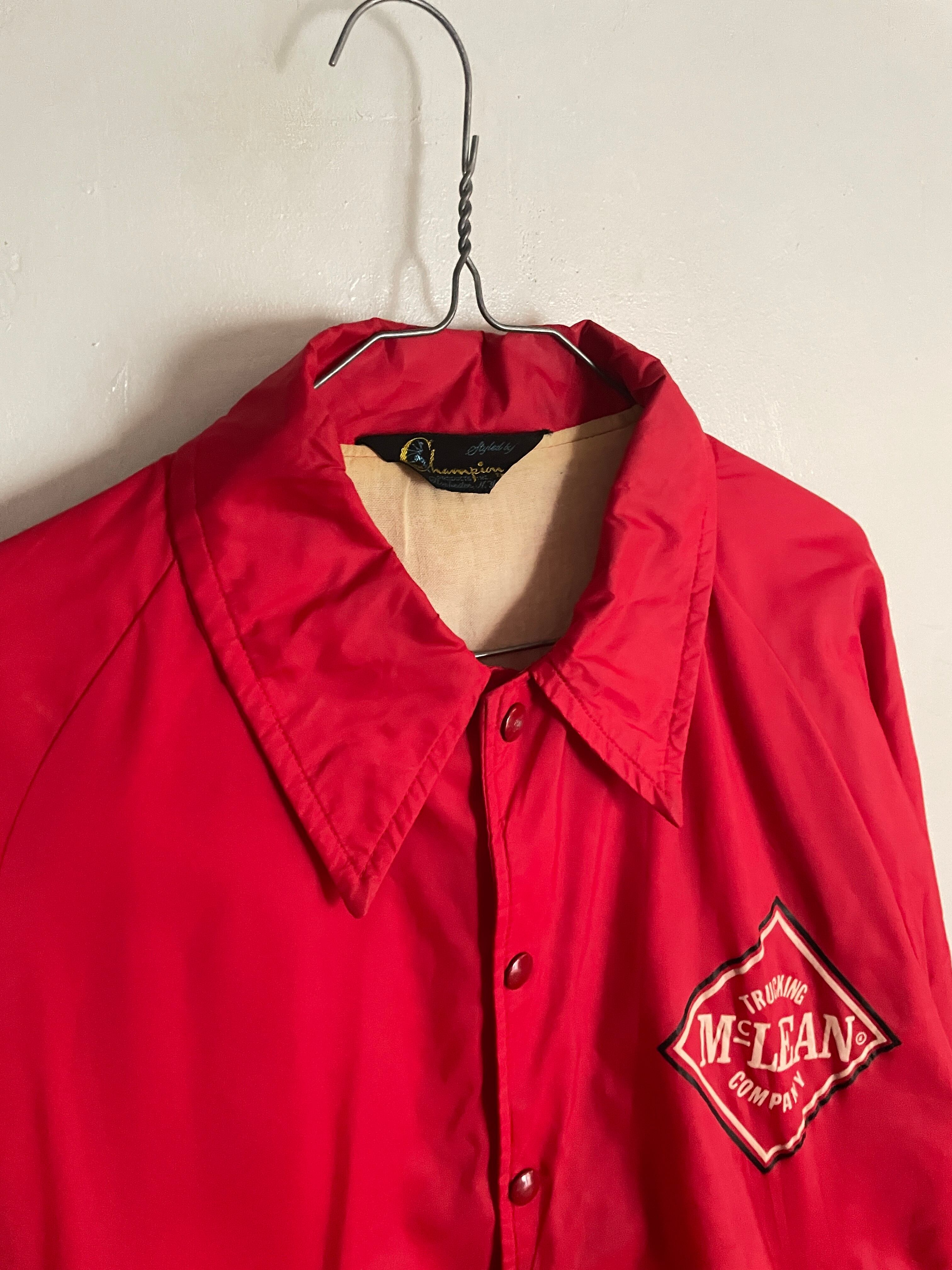 明るめなレッドボディに、マクリーン・トラッキング・カンパニーの企業プリントが施された、チャンピオンのコーチジャケット。タグを見てわかる通り、60年代から70年代ごろのアイテムだといういう事がわかります。通称”ランタグ”です。希少なヴィンテージピースです。コーチジャケットで、大振りな襟は珍しいかと思います。ゆったりとしたサイズ感なので、今の時期にはインナーに着込んでファッションの主役になる1着です。裏地にややダメージが見られますが、あまり気になりません。