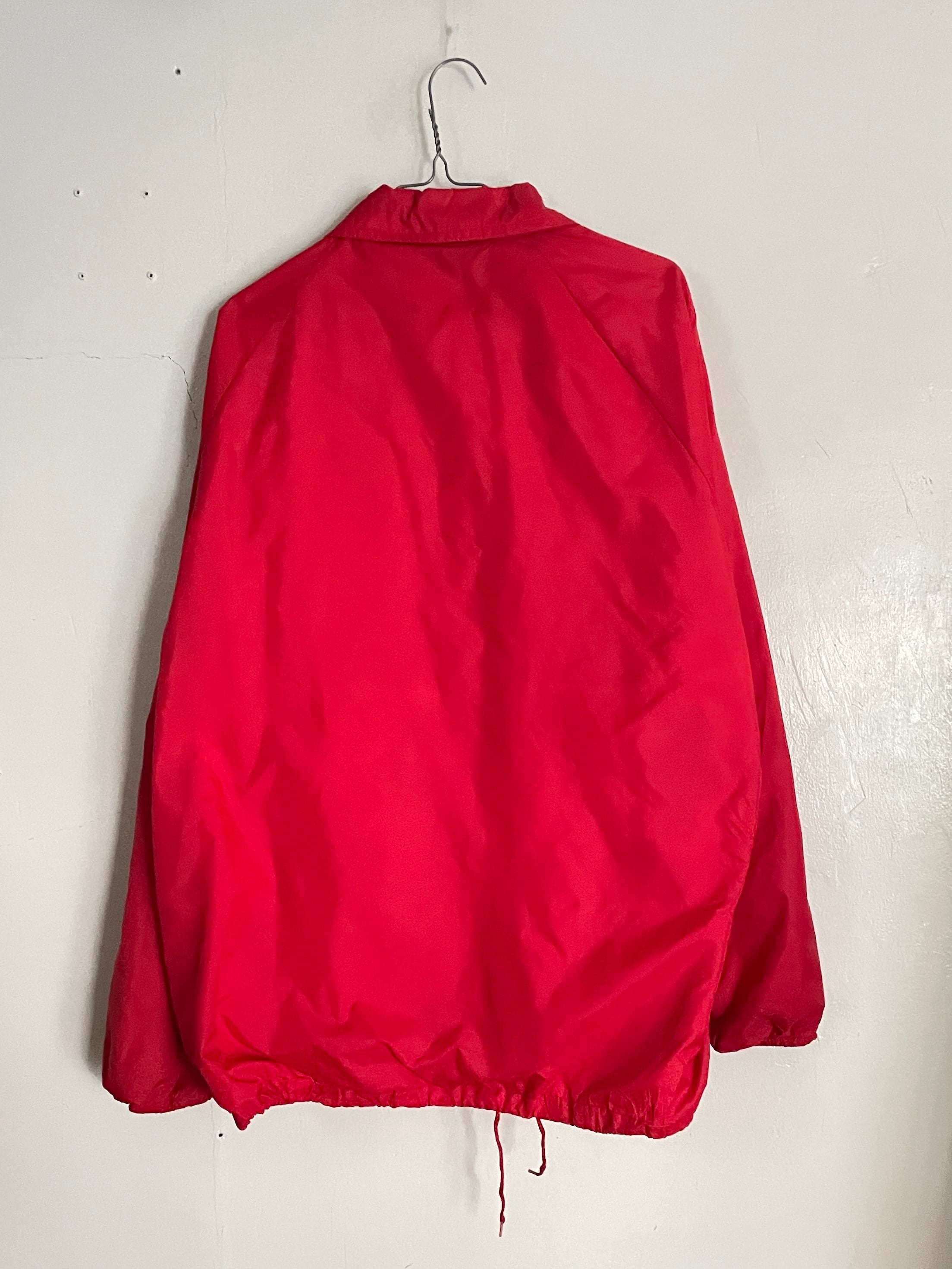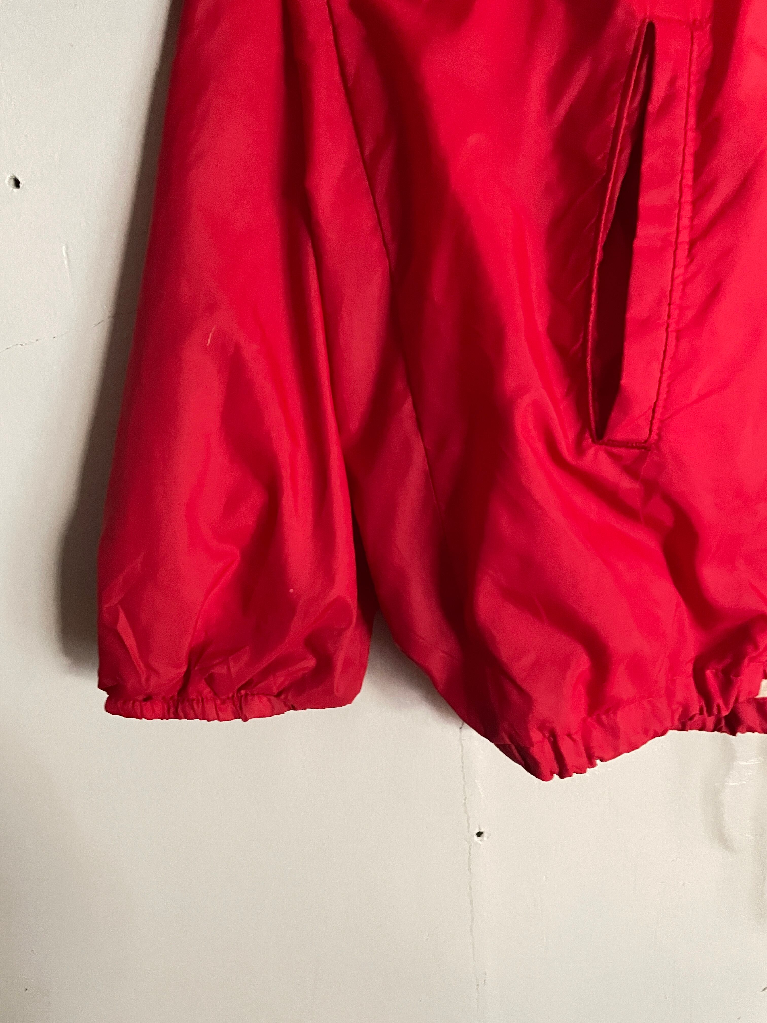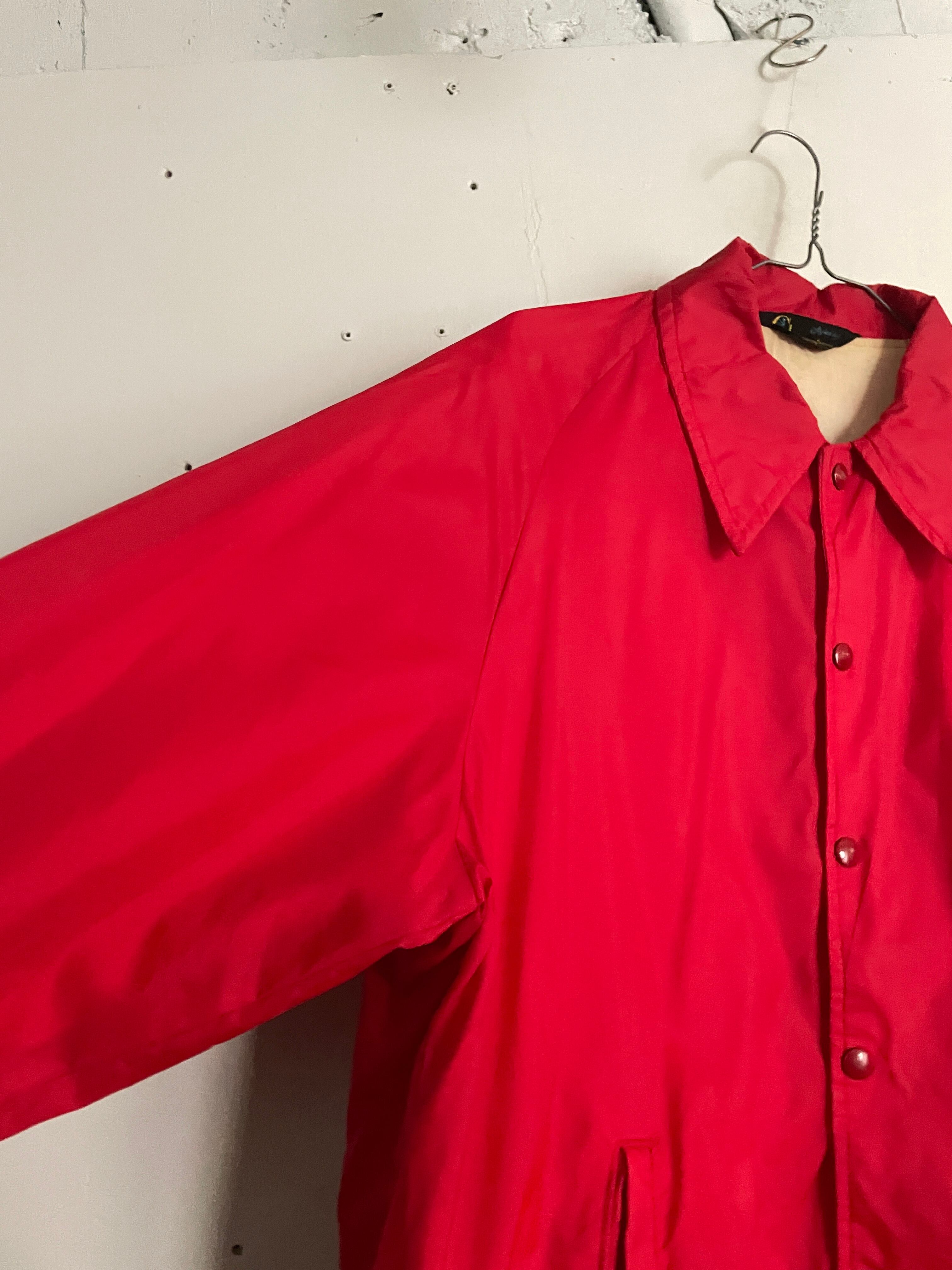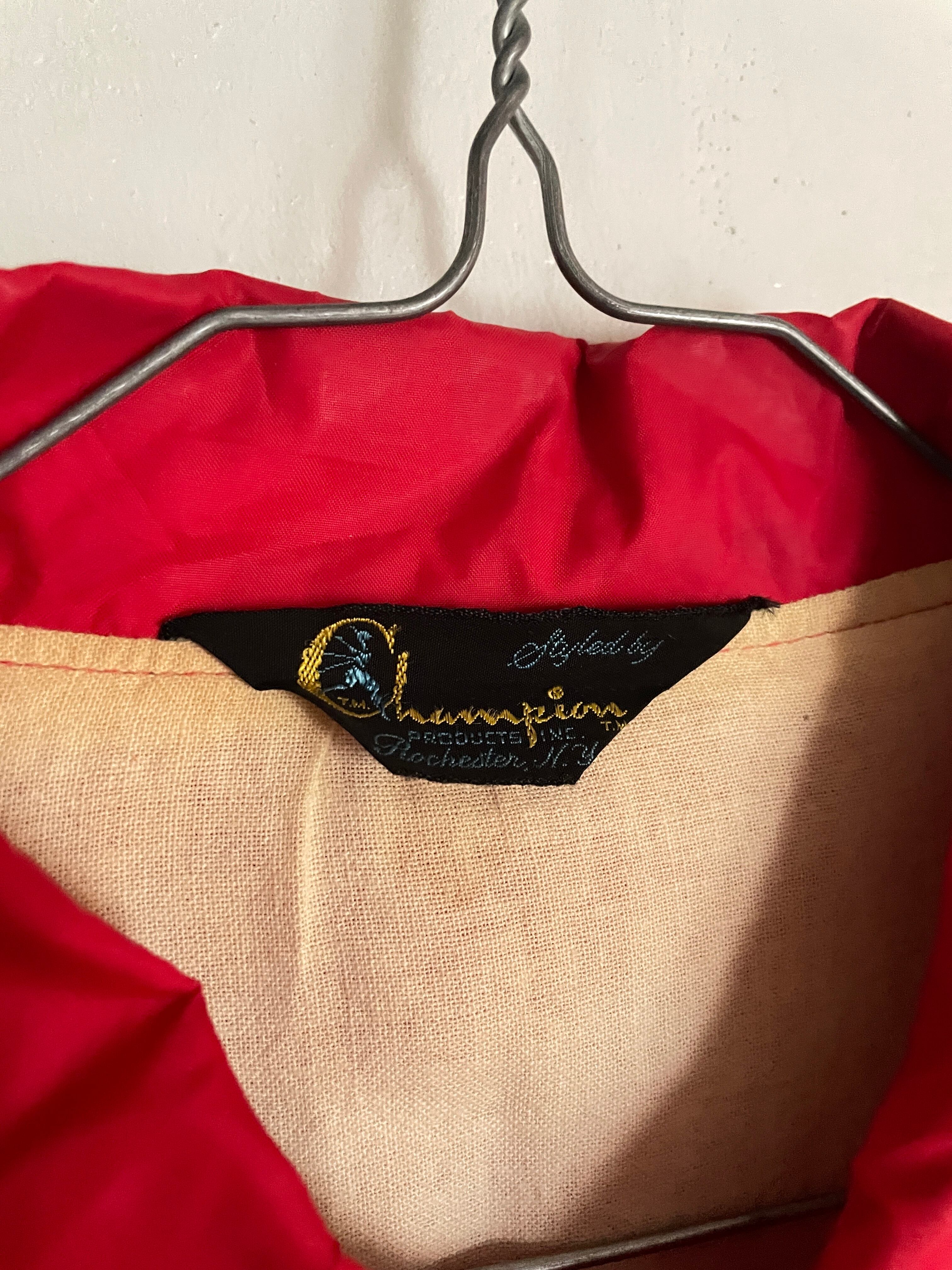 明るめなレッドボディに、マクリーン・トラッキング・カンパニーの企業プリントが施された、チャンピオンのコーチジャケット。タグを見てわかる通り、60年代から70年代ごろのアイテムだといういう事がわかります。通称”ランタグ”です。希少なヴィンテージピースです。コーチジャケットで、大振りな襟は珍しいかと思います。ゆったりとしたサイズ感なので、今の時期にはインナーに着込んでファッションの主役になる1着です。裏地にややダメージが見られますが、あまり気になりません。