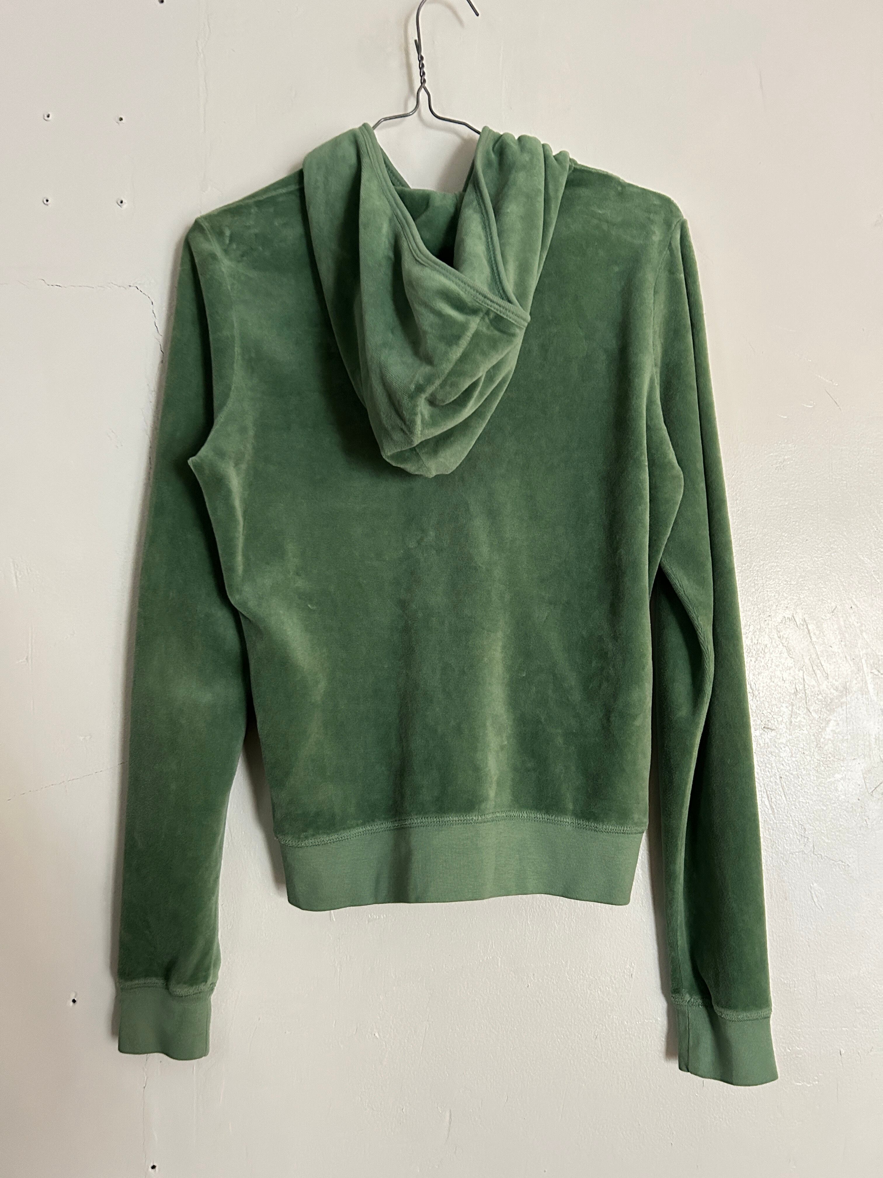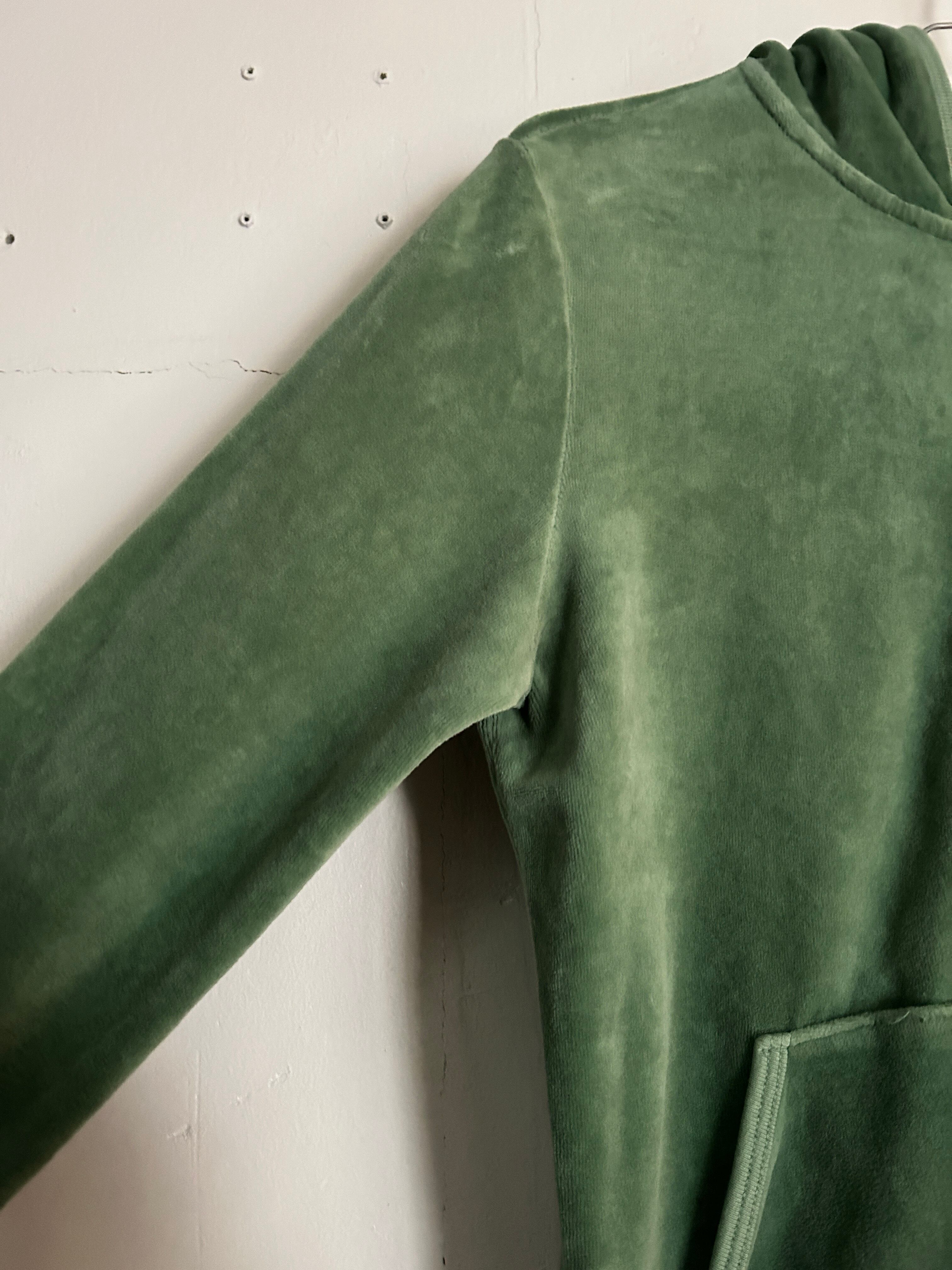 なめらかなベロア素材のジップアップフーディ。落ち着いたグリーンカラーで、シンプルながらも程よく存在感があります。羽織りでもトップスとしてもさらっと使える軽さが魅力的!