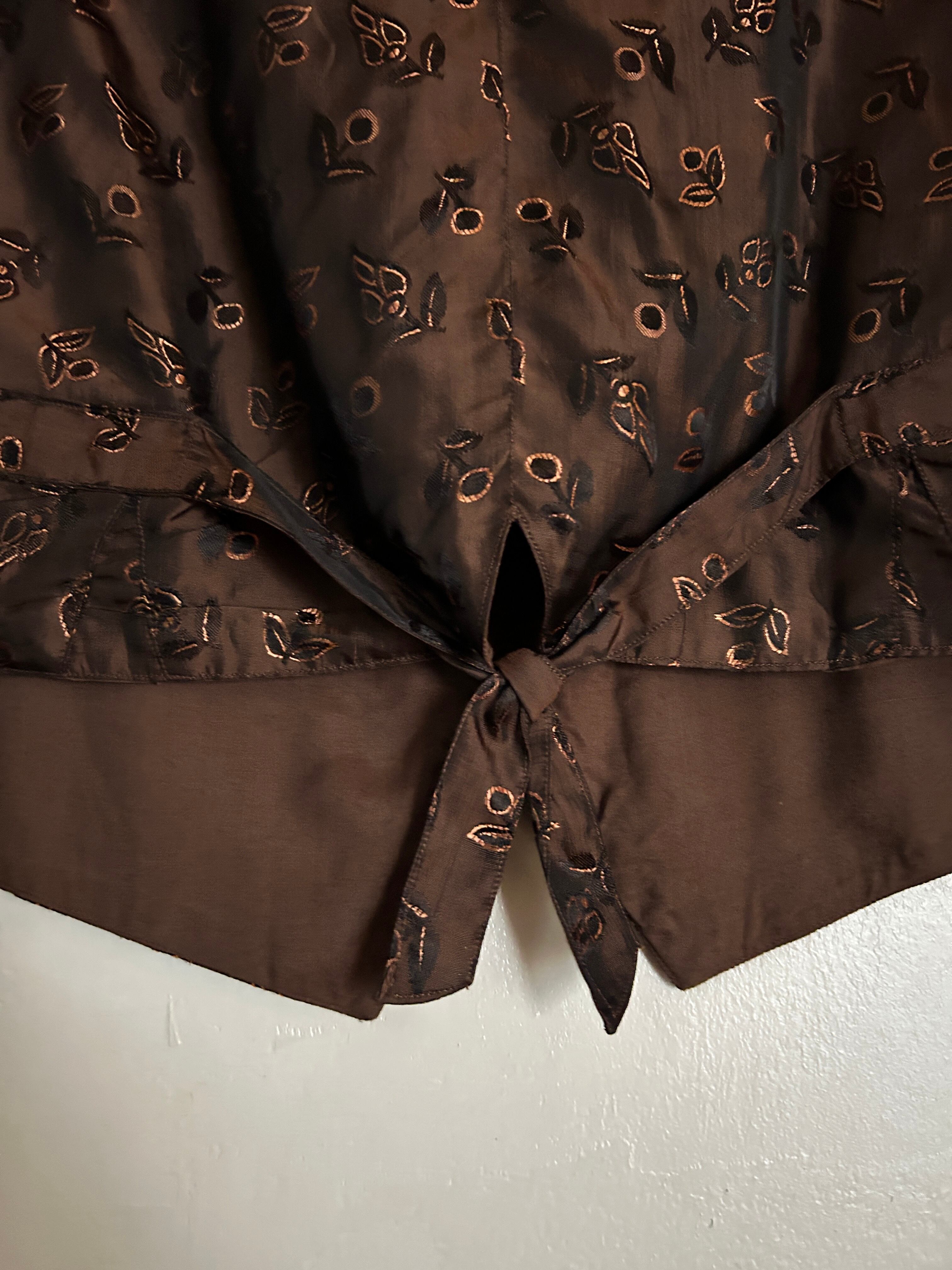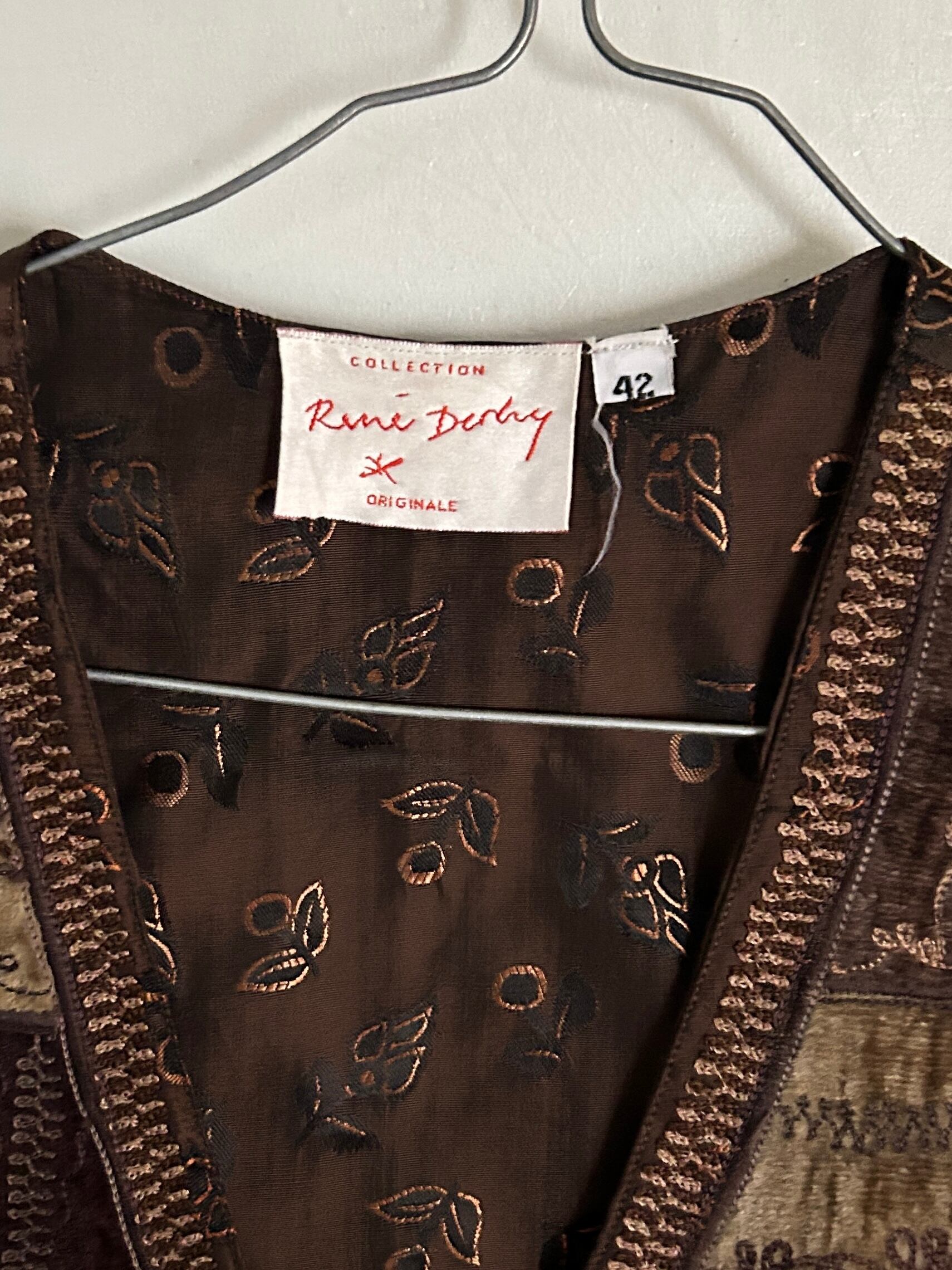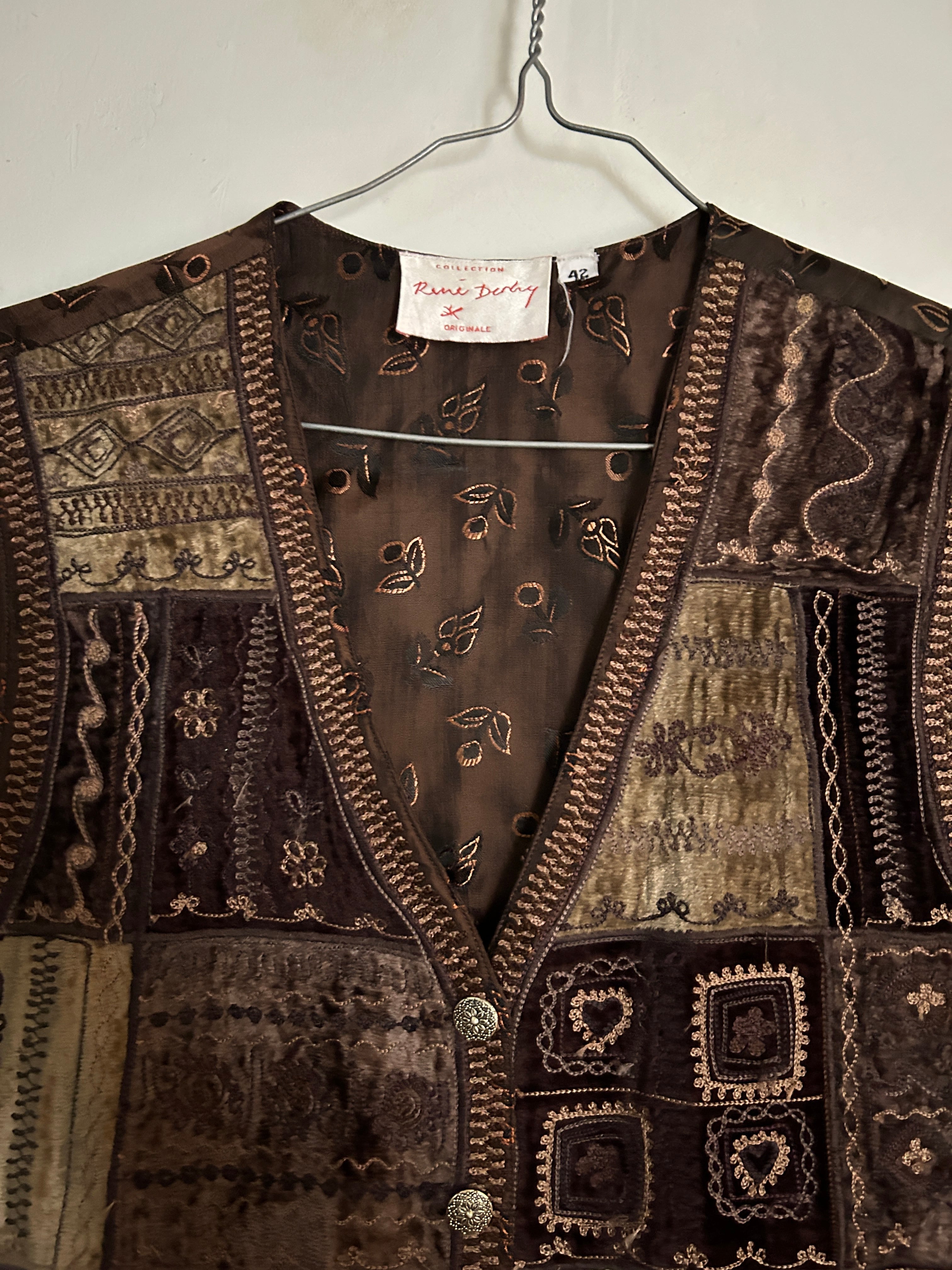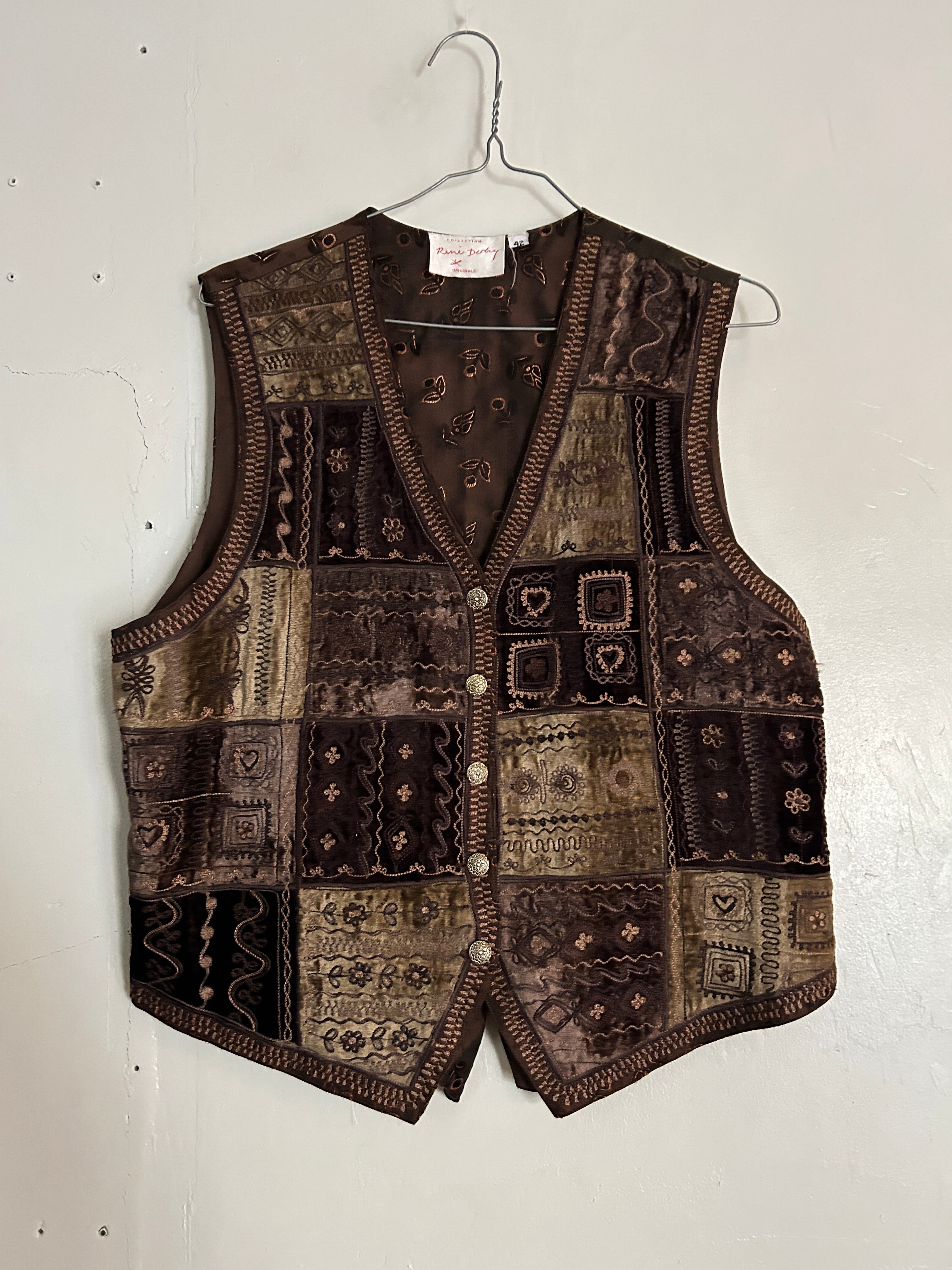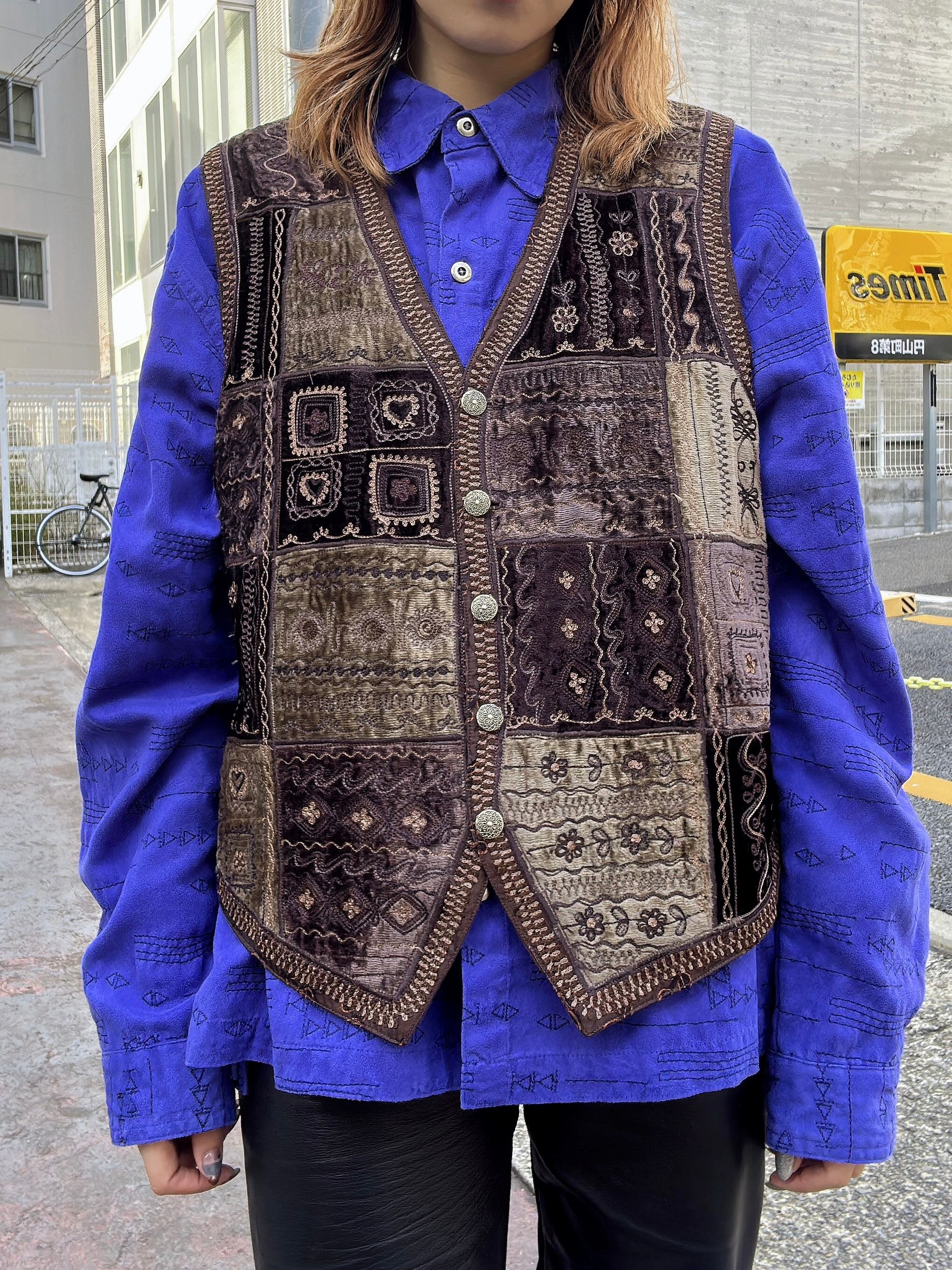 落ち着いたブラウン系カラーでまとめられた、刺繍パッチワークデザインのベスト。ひとつひとつ表情の違う生地を組み合わせた個性的な一枚。Tシャツやシャツ、ワンピースなど季節を問わずレイヤードを楽しめます!
