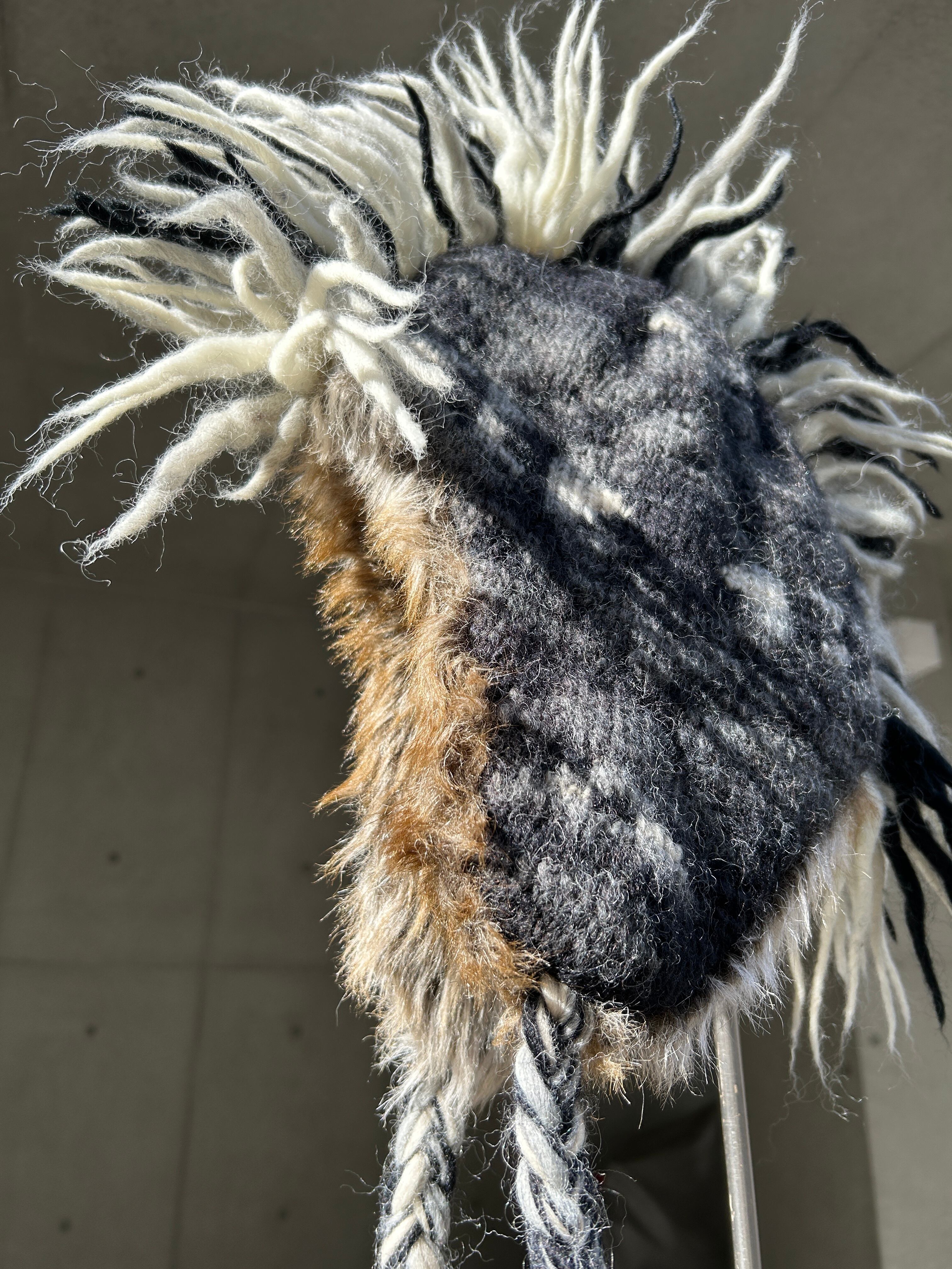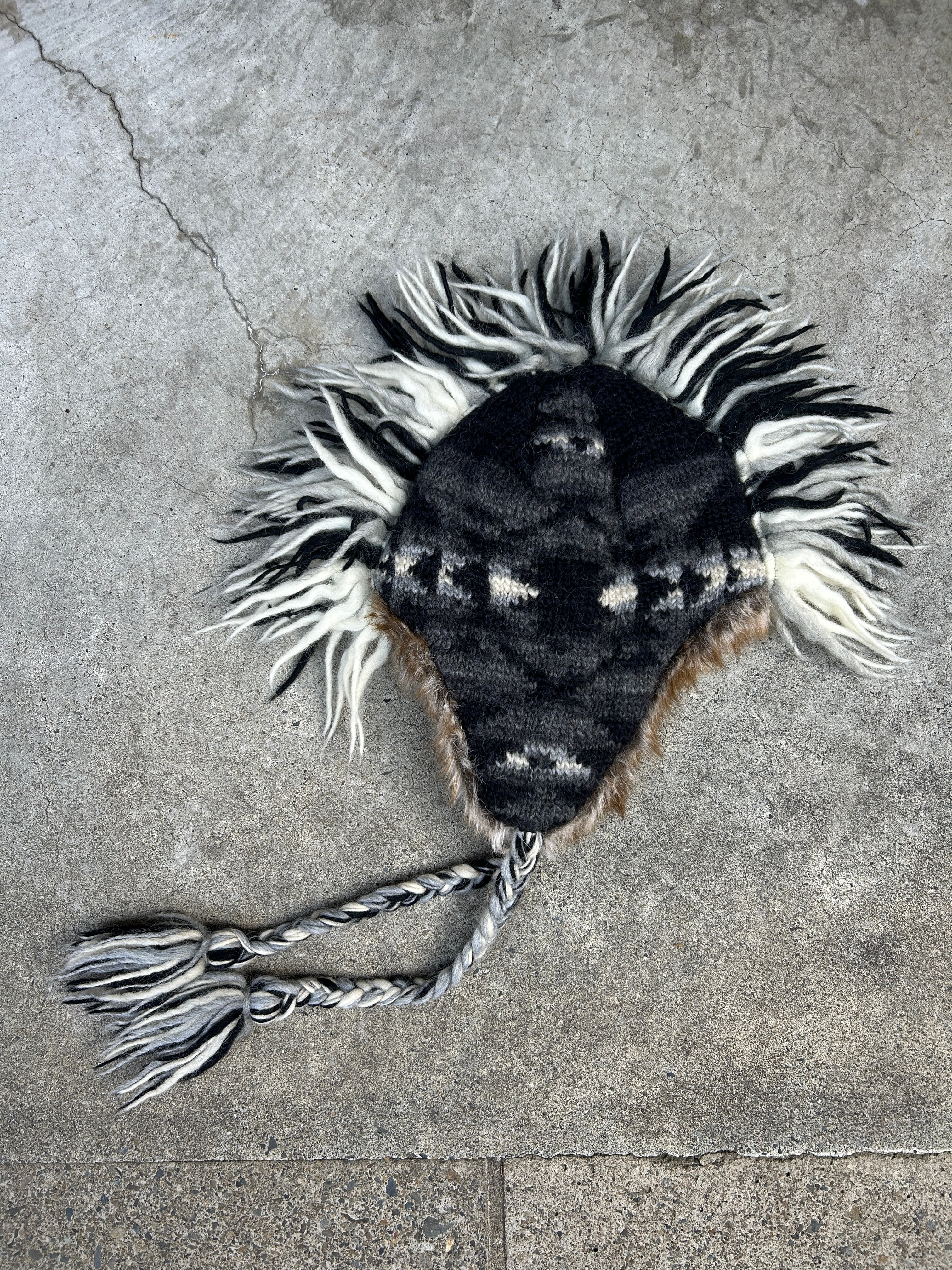 モヒカンのようなフリンジデザインが目を惹く、パンキッシュな雰囲気漂うイヤーフラップニットキャップ。中はファーとフリース素材で、耳当てもあるので温かい且つ、個性的でおしゃれなデザインです。
