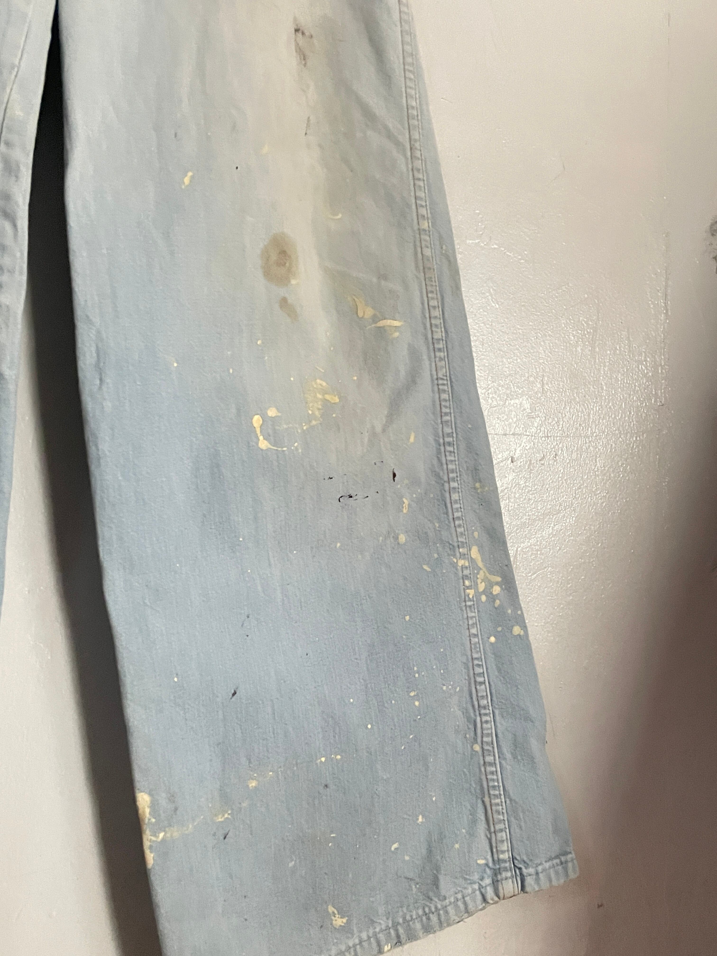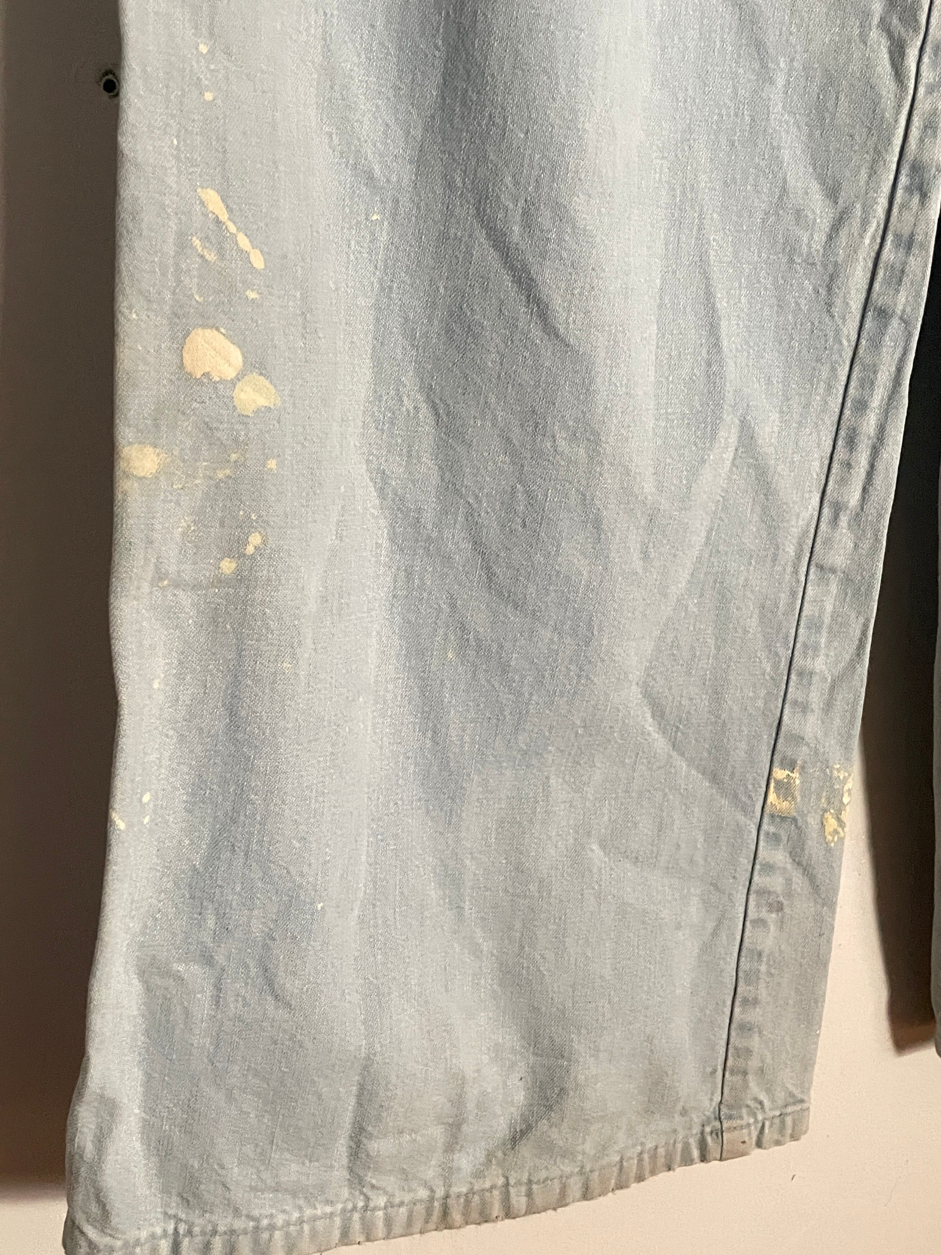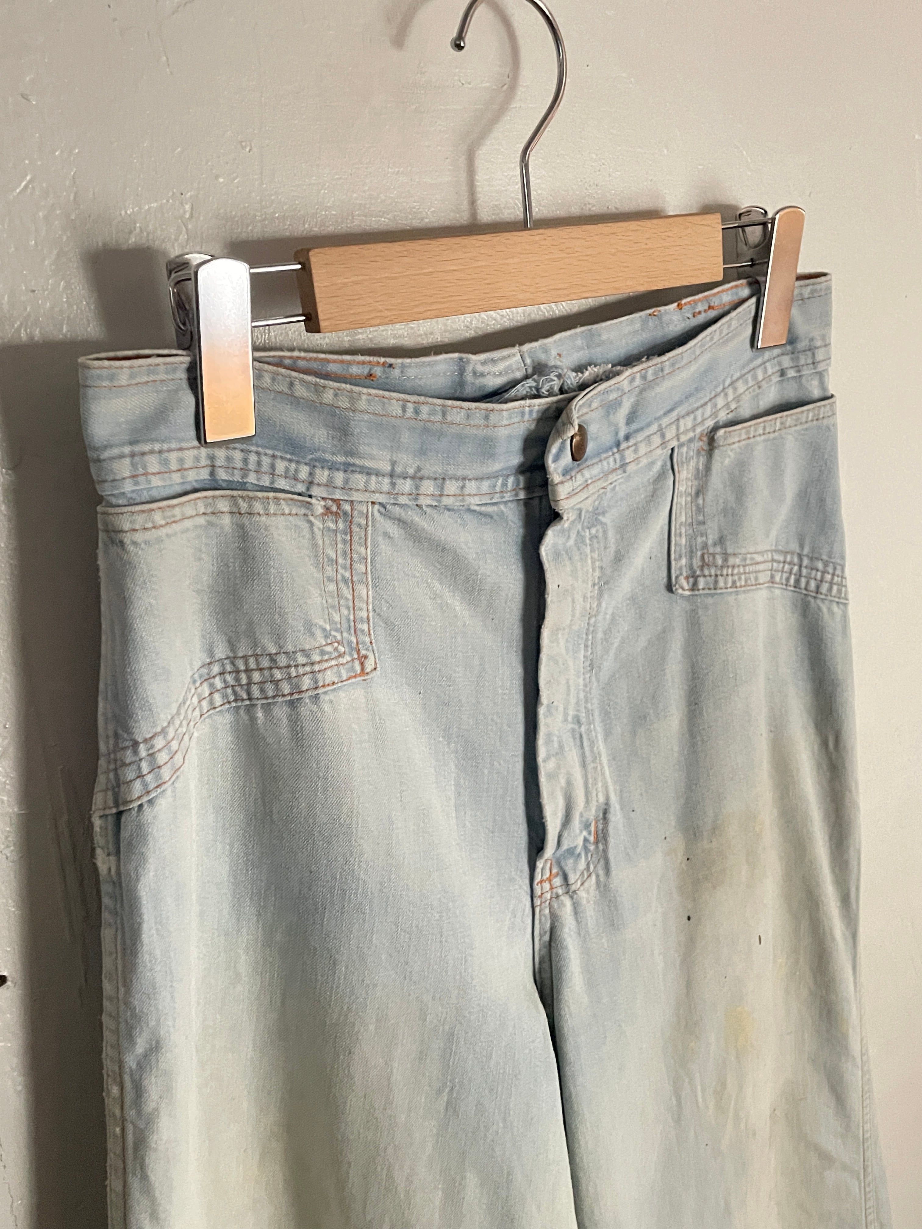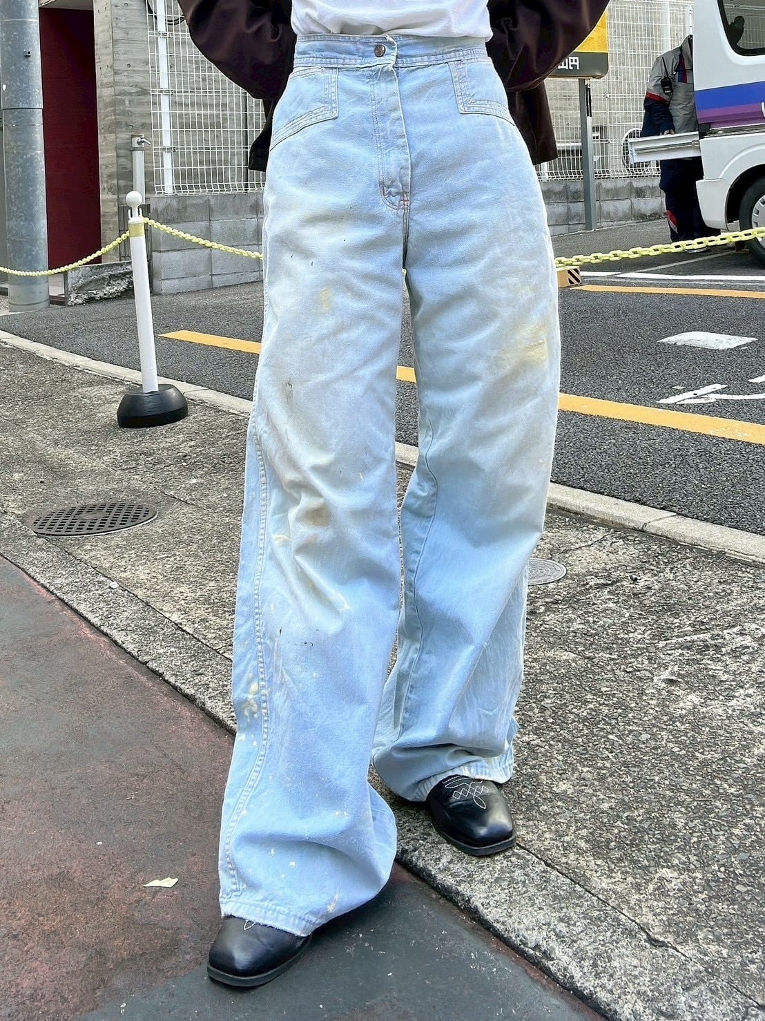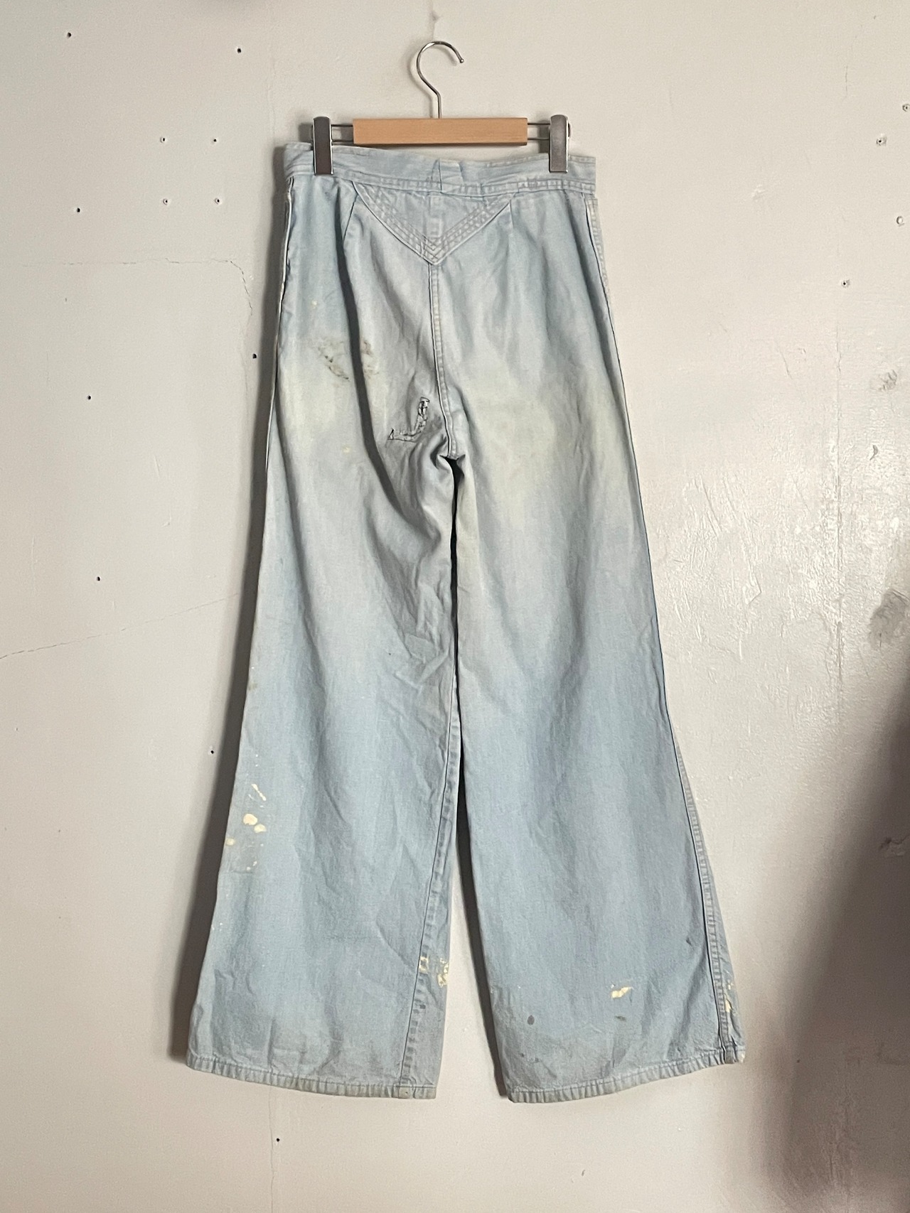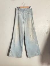 薄く色落ちしたカラーで、ペイントやリペアデザインが施された、ベルボトム。裾にかけて広く広がったシルエットが特徴的です。70年代の雰囲気がガッツリと感じられます。ジップは42タロンで、希少なヴィンテージアイテムになっています。ポケットのデザインなども珍しいです。ファッションの主役になってくれるボトムスです。