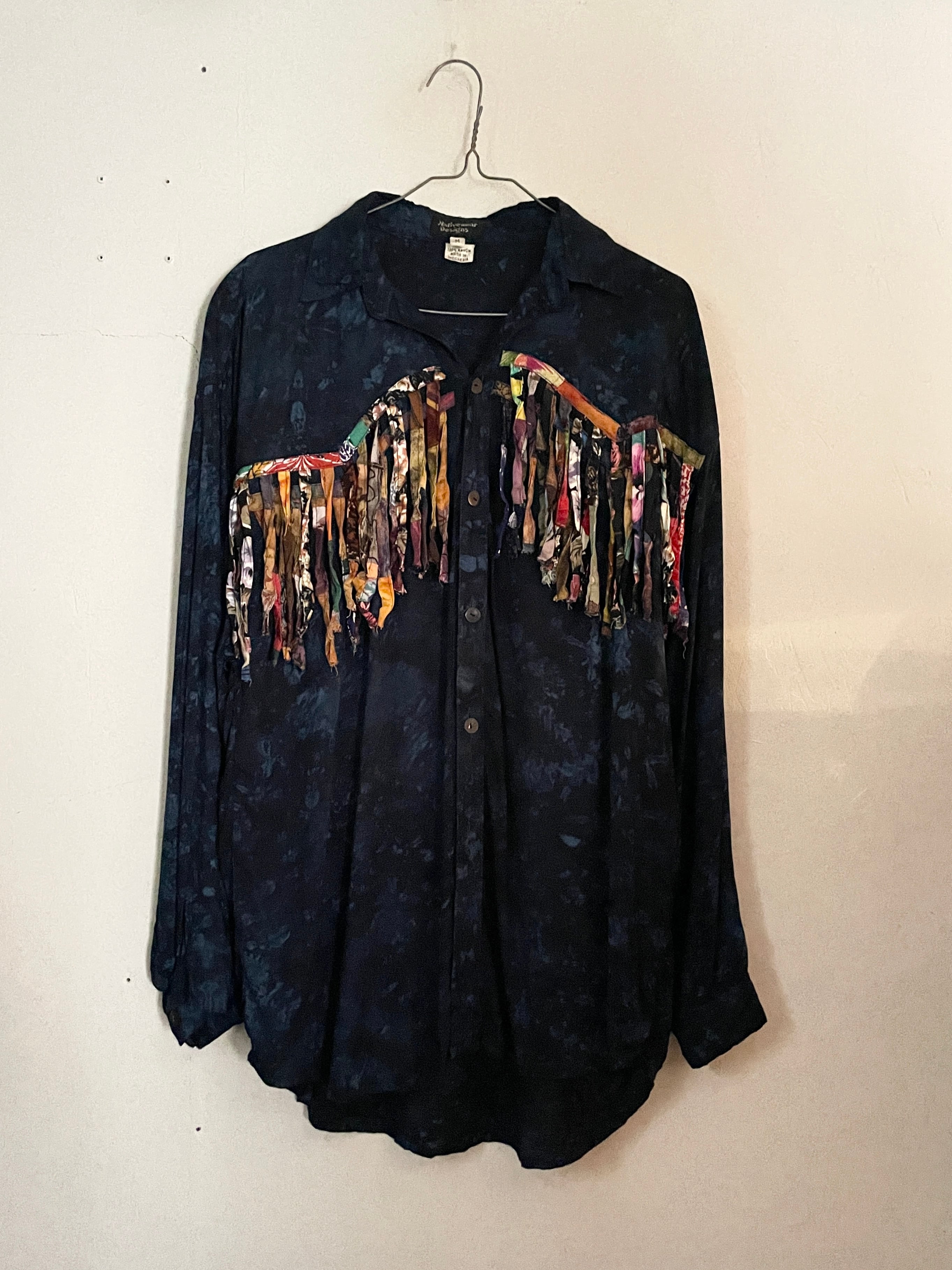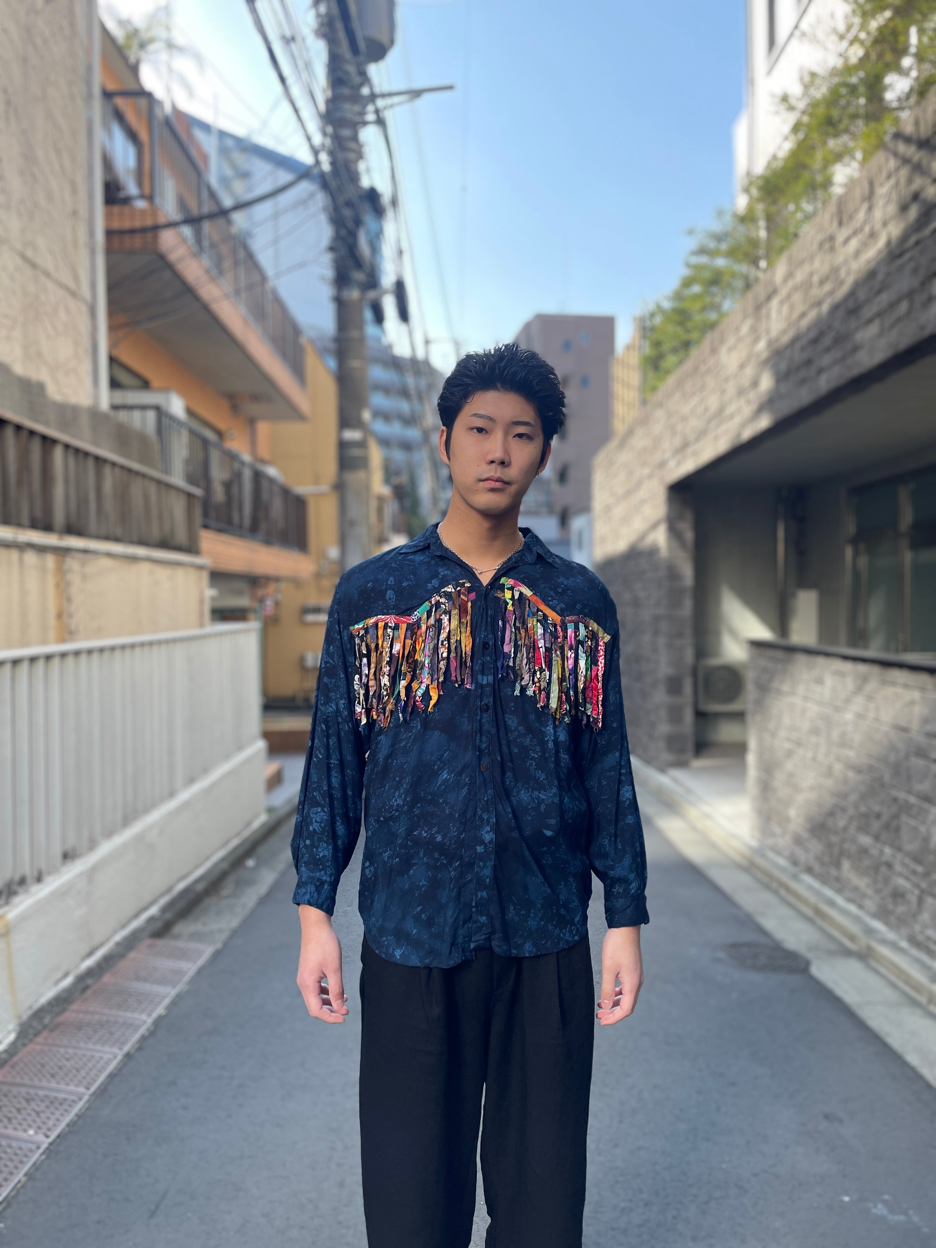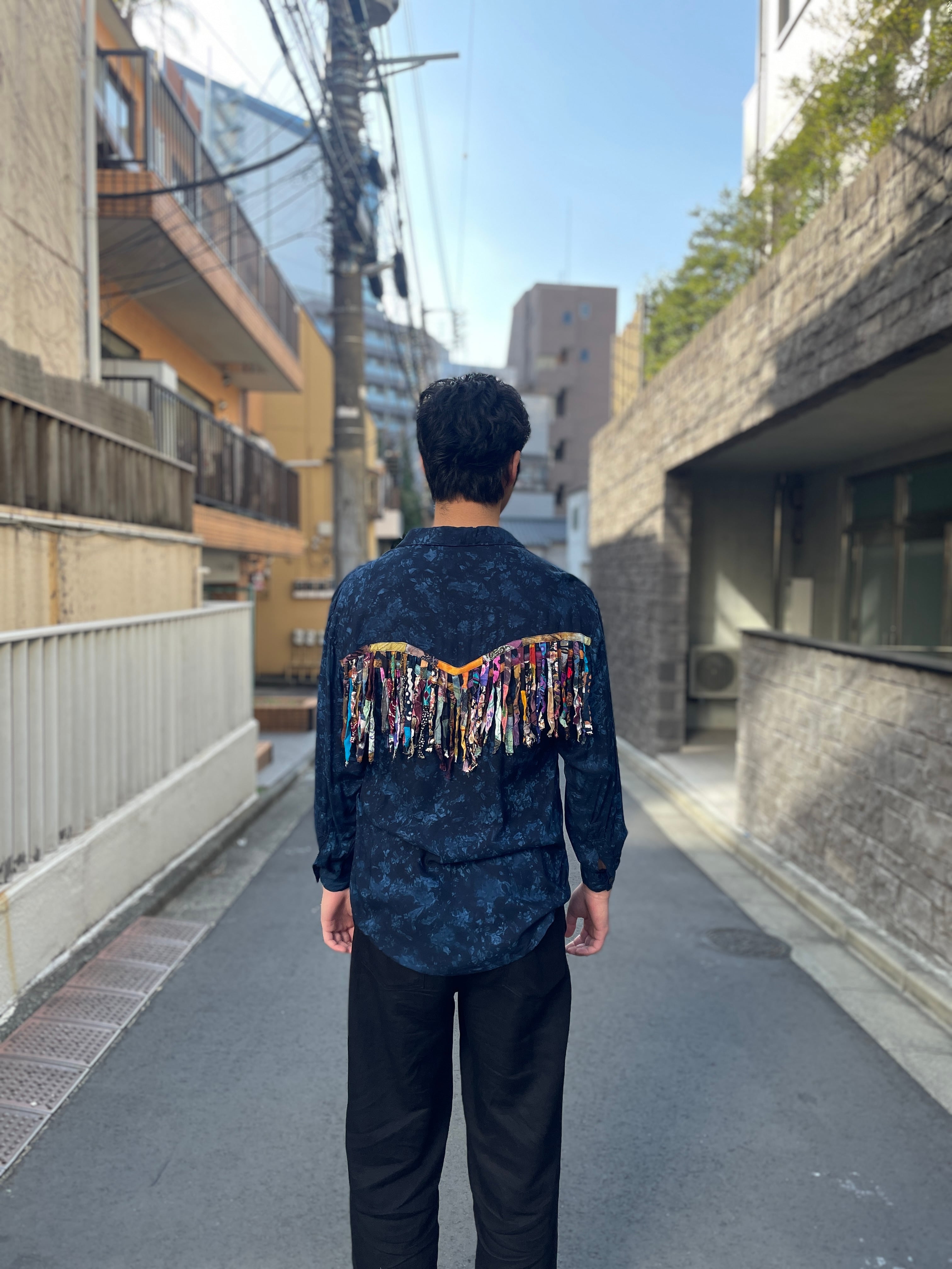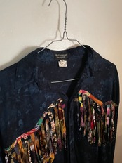 ブルーにブラックの模様が入ったボディに、様々な柄のフリンジデザインが施された、レーヨンシャツ。サラッとしたレーヨン素材なので、肌触りにも優れた1着です。ハンドメイドな雰囲気がしっかりと漂うシャツになっています。ゆったりとしたサイズ感で、今の時期にはインナーとしても活躍してくれそうです。
