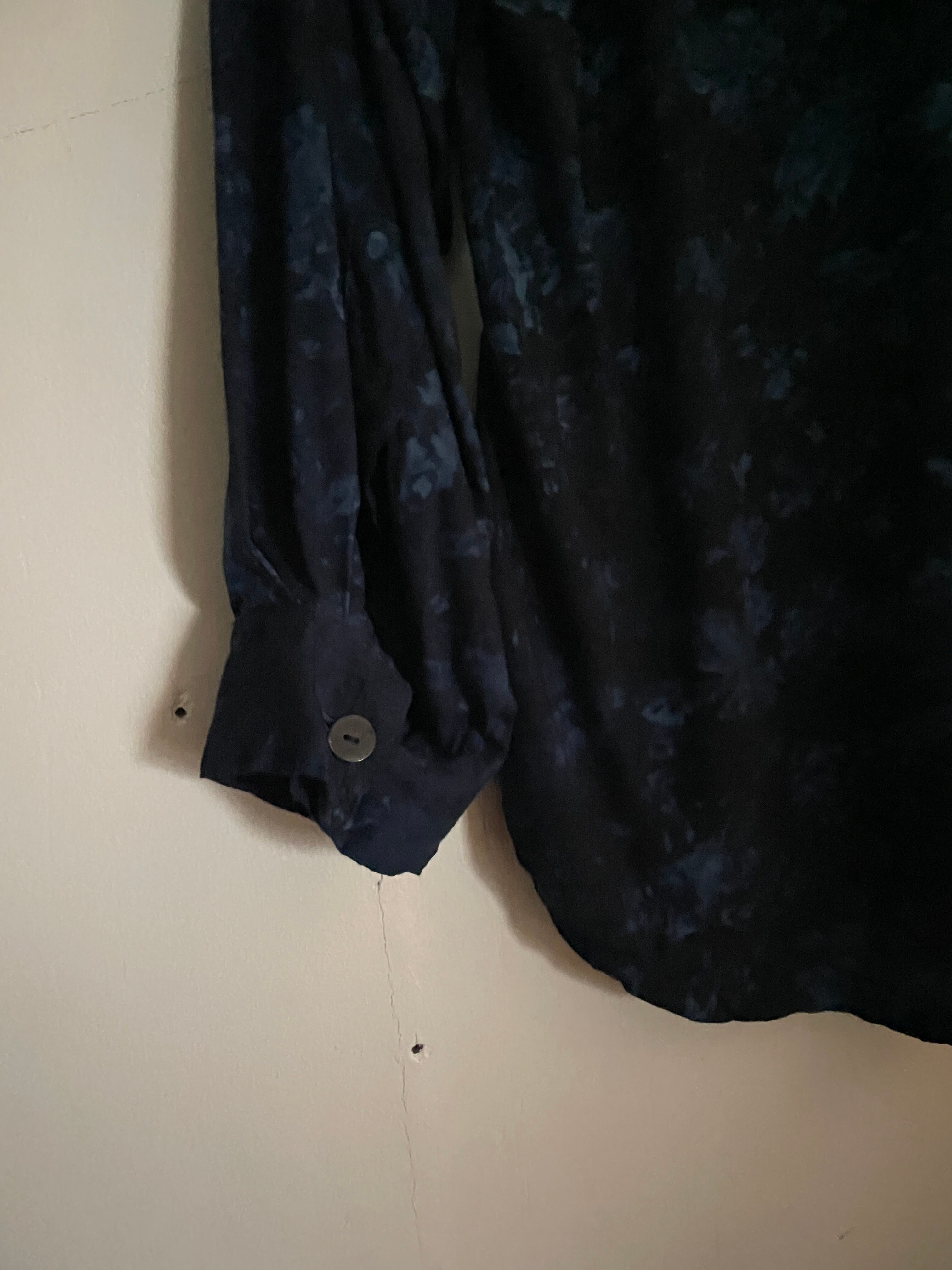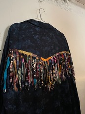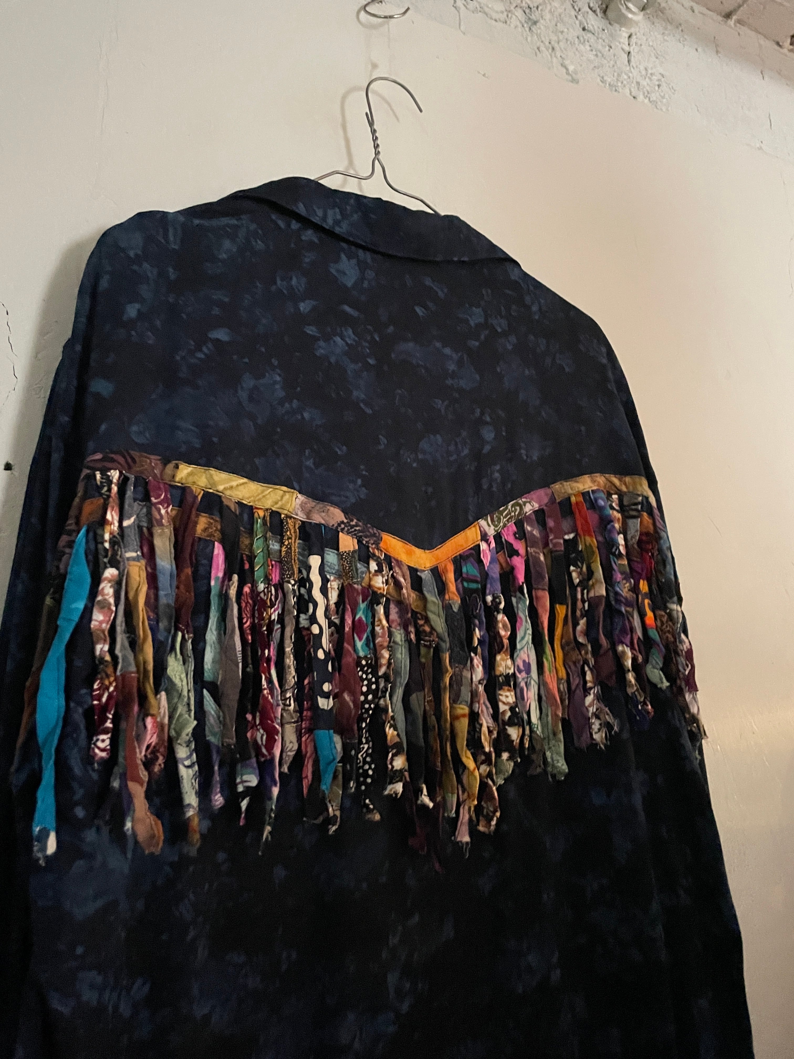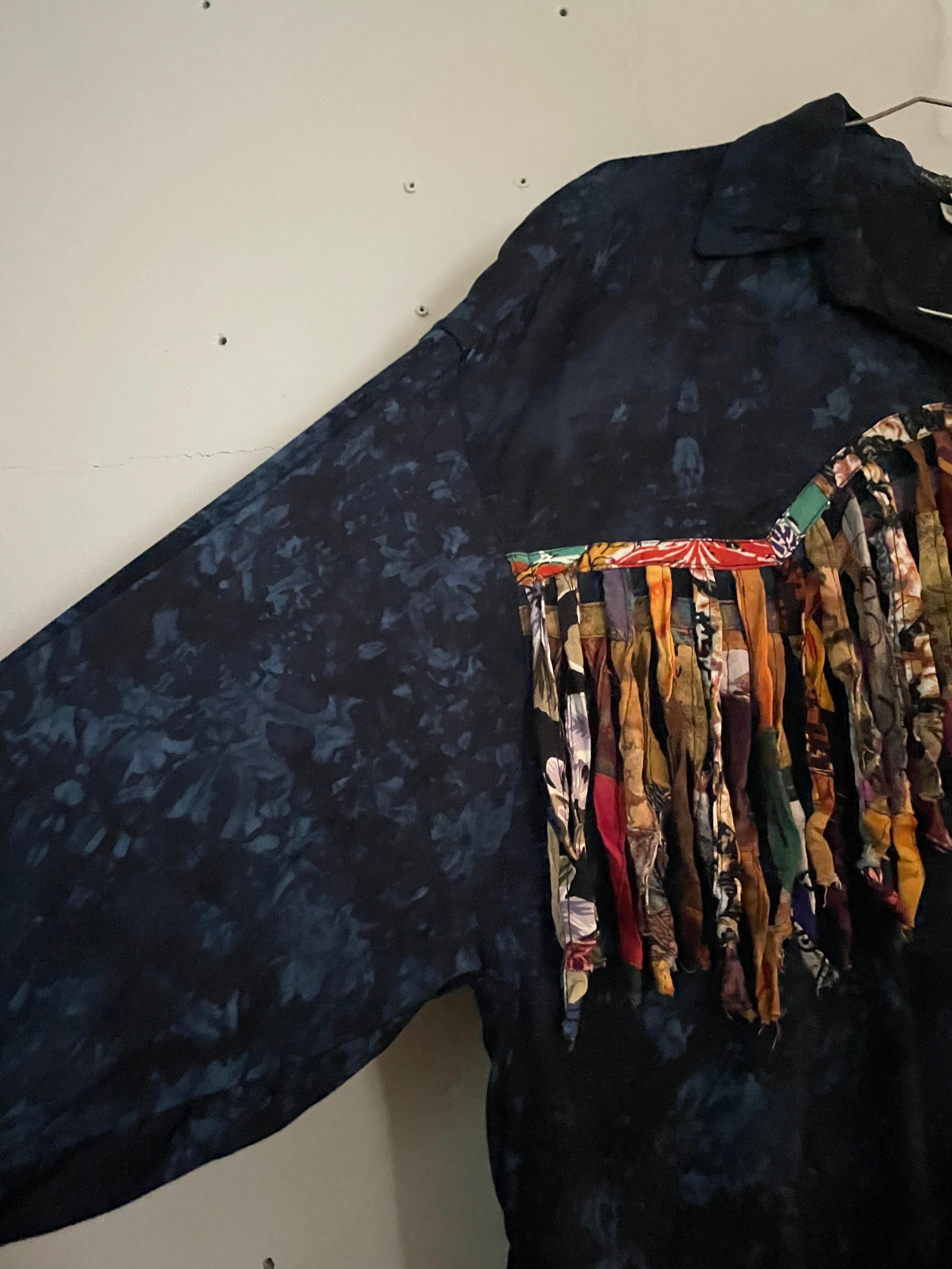 ブルーにブラックの模様が入ったボディに、様々な柄のフリンジデザインが施された、レーヨンシャツ。サラッとしたレーヨン素材なので、肌触りにも優れた1着です。ハンドメイドな雰囲気がしっかりと漂うシャツになっています。ゆったりとしたサイズ感で、今の時期にはインナーとしても活躍してくれそうです。