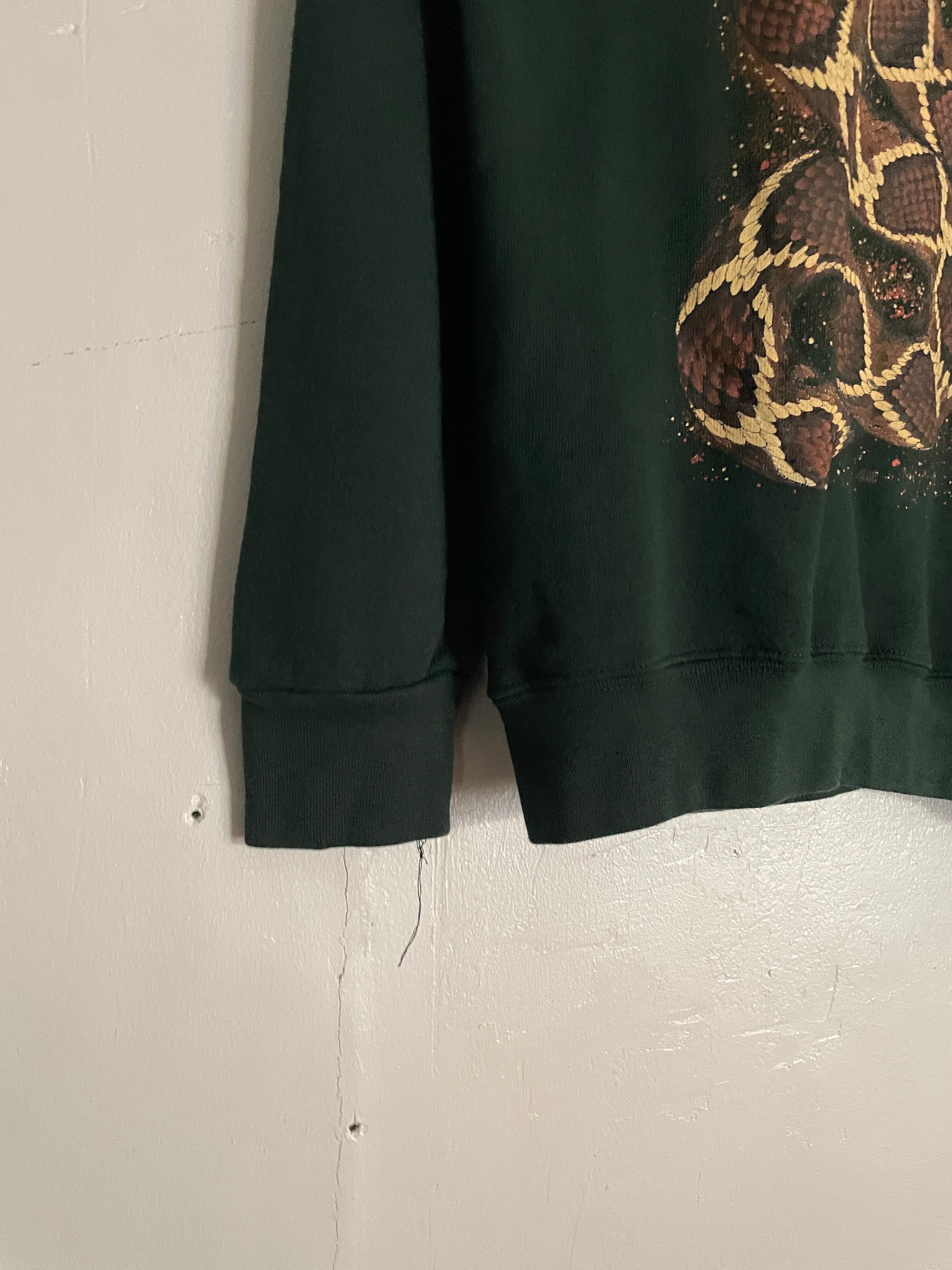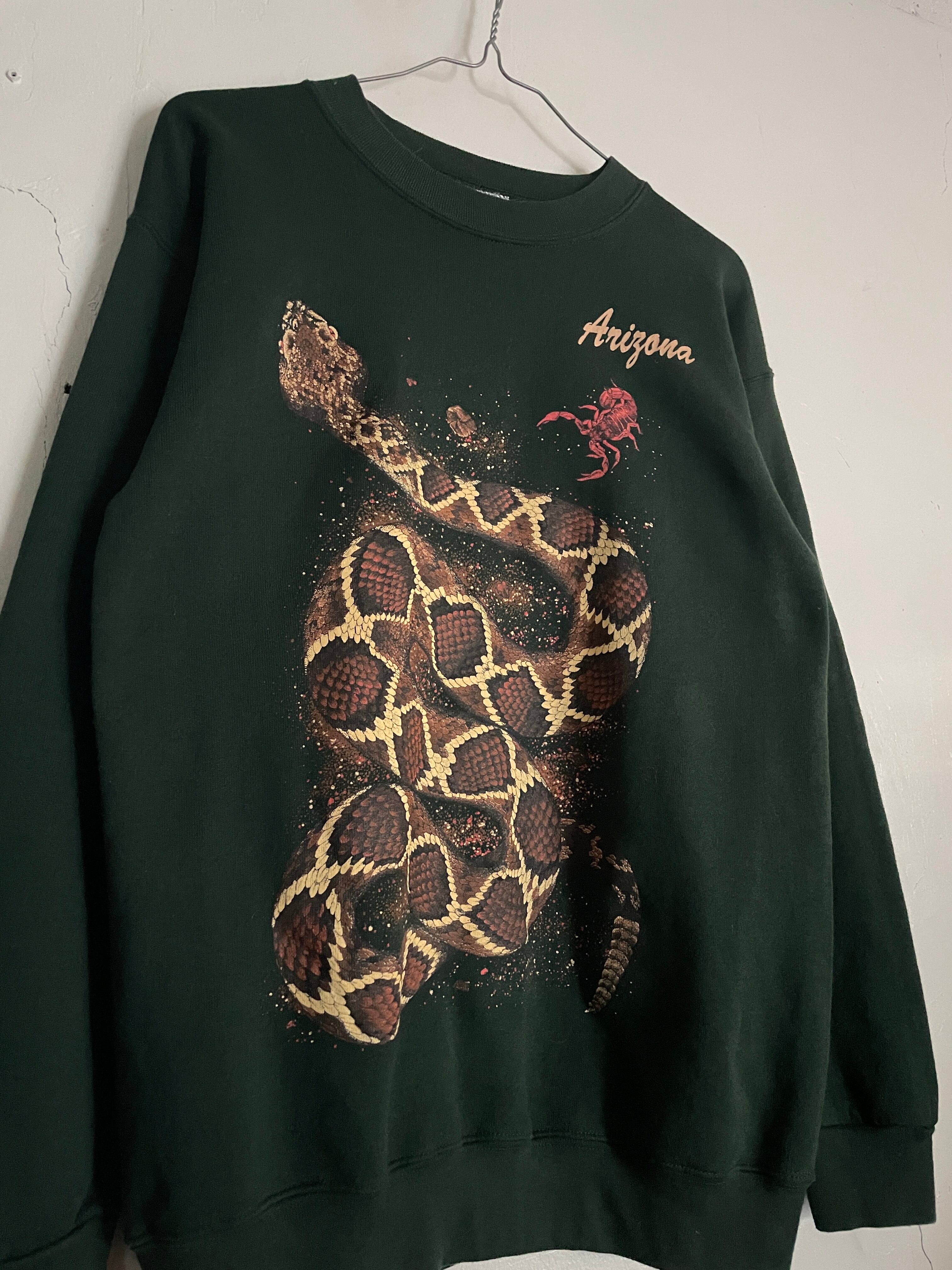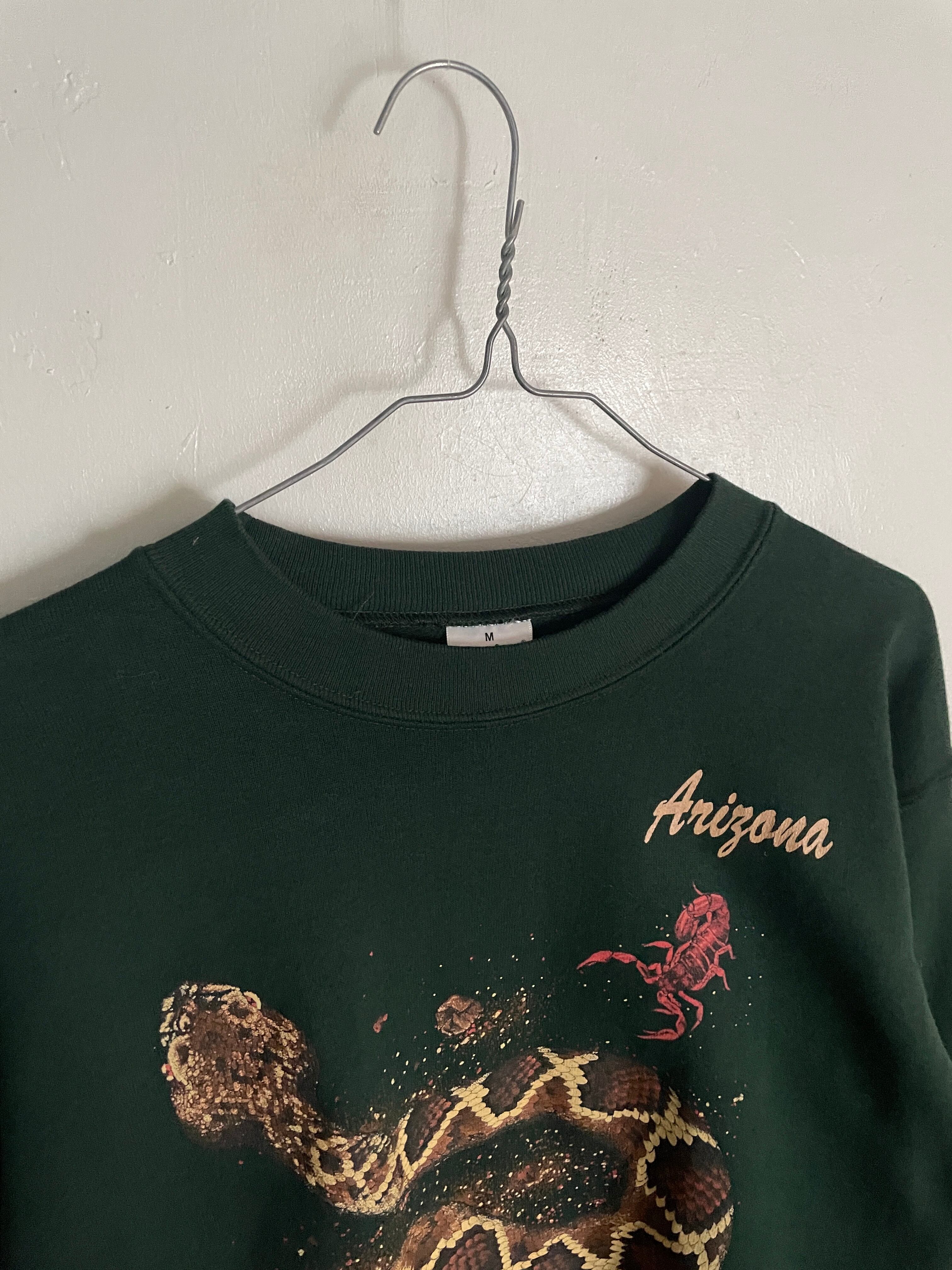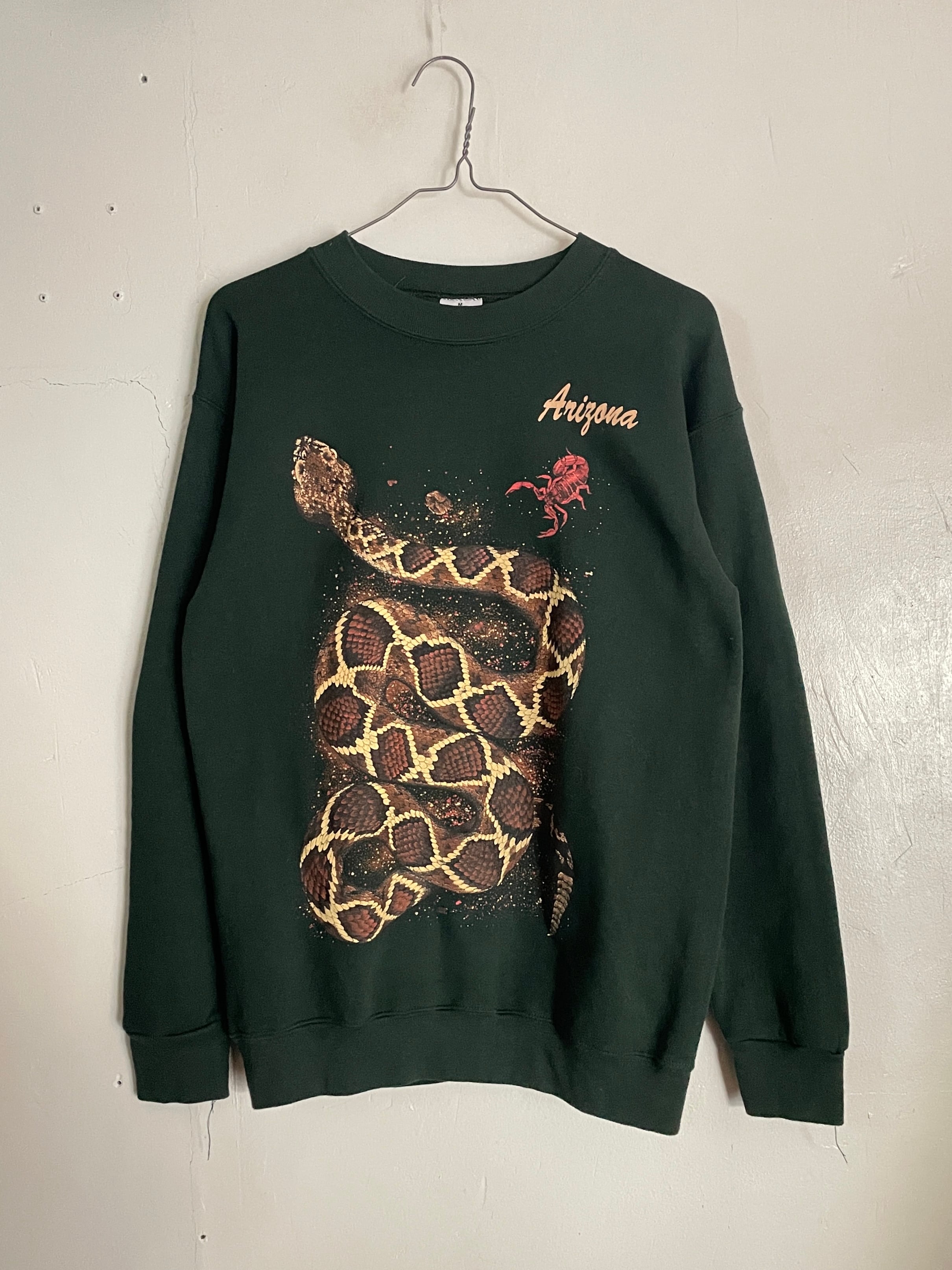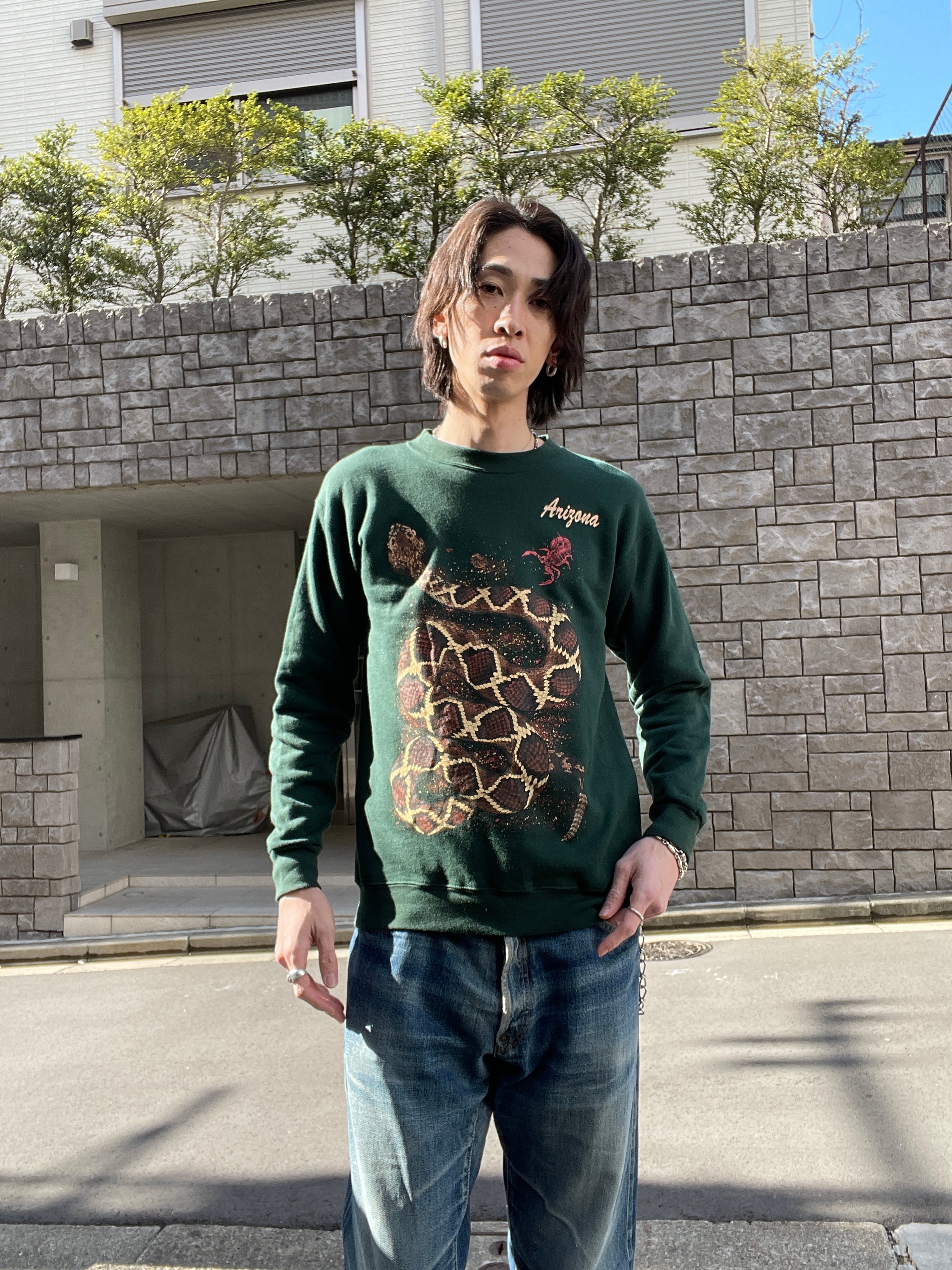 ダークグリーンボディに、ガラガラ蛇とサソリのグラフィックプリントが施されたスウェット。アリゾナ州のネームプリント入り。細かなデザインでかなりリアルなプリントになっています。インパクト強めな1着です。コットンポリなので、厚手過ぎず、今の時期にはインナーとしても活躍してくれます。USA製なのも魅力的なポイントです。