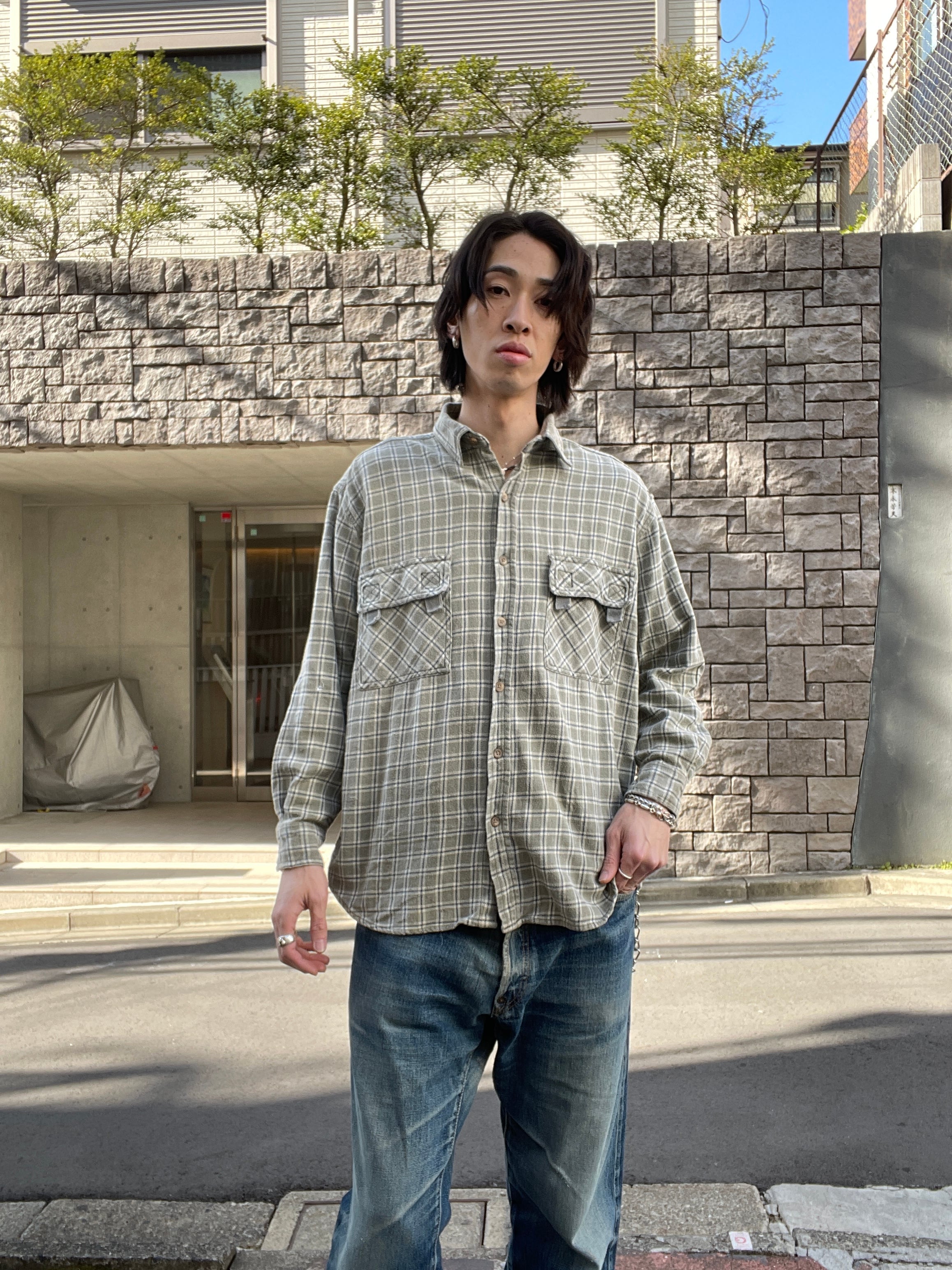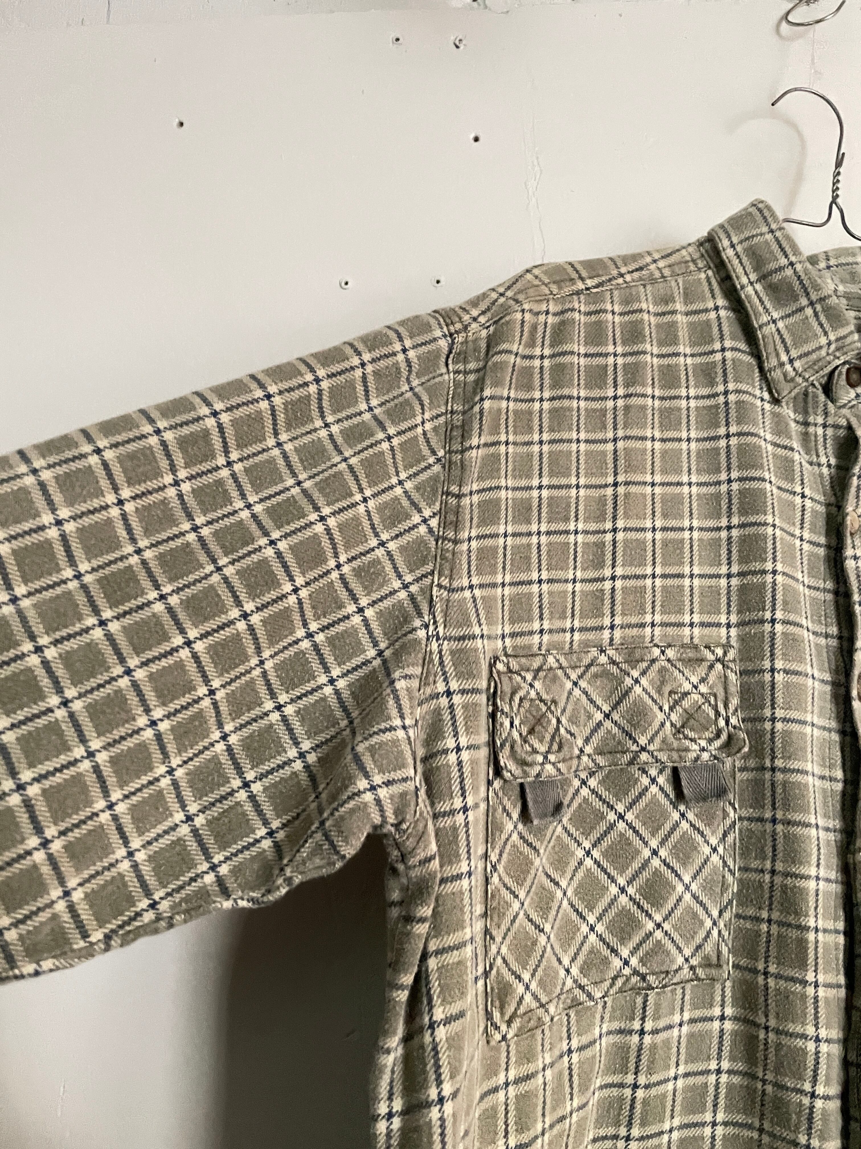 落ち着いたベージュカラーをベースにブルーとホワイトのチェック柄デザインのフランネルシャツ。一見シンプルデザインが、両ポケットにはベルクロ付きの面白いデザイン。ありそうでないシャツかと思います。フワッとしたコットン素材なので、着心地も抜群です。ゆったりとしたサイズ感なので、ラフに着られて、今の時期にはインナーとしても活躍してくれます。