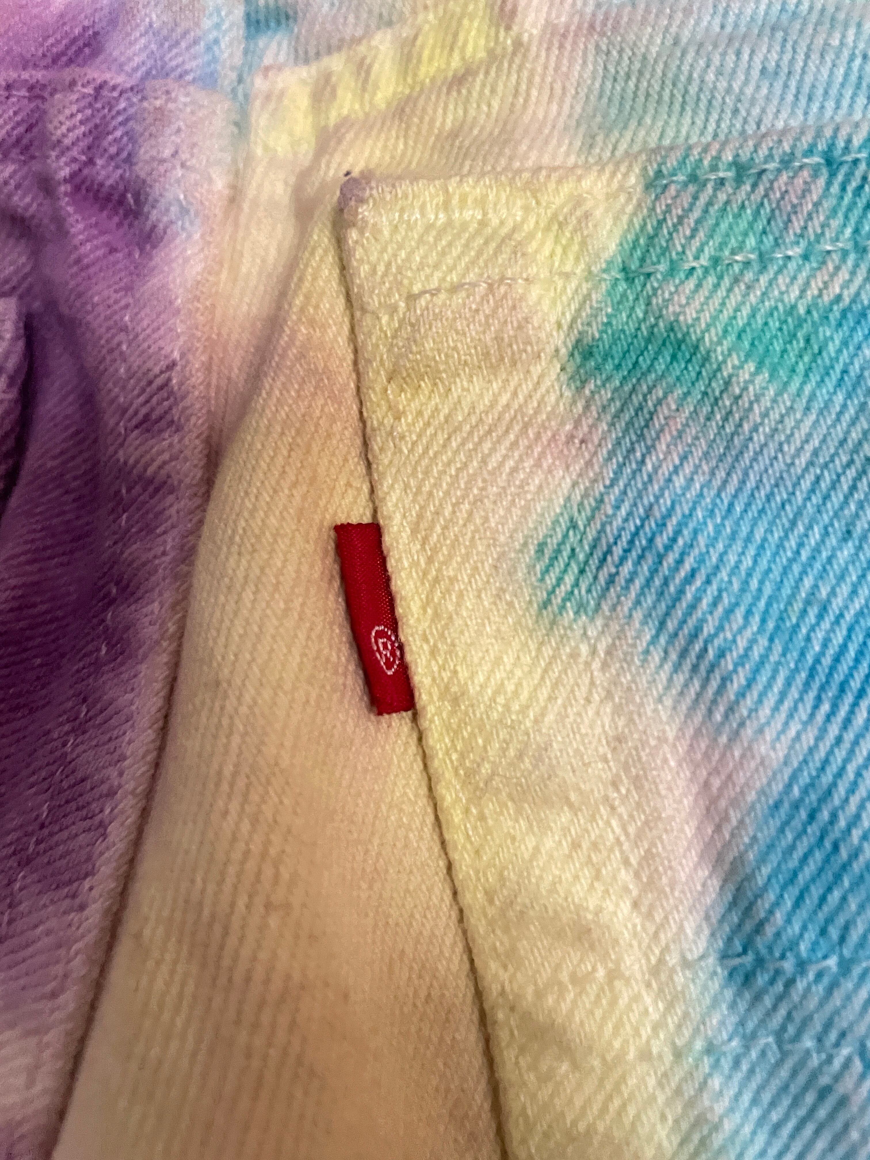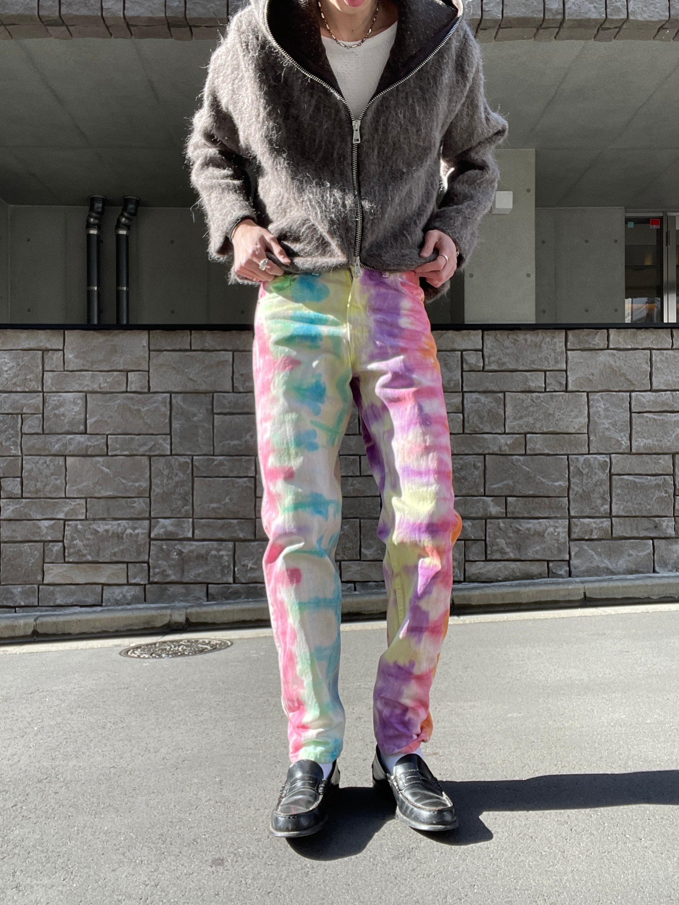 鮮やかにタイダイ染されたリーバイス501デニムパンツ。カラフルで綺麗に染められた色味が抜群にグッドです。今の時期アウターが主役になりがちですが、このパンツは確実にファッションのメインになってくれそうです。細めでレングス長めなシルエット。靴にしっかり溜まってくれそうです。しっかりとUSA製の一本です。
