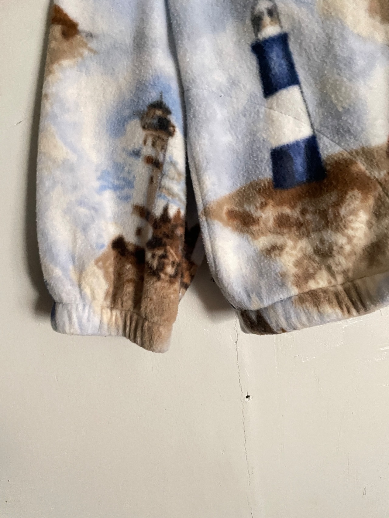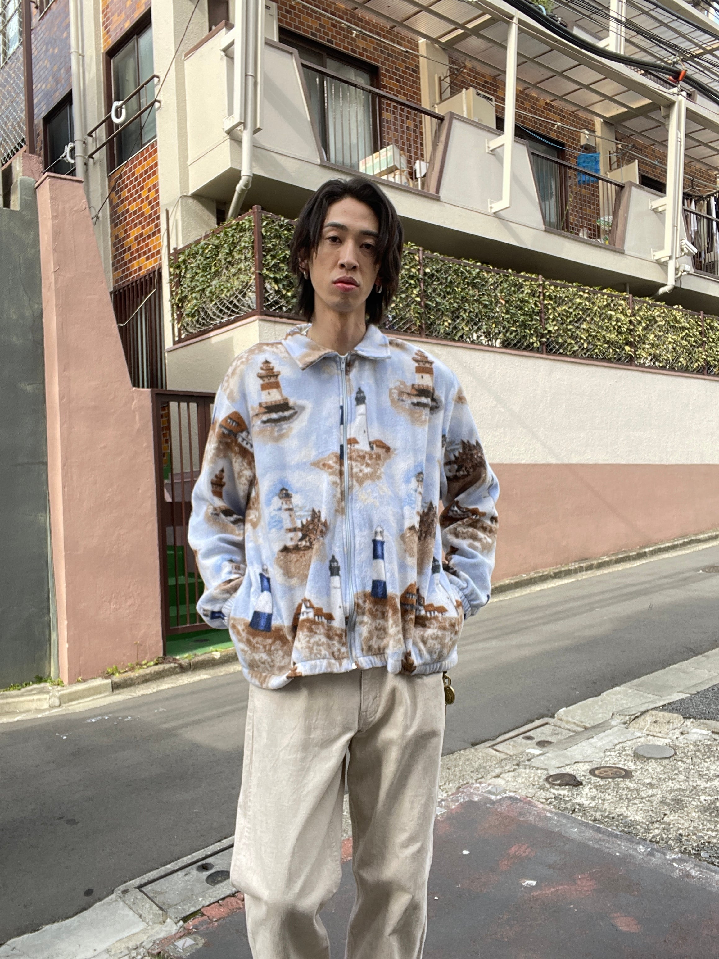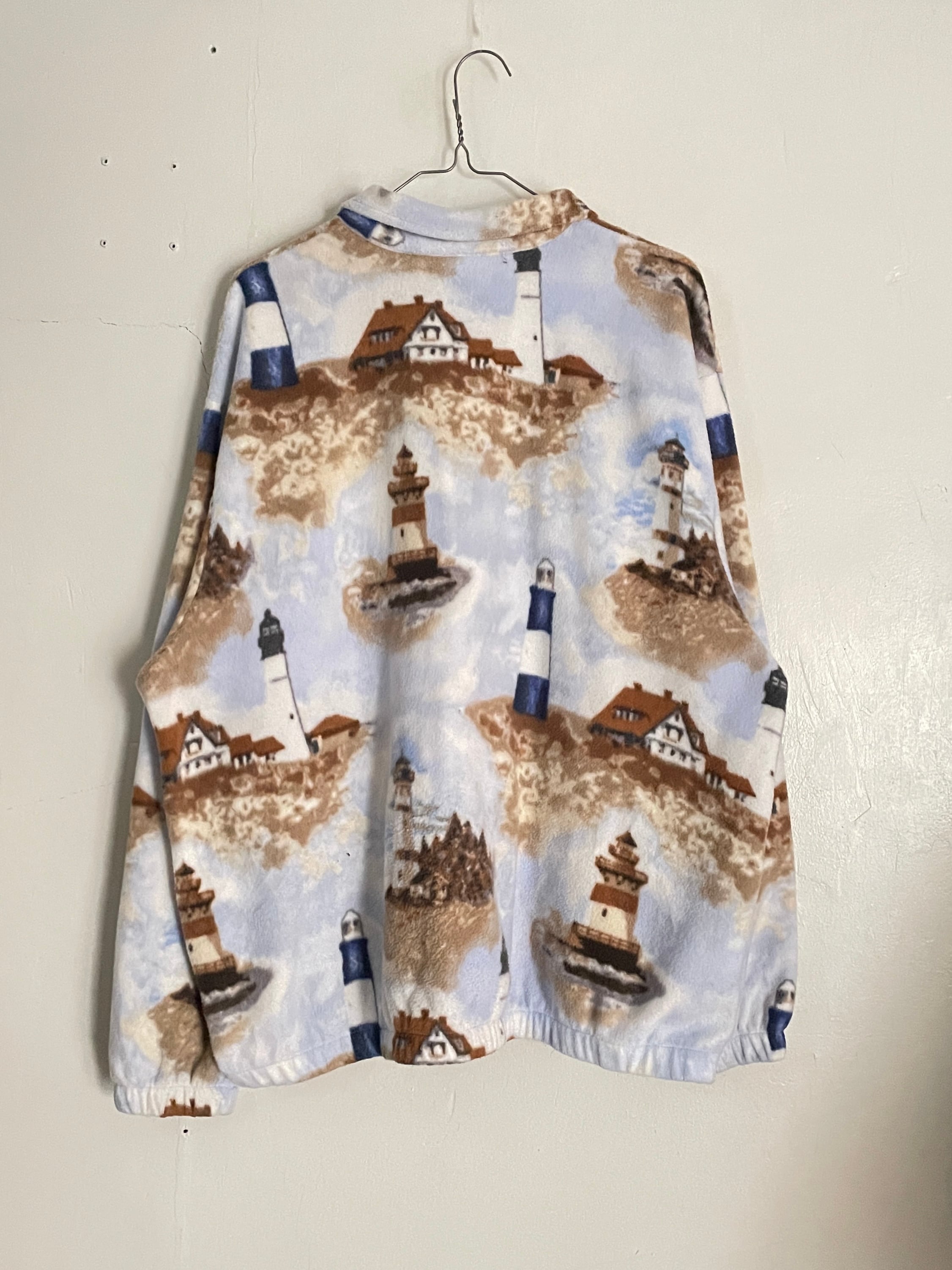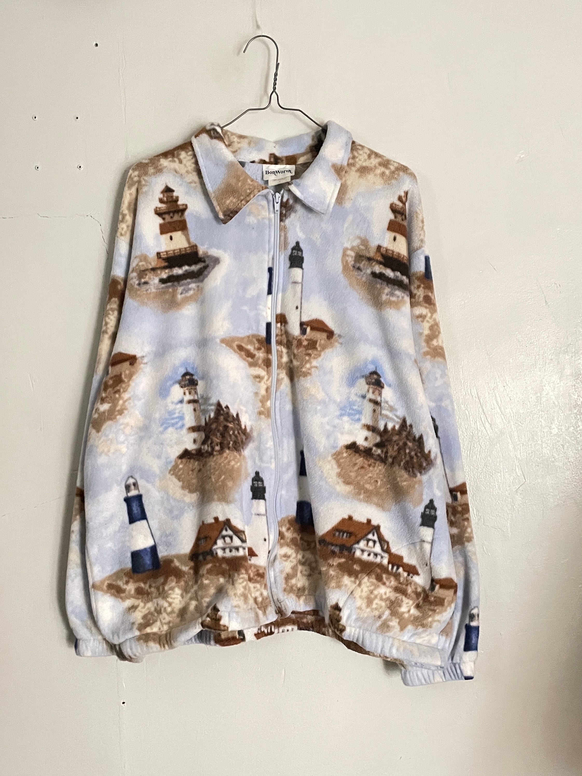 アート感のある色鮮やかな配色で、灯台の柄デザインが施された、ジップフリースジャケット。肌触り抜群のフワッとしたフリース素材。空や灯台がお洒落なカラーでうまく表現されています。ゆったりとしたサイズ感なので、ラフに着られるのも魅力的です。ファッションの主役にはもちろん、インナーとしても活躍してくれるアイテムです。