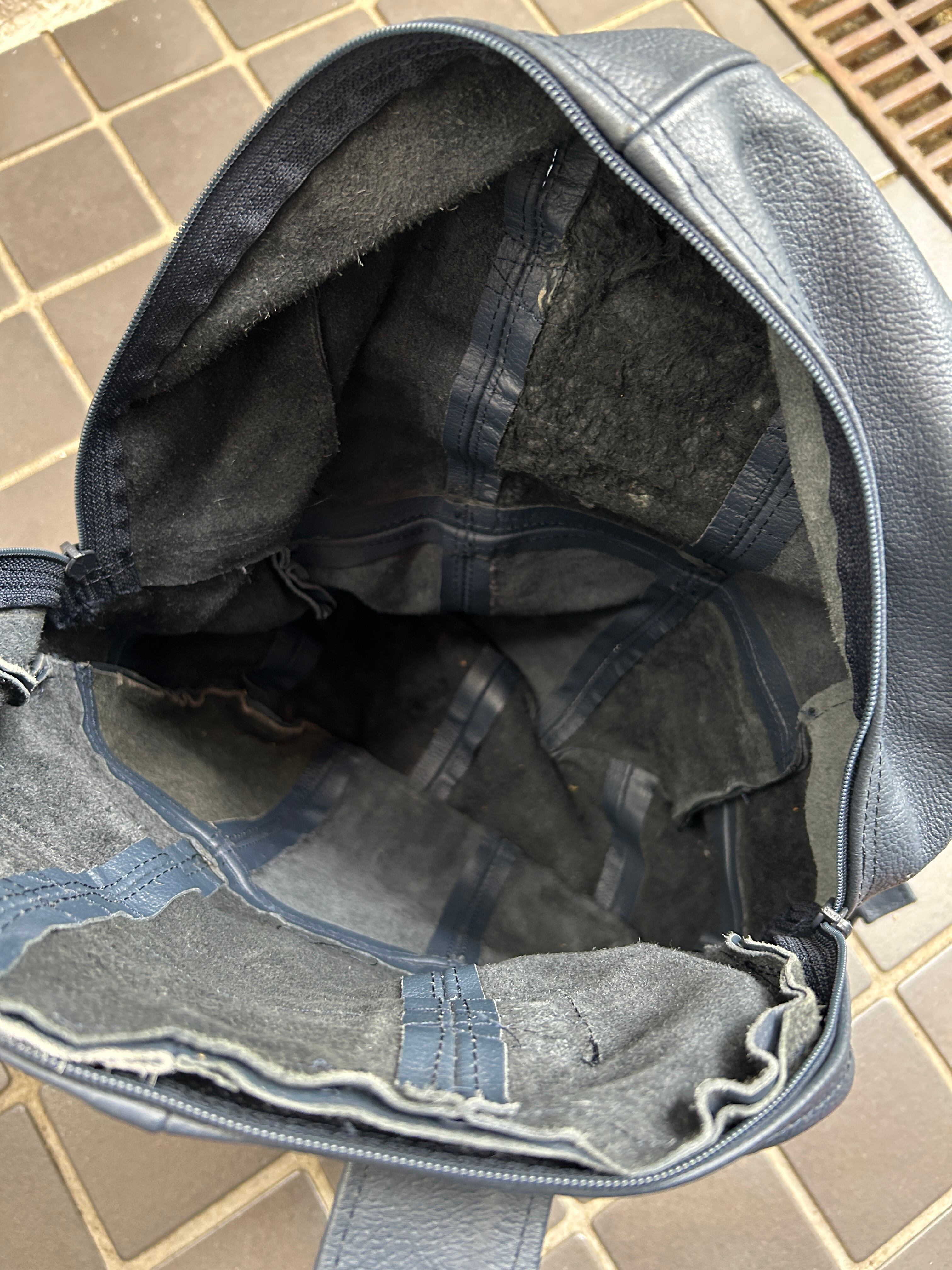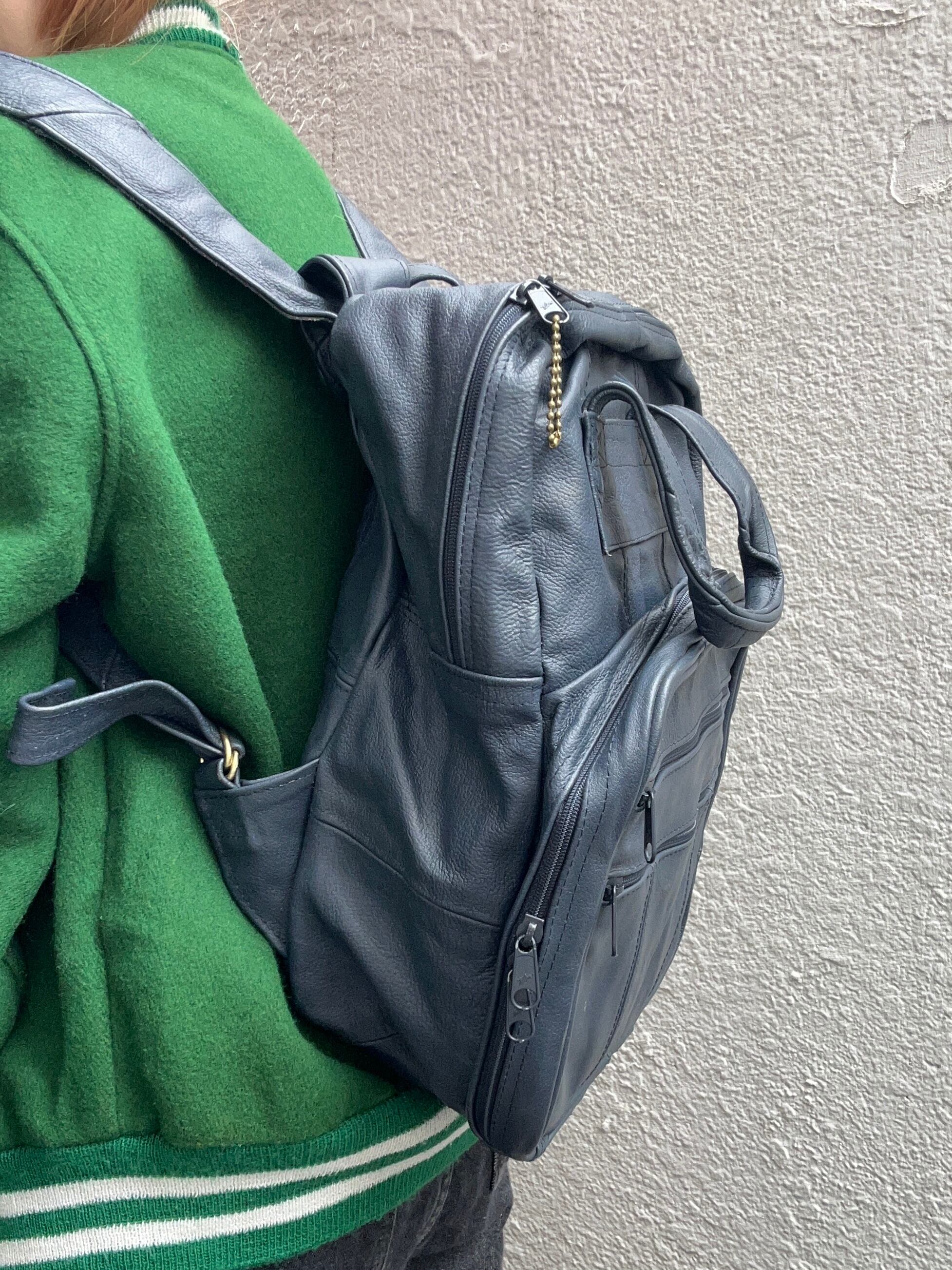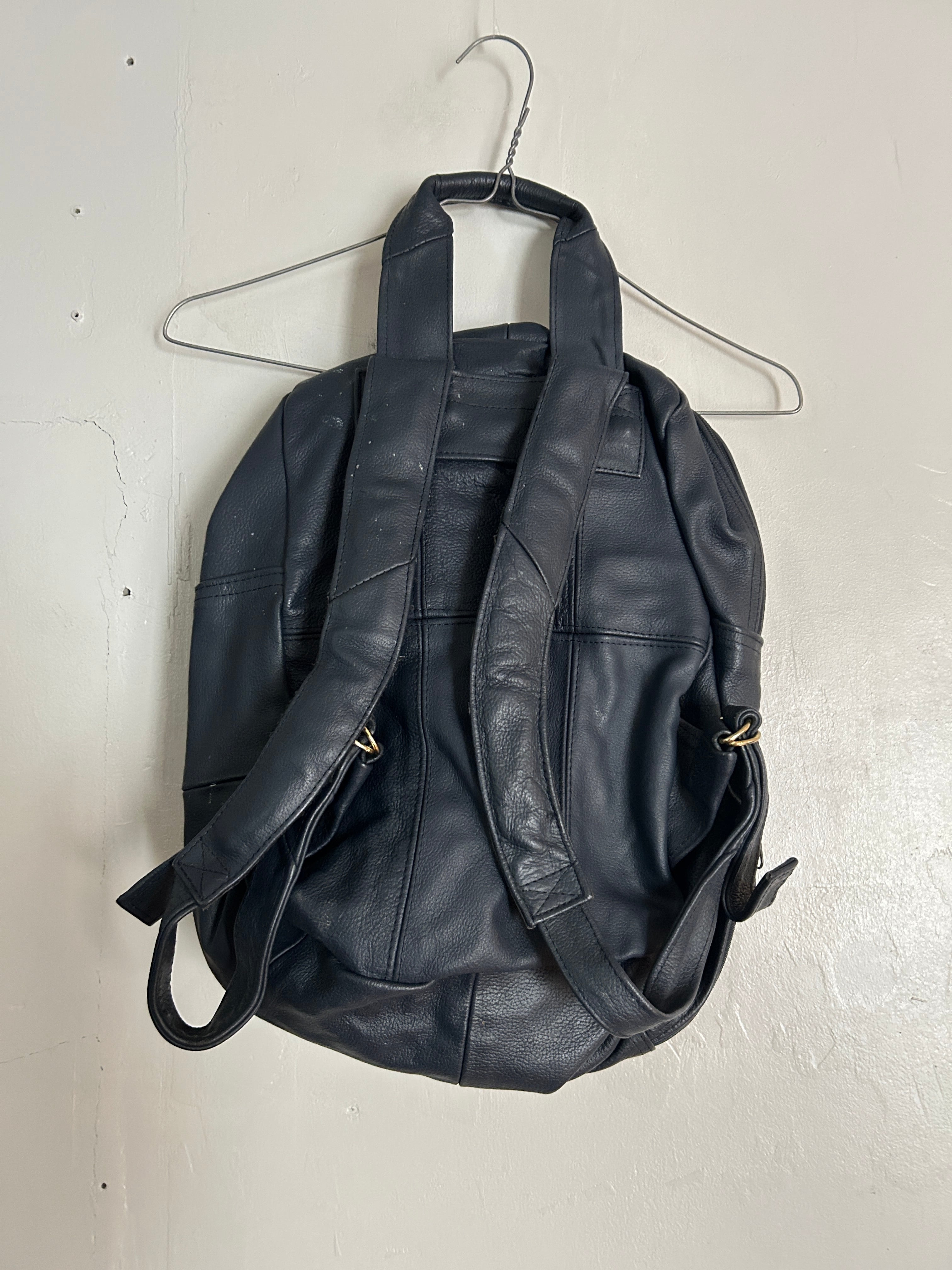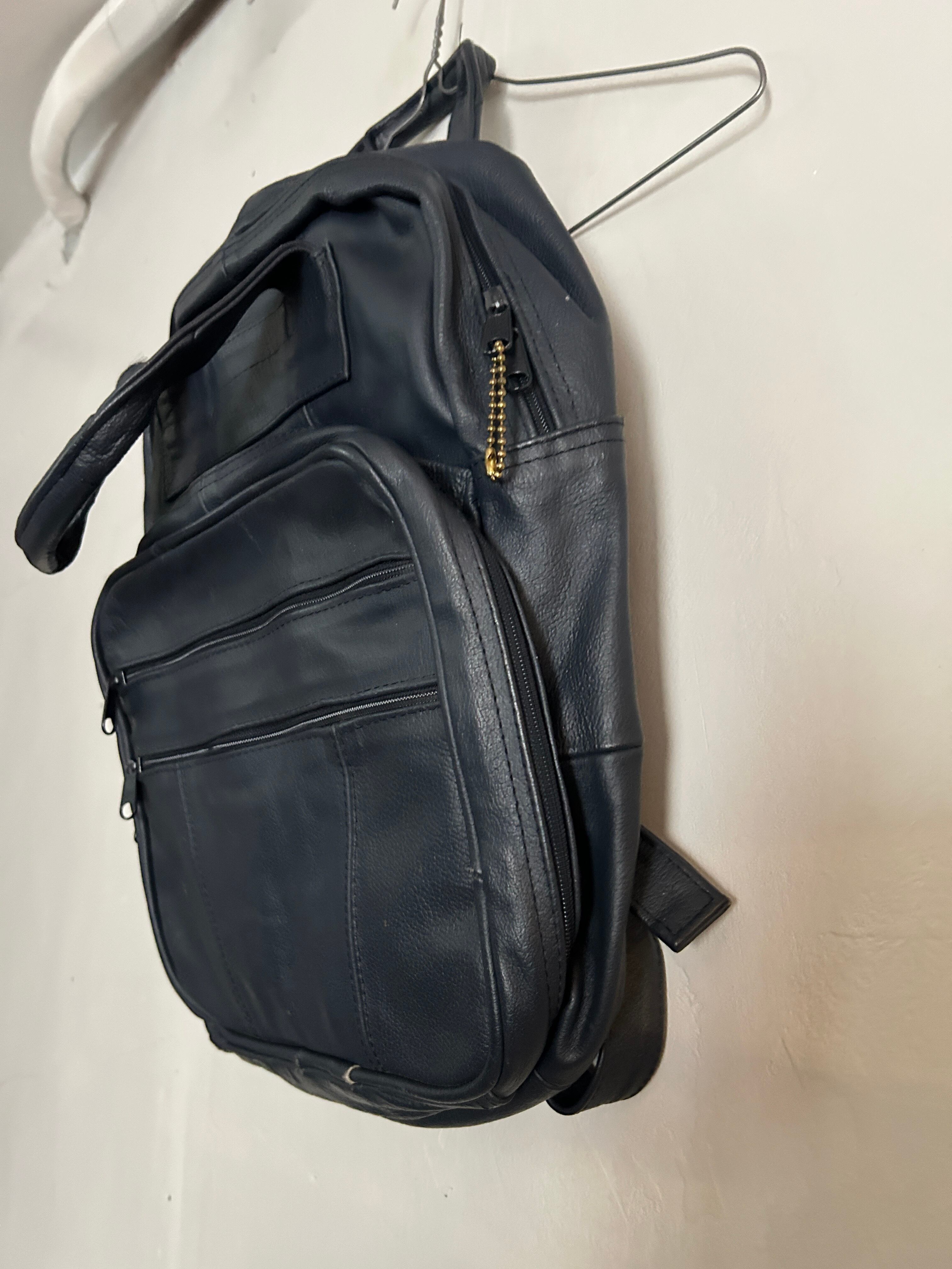 ネイビーのレザーリュックです。多少の汚れはいい味となっており、レザーオンリーのずっしりしっかりした信頼の作りです。肩掛け部分は長さ調節可能。マチも広く、MacBookが入っちゃう!リュックでここまで大きめのサイズも珍しいかなと。お探しの方ぜひ。