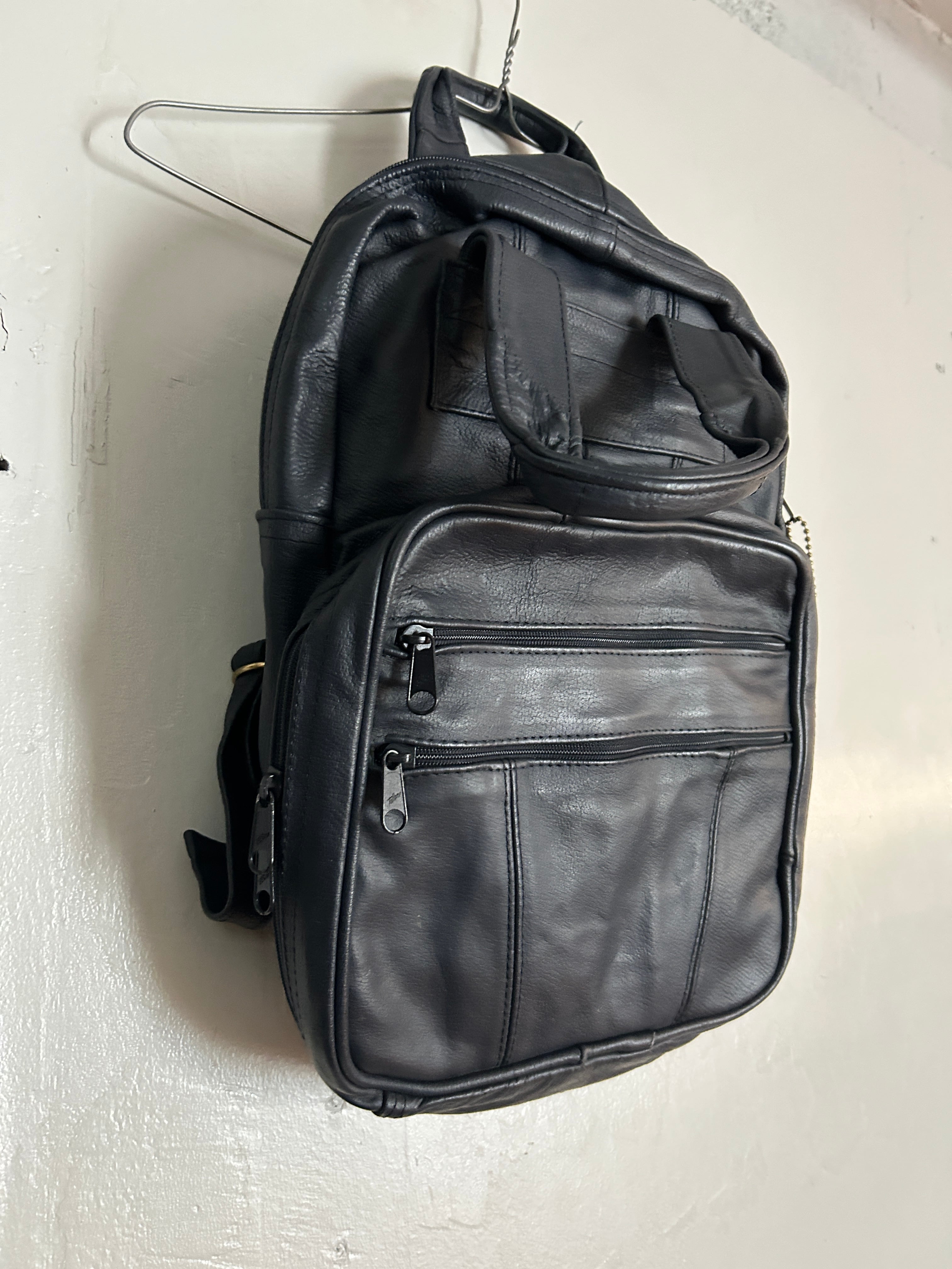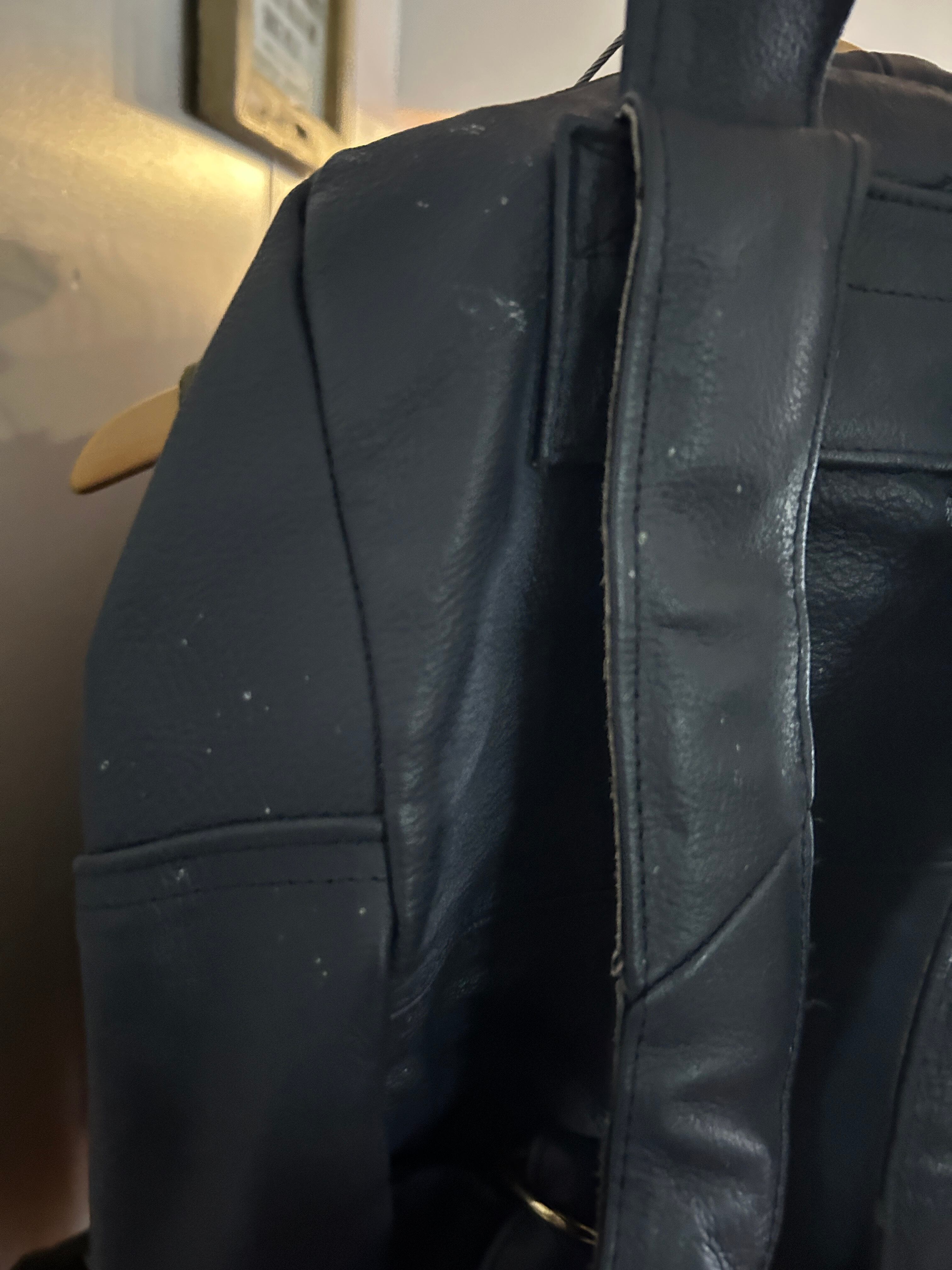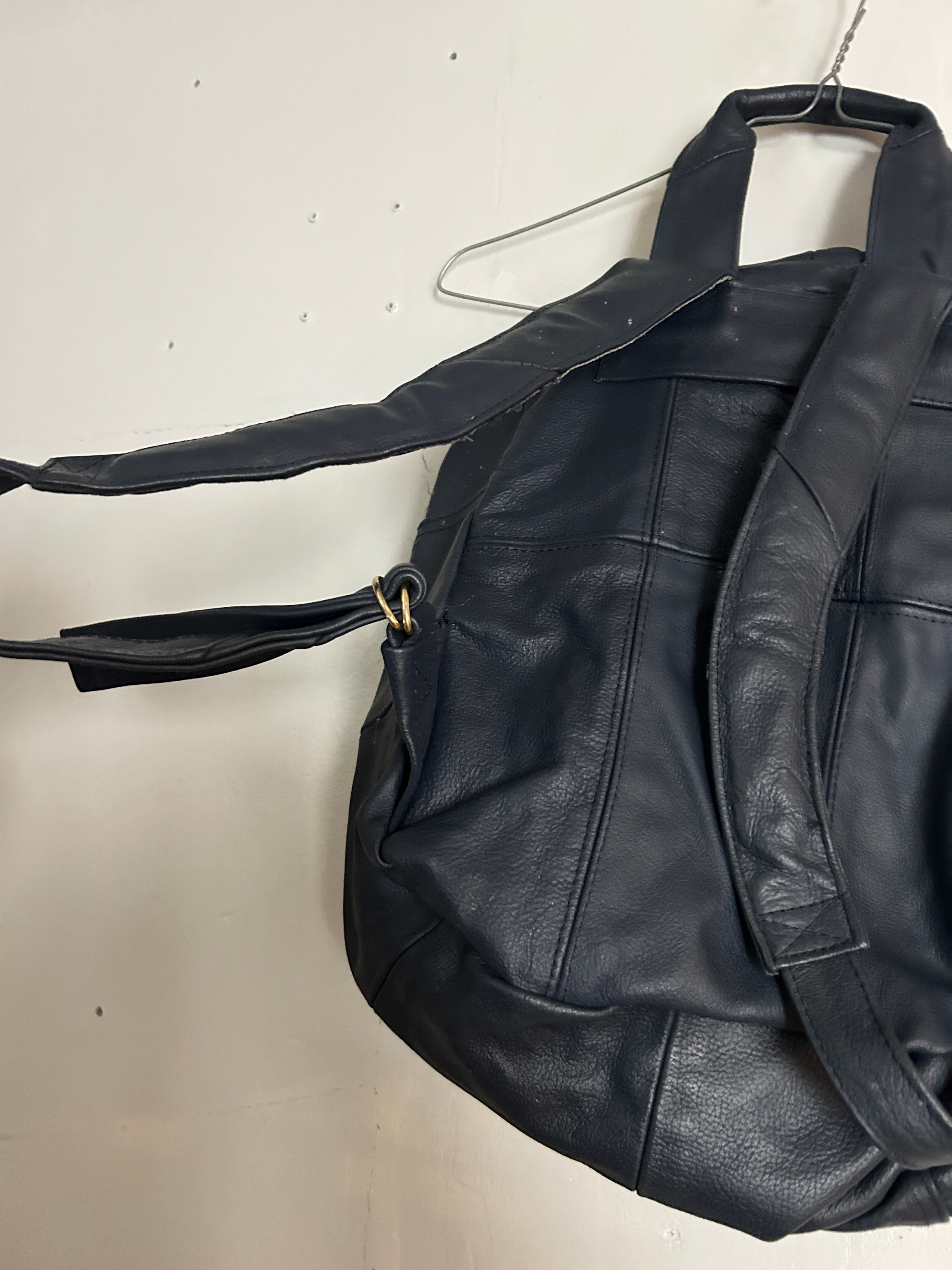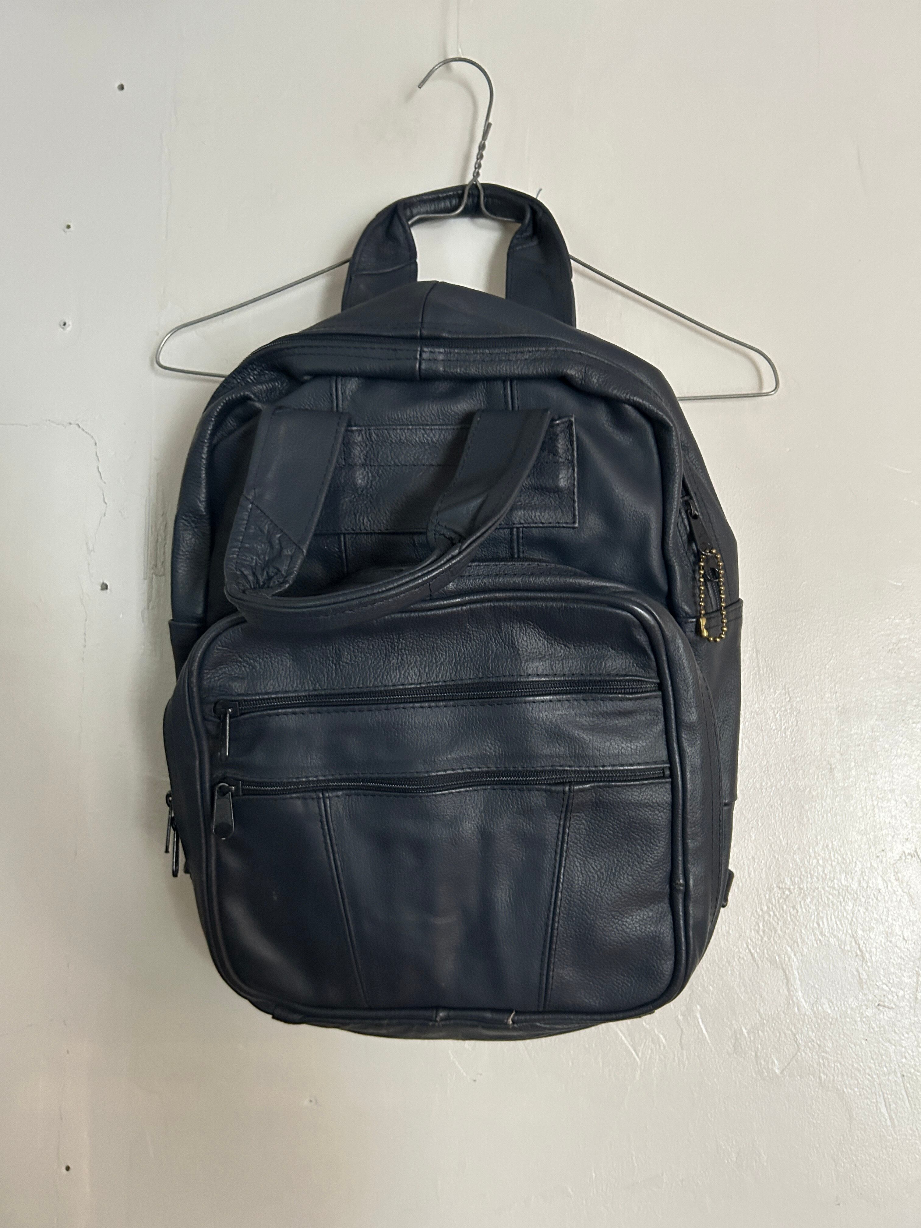 ネイビーのレザーリュックです。多少の汚れはいい味となっており、レザーオンリーのずっしりしっかりした信頼の作りです。肩掛け部分は長さ調節可能。マチも広く、MacBookが入っちゃう!リュックでここまで大きめのサイズも珍しいかなと。お探しの方ぜひ。